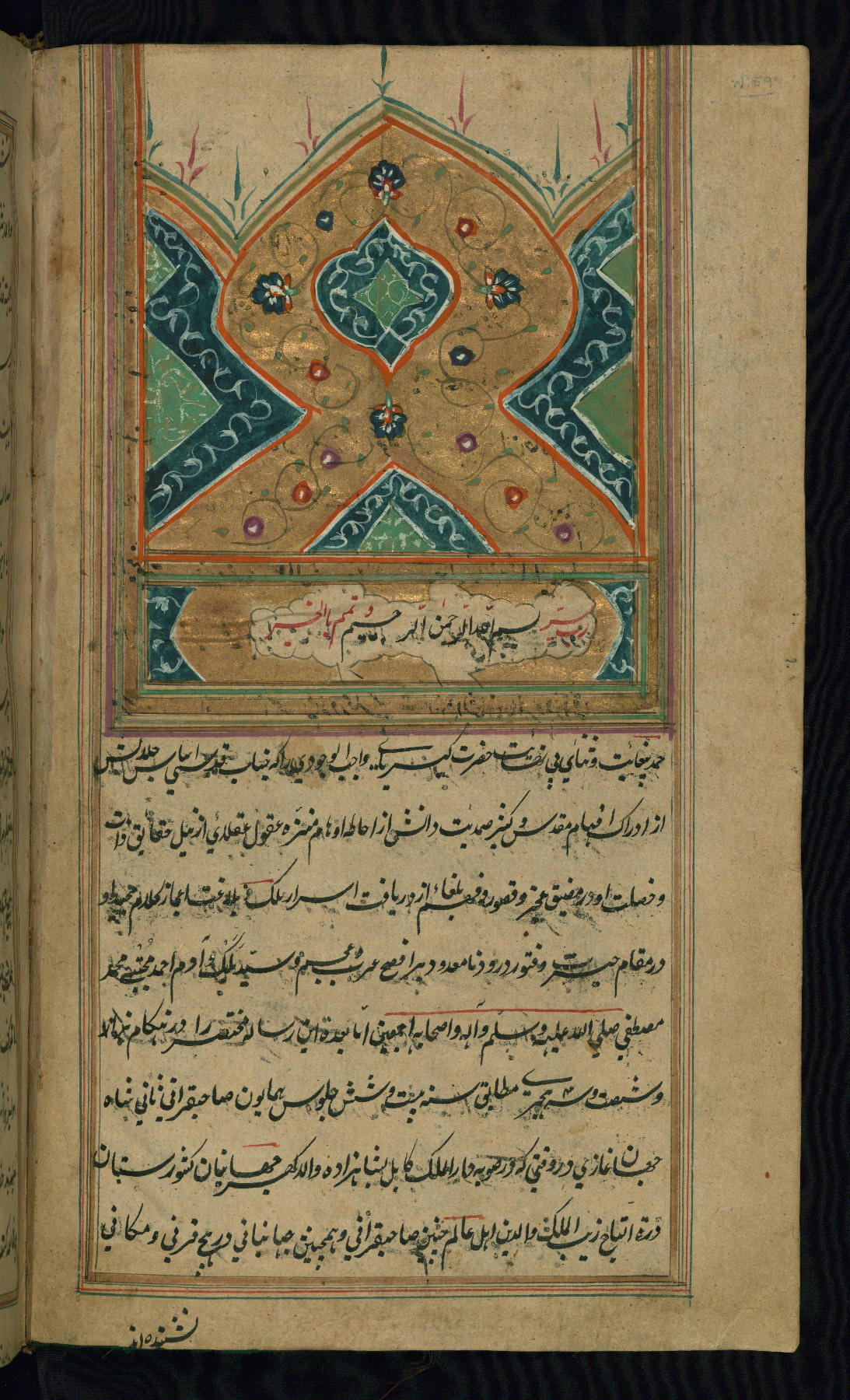 - Label: This incipit page with illuminated headpiece is inscribed with the doxological formula (basmalah) in the central cartouche.