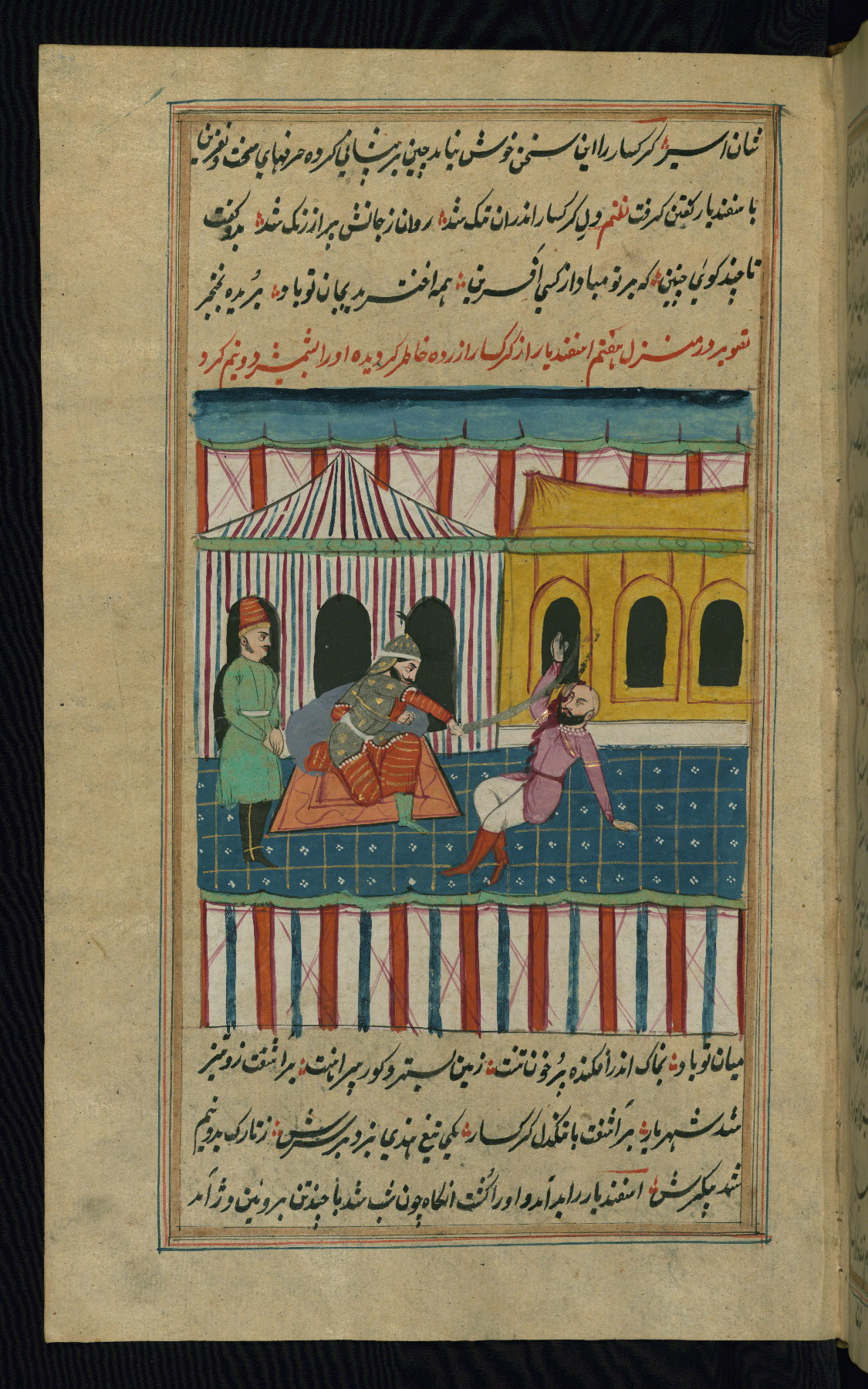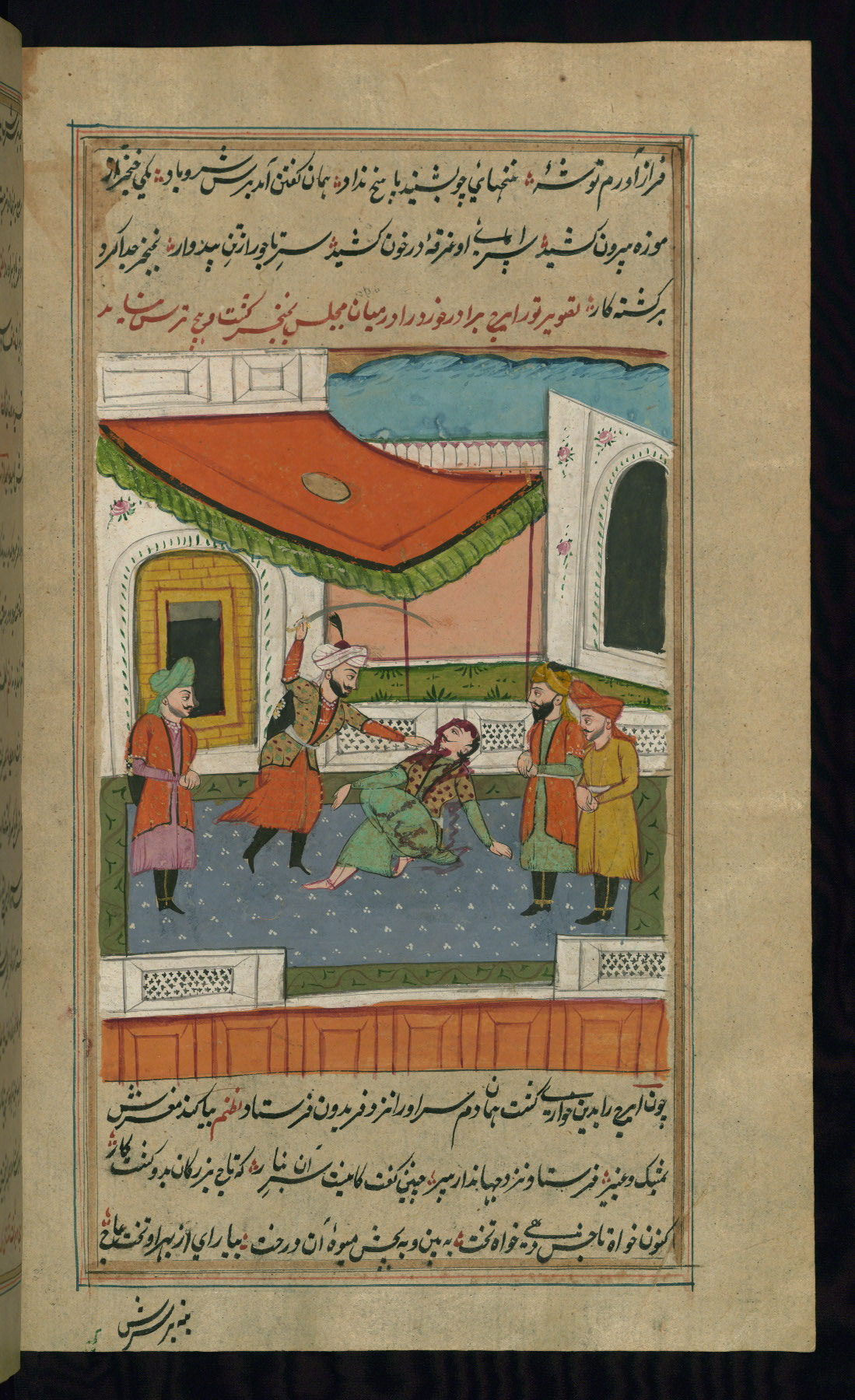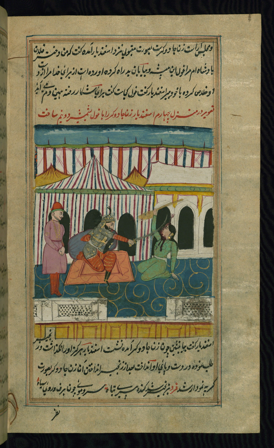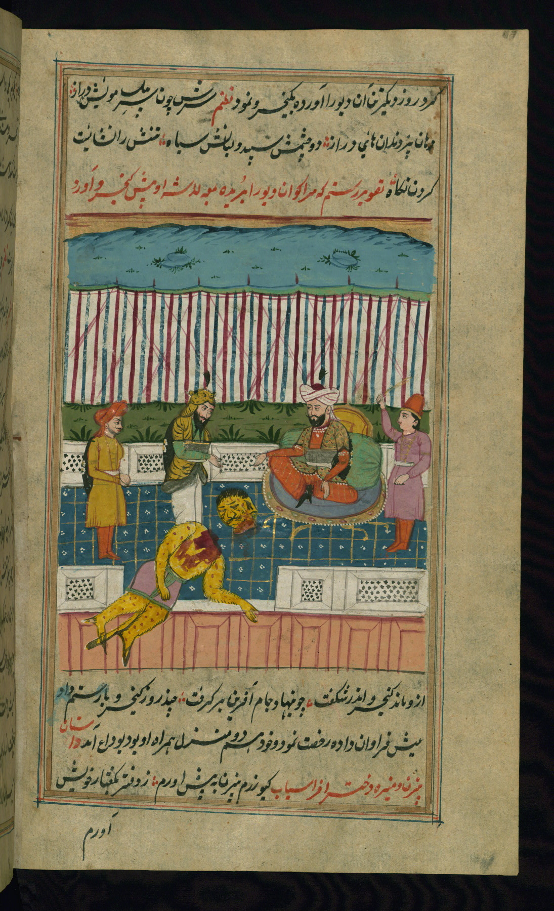 - Label: The subject of this scene, described in red nastaʿlīq script, is the killing of the legendary favorite son Īraj by his brother Tūr.