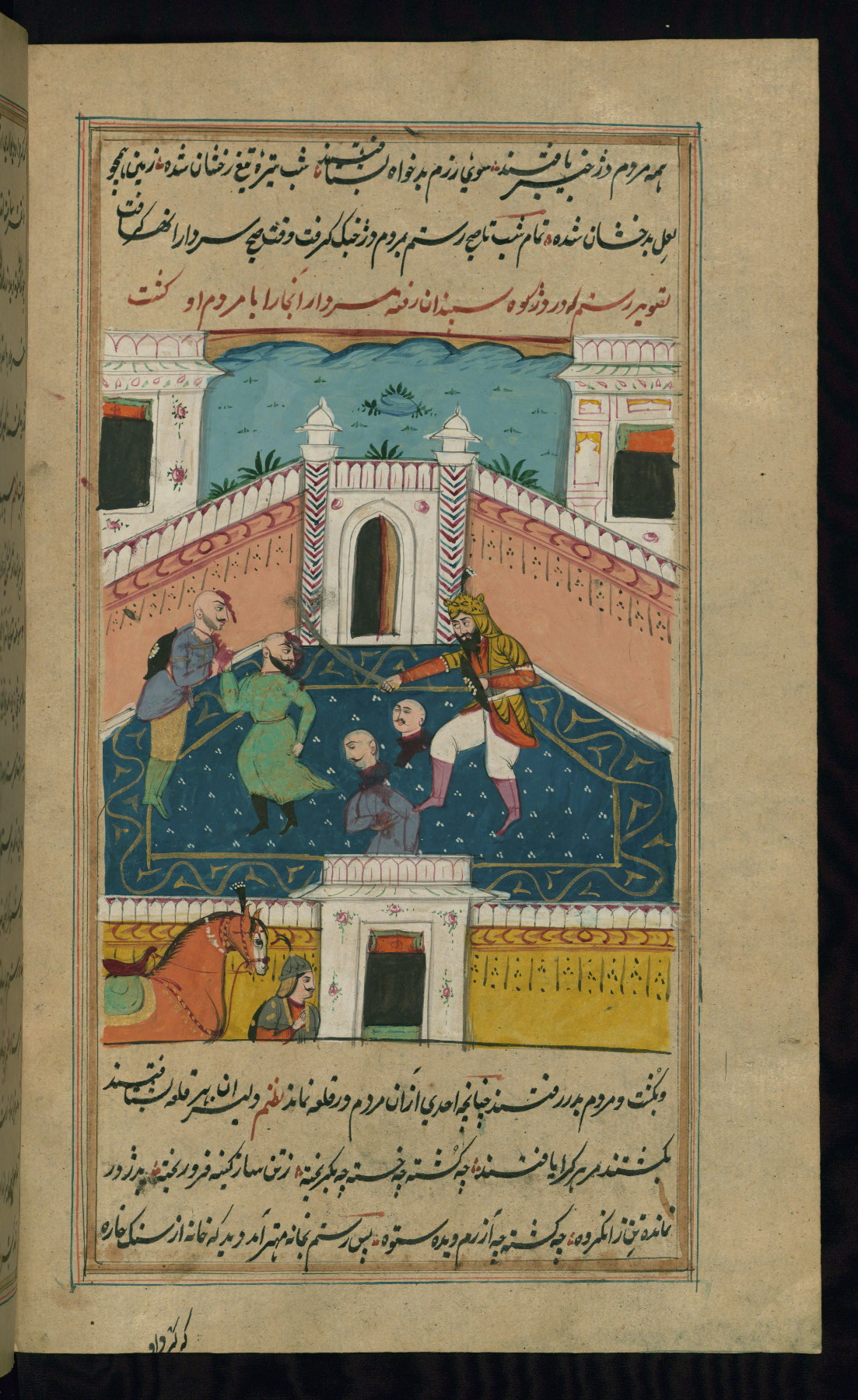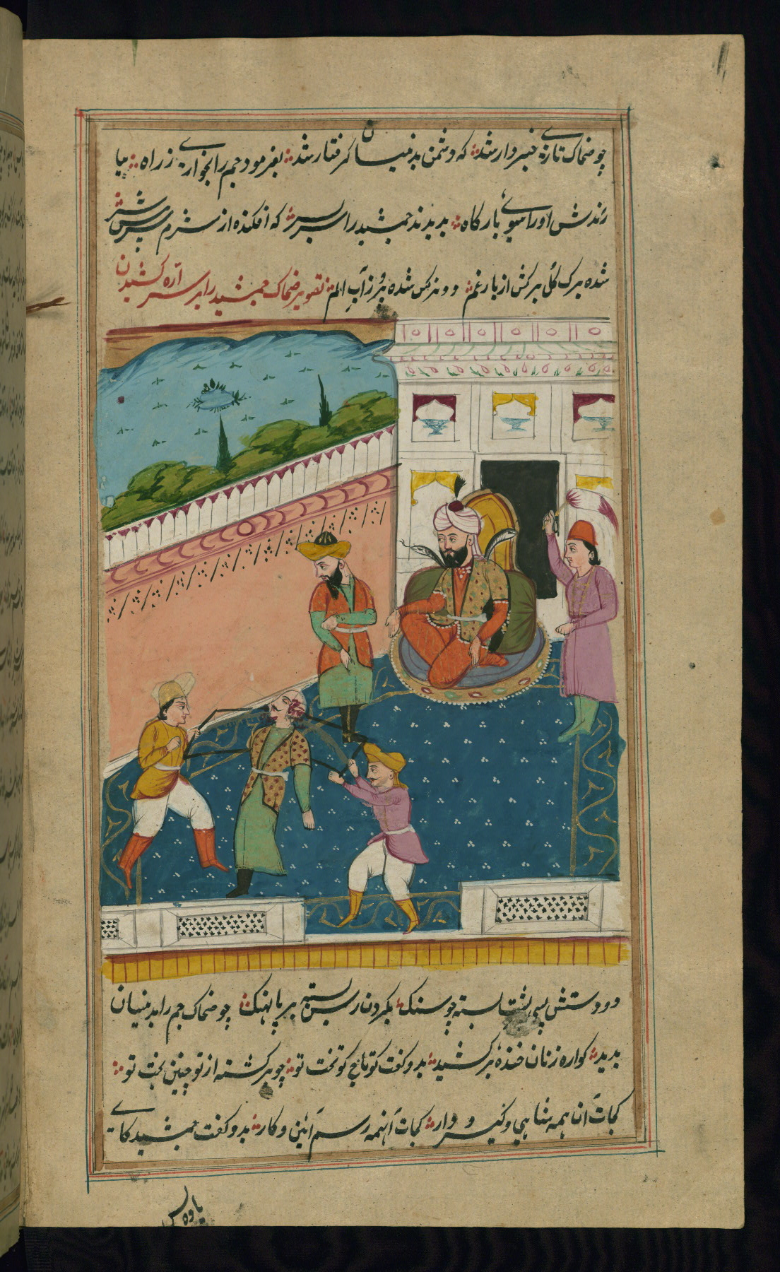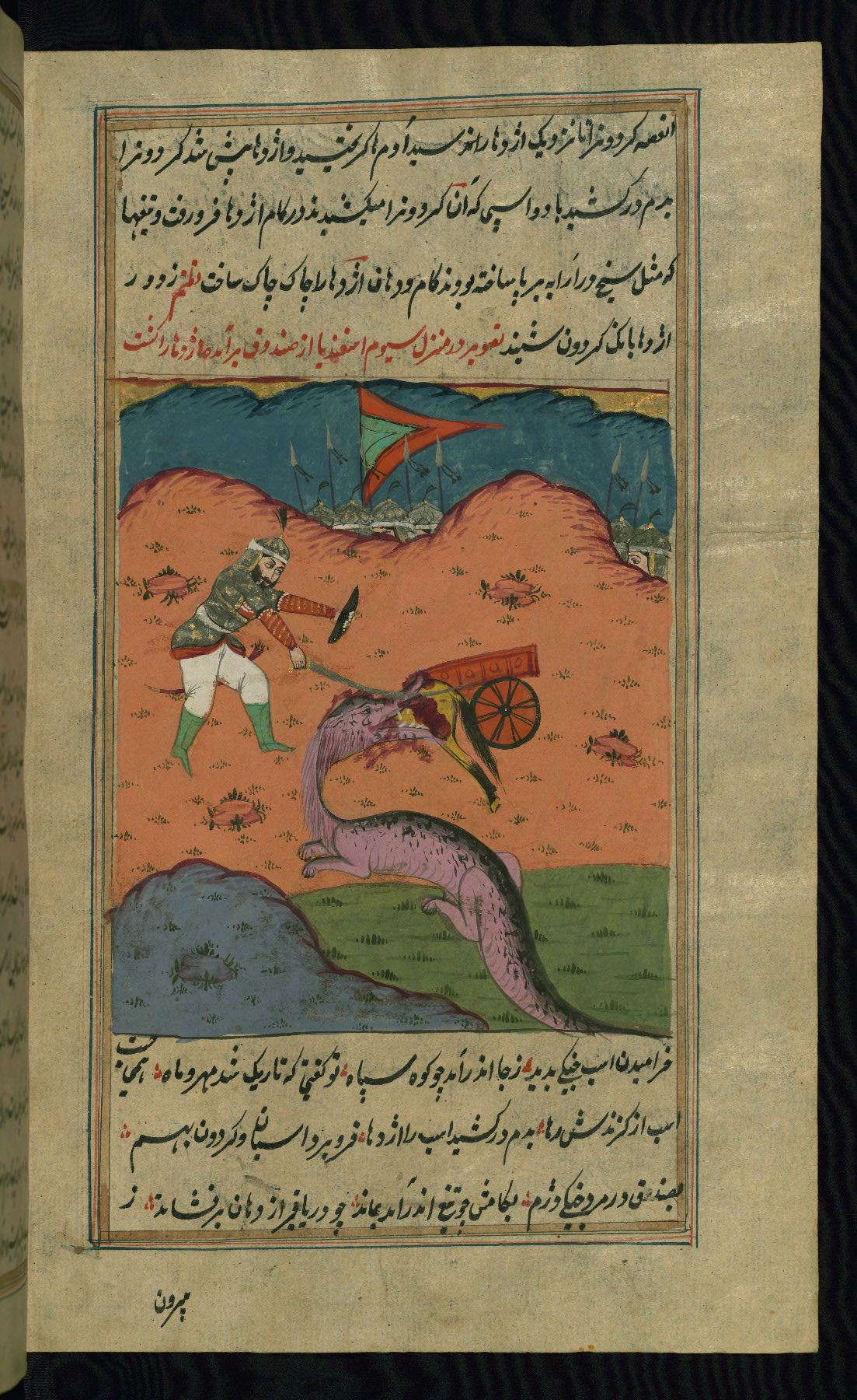 - Label: The subject of this scene, described in red nastaʿlīq script, is the killing of the legendary favorite son Īraj by his brother Tūr.