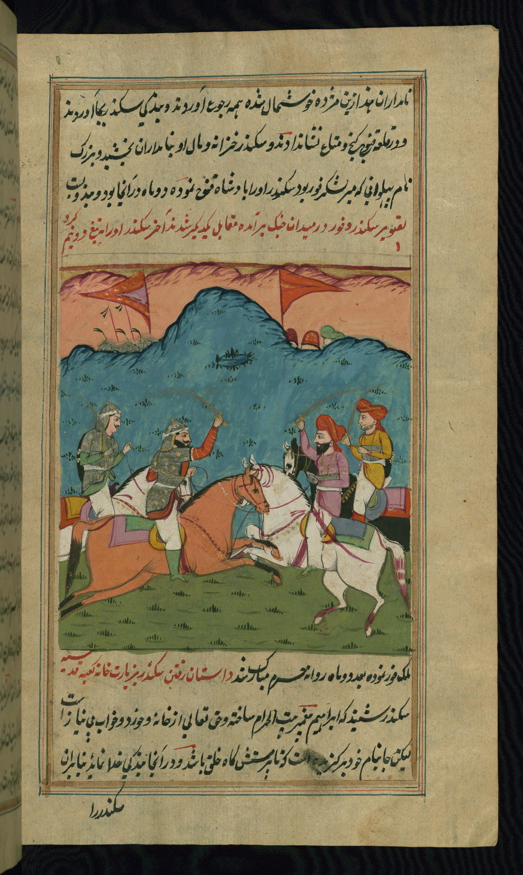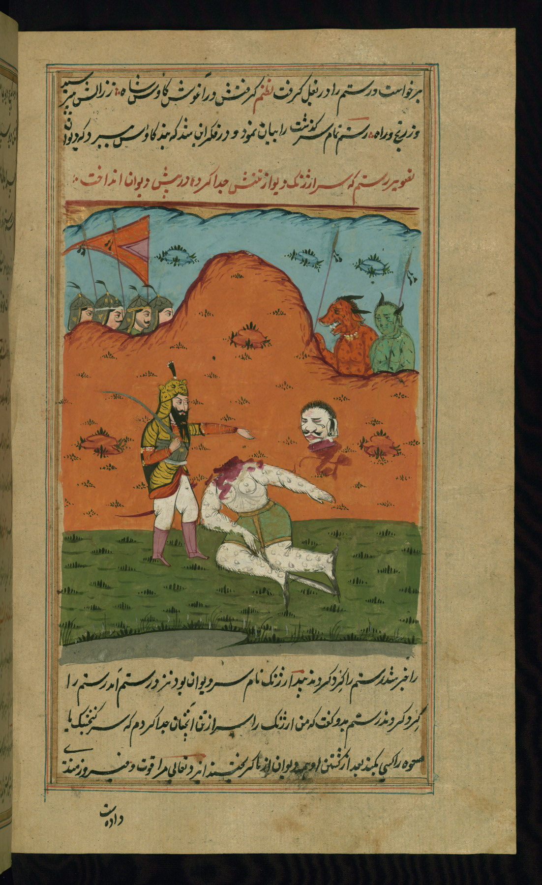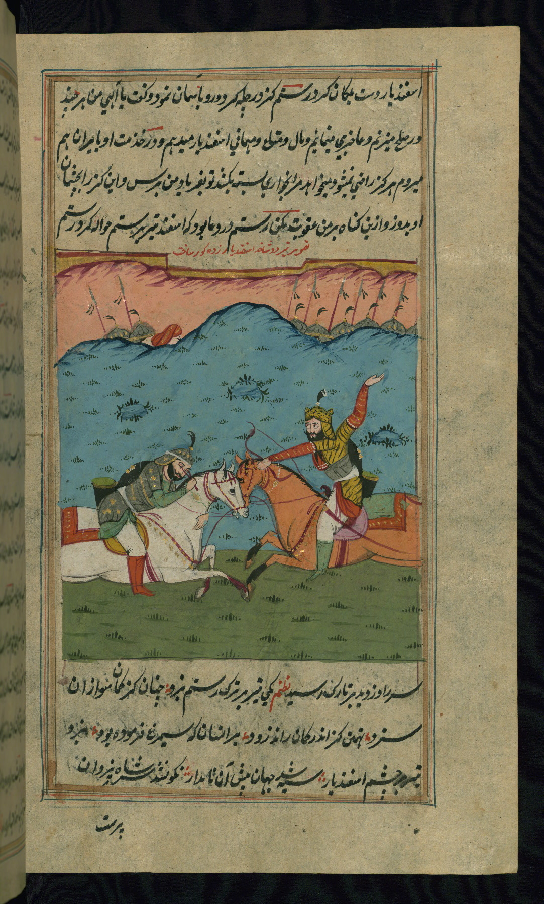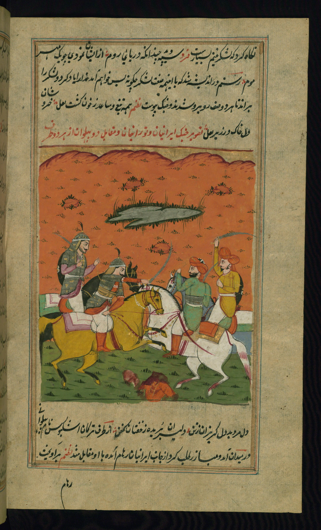 - Label: The subject of this scene, described in red nastaʿlīq script, is the killing of the legendary favorite son Īraj by his brother Tūr.