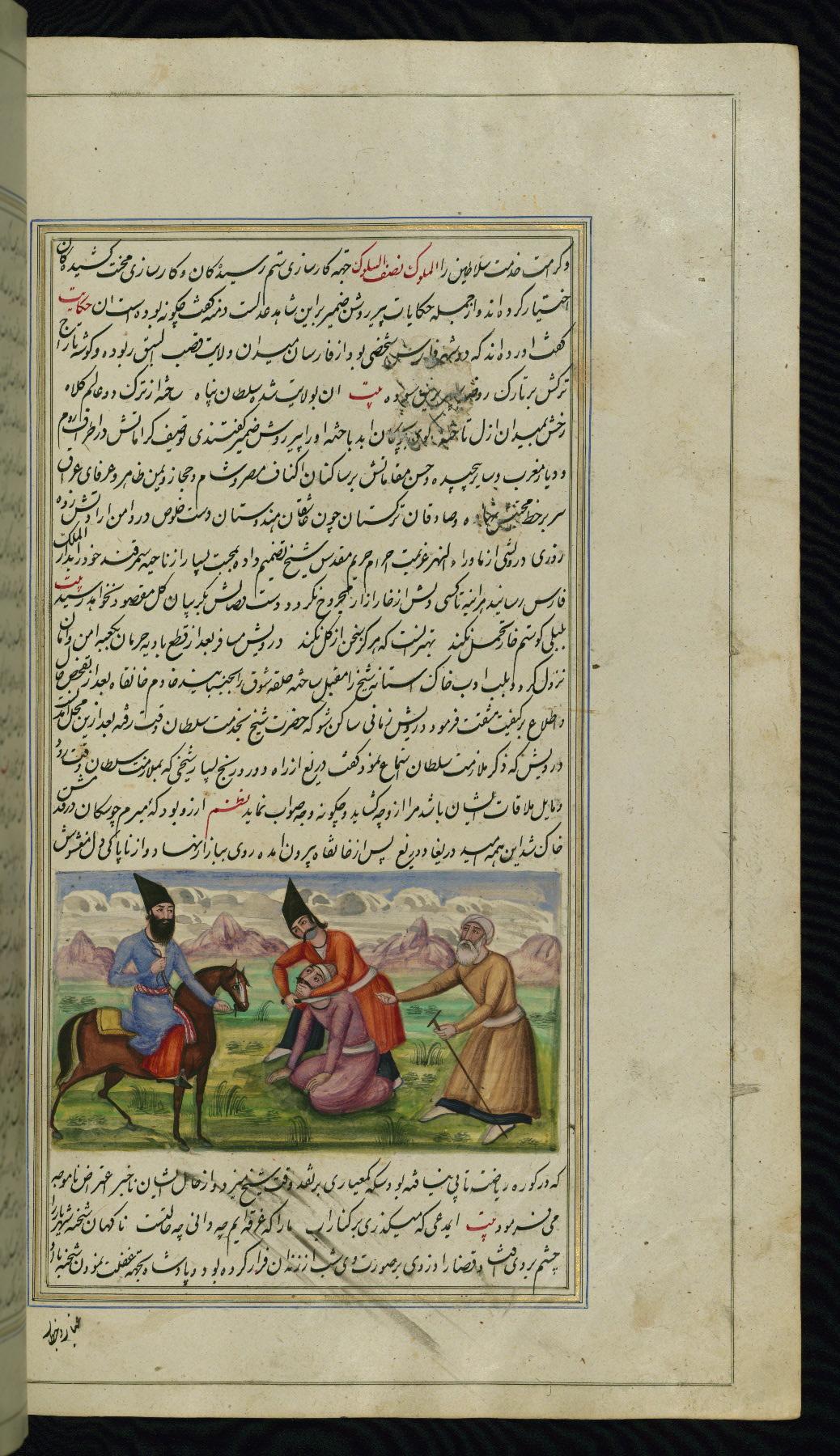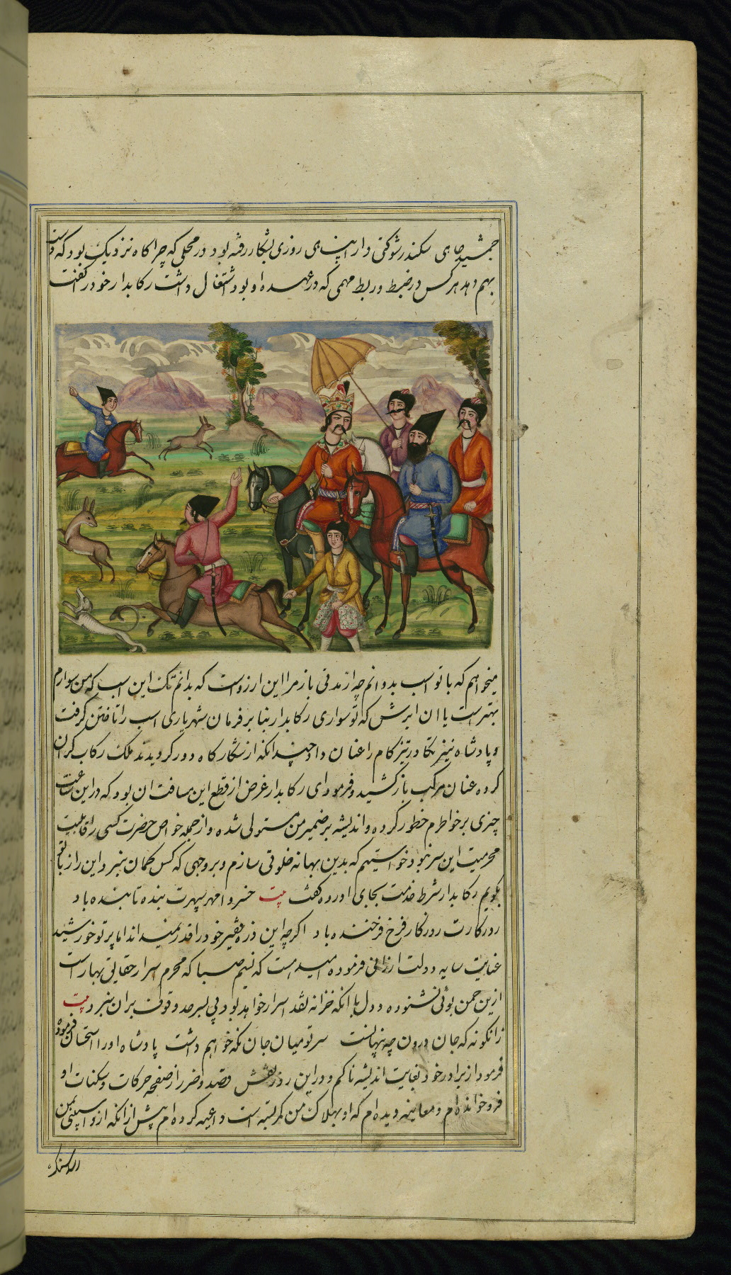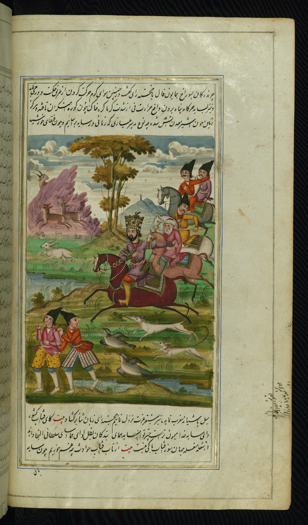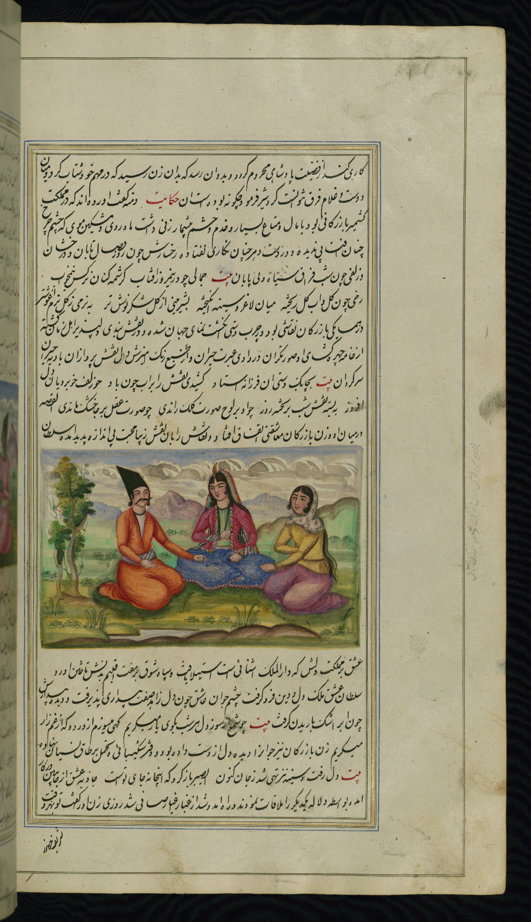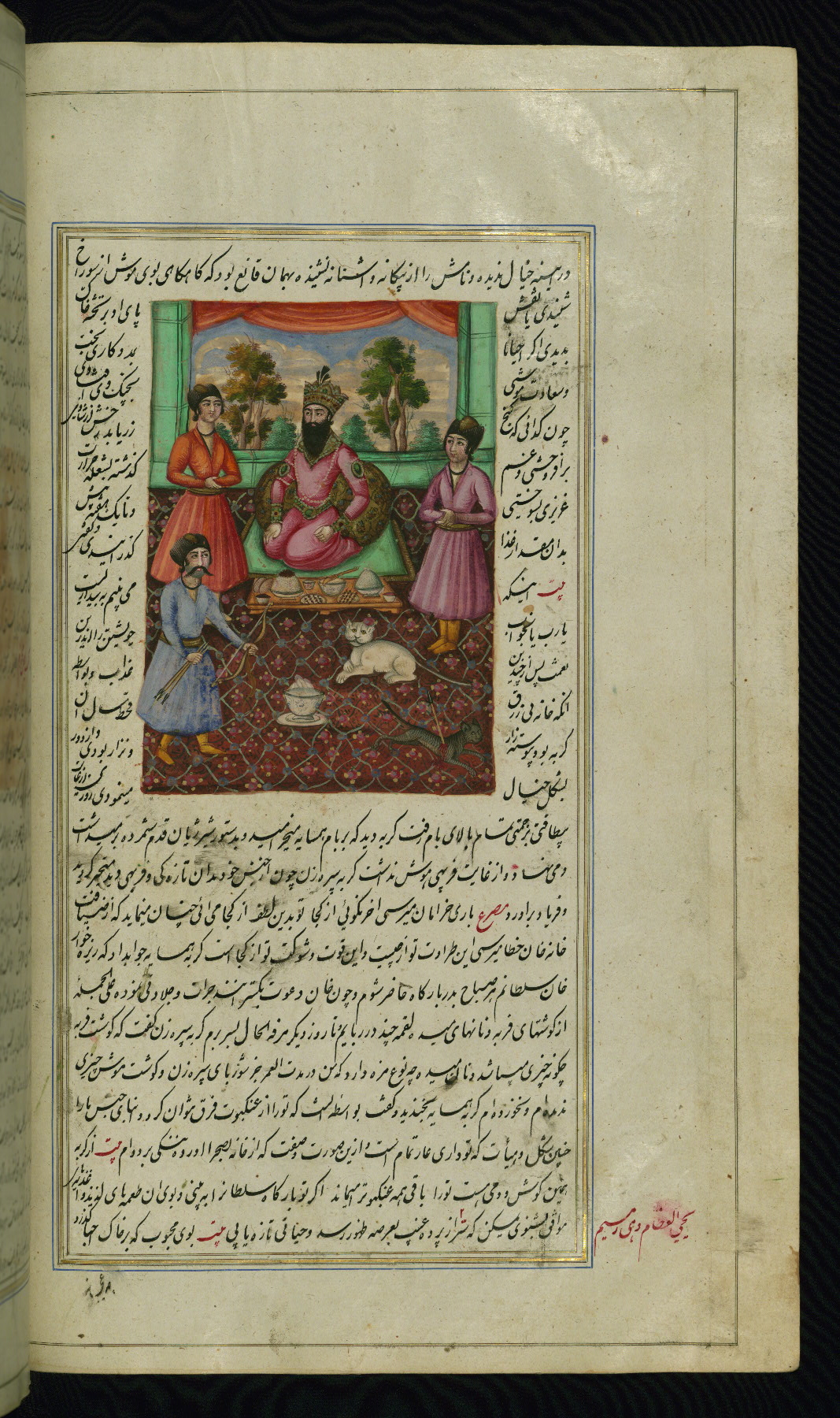 - Hand note: Written in nastaʿliq script, influenced by shikastah script, in black and red ink