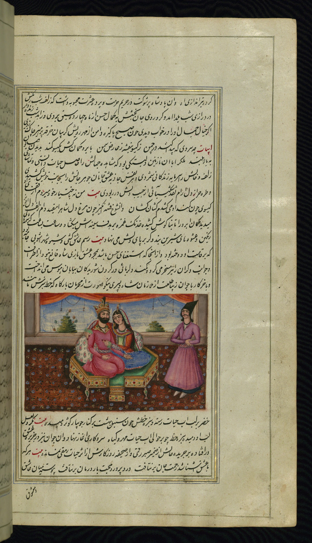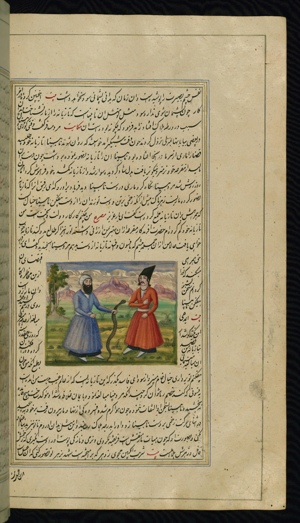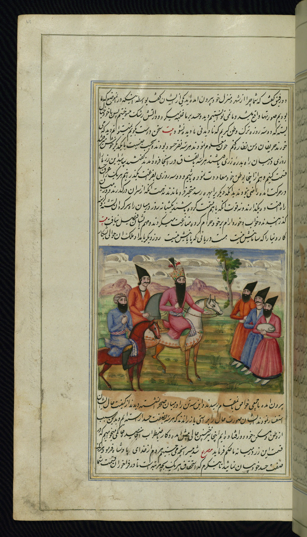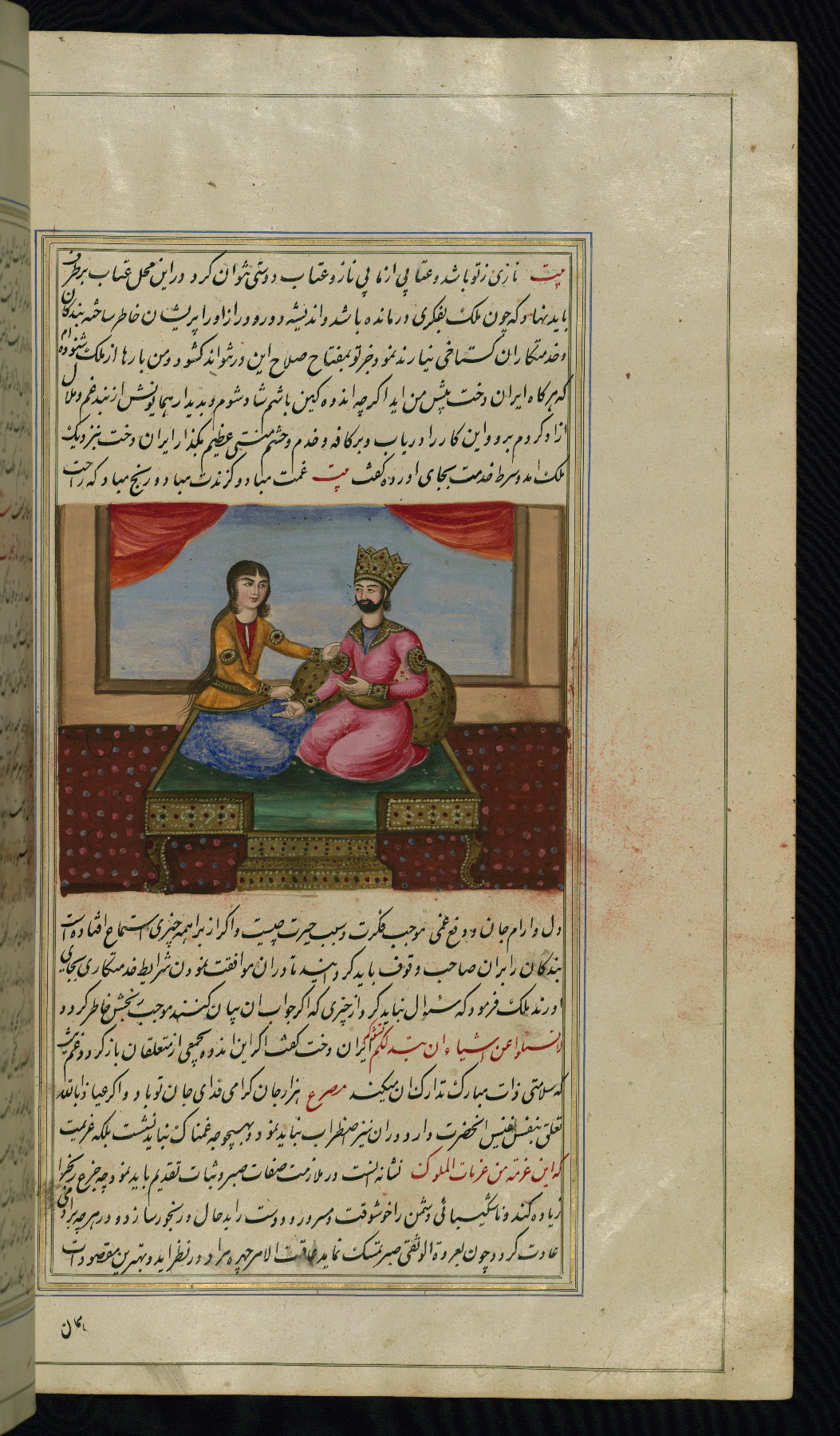 - Hand note: Written in nastaʿliq script, influenced by shikastah script, in black and red ink