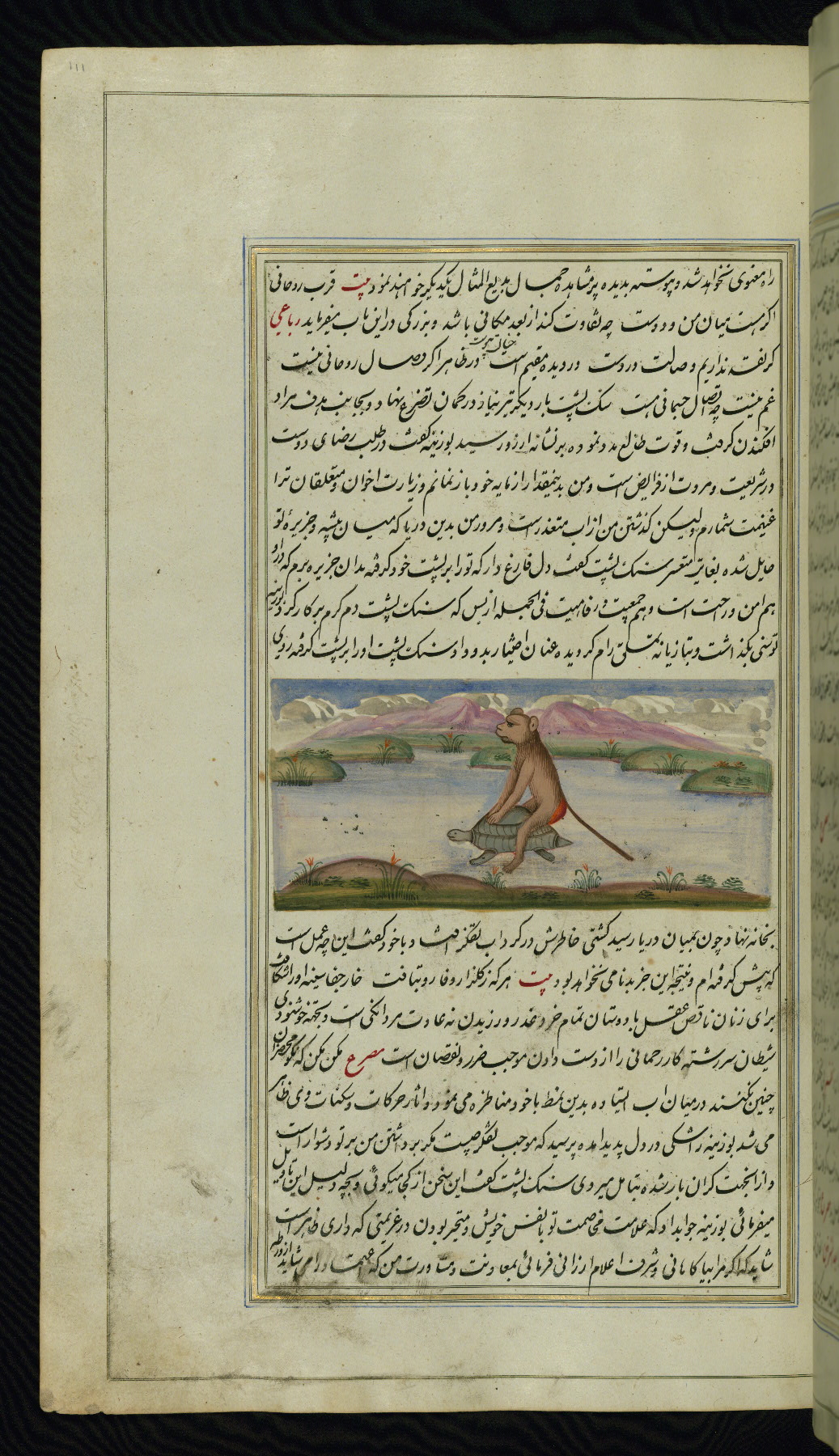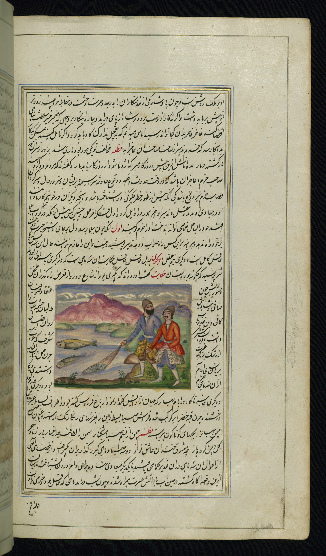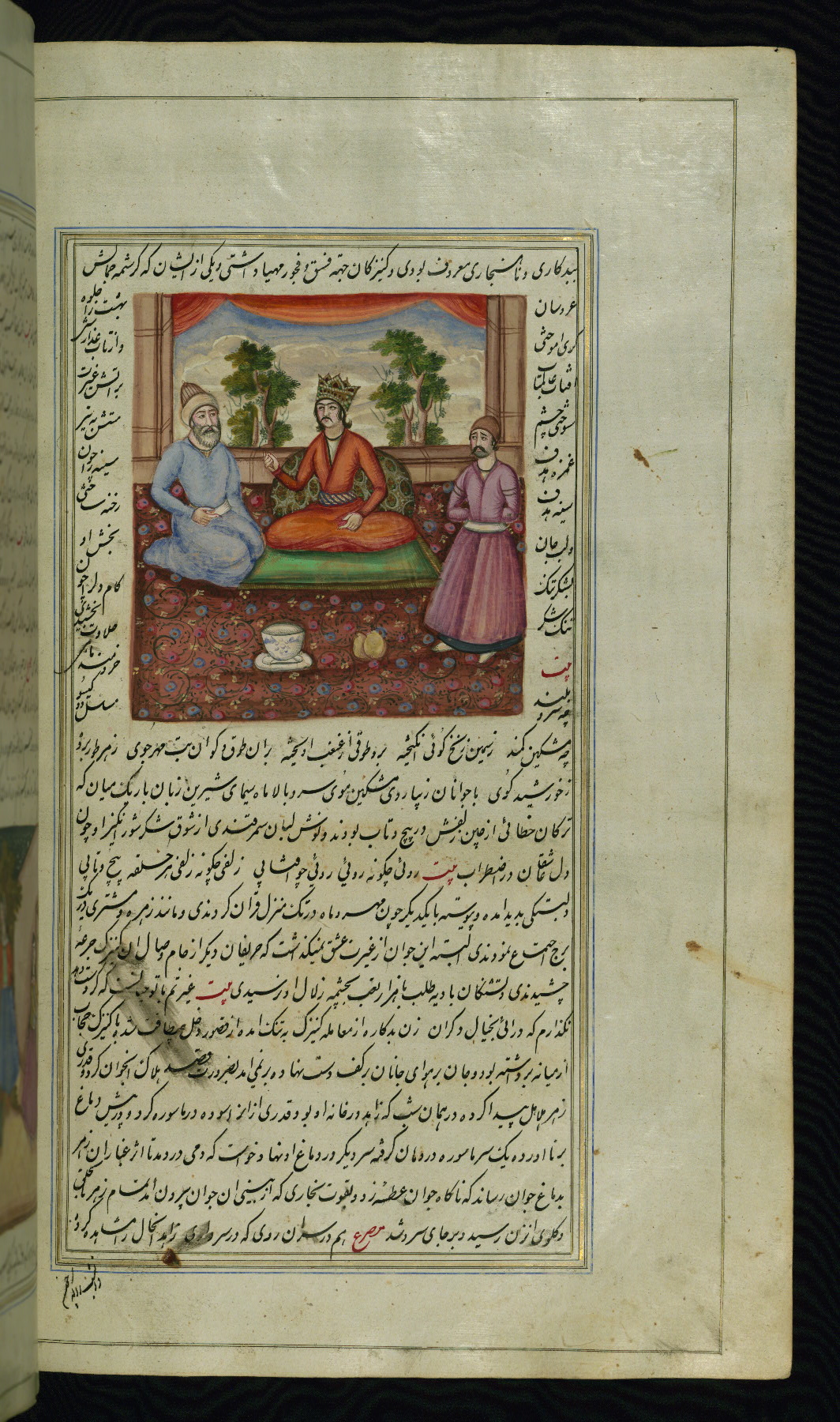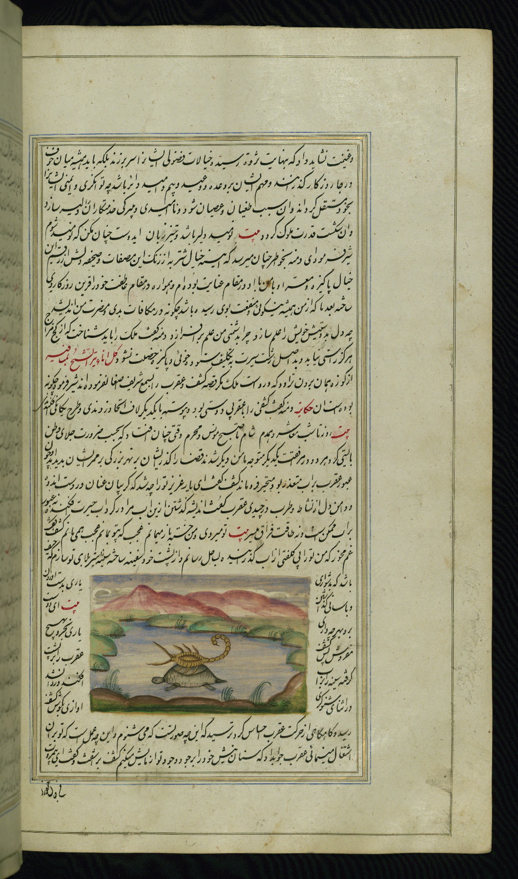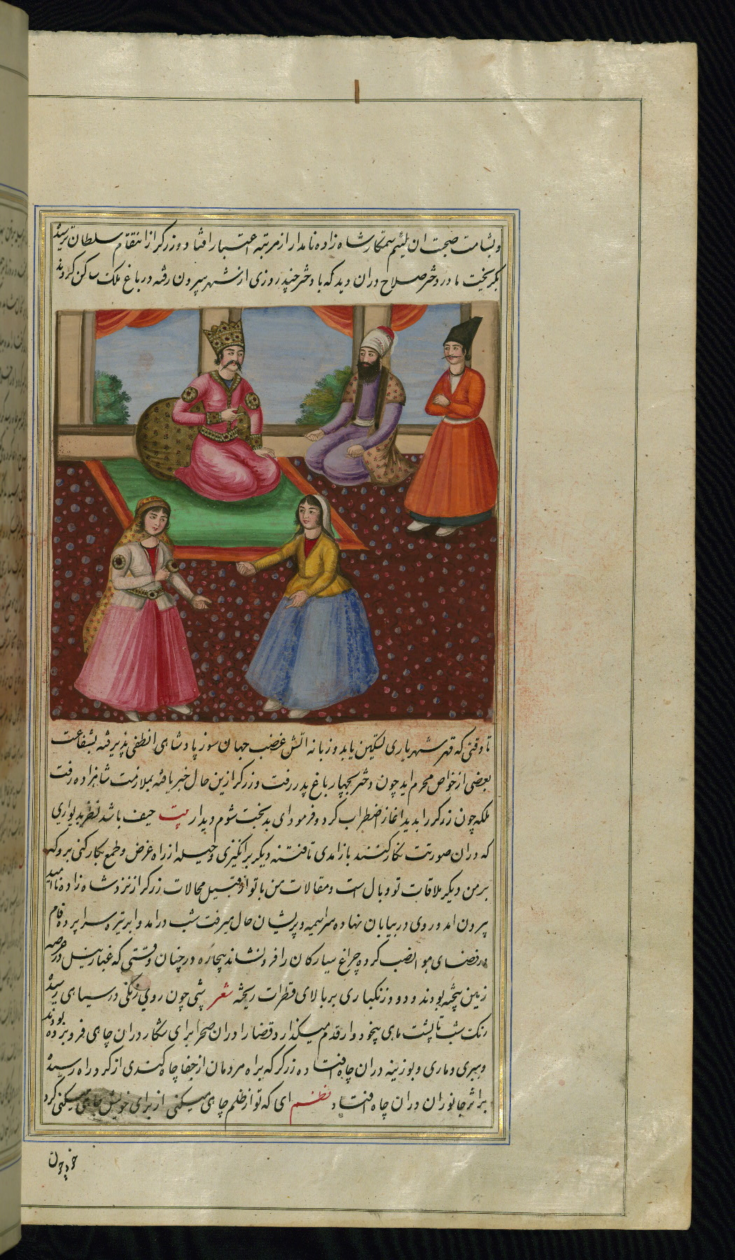 - Hand note: Written in nastaʿliq script, influenced by shikastah script, in black and red ink