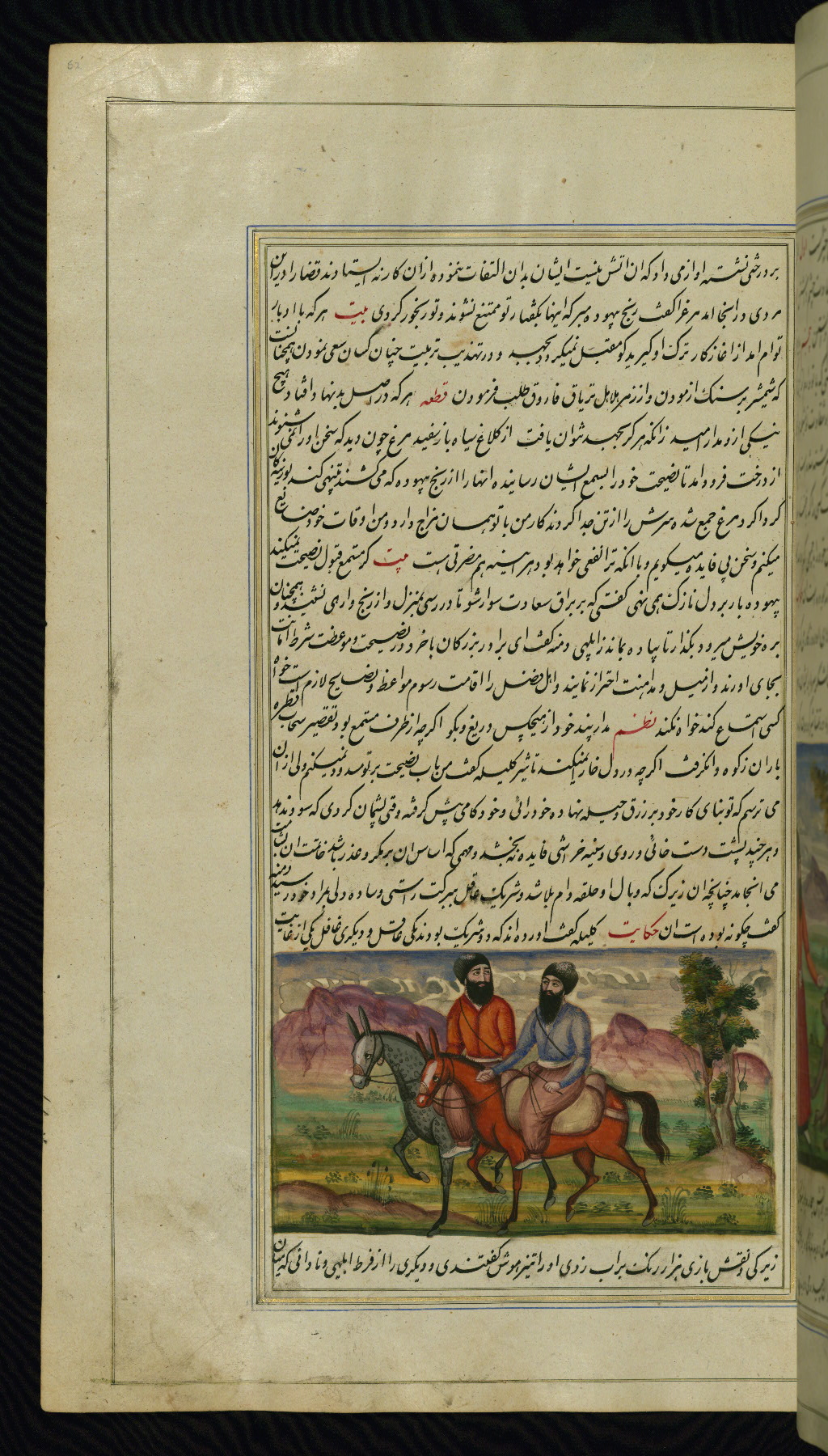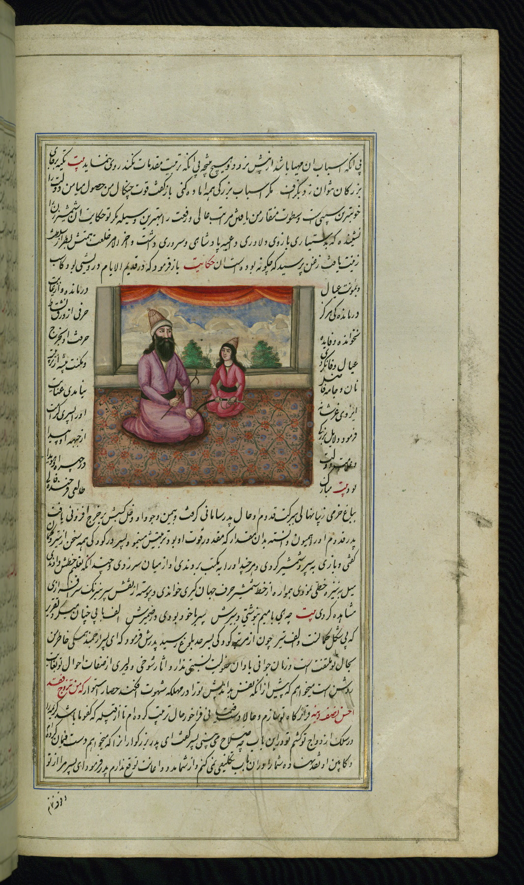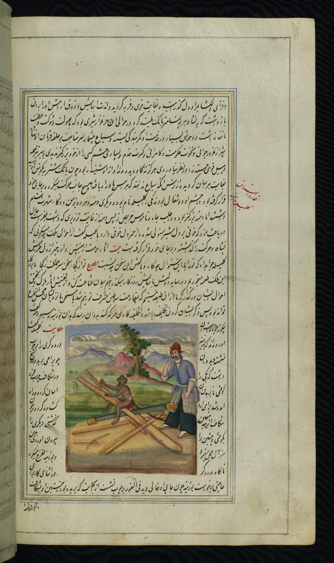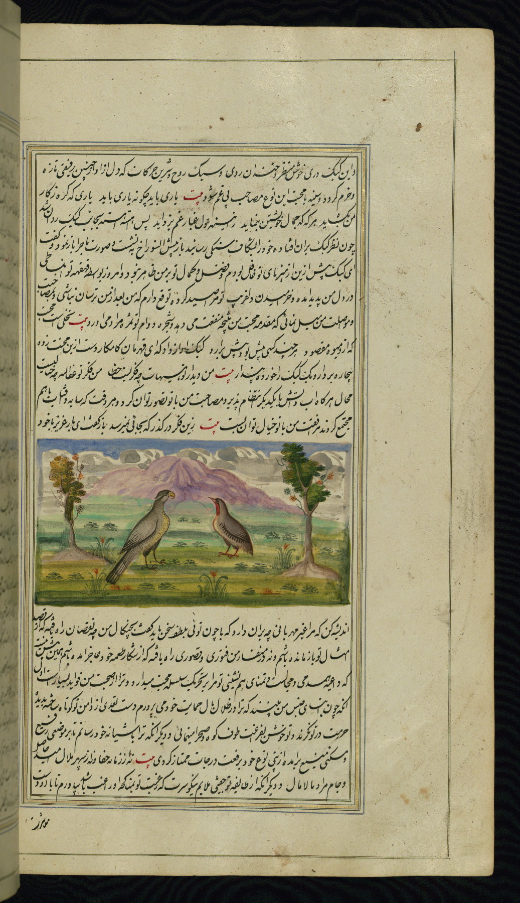- Hand note: Written in nastaʿliq script, influenced by shikastah script, in black and red ink