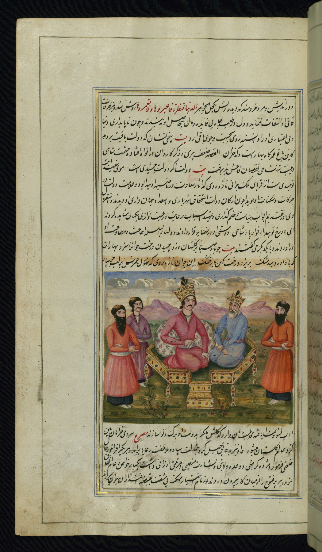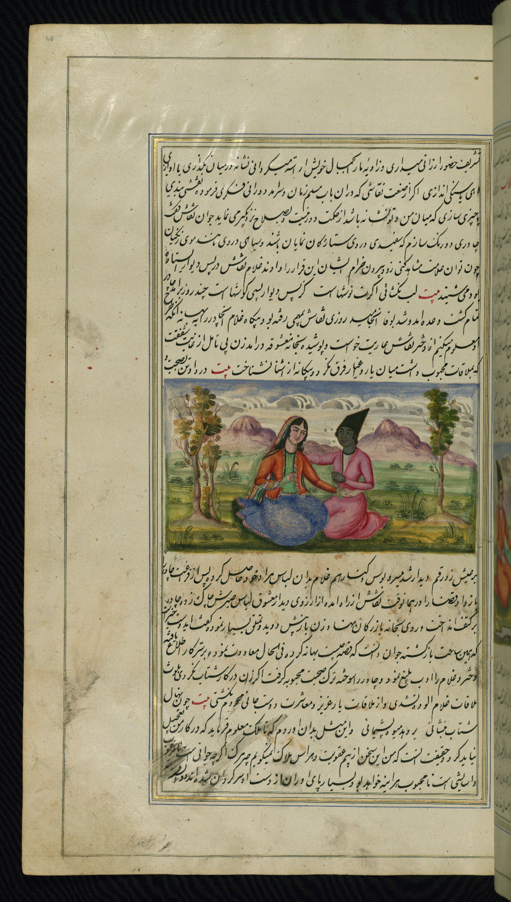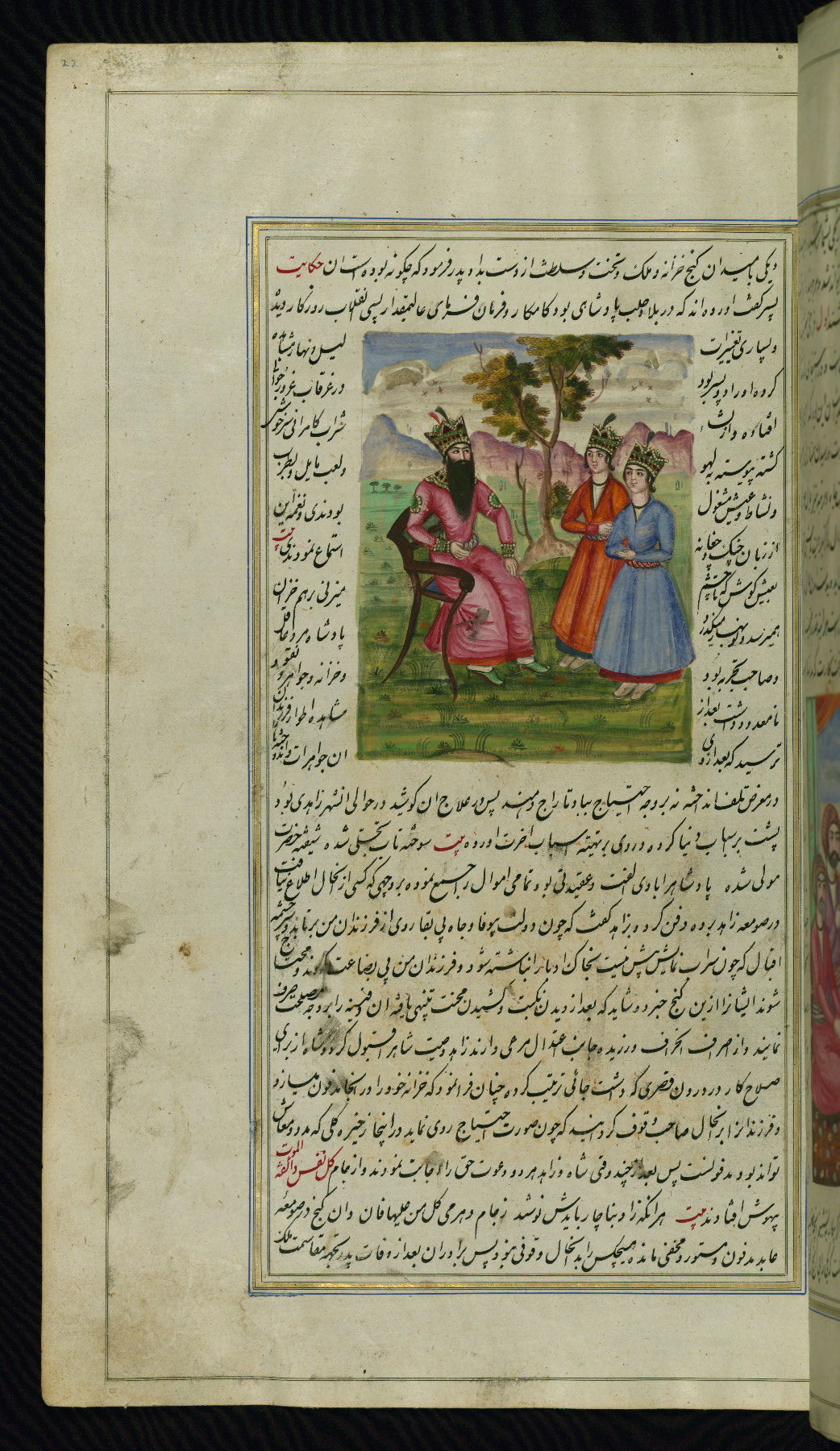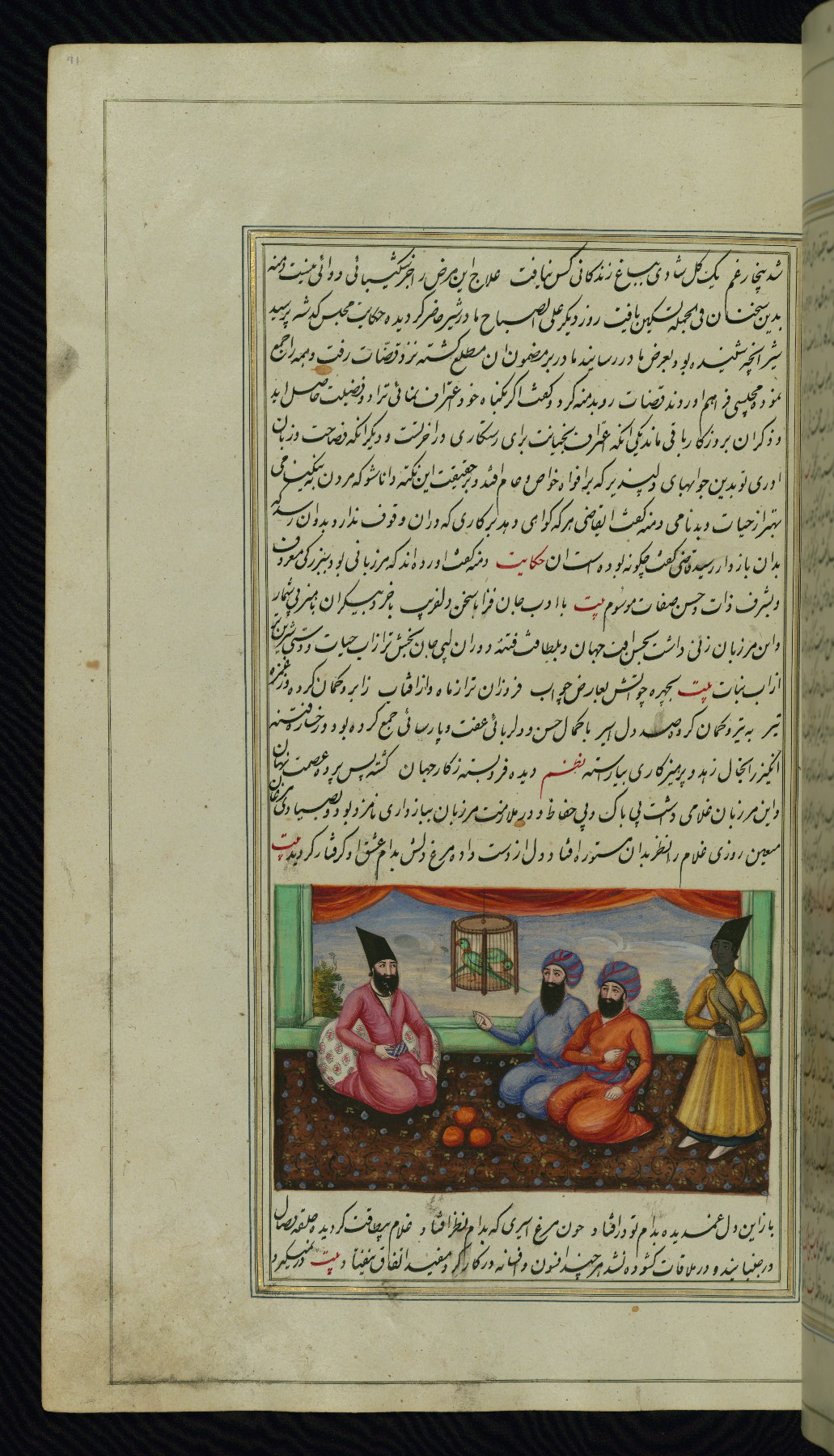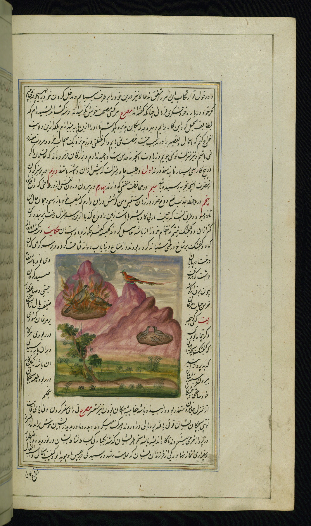 - Hand note: Written in nastaʿliq script, influenced by shikastah script, in black and red ink