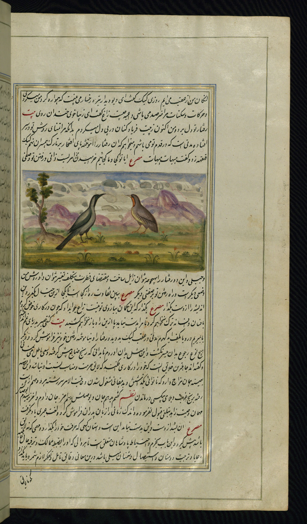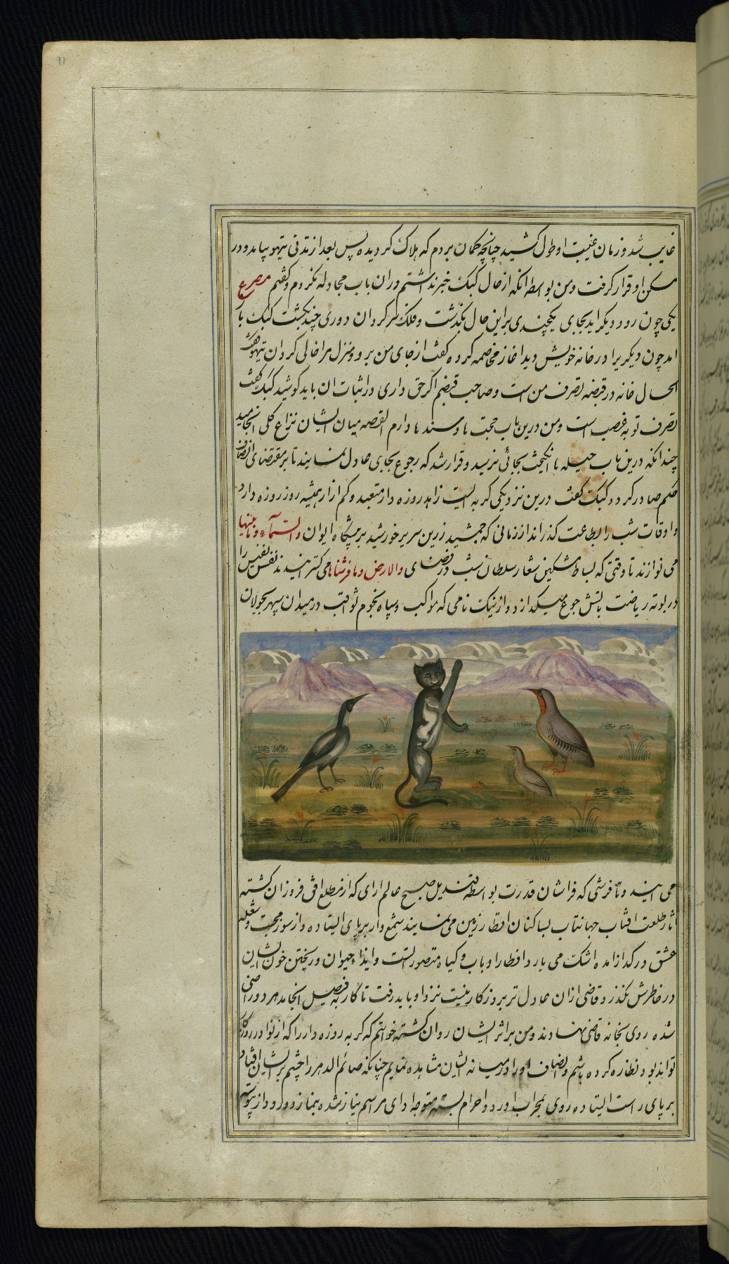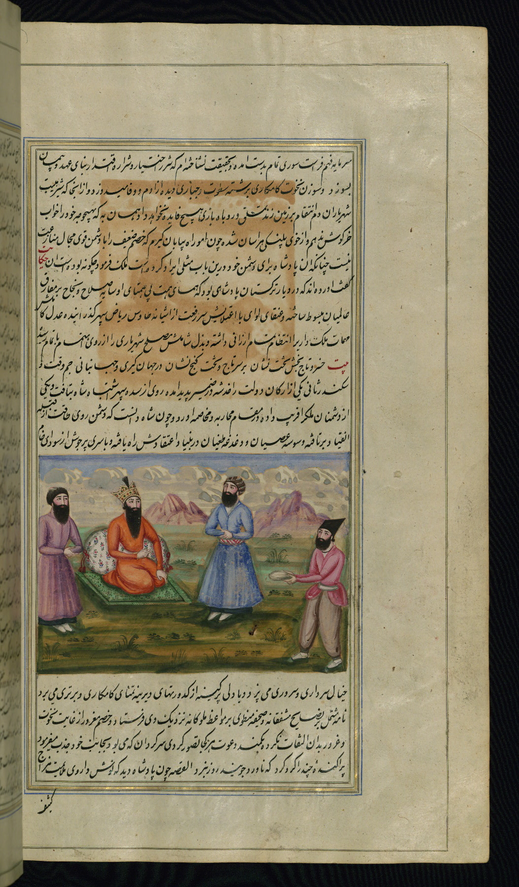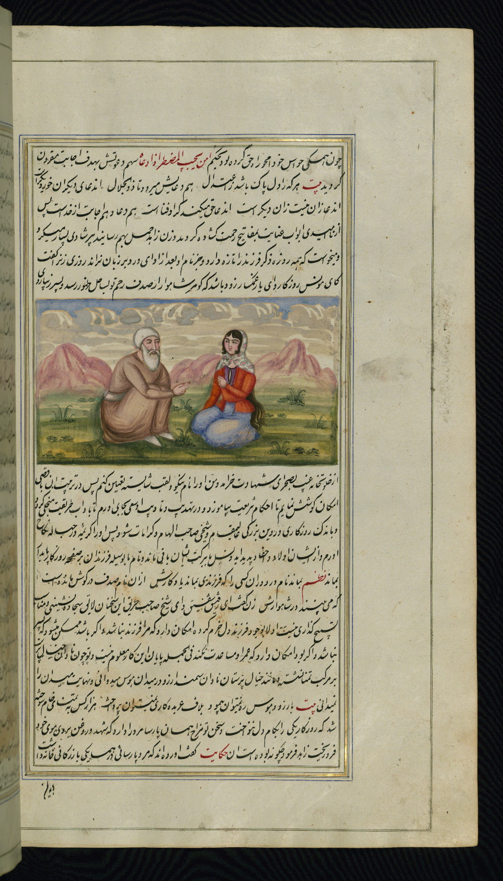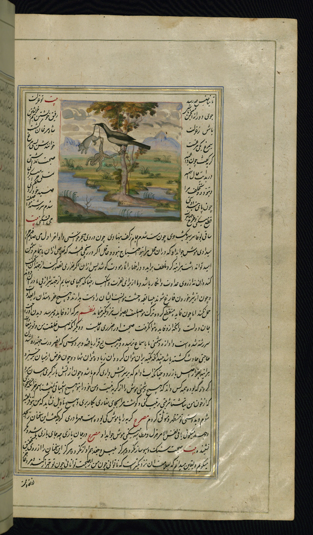 - Hand note: Written in nastaʿliq script, influenced by shikastah script, in black and red ink