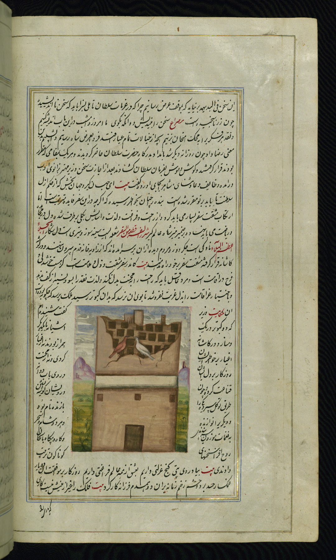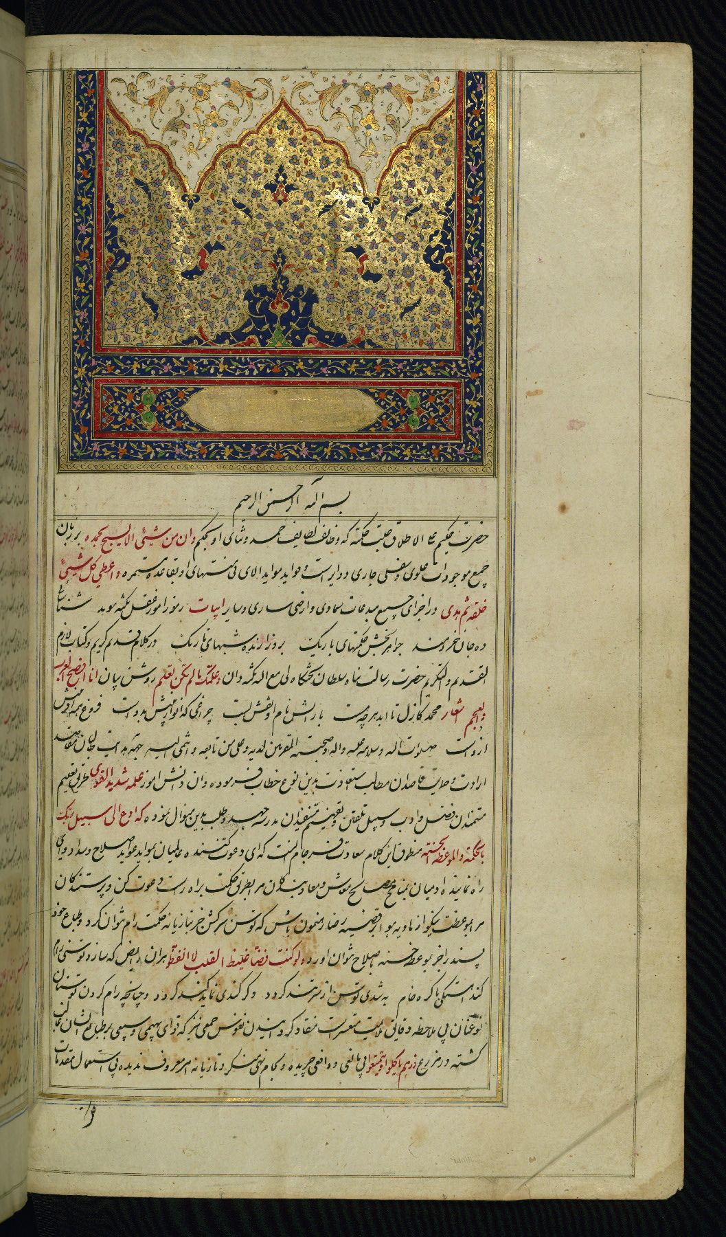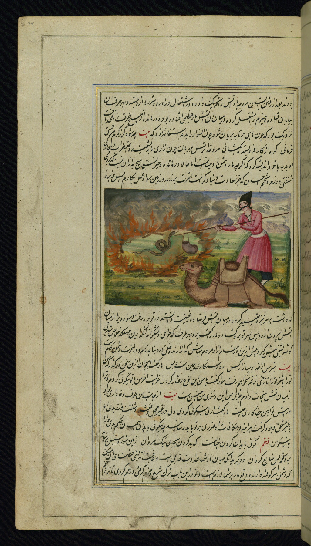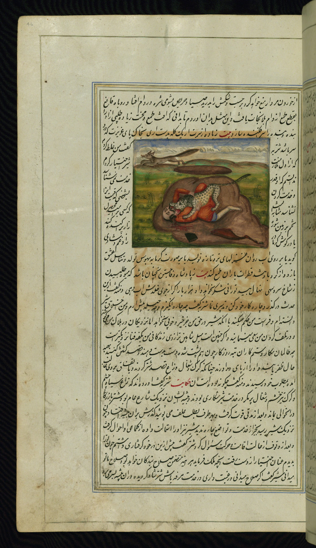 - Hand note: Written in nastaʿliq script, influenced by shikastah script, in black and red ink