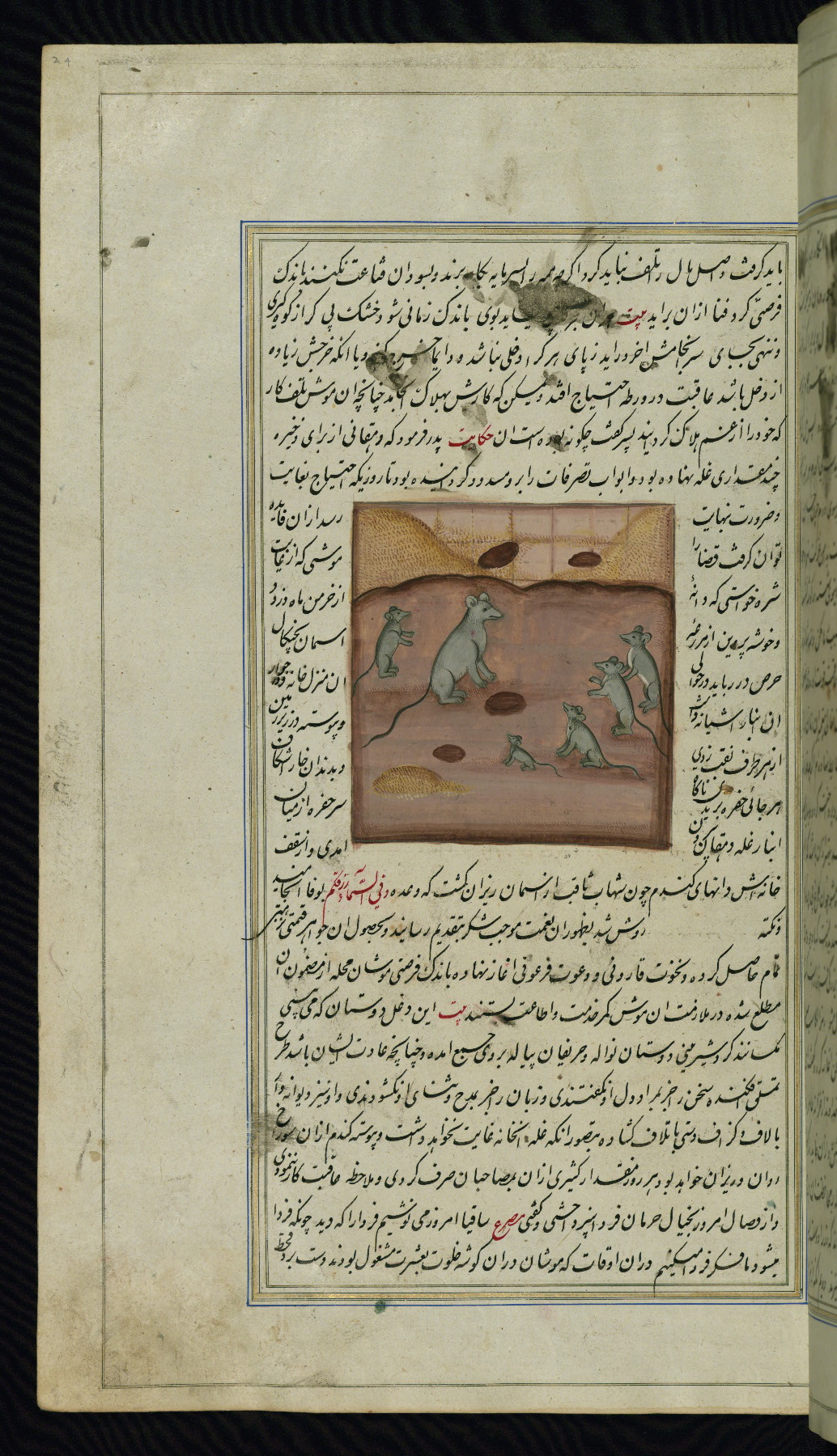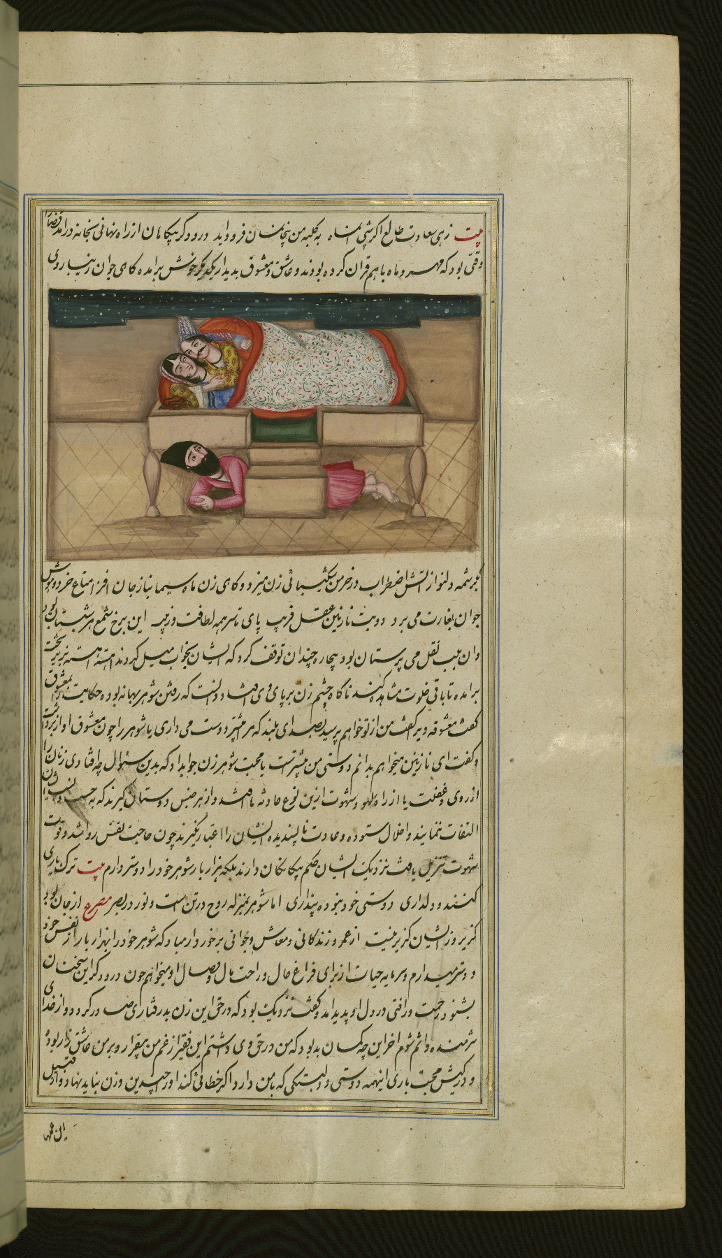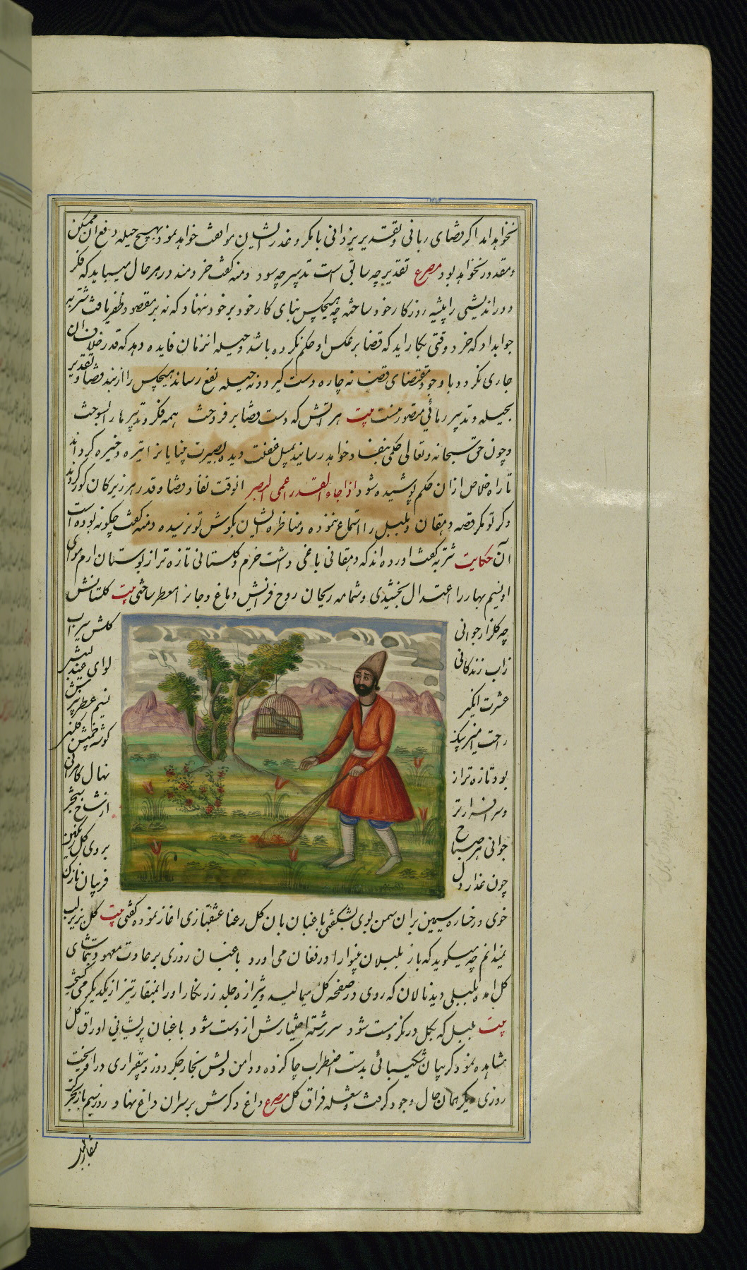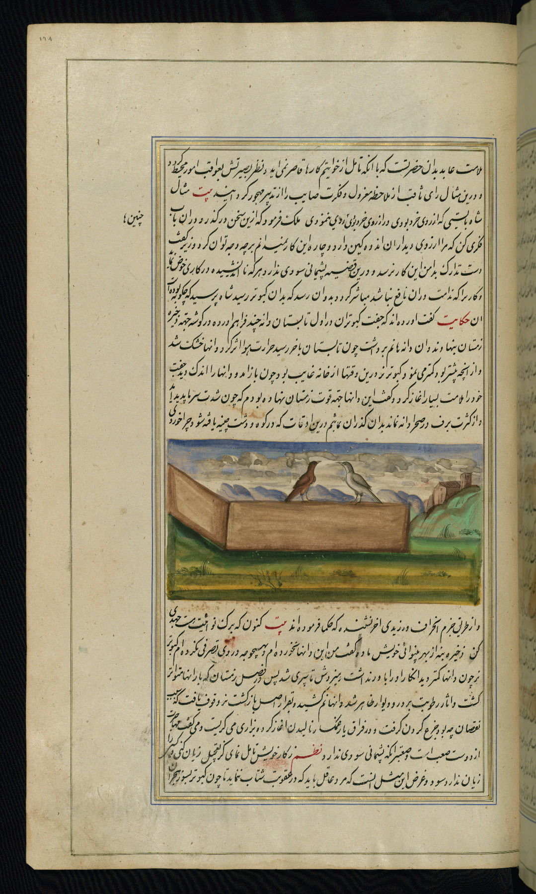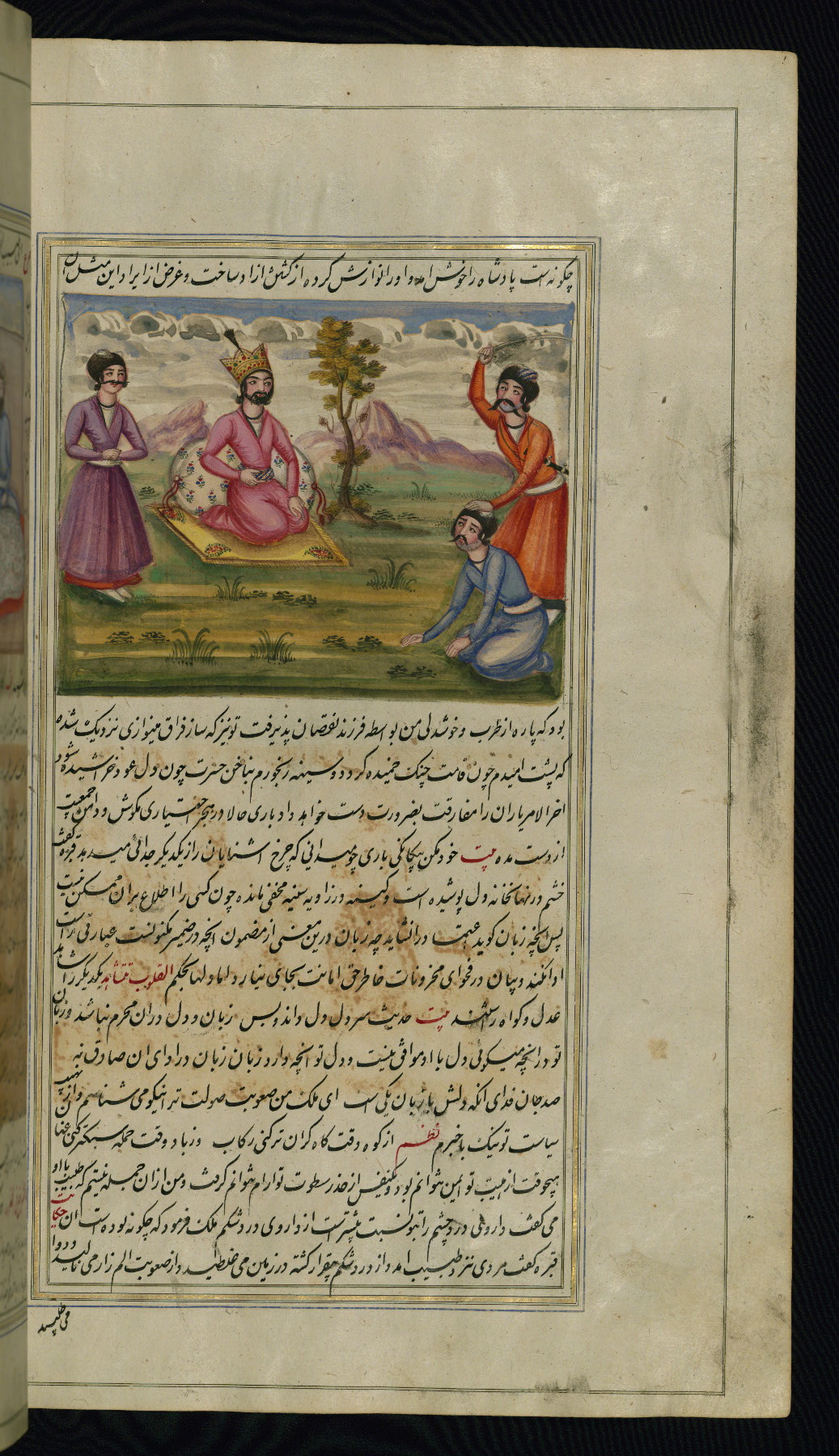 - Hand note: Written in nastaʿliq script, influenced by shikastah script, in black and red ink