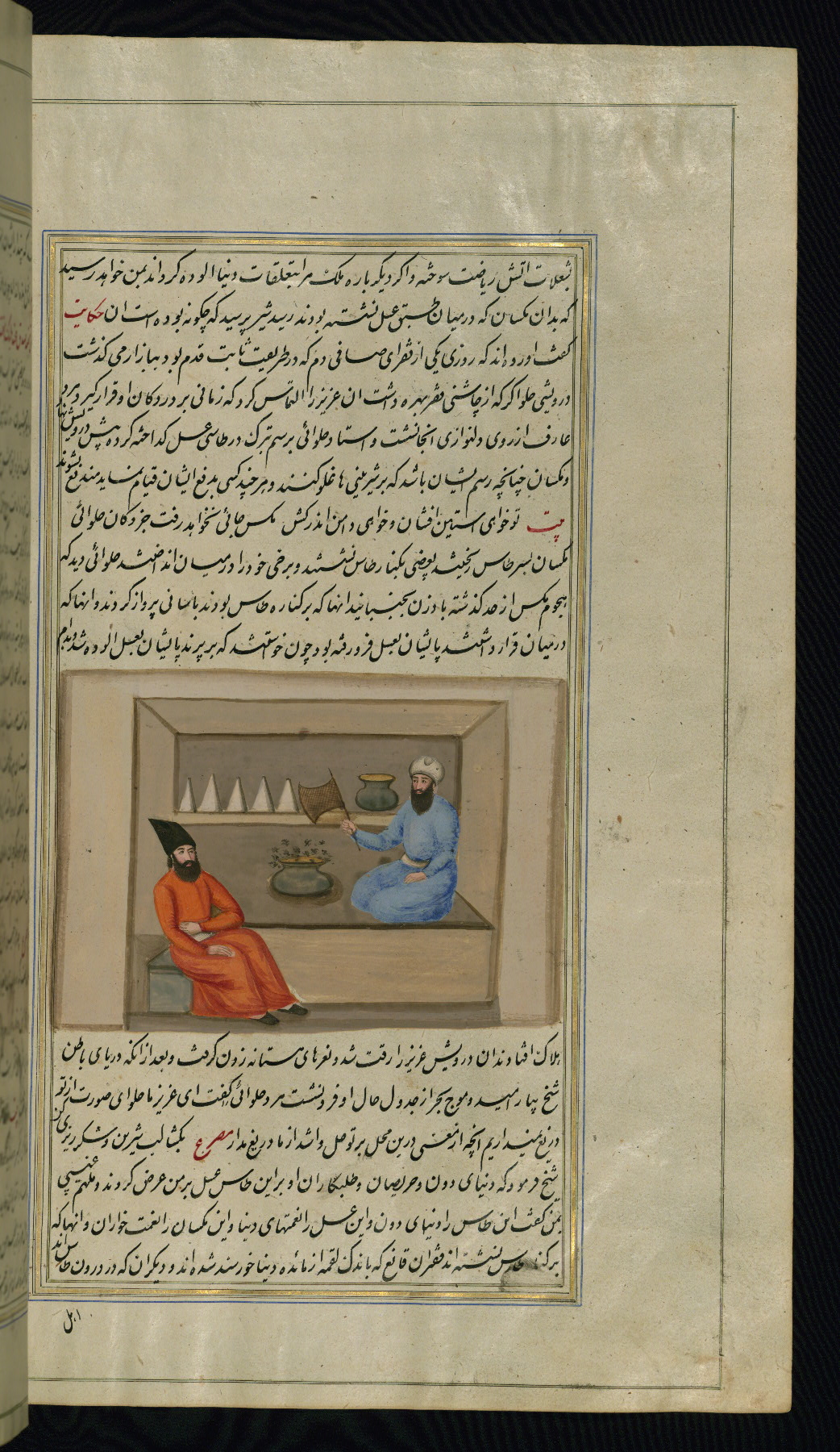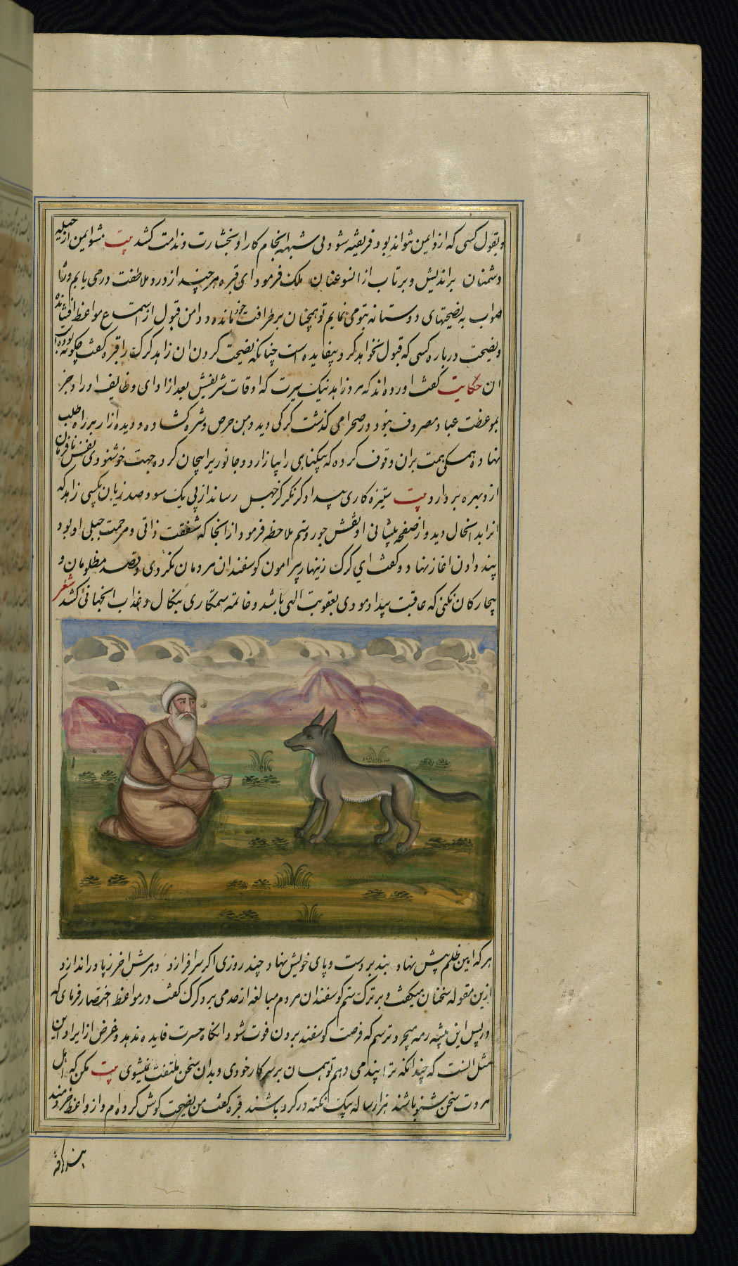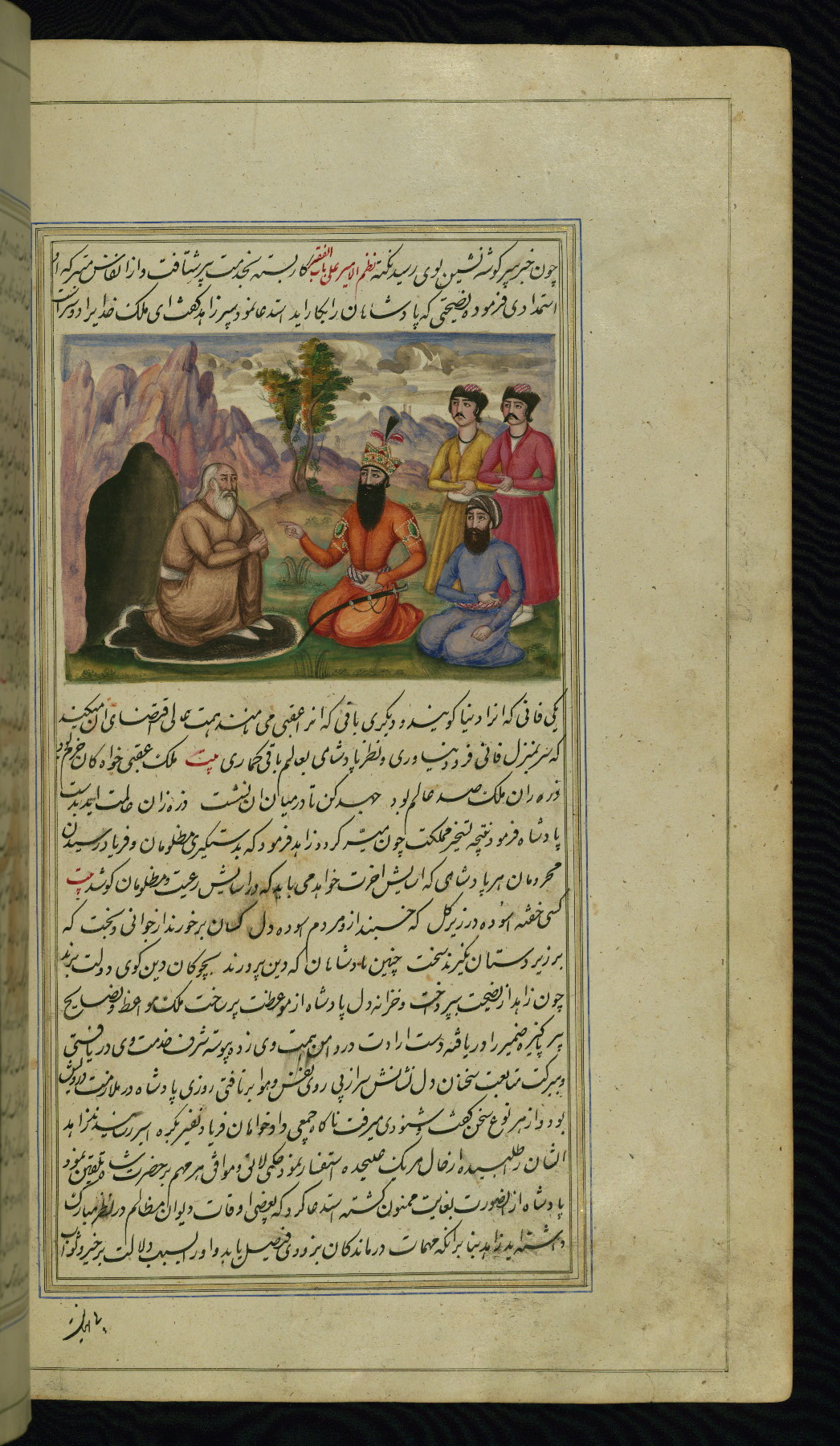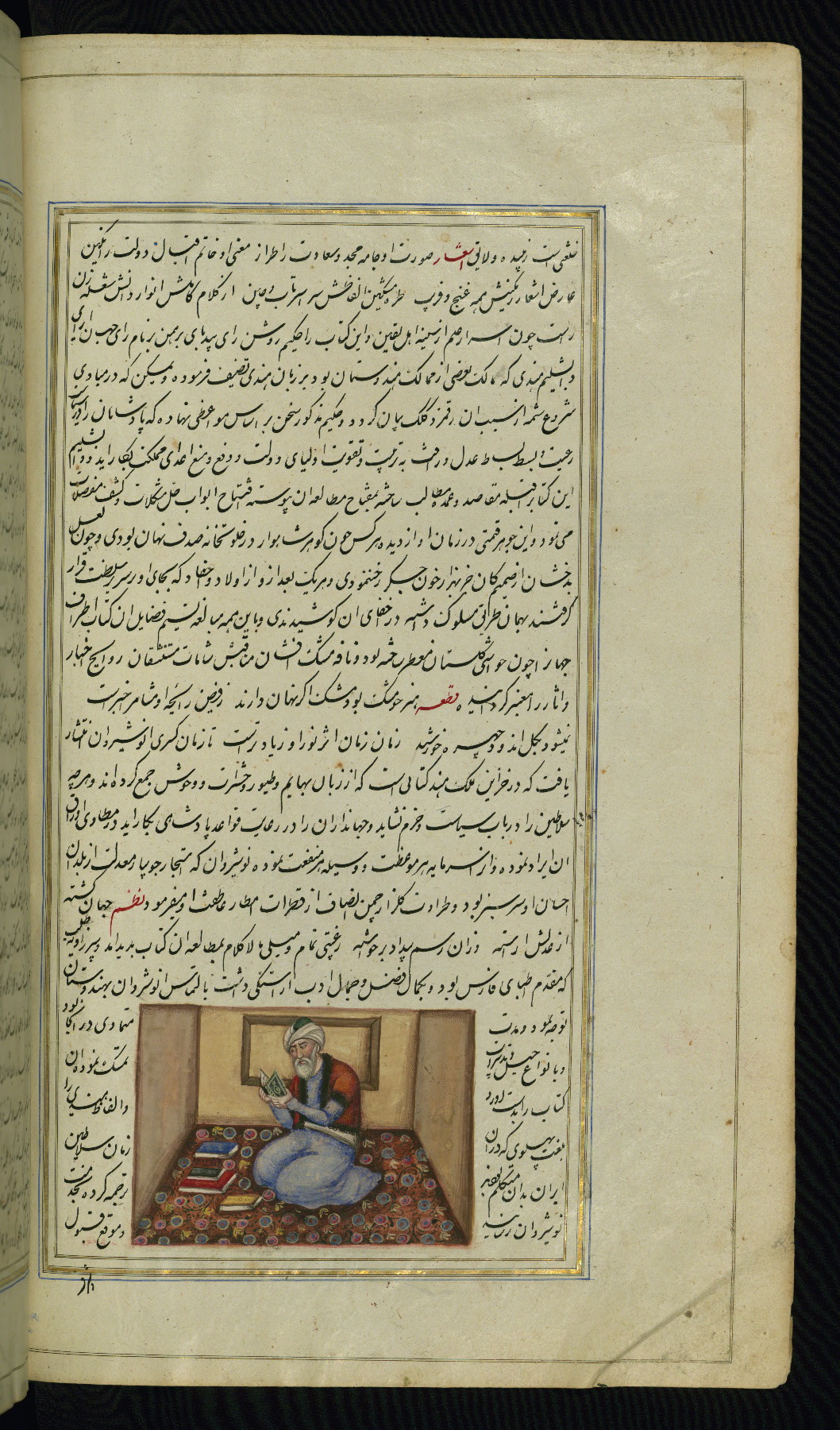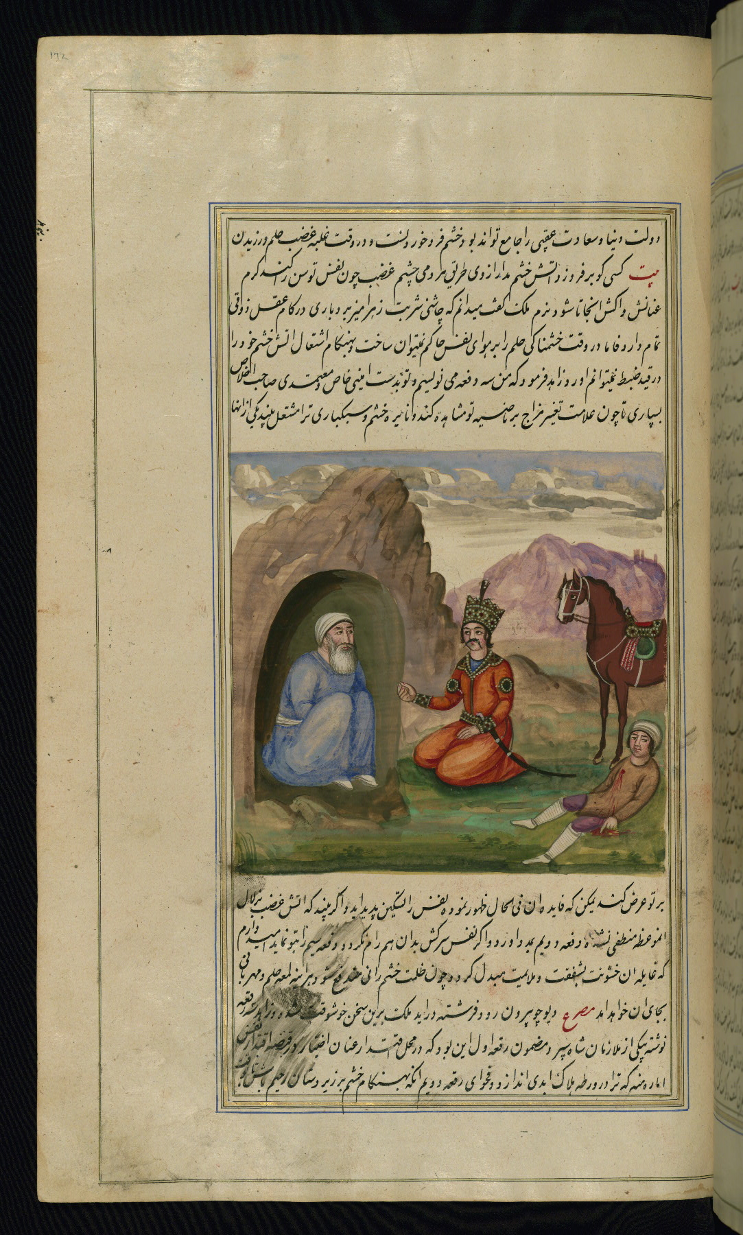 - Label: This illustration depicts a scholar (perhaps Barzūyah, the physician of Nūshirwān, who deputed the author to seek the work known to us as the Fables of Bīdpāy).