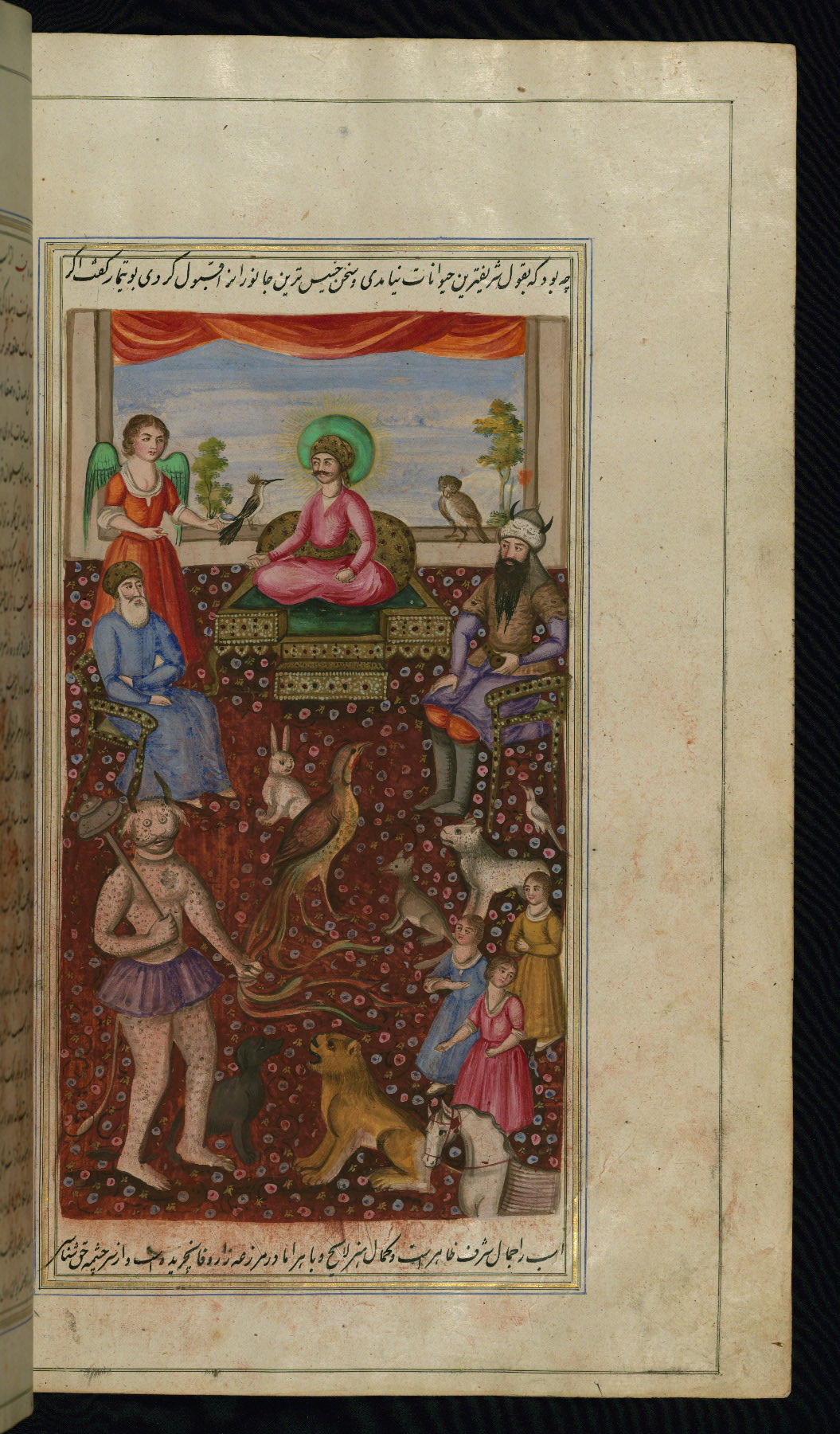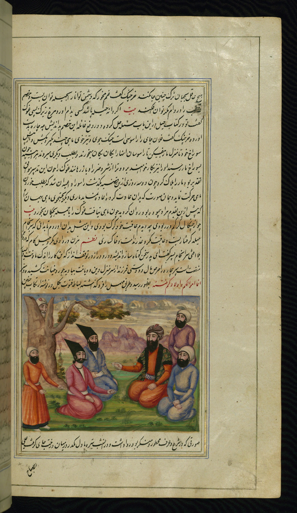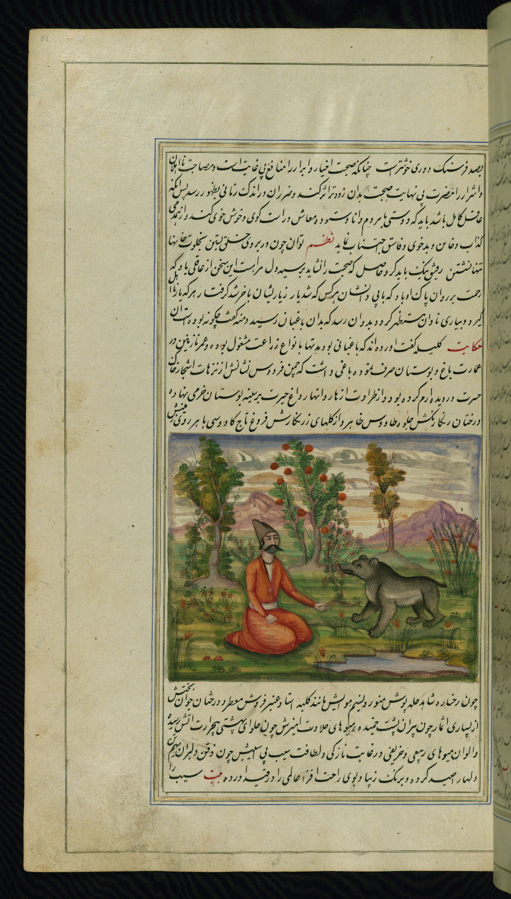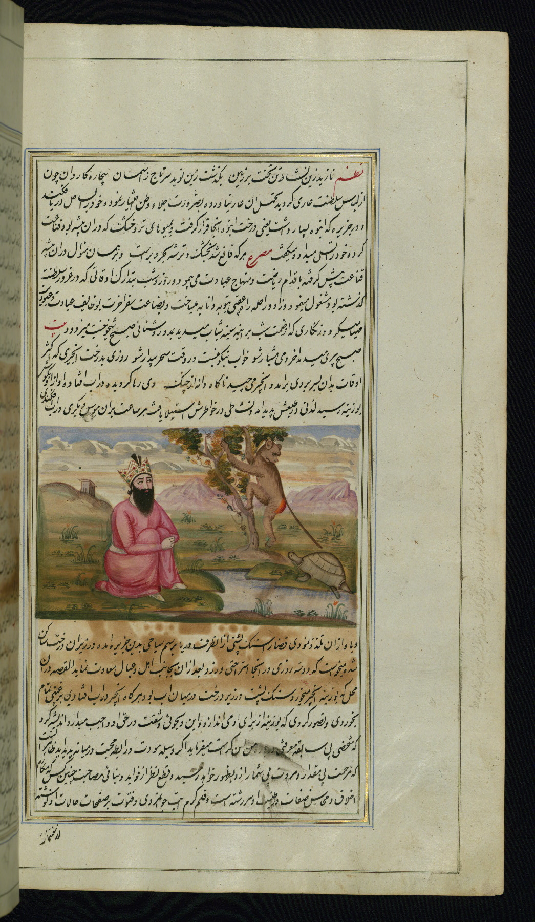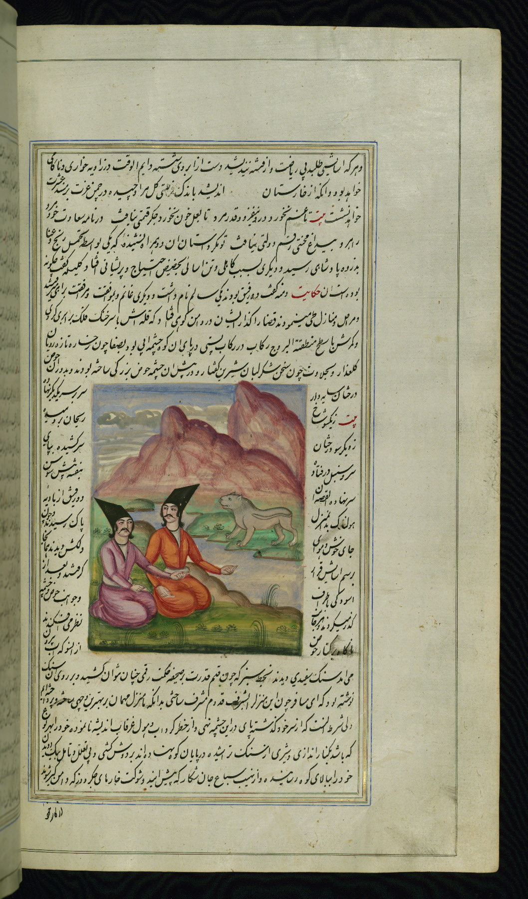 - Label: This illustration depicts a scholar (perhaps Barzūyah, the physician of Nūshirwān, who deputed the author to seek the work known to us as the Fables of Bīdpāy).