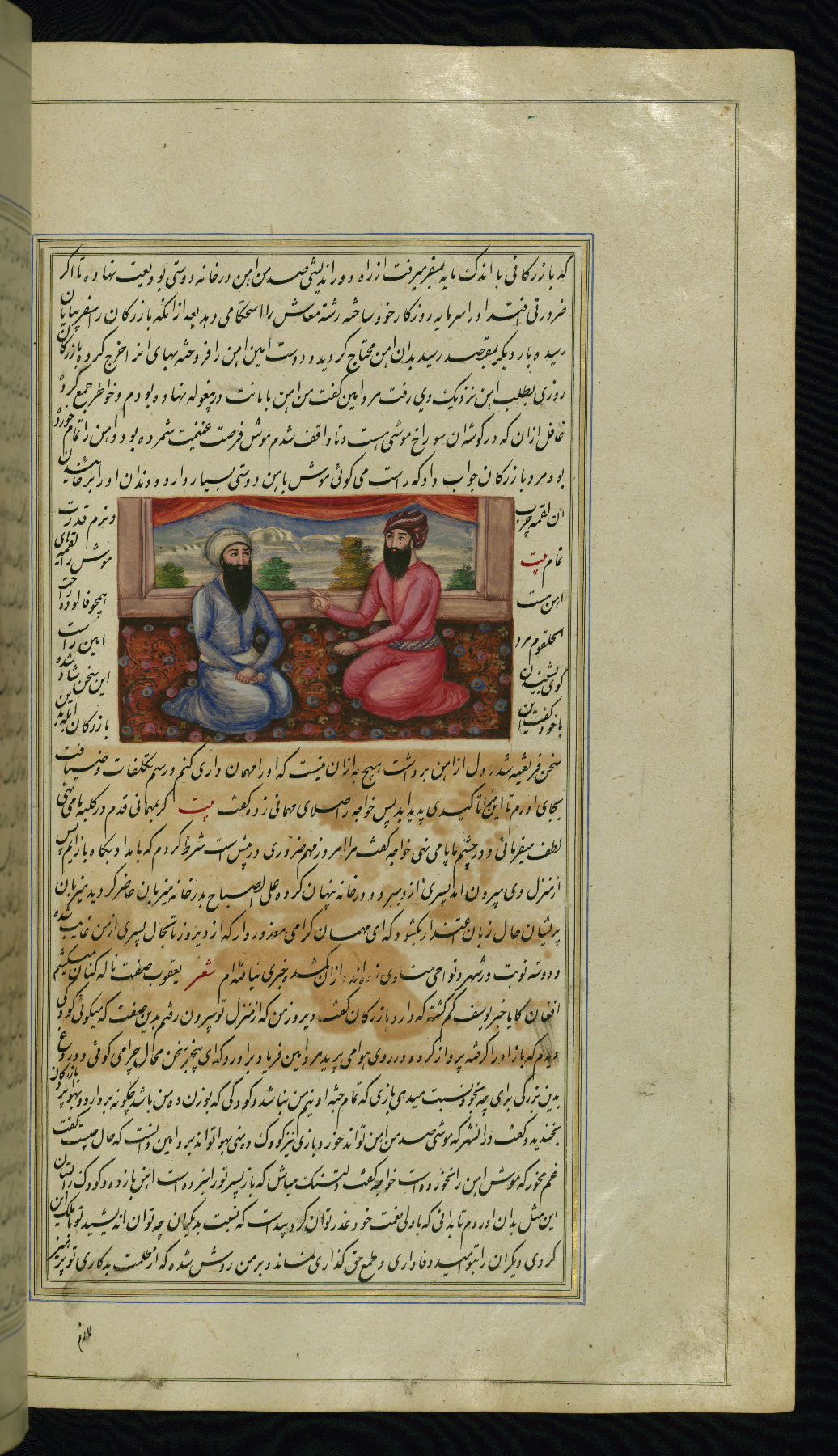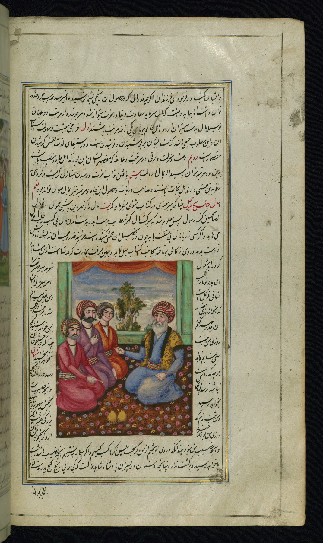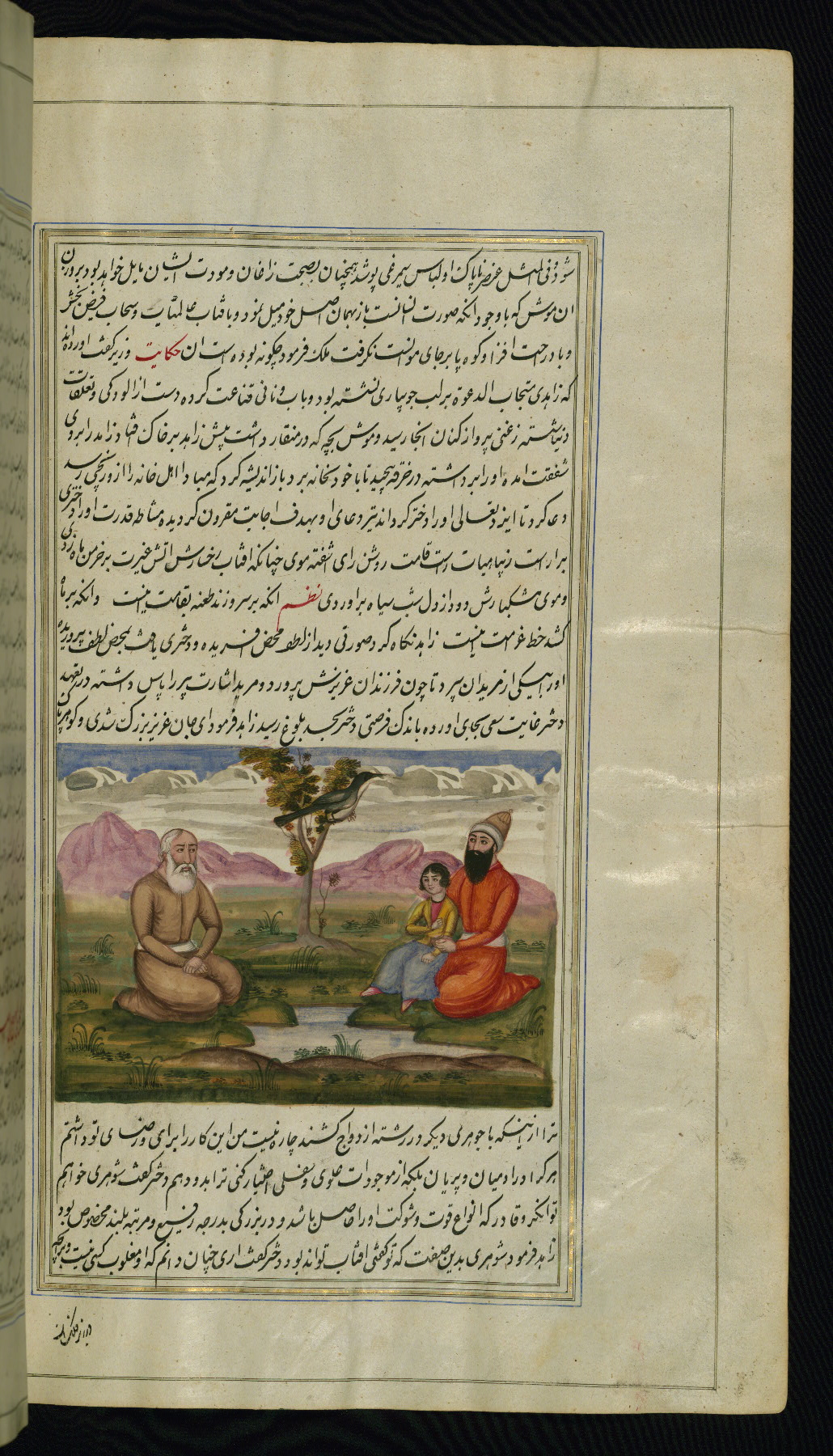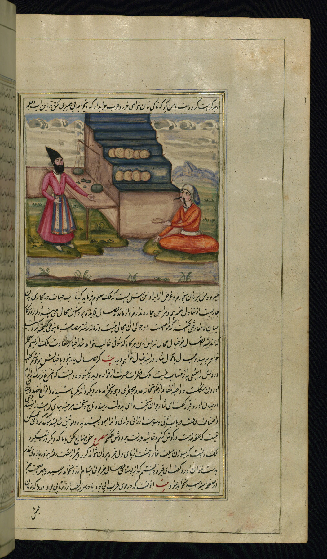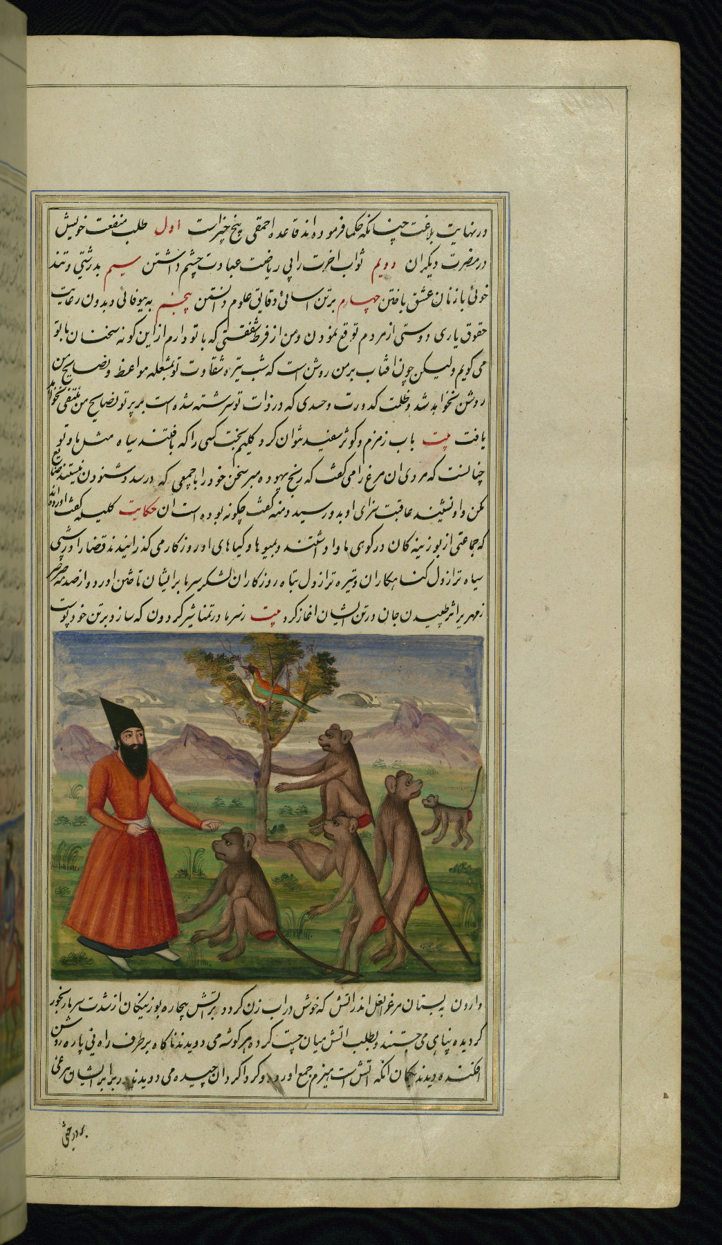 - Label: This illustration depicts a scholar (perhaps Barzūyah, the physician of Nūshirwān, who deputed the author to seek the work known to us as the Fables of Bīdpāy).