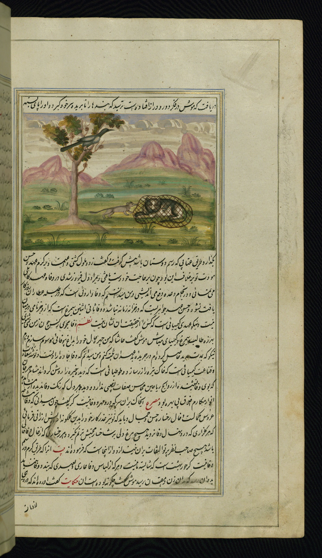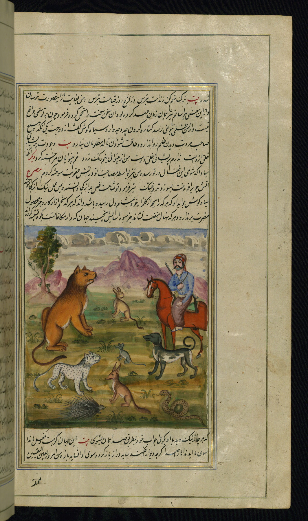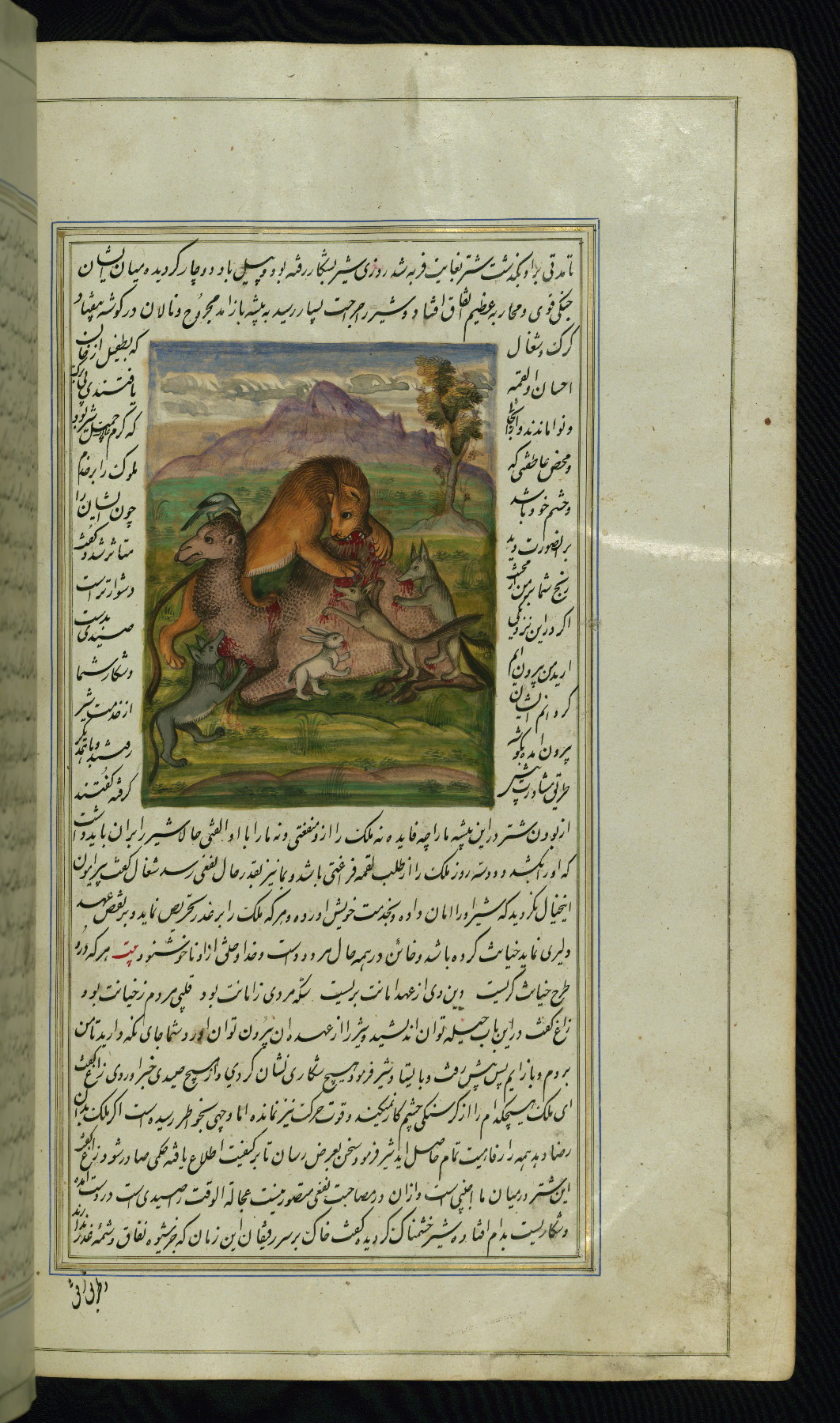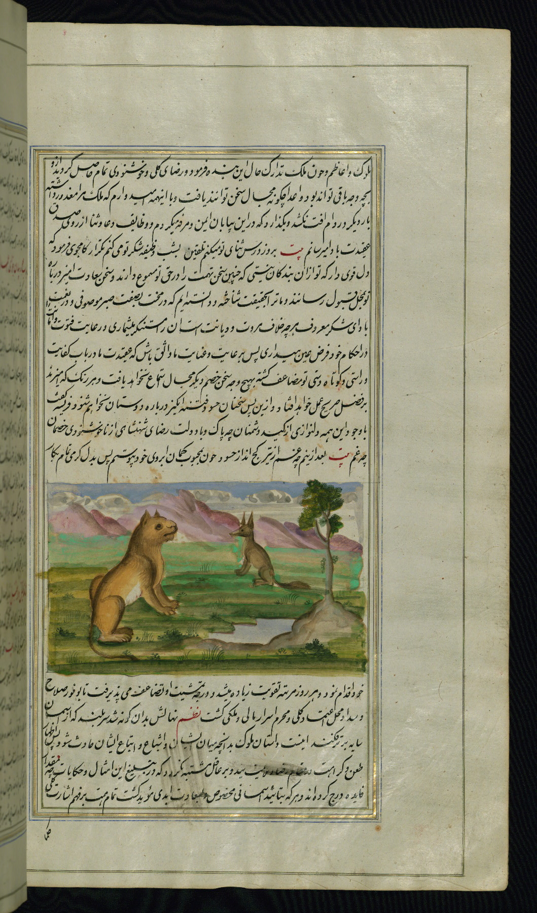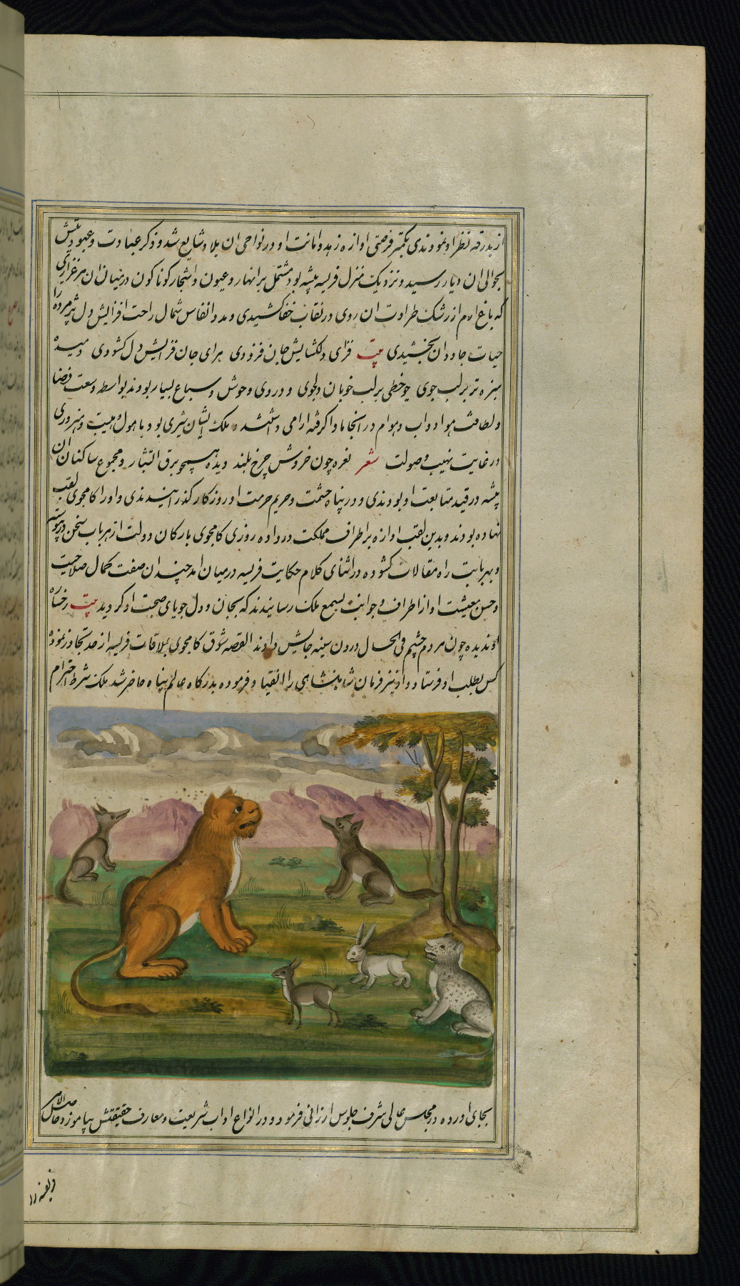 This is an illuminated and illustrated copy of Anvār-i Suhaylī (The lights of Canopus), dating to the thirteenth century AH / nineteenth CE. It is a Persian version of Kalīlah wa-Dimnah (The fables of Bīdpāy). It was completed on 26 Jumādá I 1264 AH / 1847 CE by Mīrzā Raḥīm. The text is written in nastaʿliq script in black and red ink, revealing the influence of shikastah script. There are 123 paintings illustrating the text. The Qajar binding is original to the manuscript.