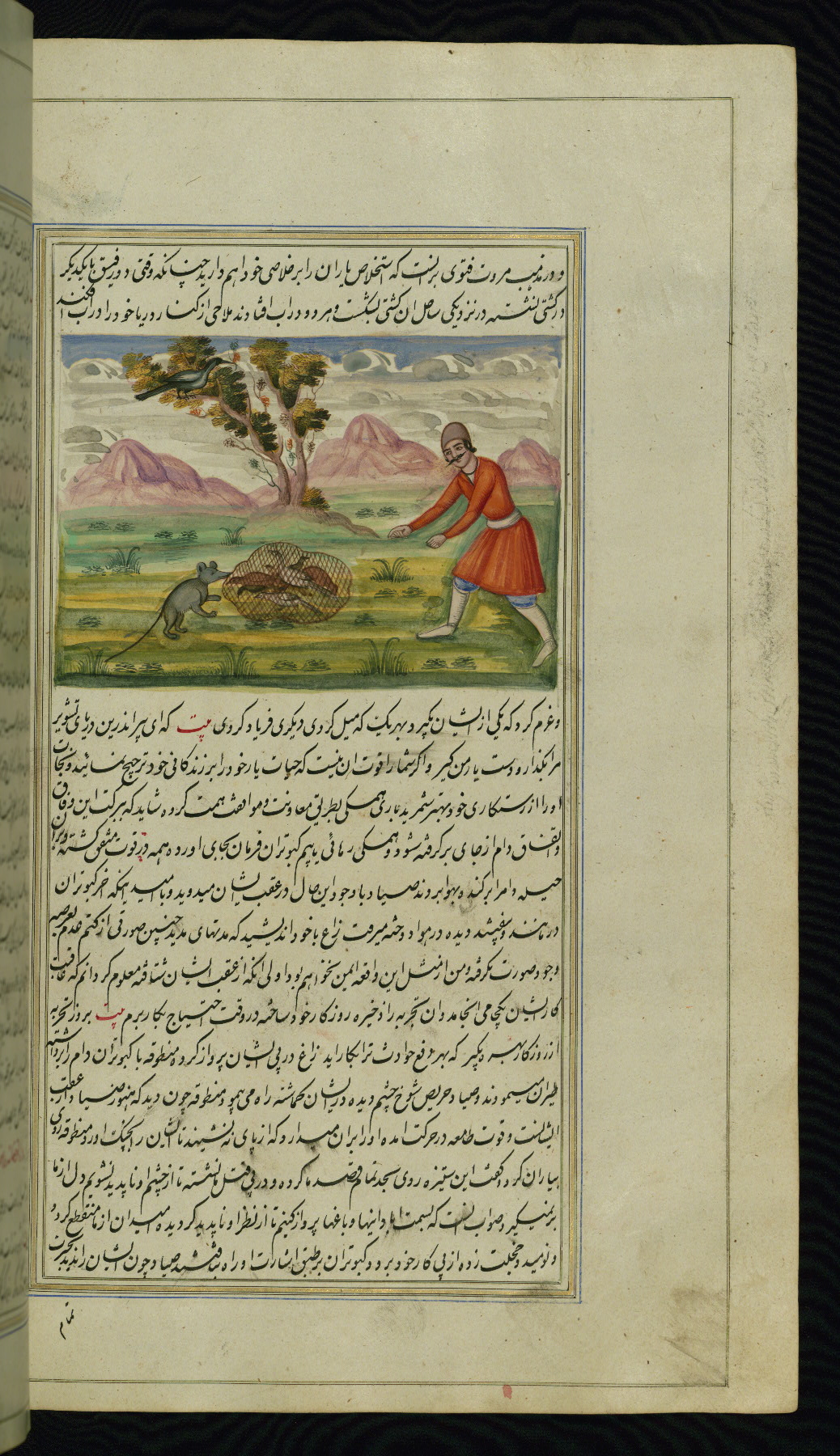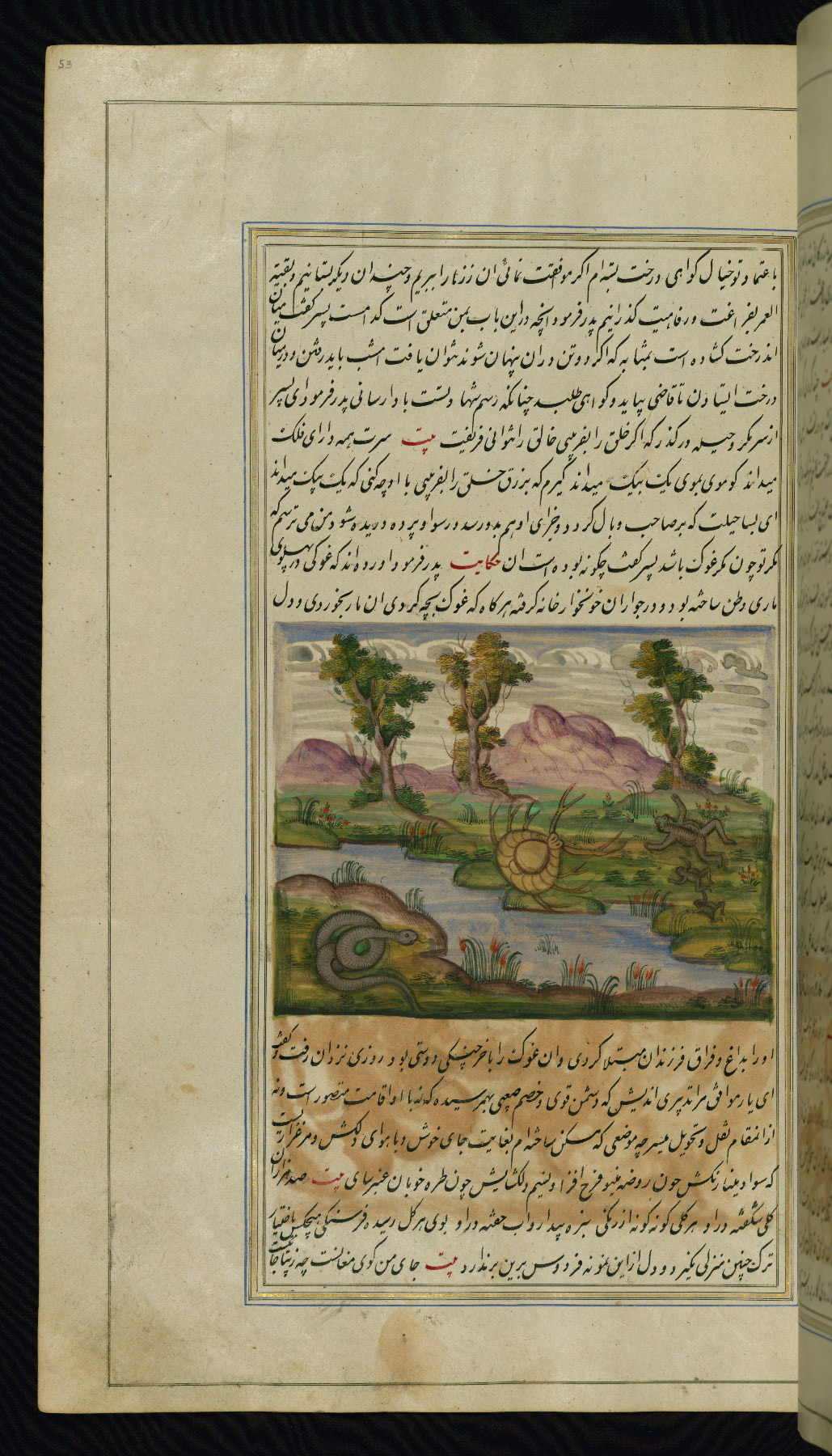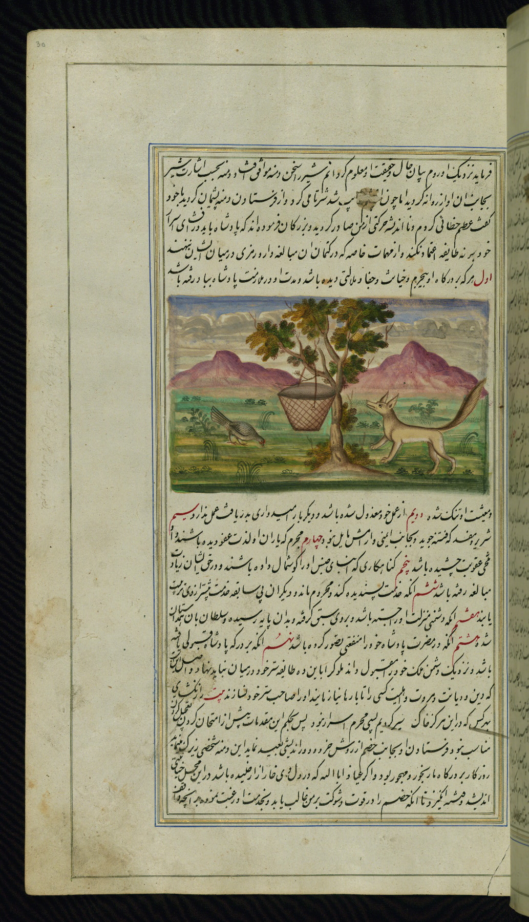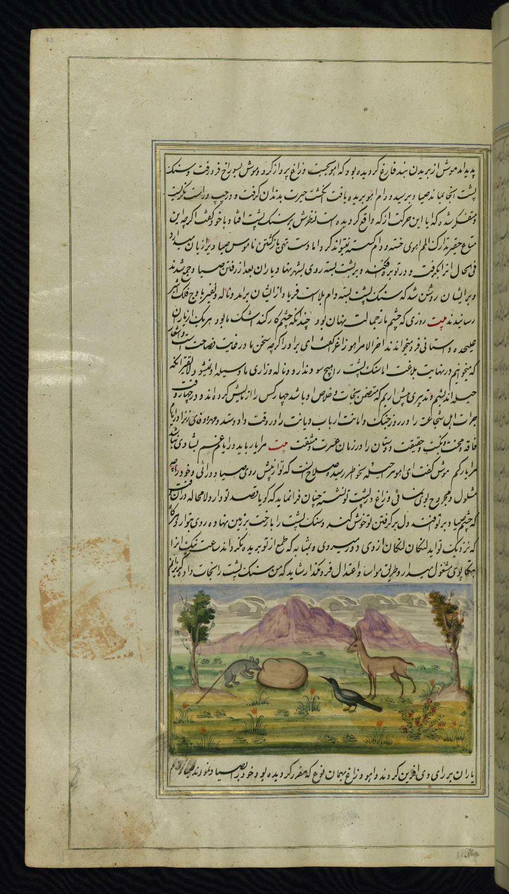 This is an illuminated and illustrated copy of Anvār-i Suhaylī (The lights of Canopus), dating to the thirteenth century AH / nineteenth CE. It is a Persian version of Kalīlah wa-Dimnah (The fables of Bīdpāy). It was completed on 26 Jumādá I 1264 AH / 1847 CE by Mīrzā Raḥīm. The text is written in nastaʿliq script in black and red ink, revealing the influence of shikastah script. There are 123 paintings illustrating the text. The Qajar binding is original to the manuscript.