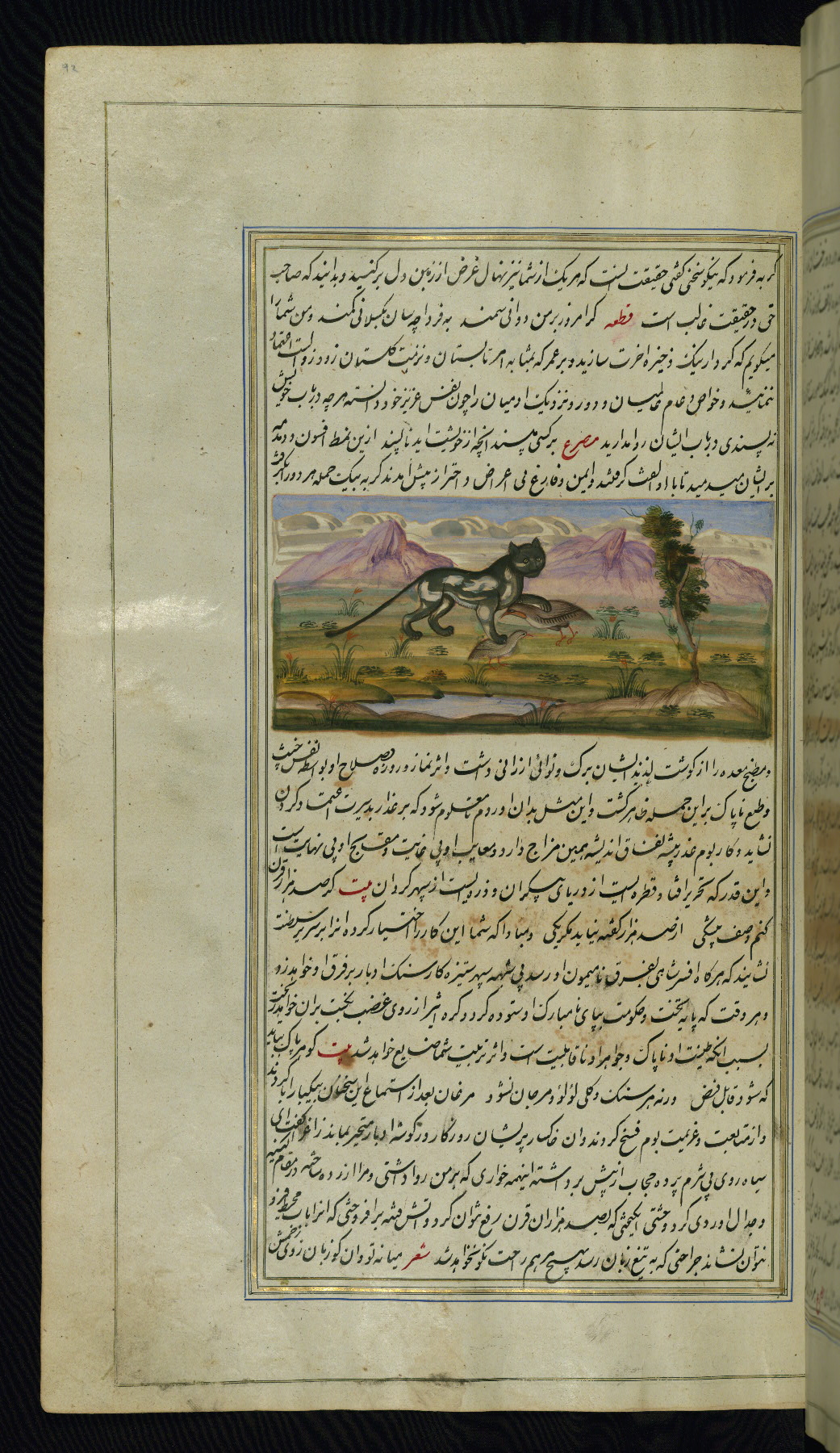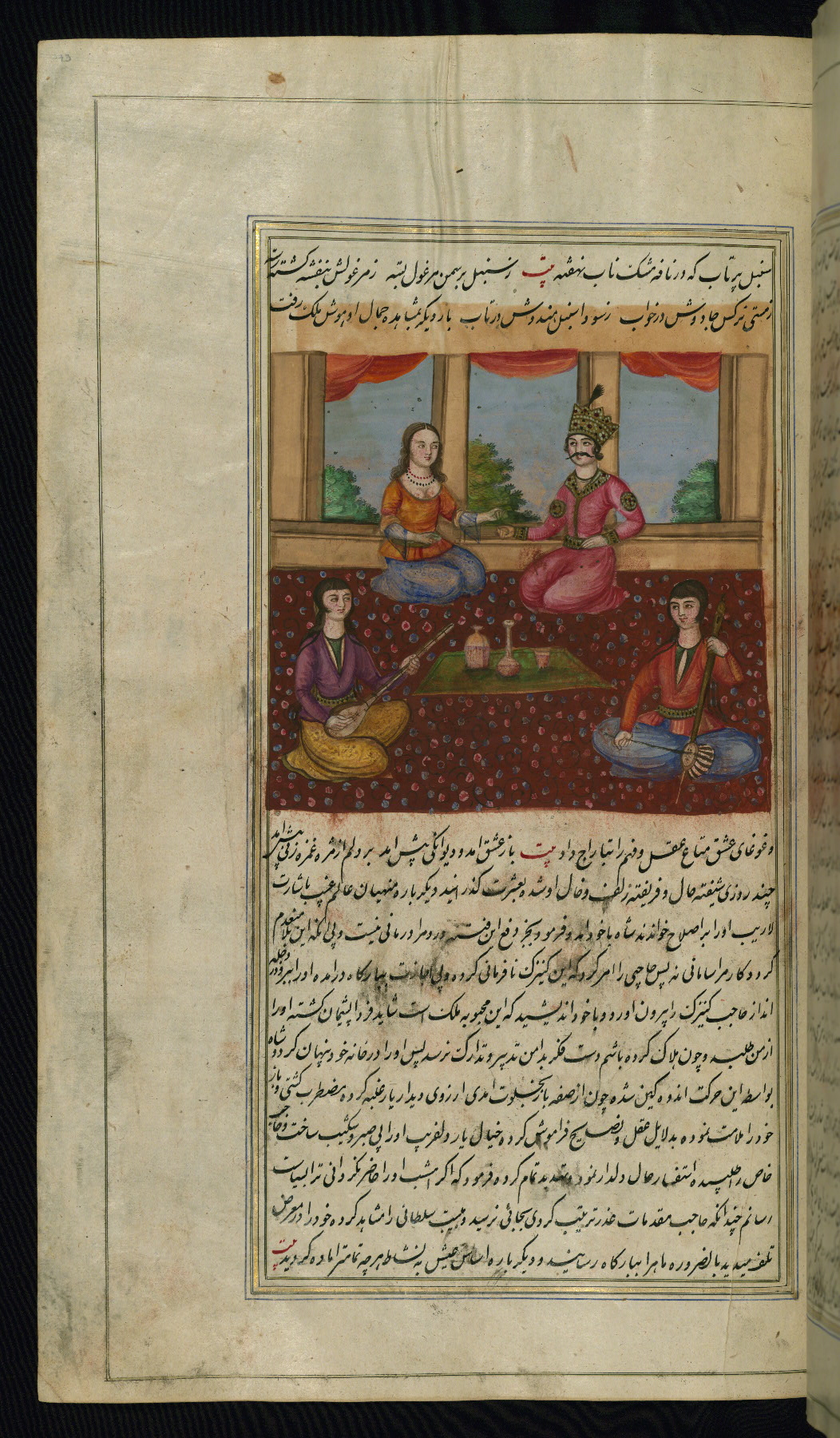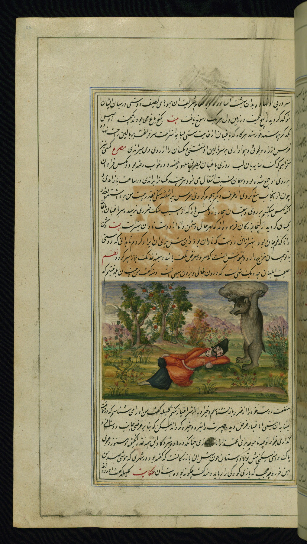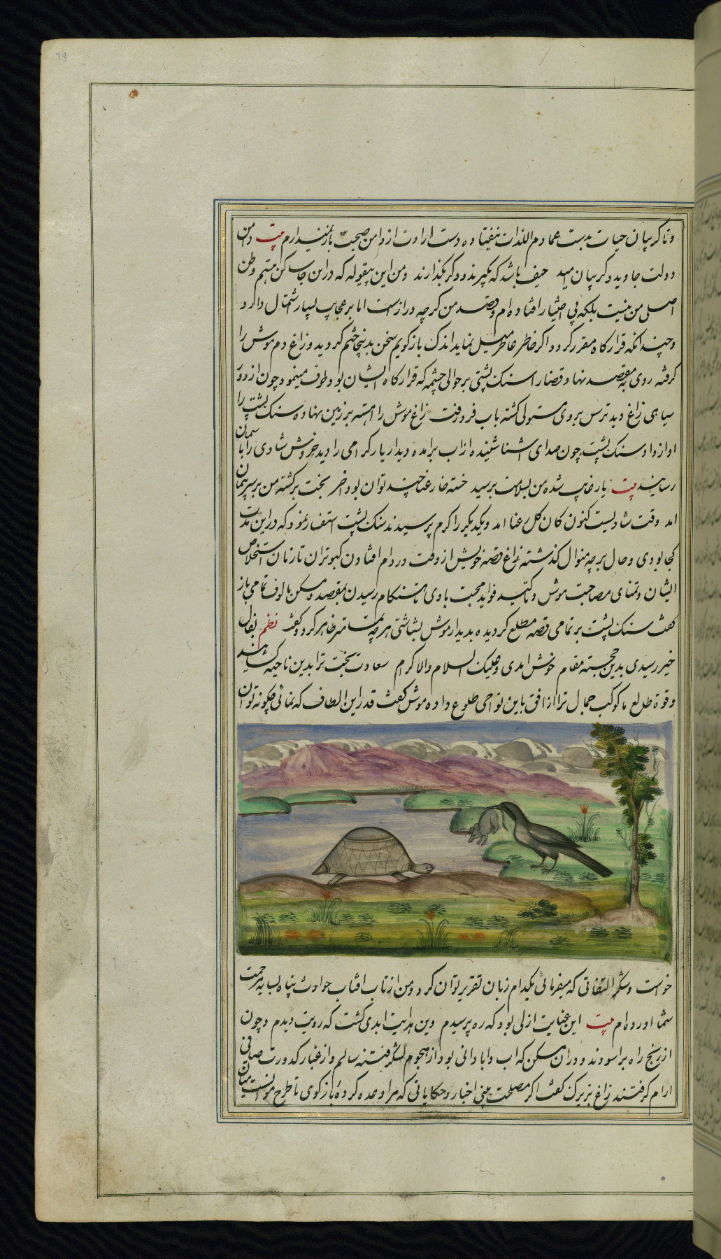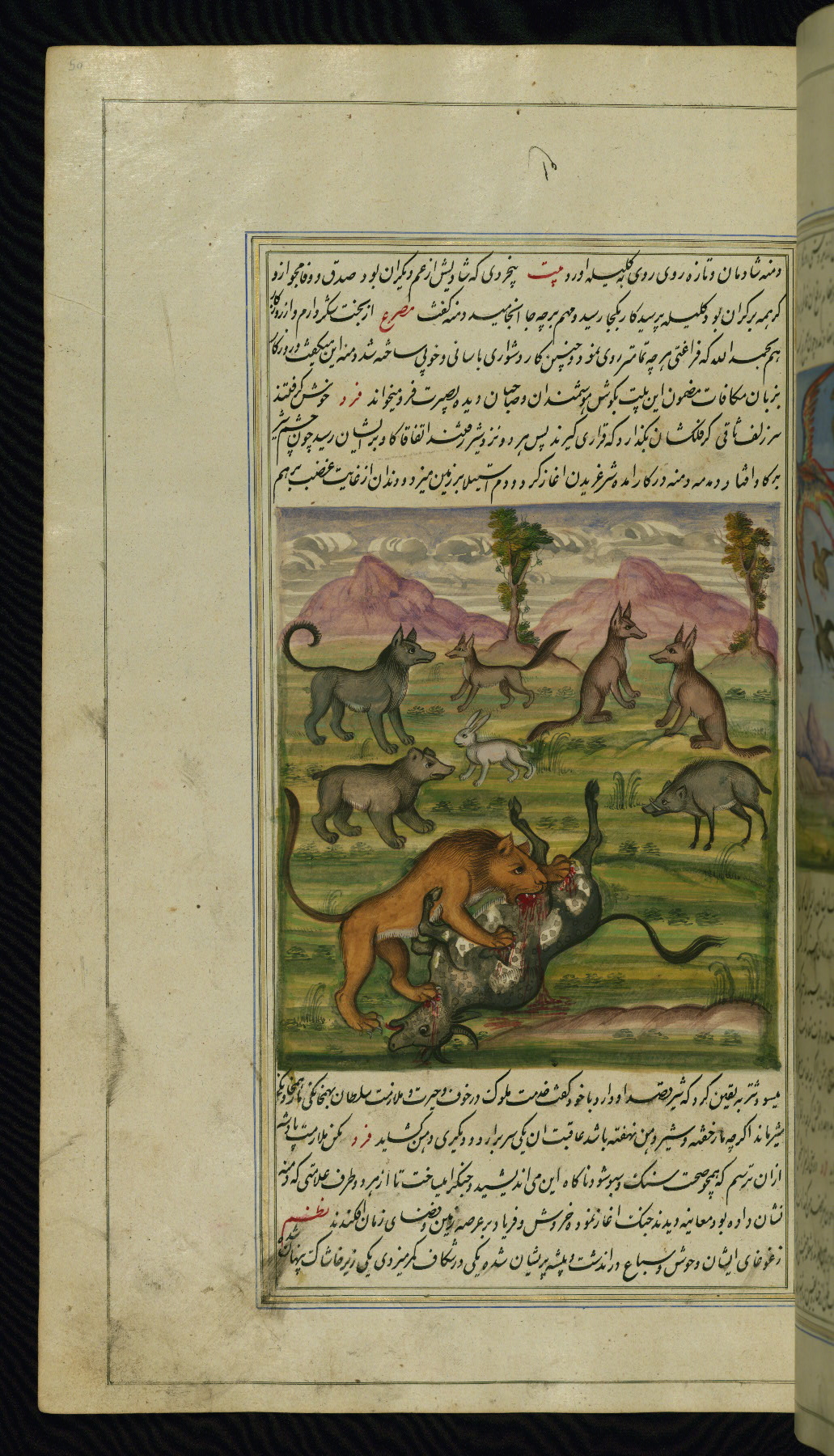 This is an illuminated and illustrated copy of Anvār-i Suhaylī (The lights of Canopus), dating to the thirteenth century AH / nineteenth CE. It is a Persian version of Kalīlah wa-Dimnah (The fables of Bīdpāy). It was completed on 26 Jumādá I 1264 AH / 1847 CE by Mīrzā Raḥīm. The text is written in nastaʿliq script in black and red ink, revealing the influence of shikastah script. There are 123 paintings illustrating the text. The Qajar binding is original to the manuscript.