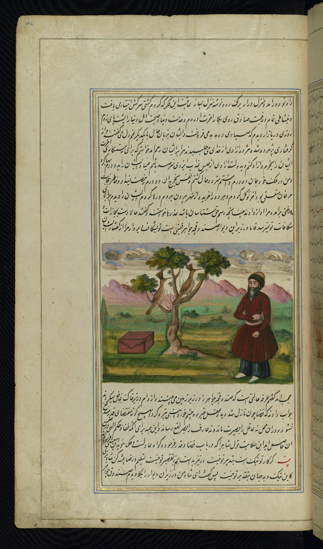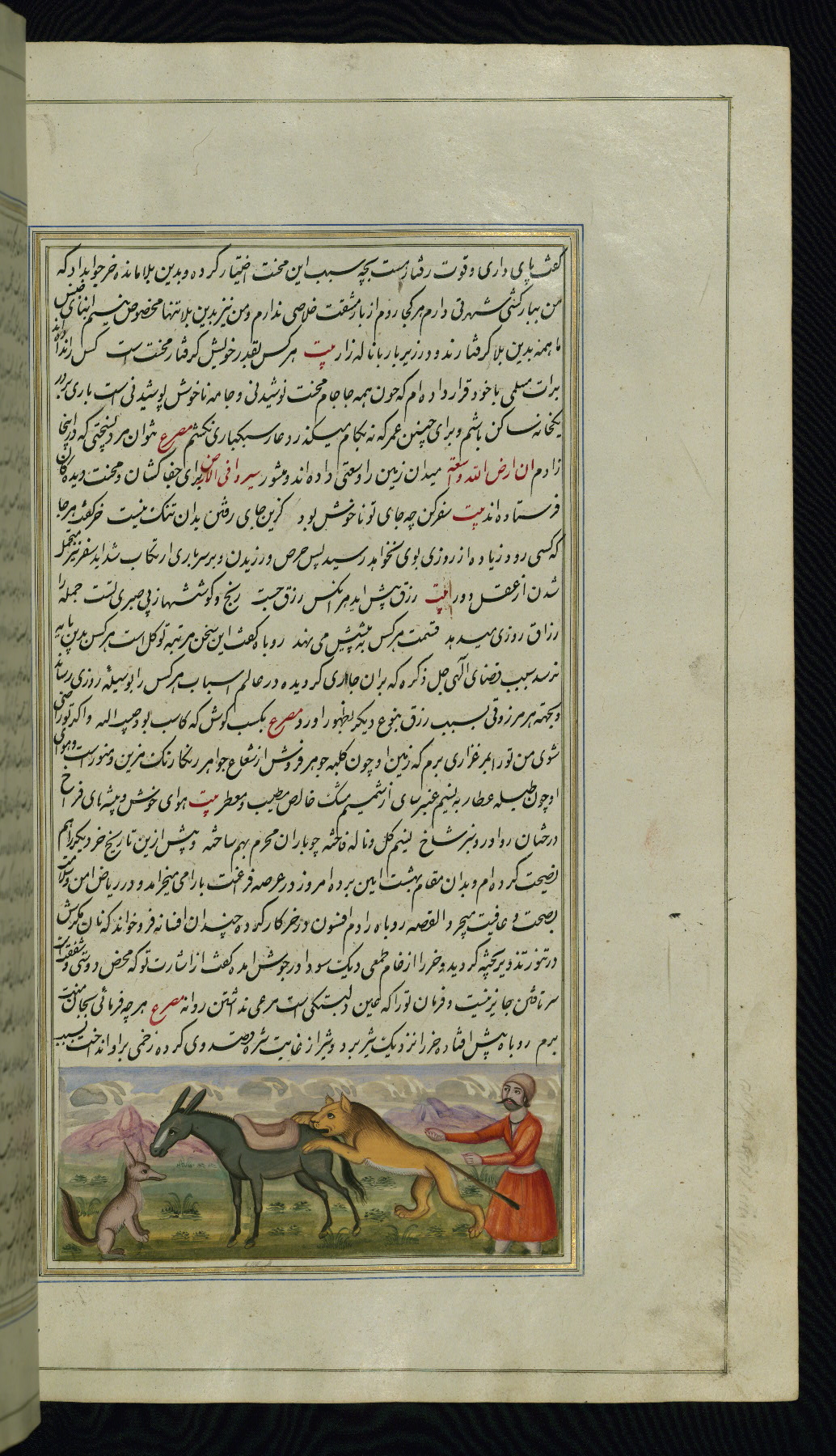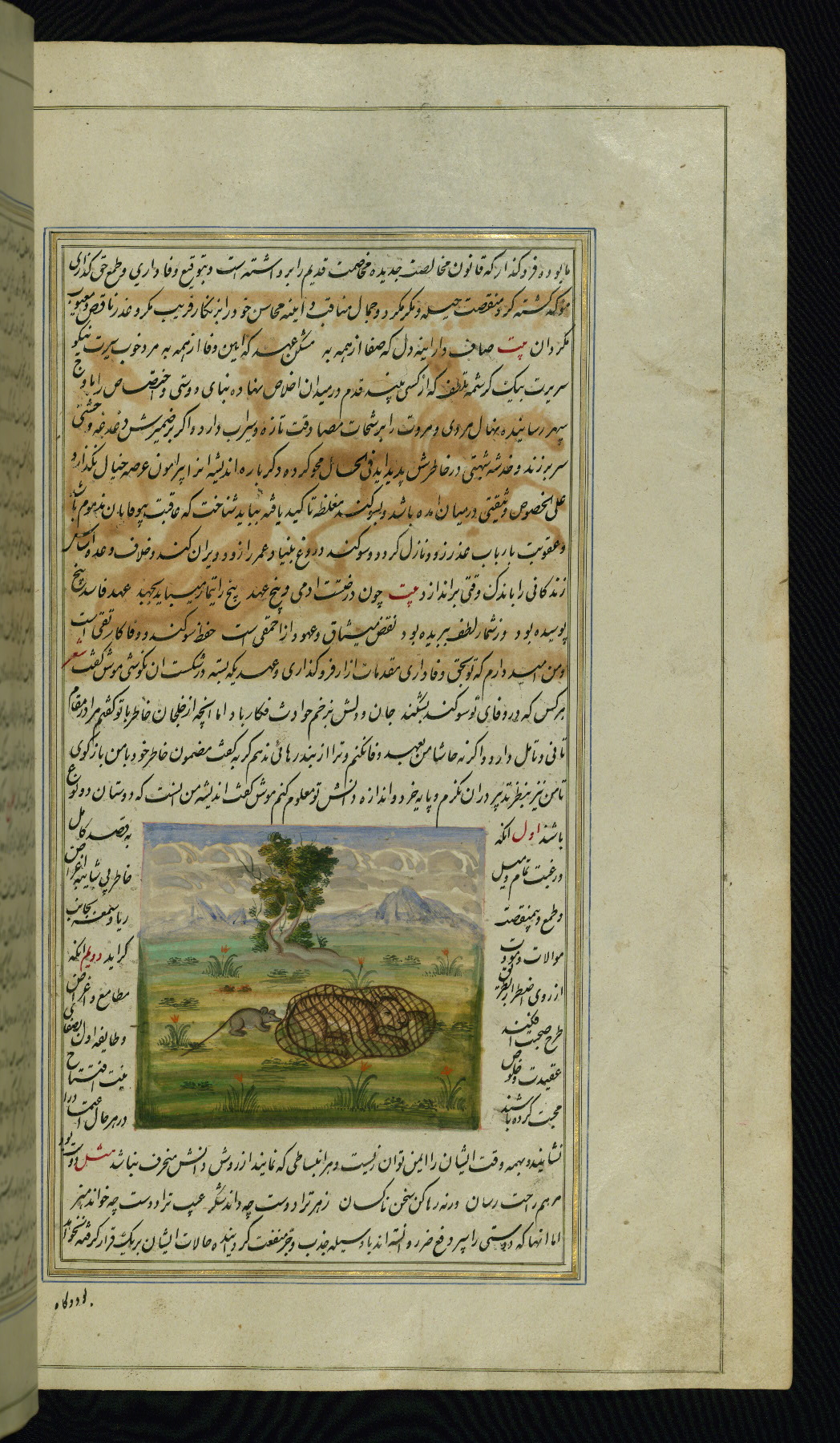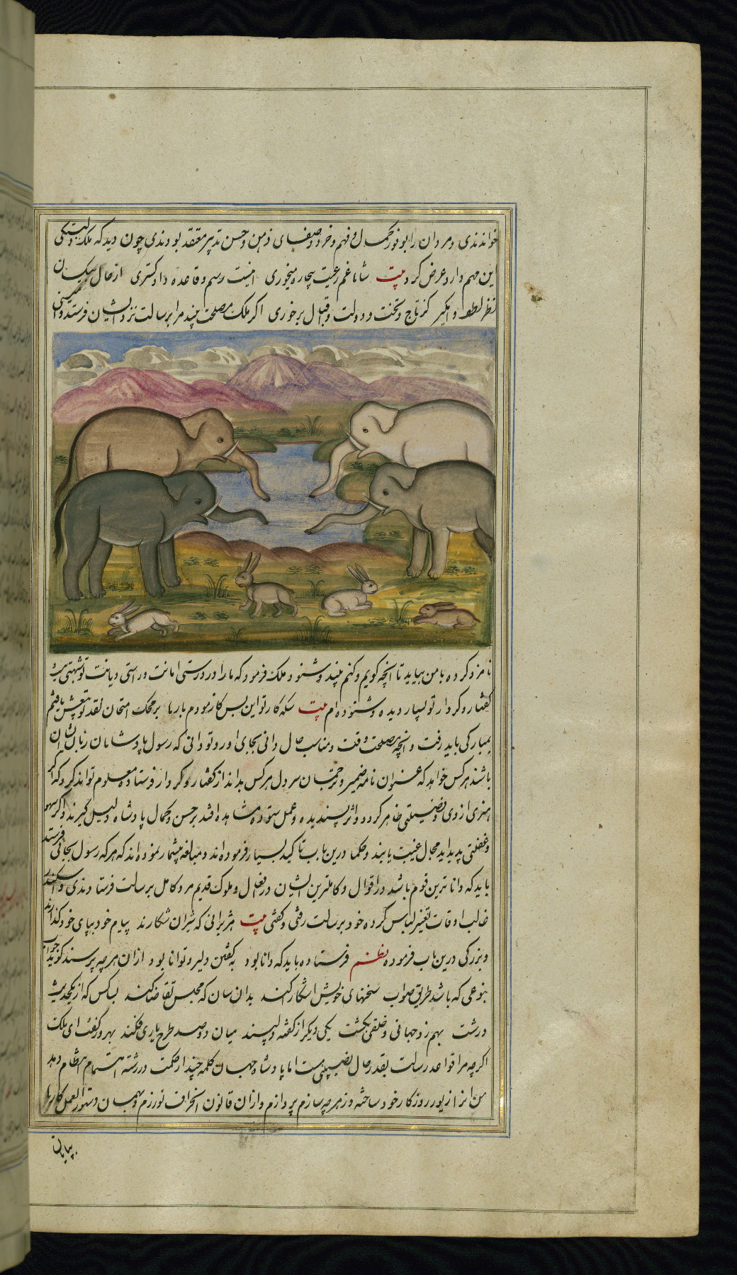 This is an illuminated and illustrated copy of Anvār-i Suhaylī (The lights of Canopus), dating to the thirteenth century AH / nineteenth CE. It is a Persian version of Kalīlah wa-Dimnah (The fables of Bīdpāy). It was completed on 26 Jumādá I 1264 AH / 1847 CE by Mīrzā Raḥīm. The text is written in nastaʿliq script in black and red ink, revealing the influence of shikastah script. There are 123 paintings illustrating the text. The Qajar binding is original to the manuscript.