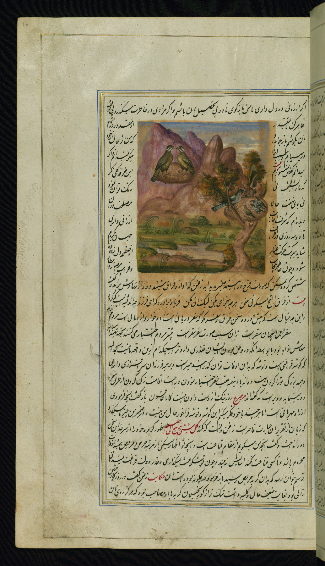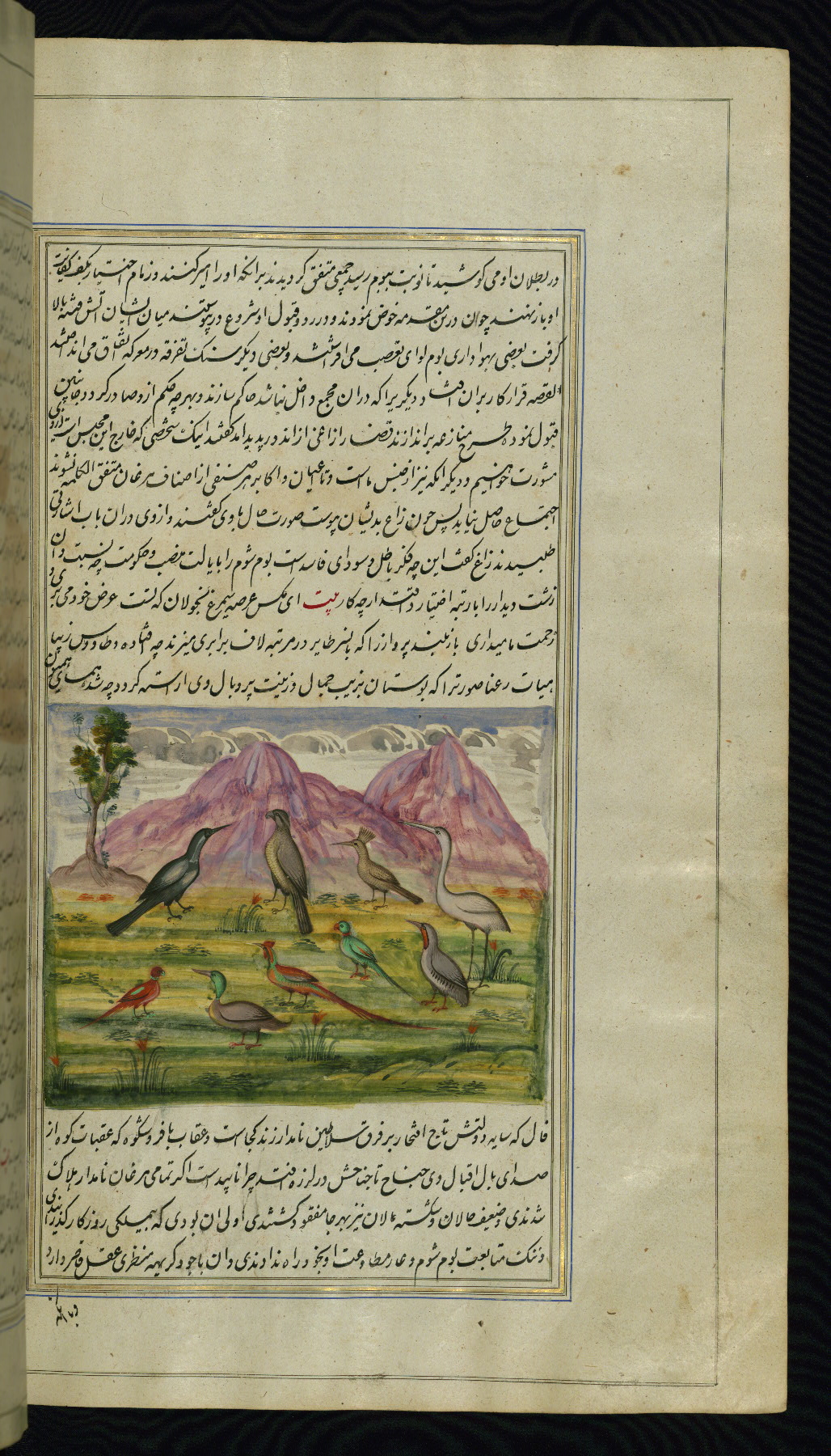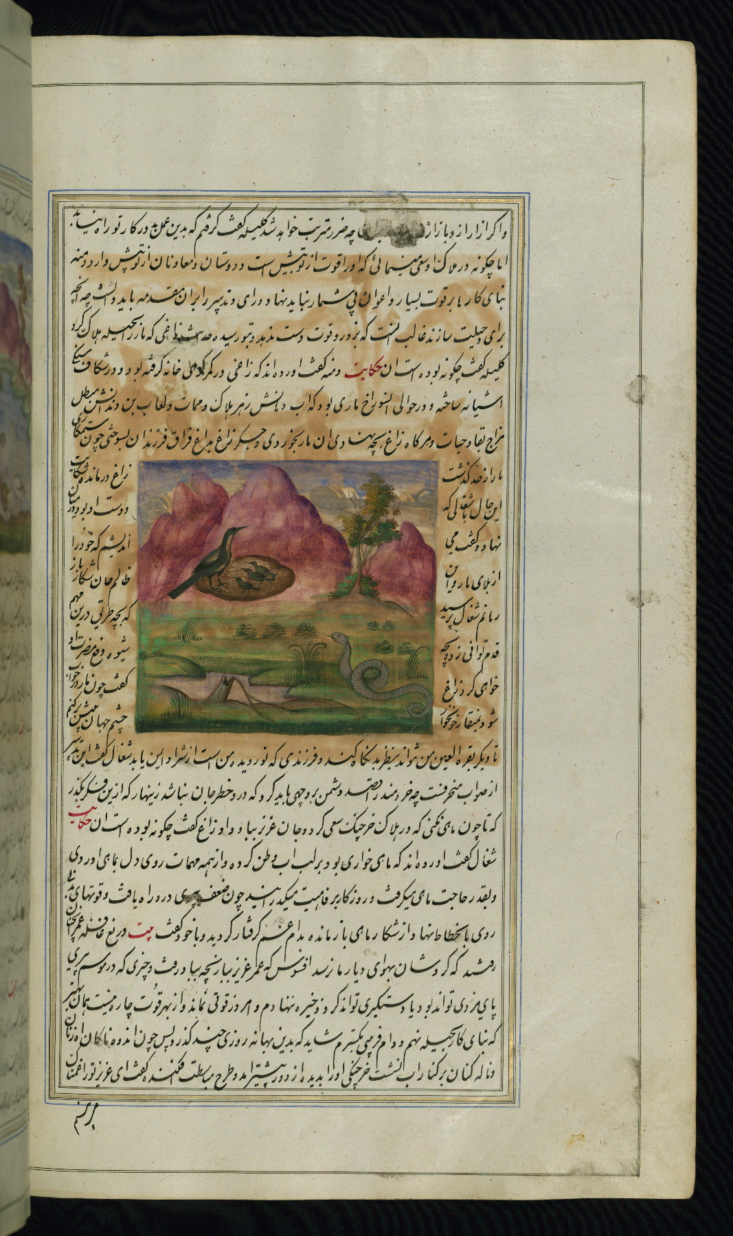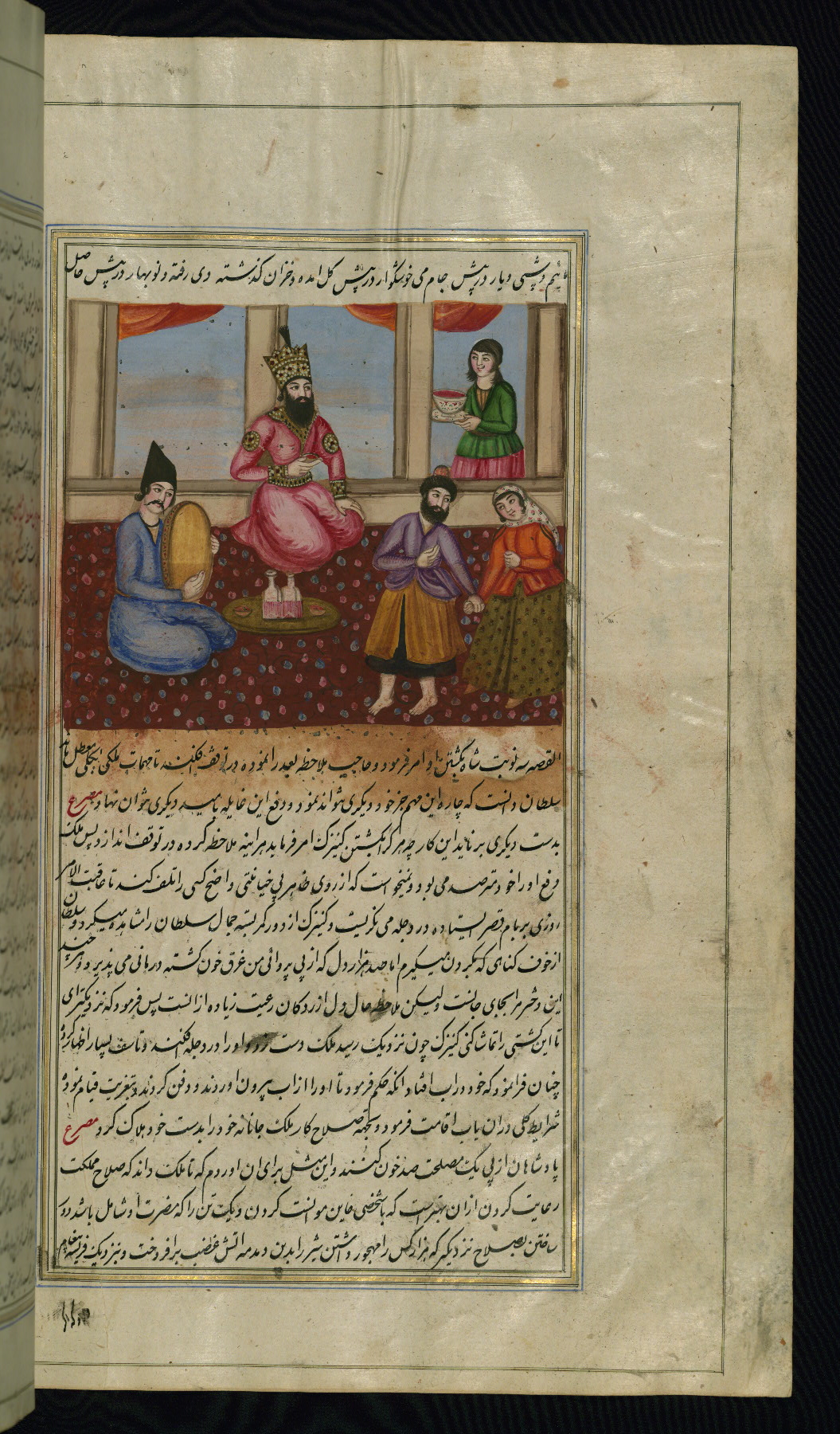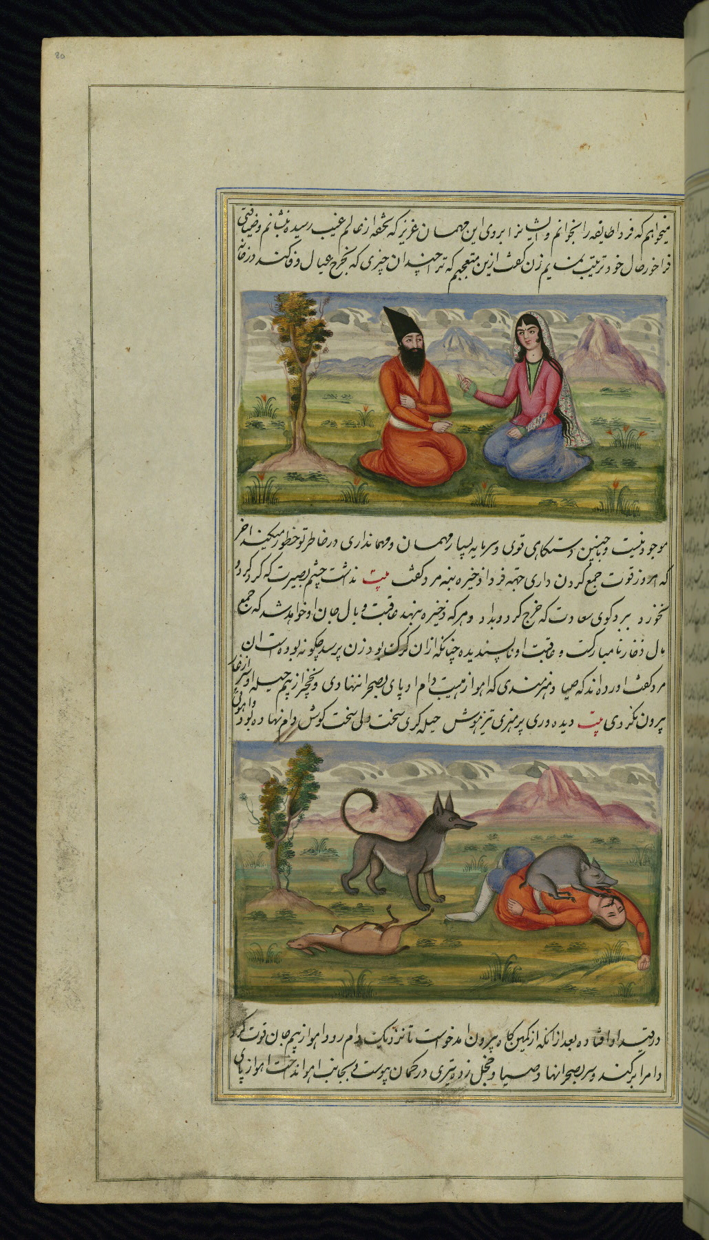 This is an illuminated and illustrated copy of Anvār-i Suhaylī (The lights of Canopus), dating to the thirteenth century AH / nineteenth CE. It is a Persian version of Kalīlah wa-Dimnah (The fables of Bīdpāy). It was completed on 26 Jumādá I 1264 AH / 1847 CE by Mīrzā Raḥīm. The text is written in nastaʿliq script in black and red ink, revealing the influence of shikastah script. There are 123 paintings illustrating the text. The Qajar binding is original to the manuscript.