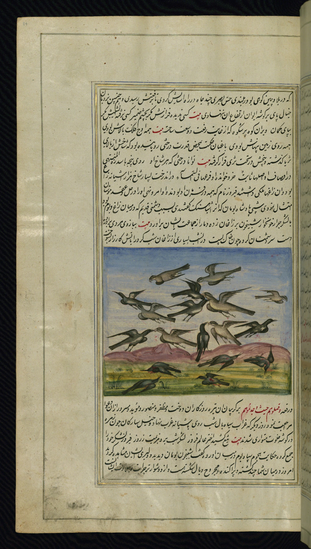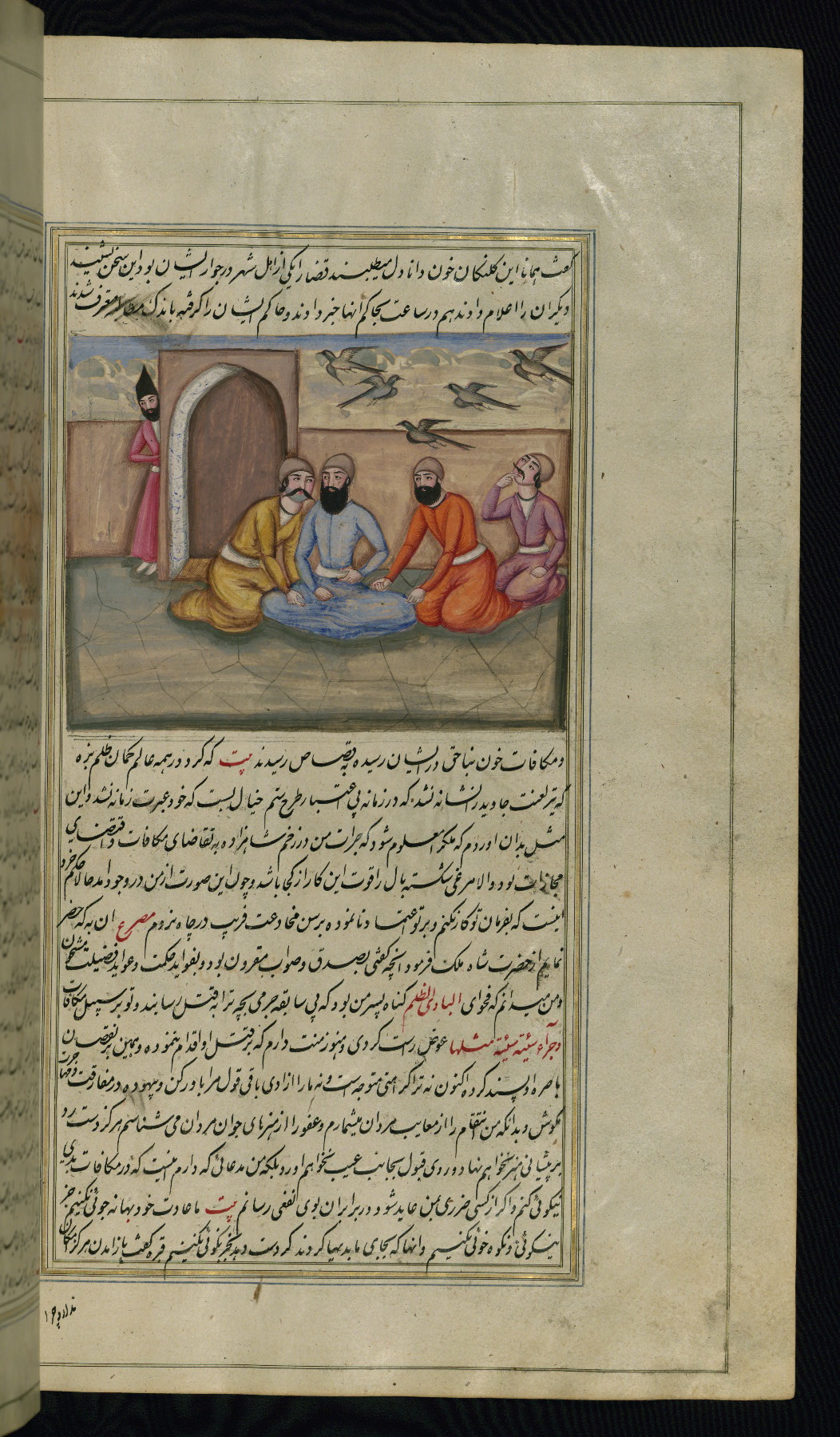 - Label: This illustration depicts a group of thieves plotting against a dervish from Raqqah called Dānādil on his way to Mecca while a flock of cranes flies over.