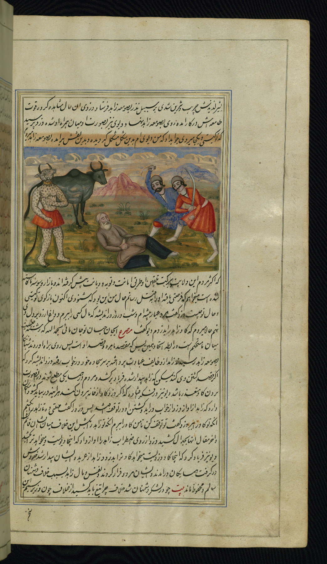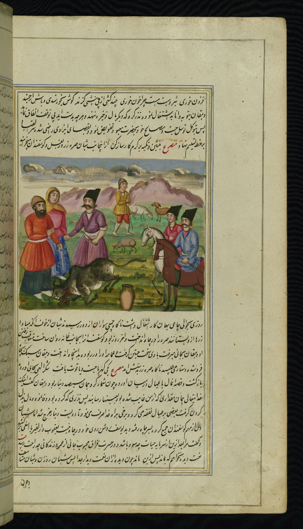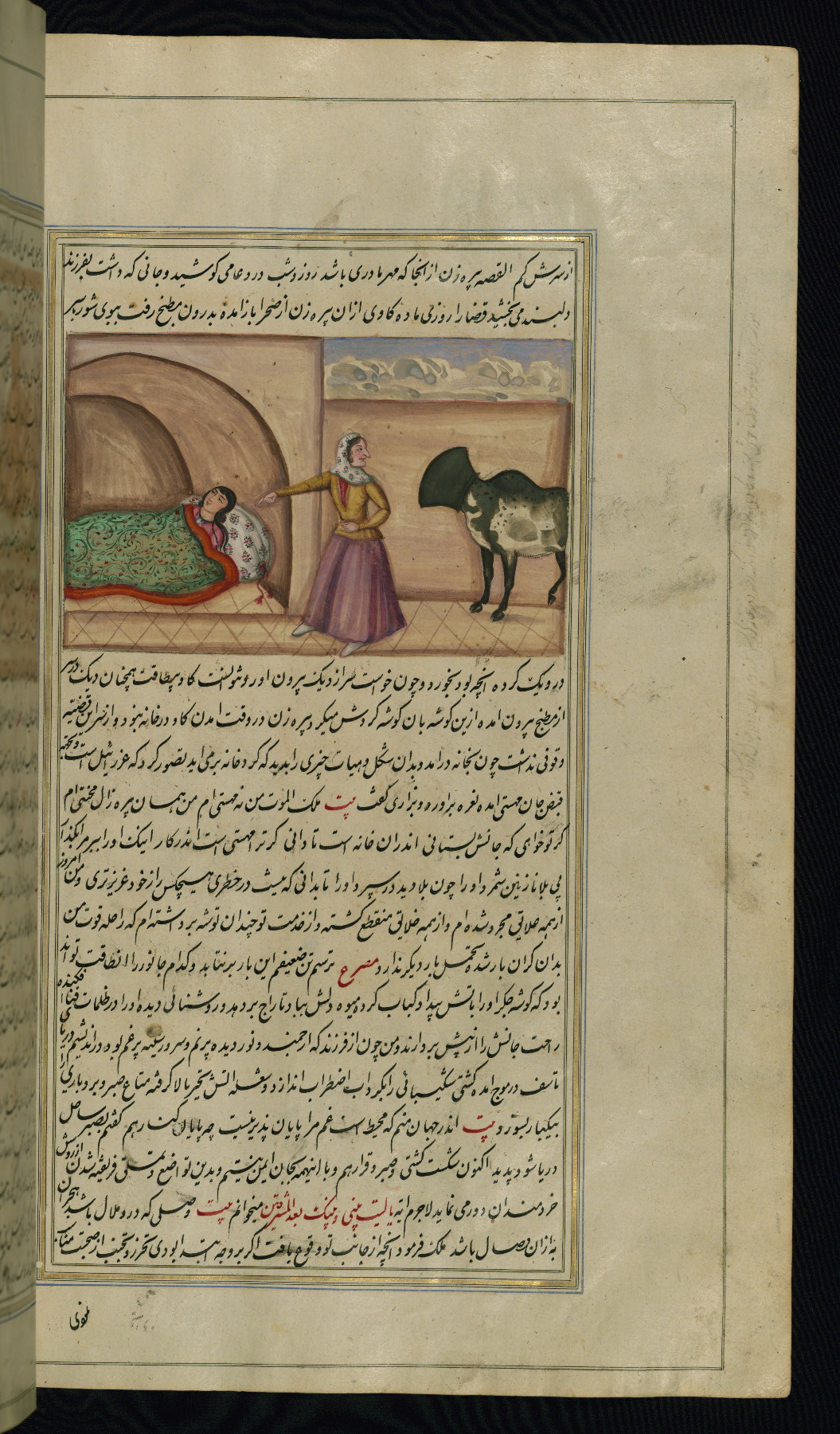 - Label: This illustration depicts an old woman speaking to her cow with a pot on its head. She mistook the cow for an angel of death come for her and instead instructs it to take her daughter Muhastī.