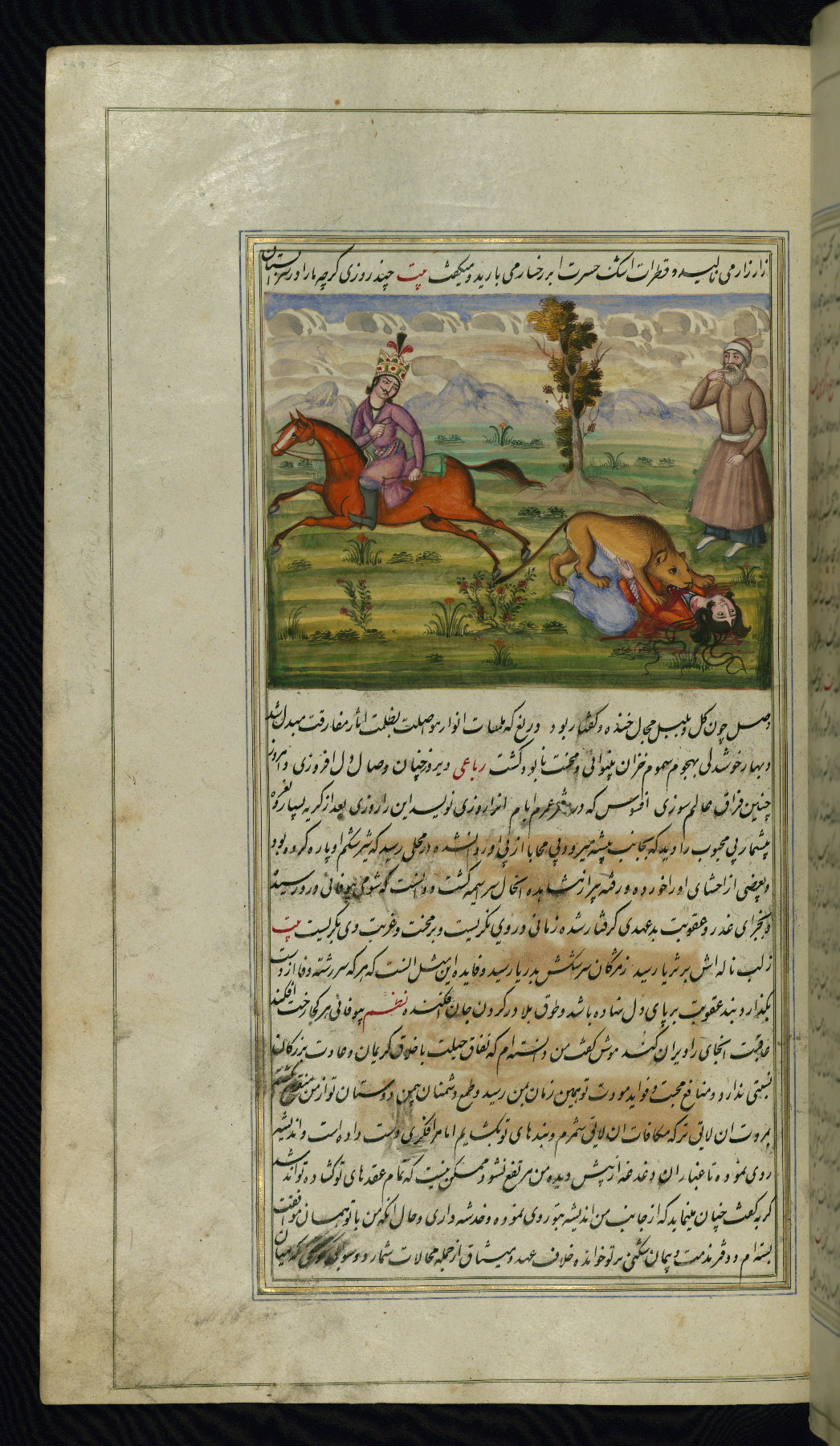 - Title: A lion attacks the unfaithful wife of an old man while her lover on horseback runs away