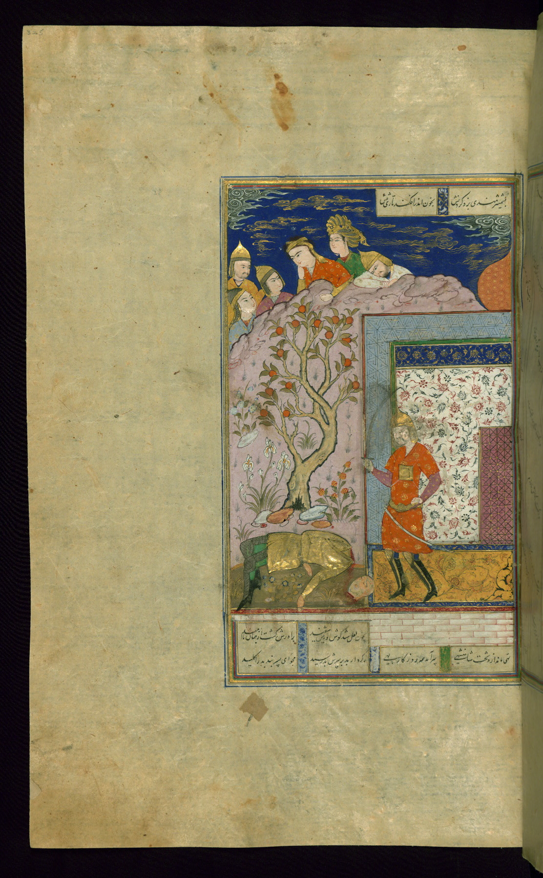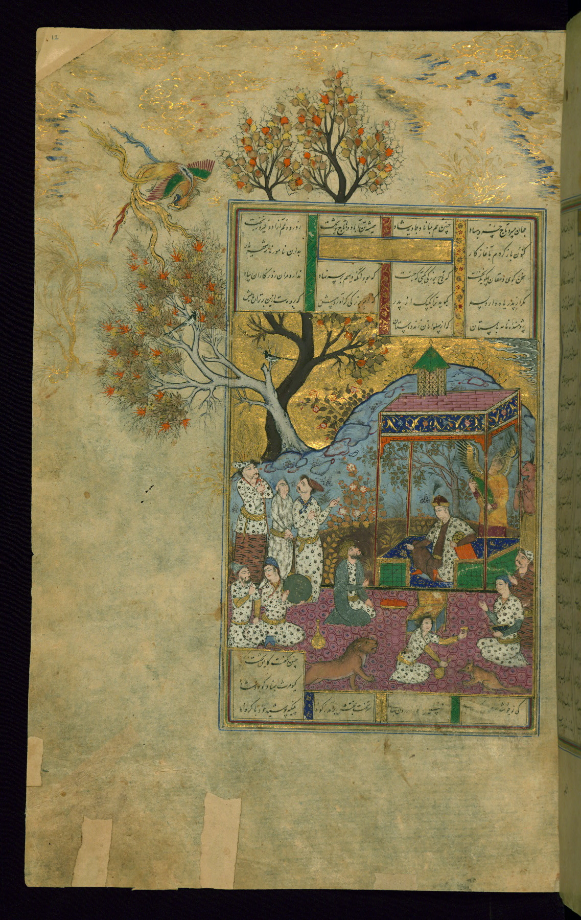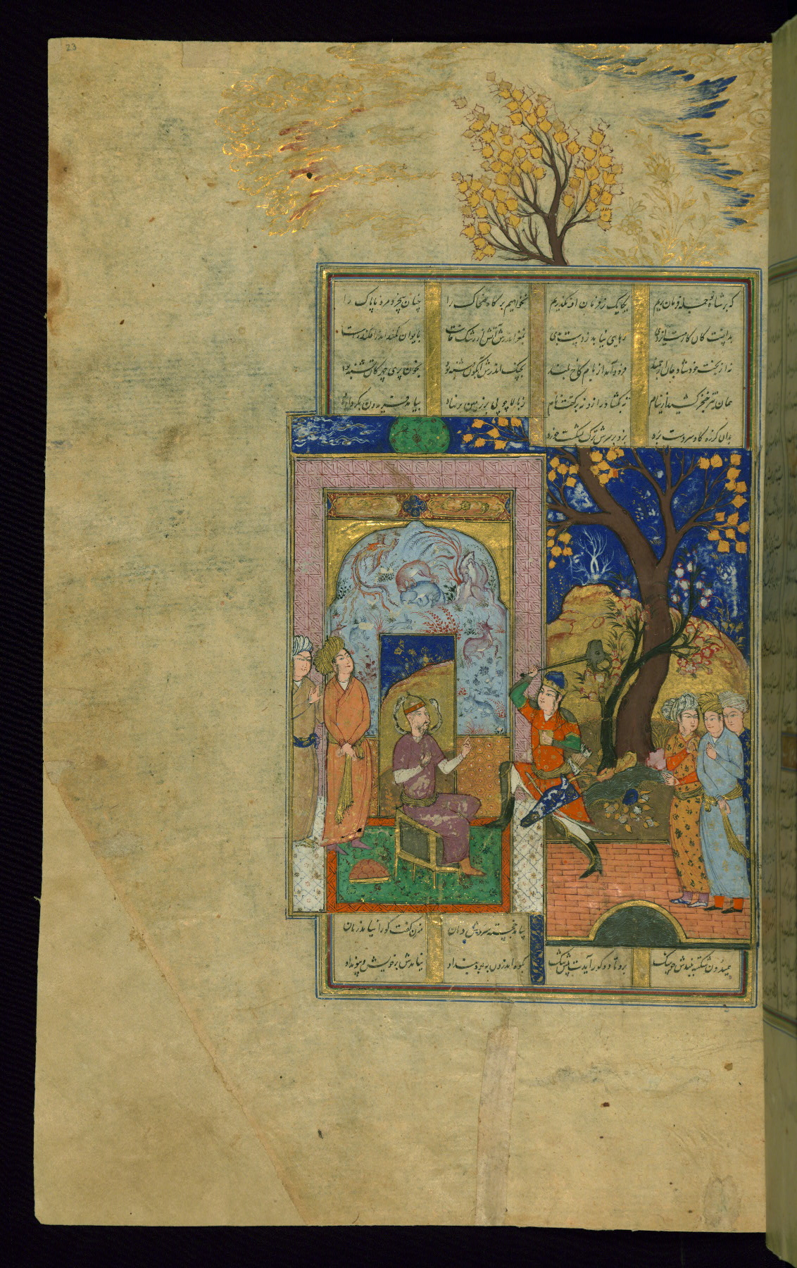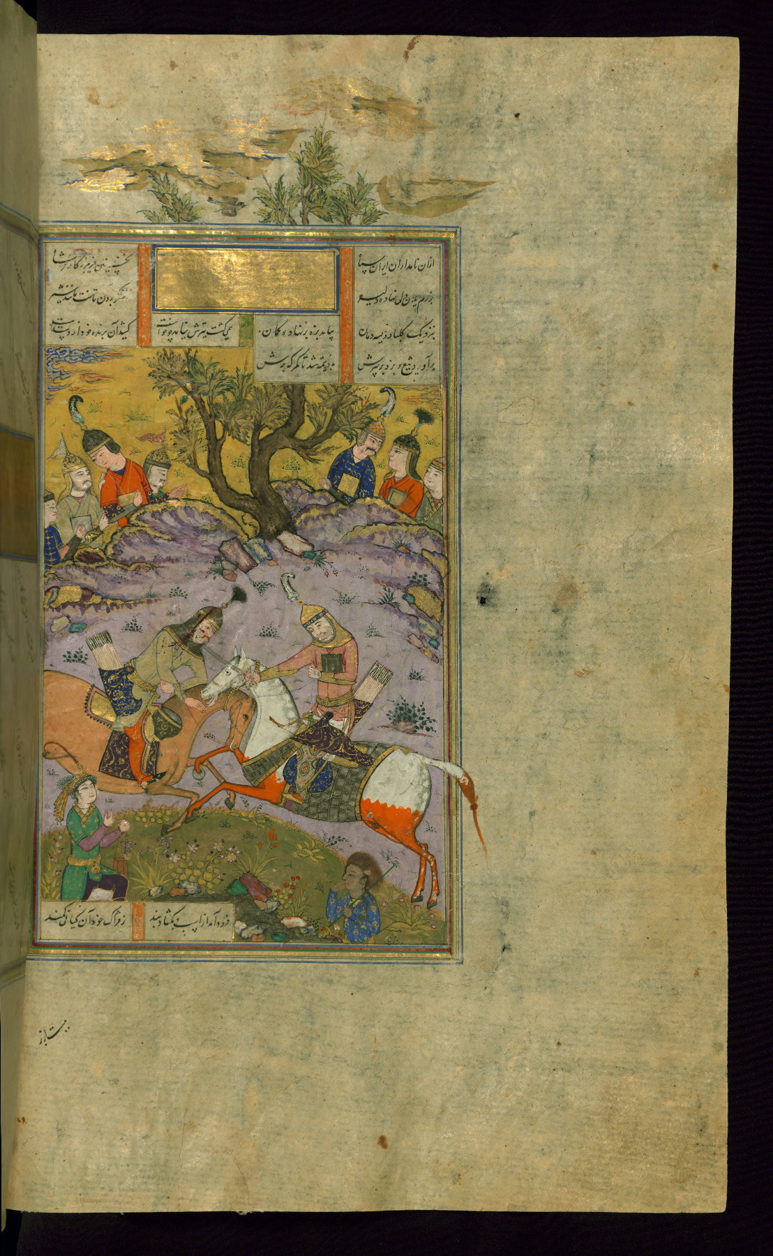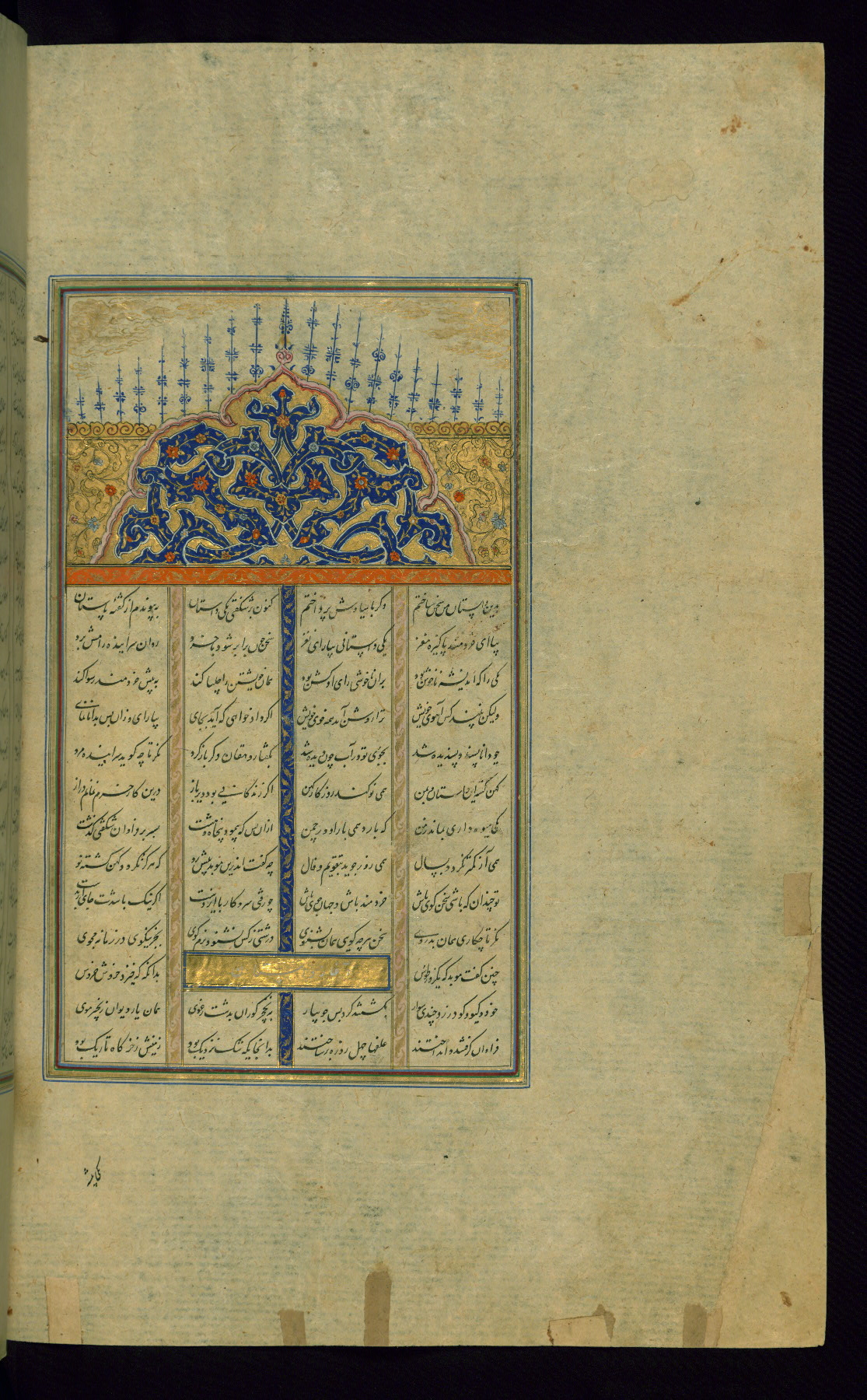 - Label: This is the right side of a double-page illuminated frontispiece that precedes the beginning of the main text of the Shāhnāmah (Book of kings).