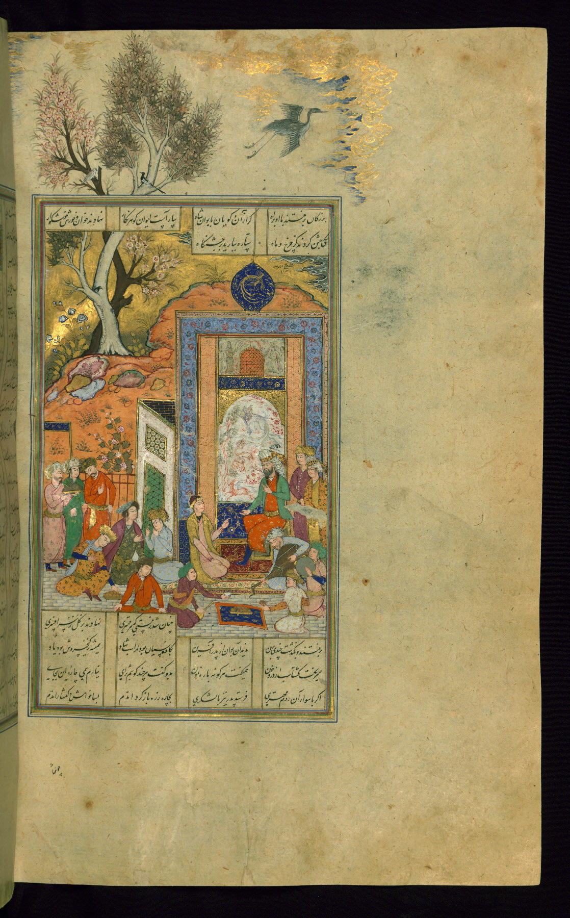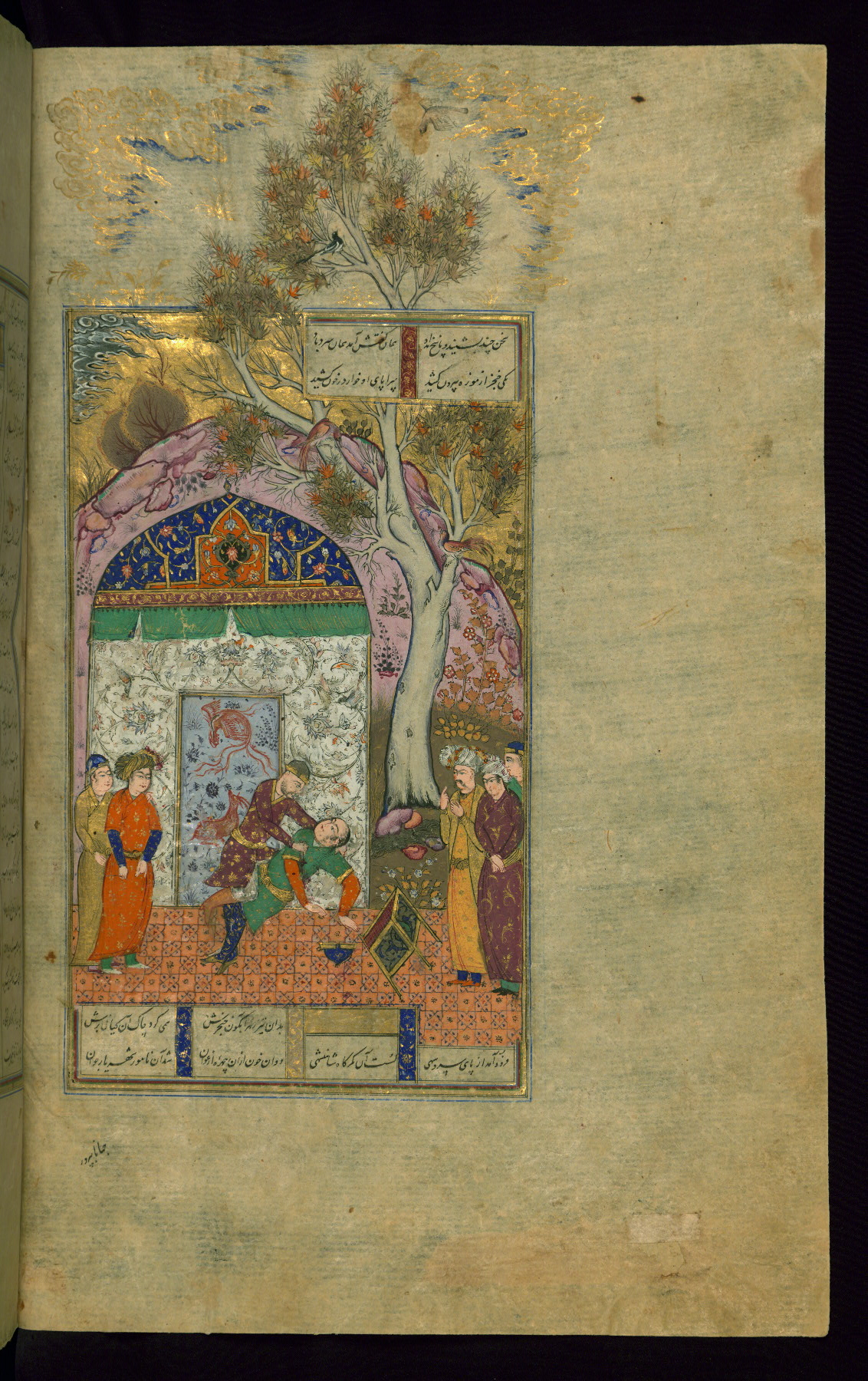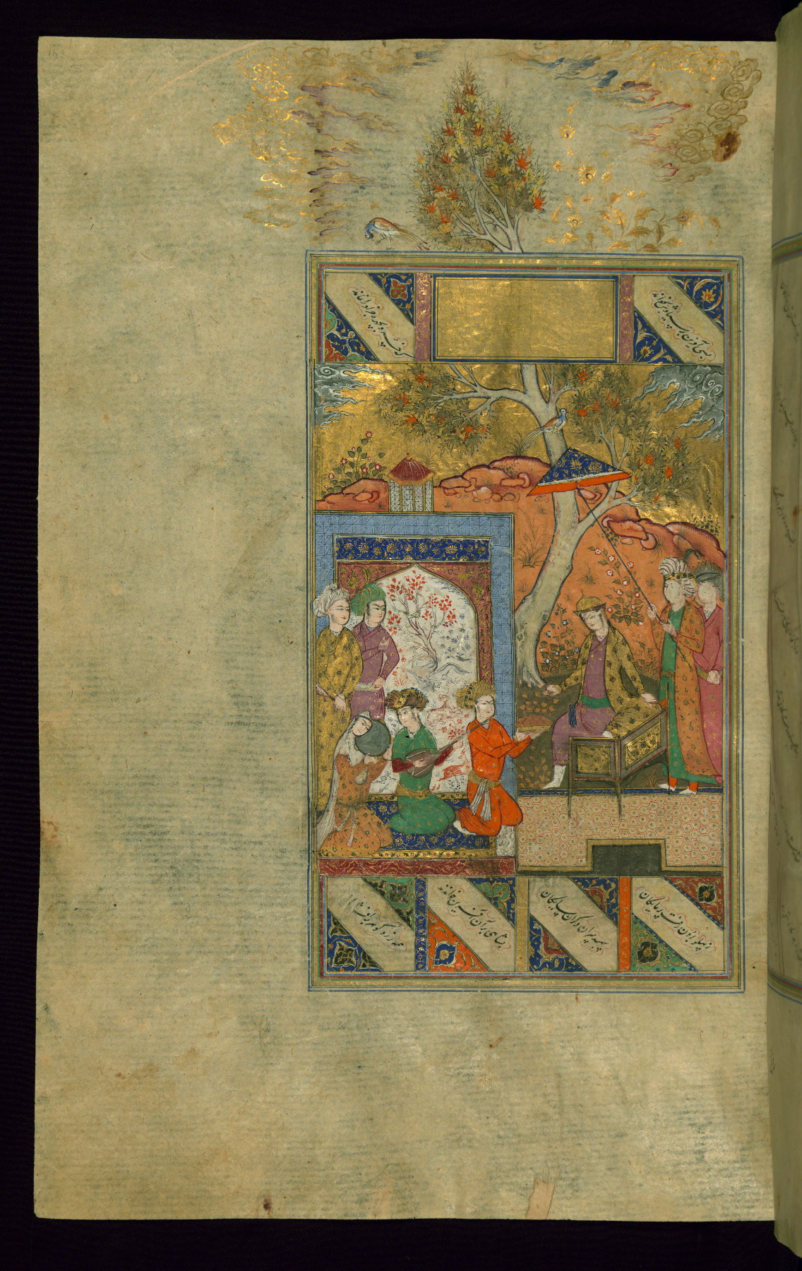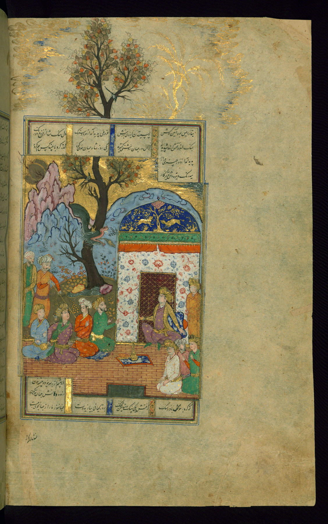 - Label: This is the right side of a double-page illuminated frontispiece that precedes the beginning of the main text of the Shāhnāmah (Book of kings).