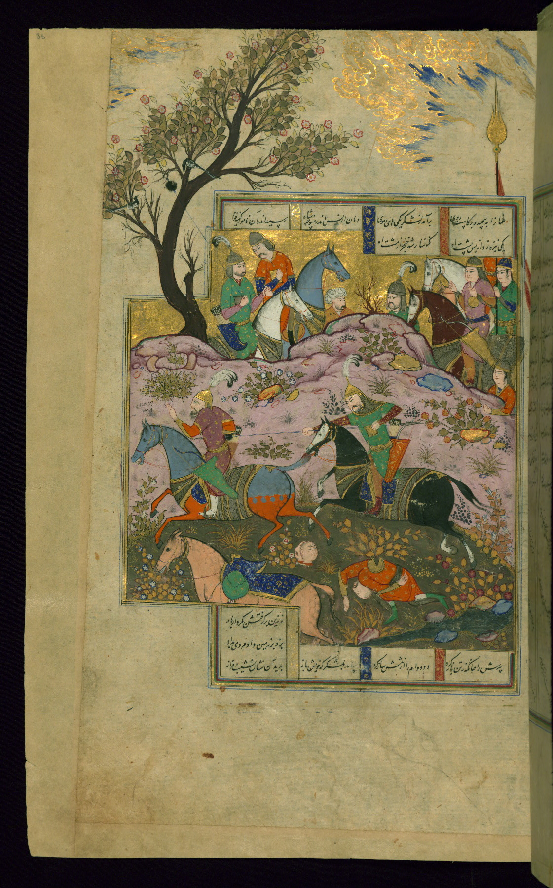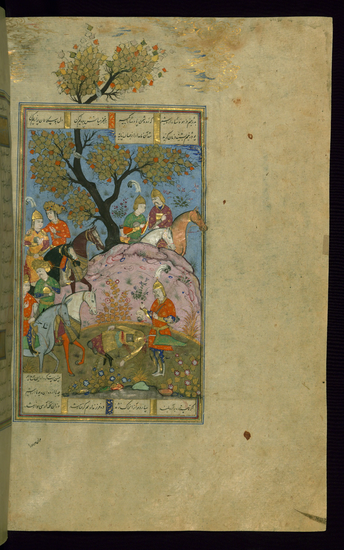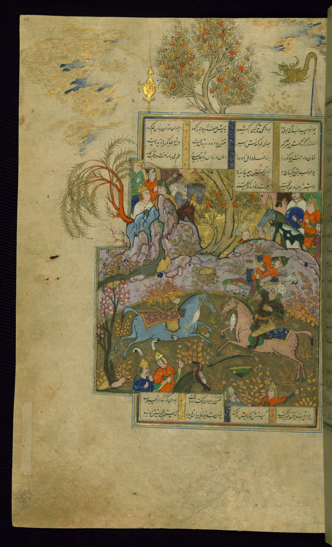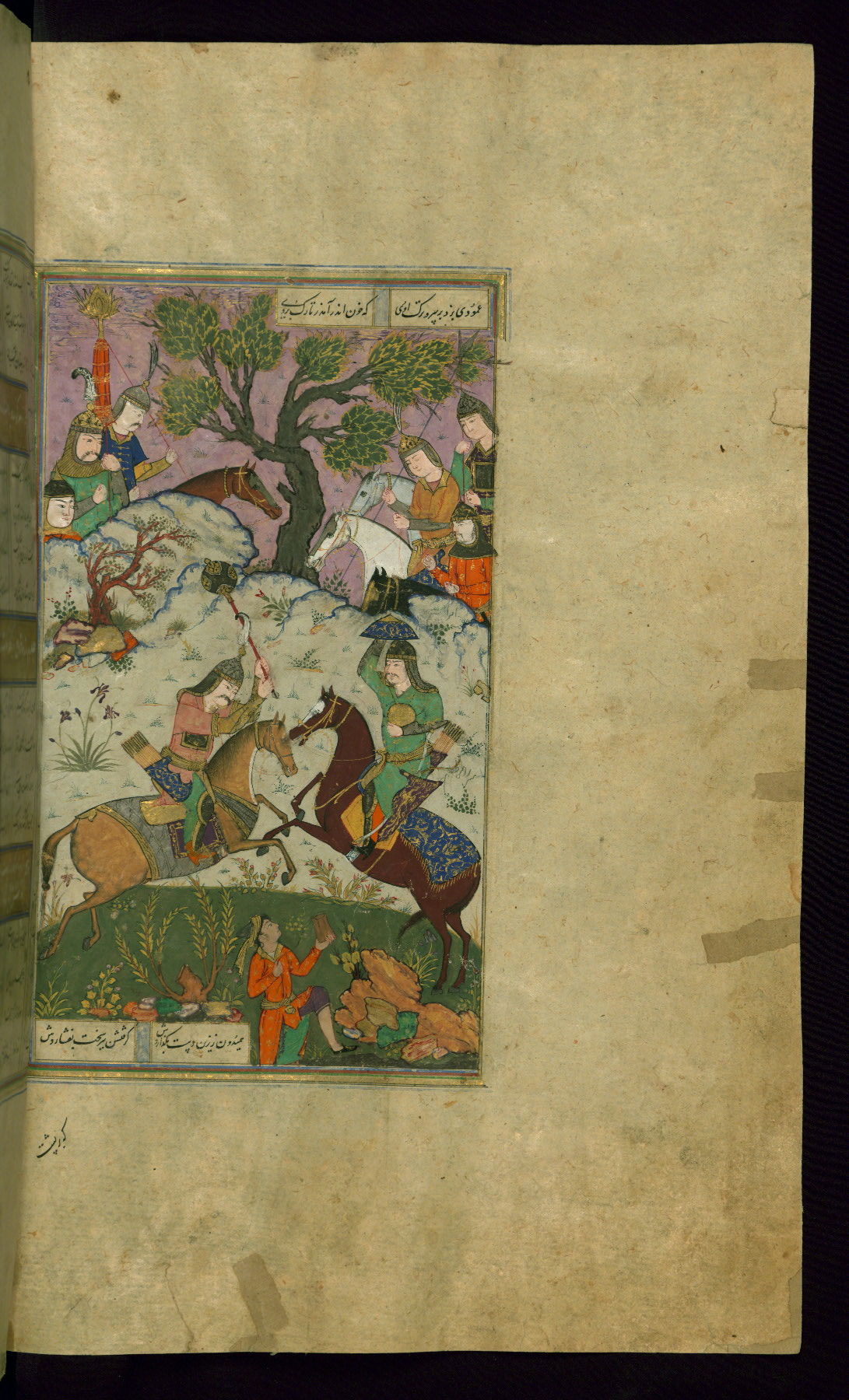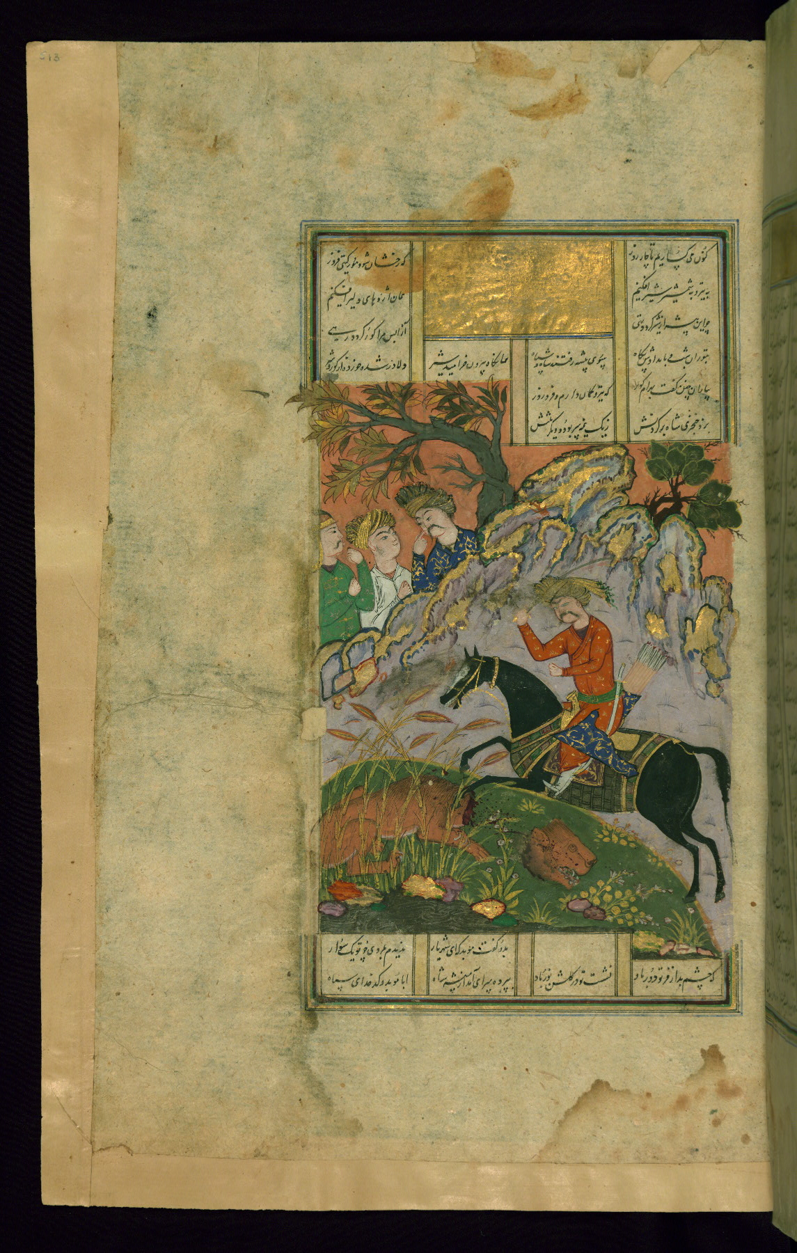 - Label: This is the right side of a double-page illuminated frontispiece that precedes the beginning of the main text of the Shāhnāmah (Book of kings).
