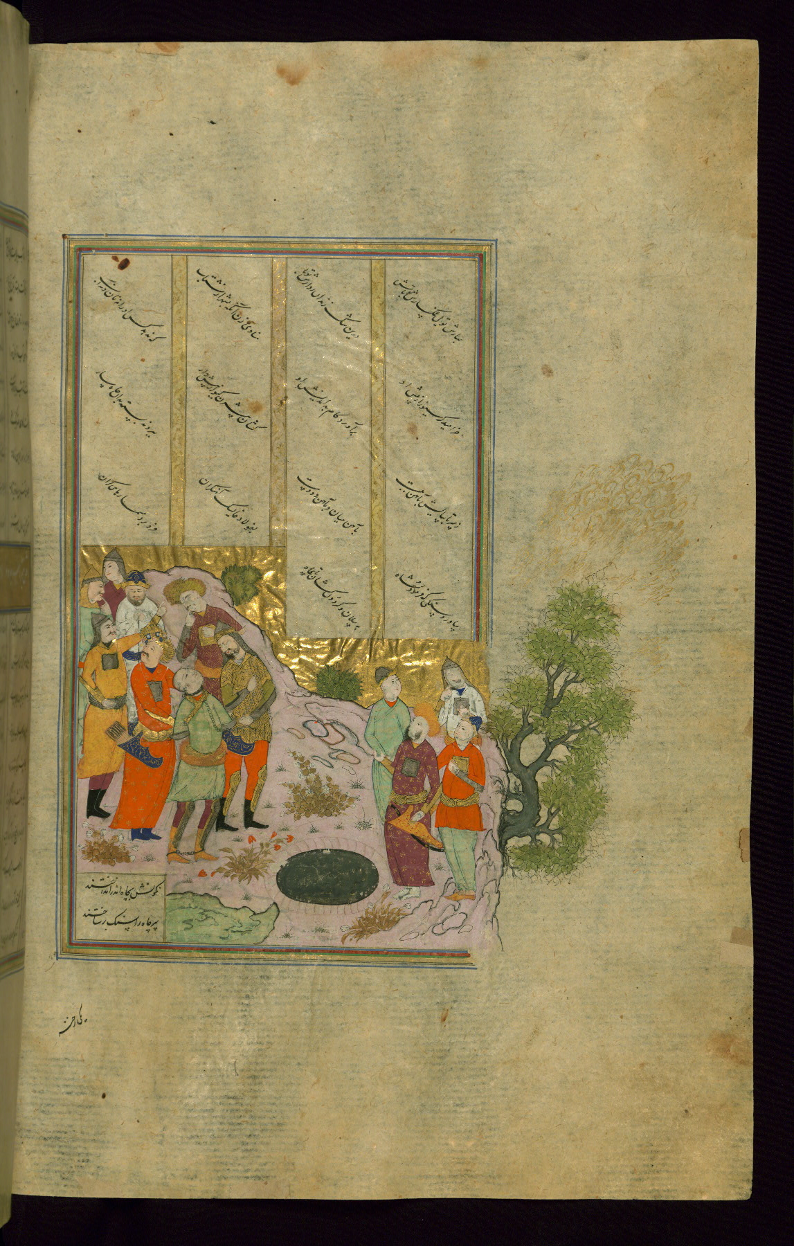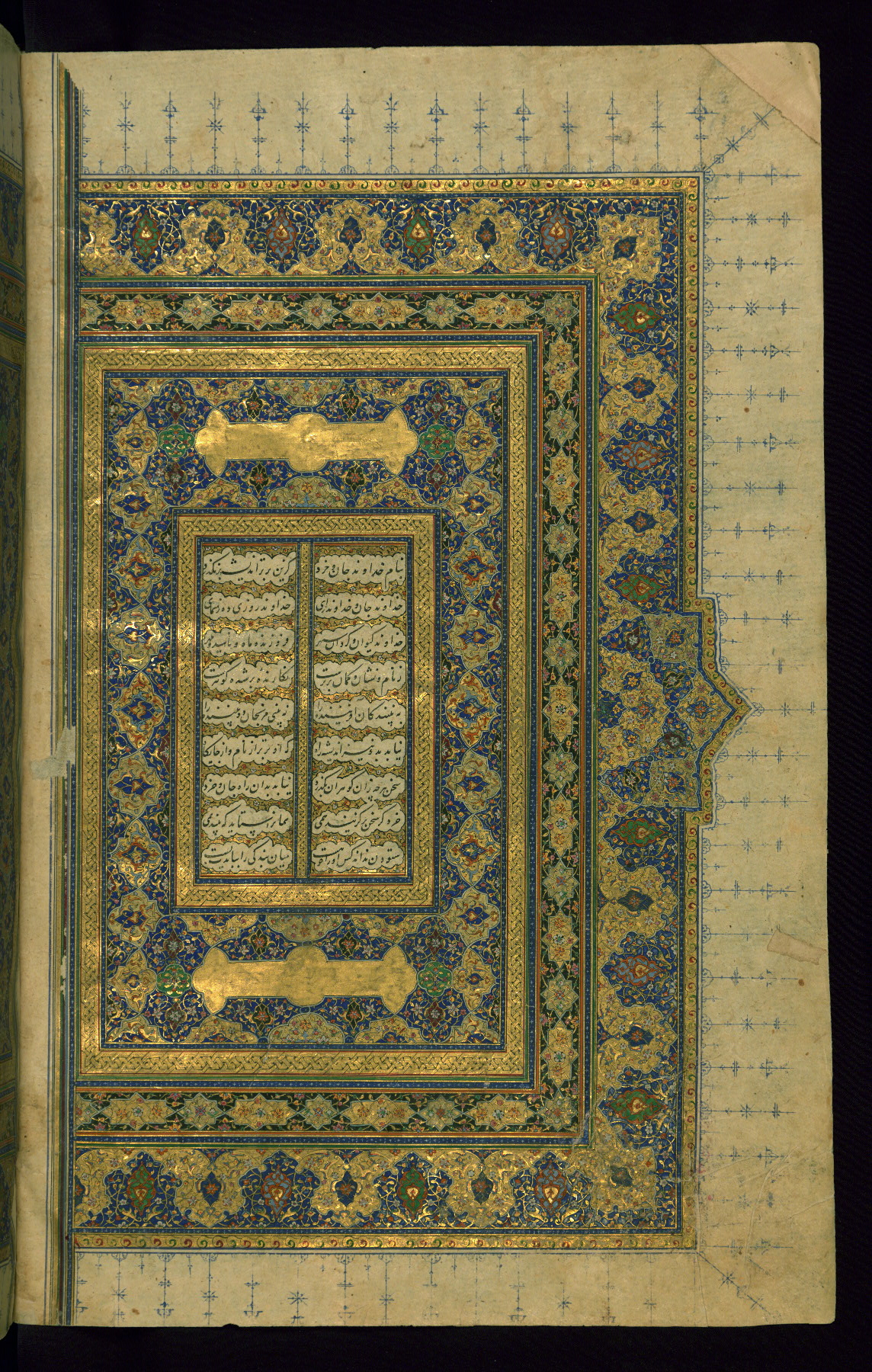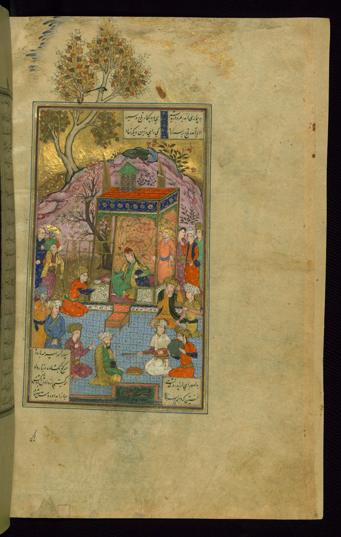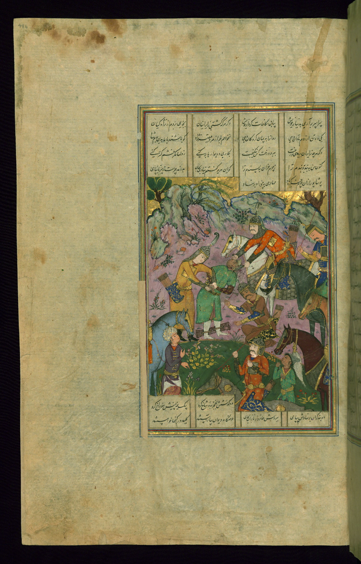 - Label: This is the right side of a double-page illuminated frontispiece that precedes the beginning of the main text of the Shāhnāmah (Book of kings).