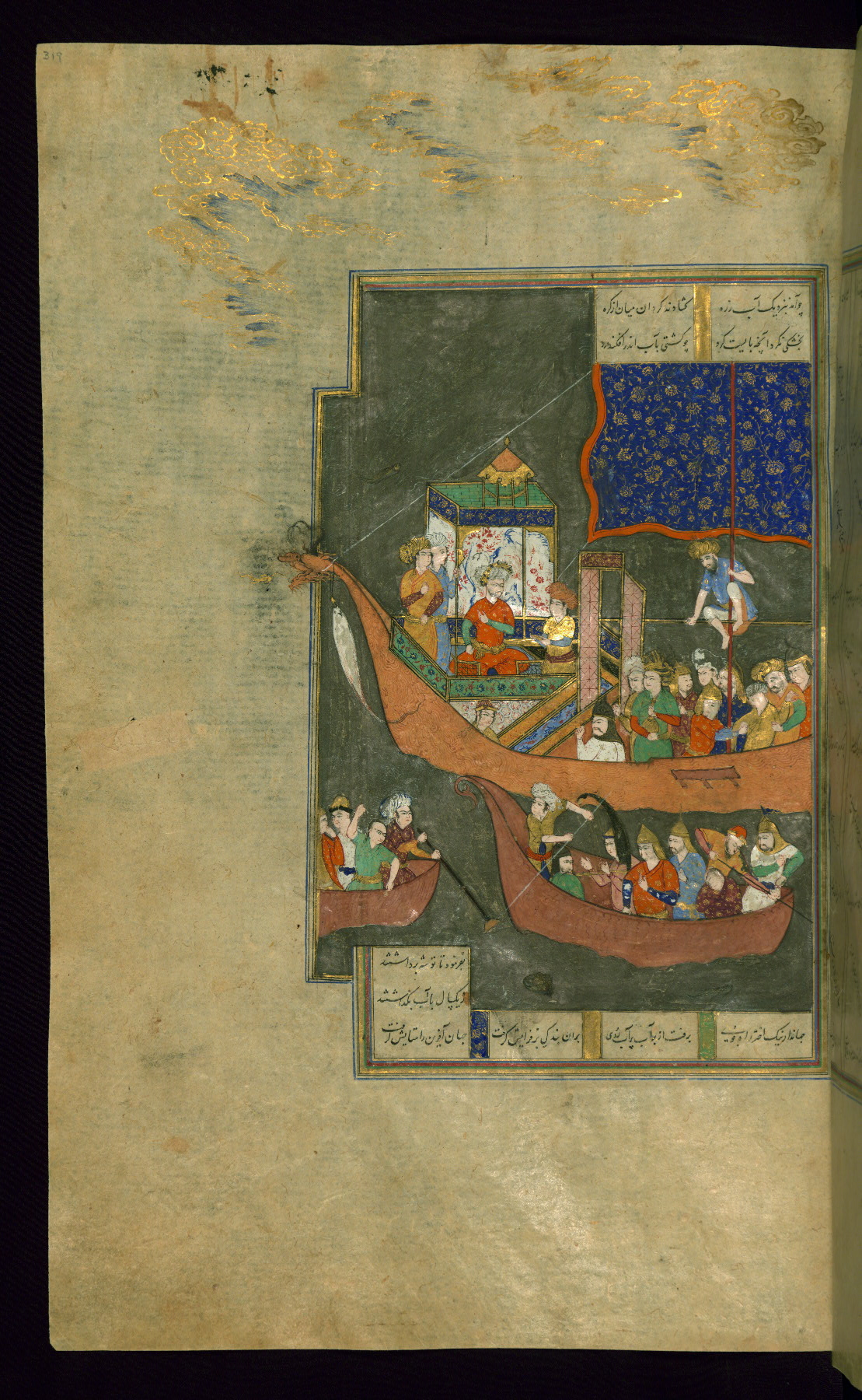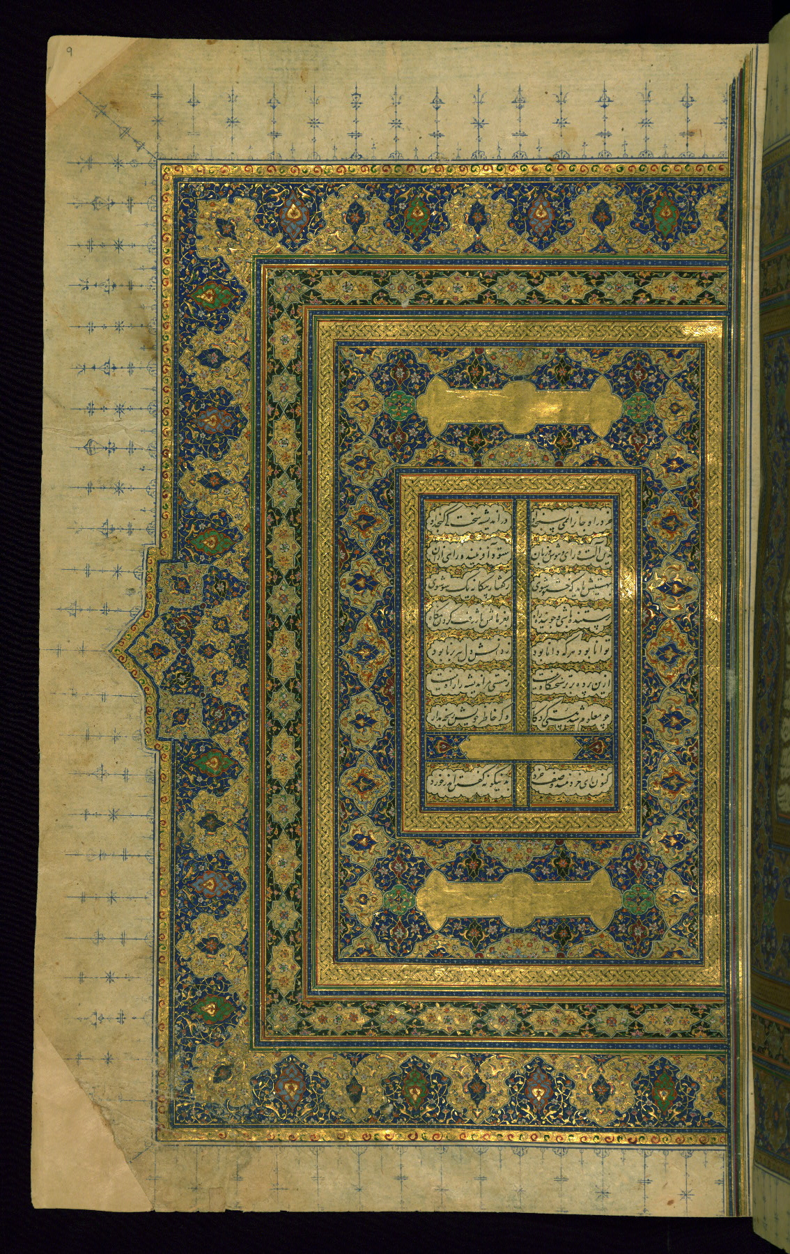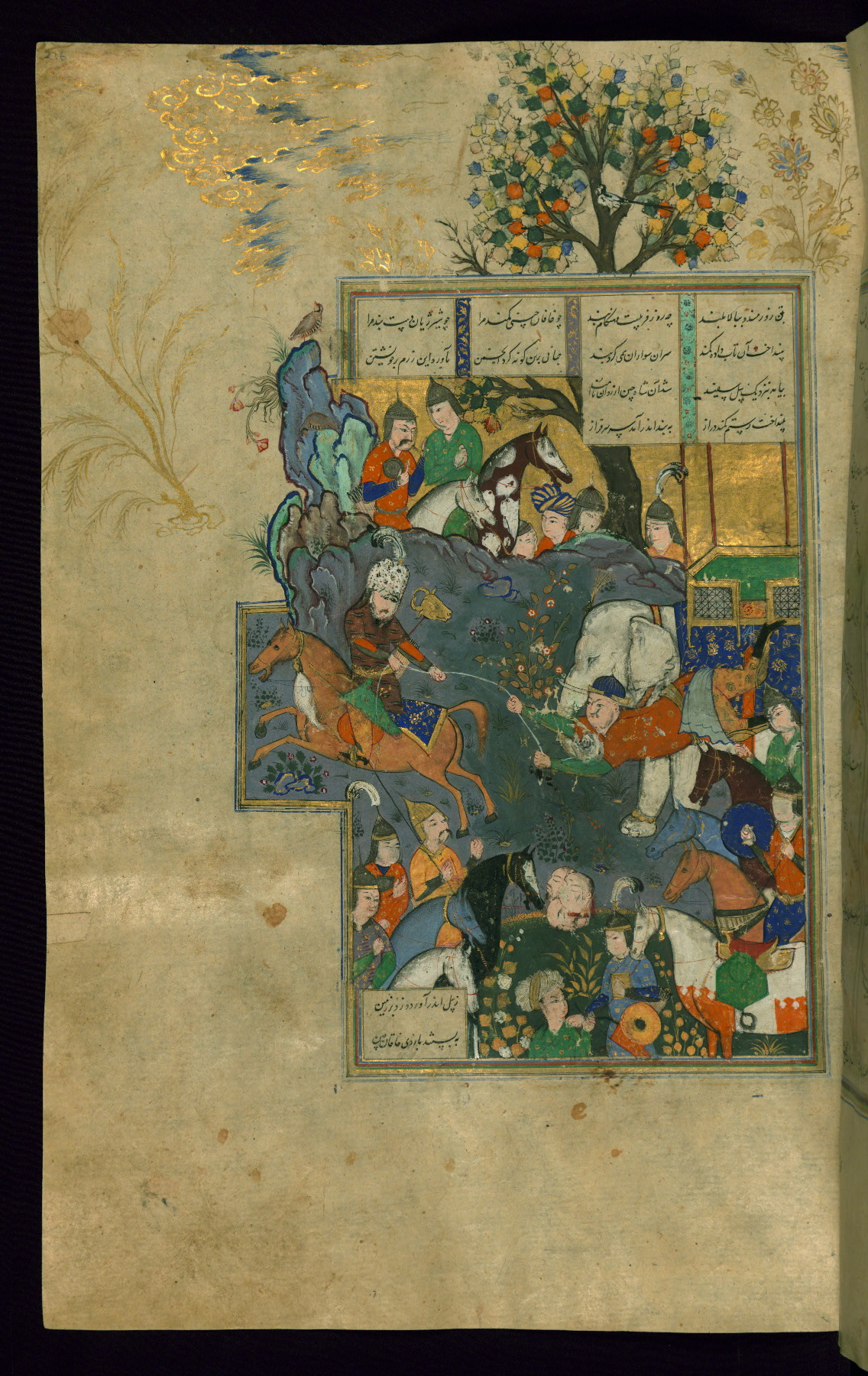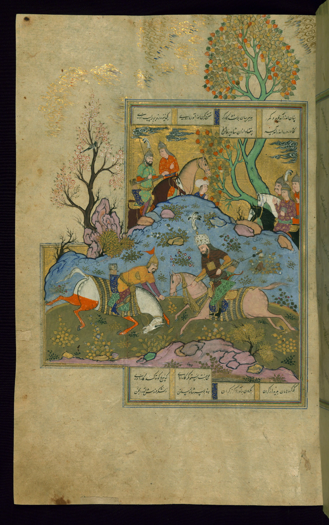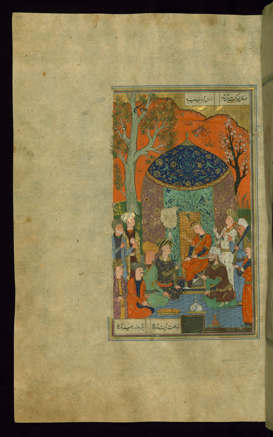 - Label: This is the right side of a double-page illuminated frontispiece that precedes the beginning of the main text of the Shāhnāmah (Book of kings).