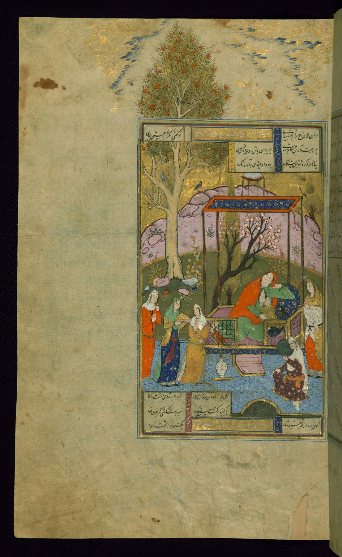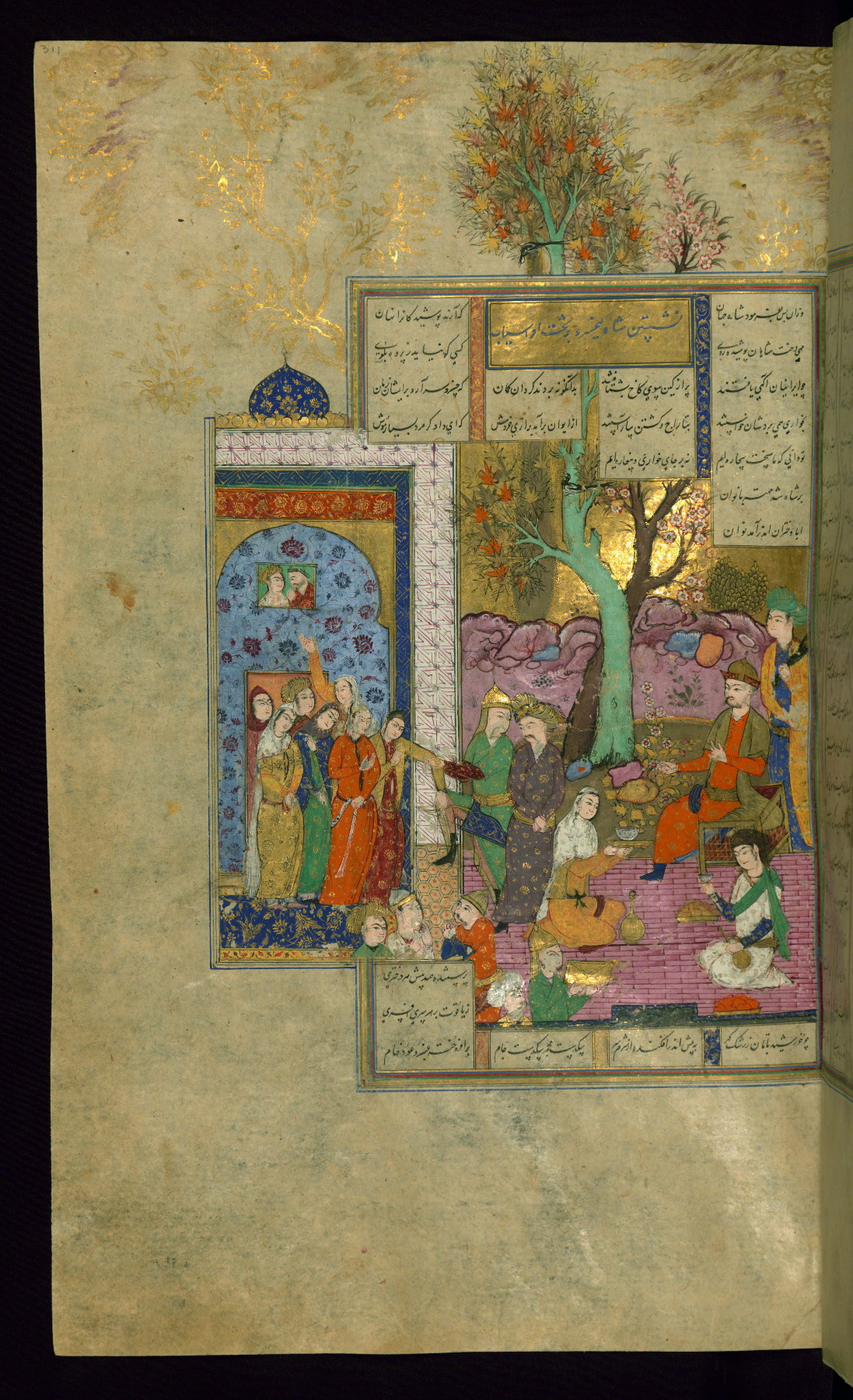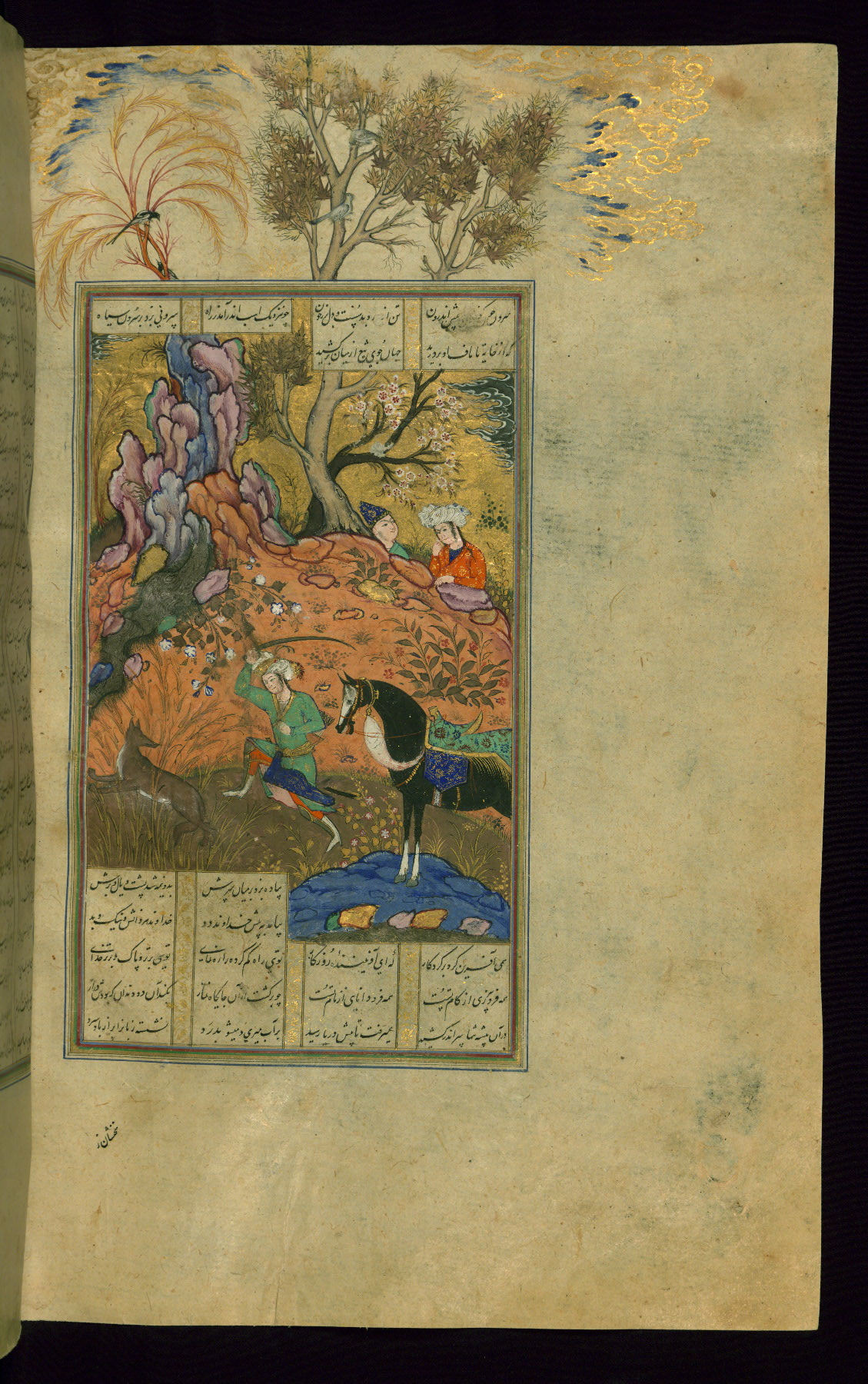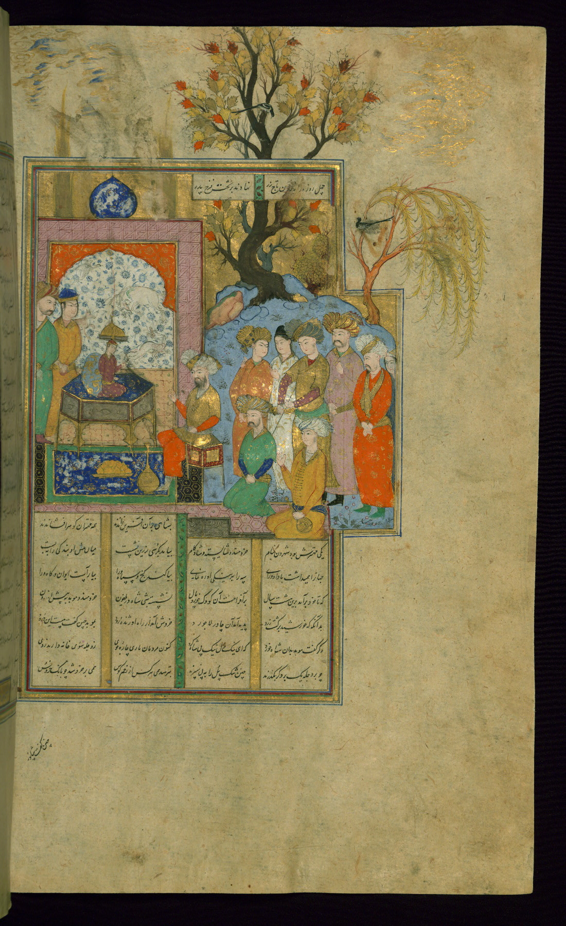 - Title: Munzir introduces Bahrām Gūr to two maidens, one a servant, the other a harpist
