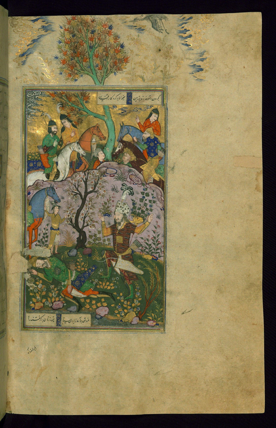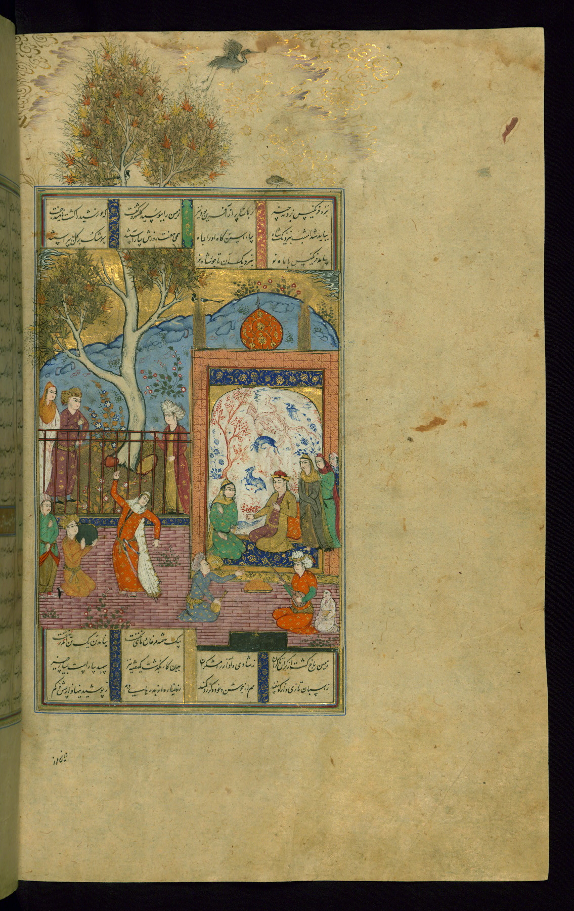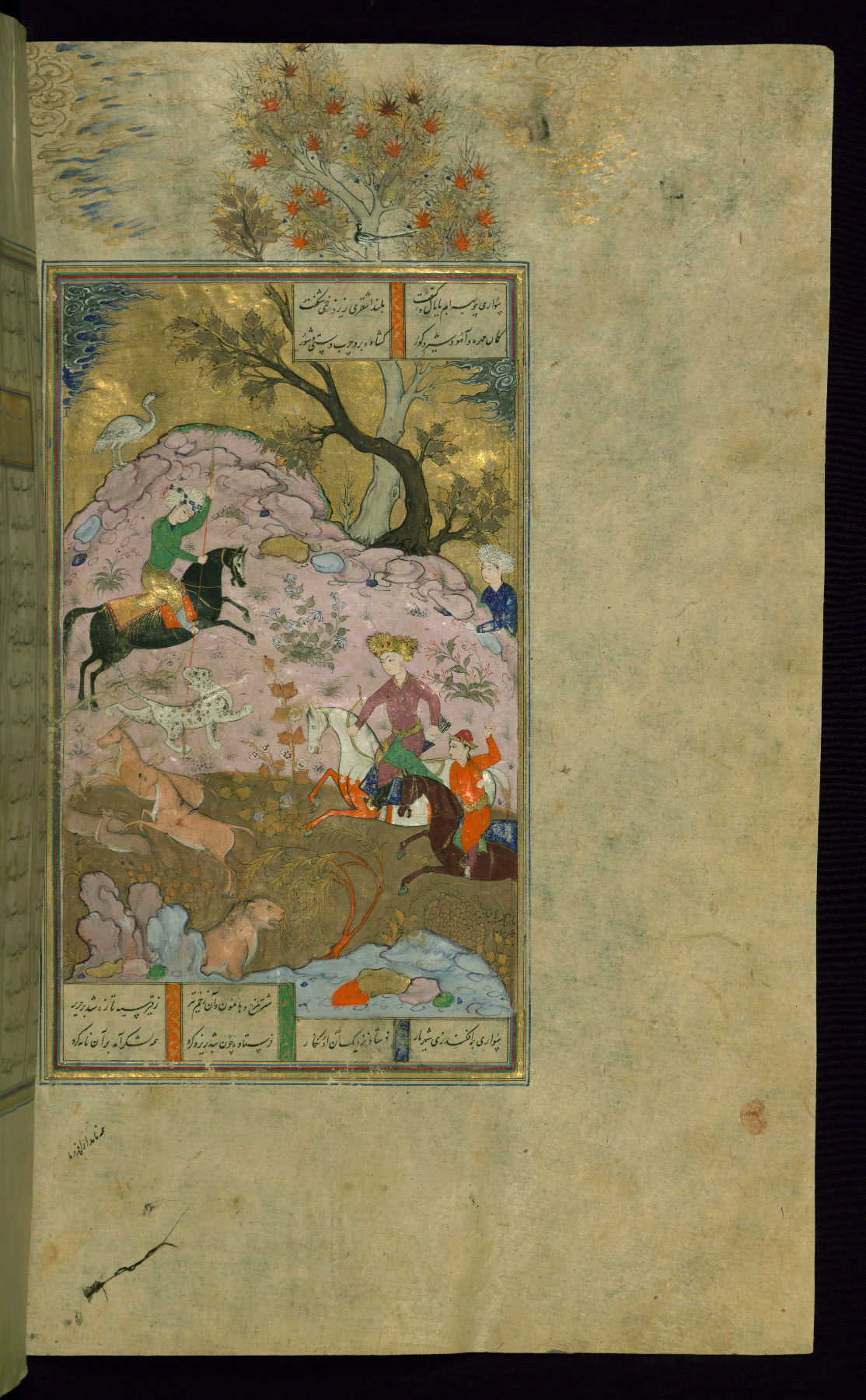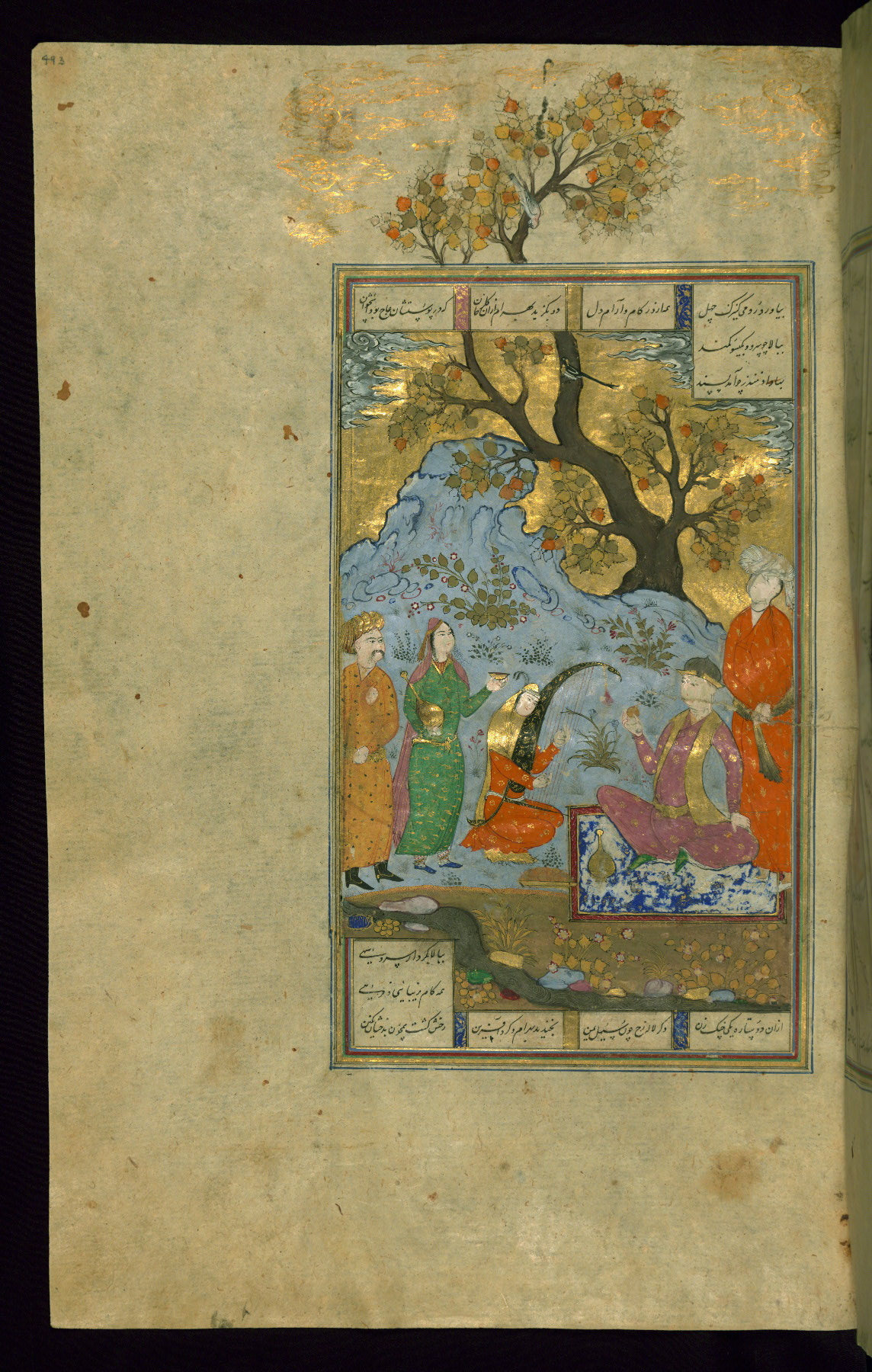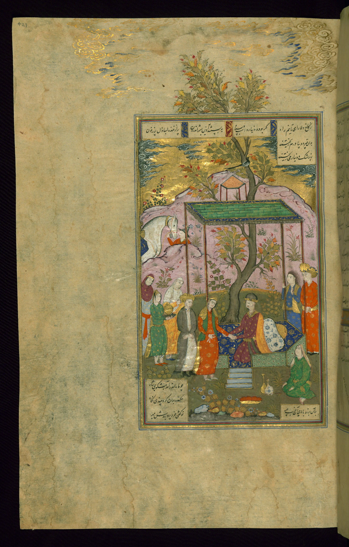 - Title: Munzir introduces Bahrām Gūr to two maidens, one a servant, the other a harpist