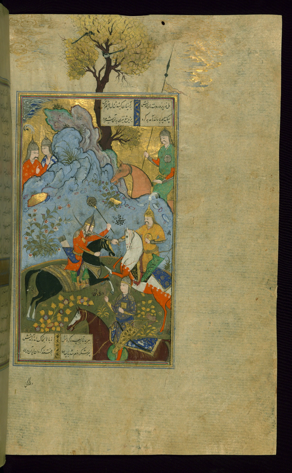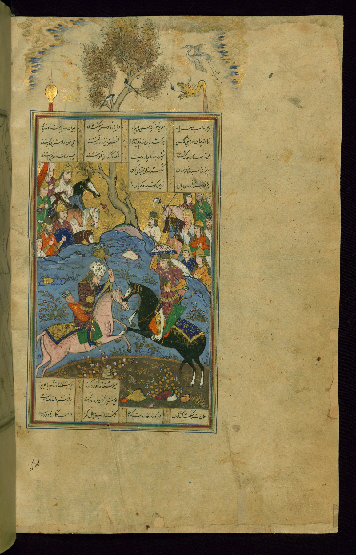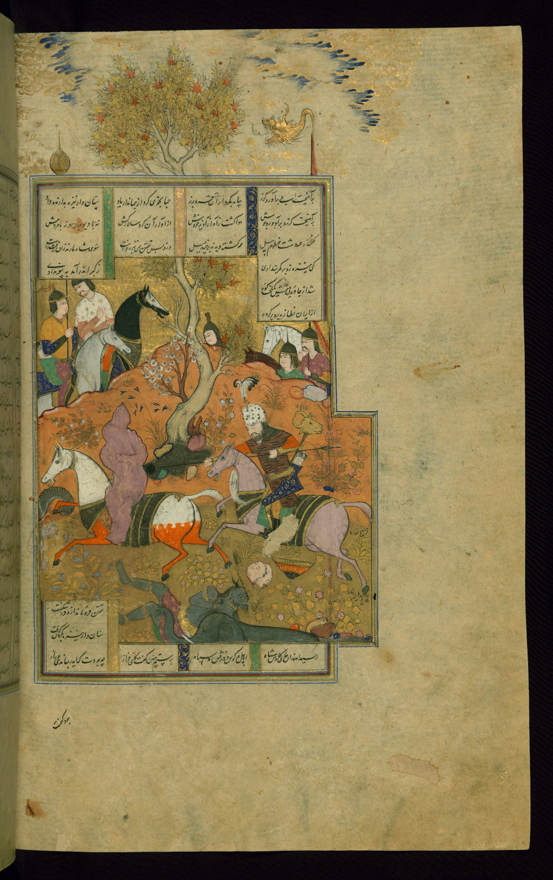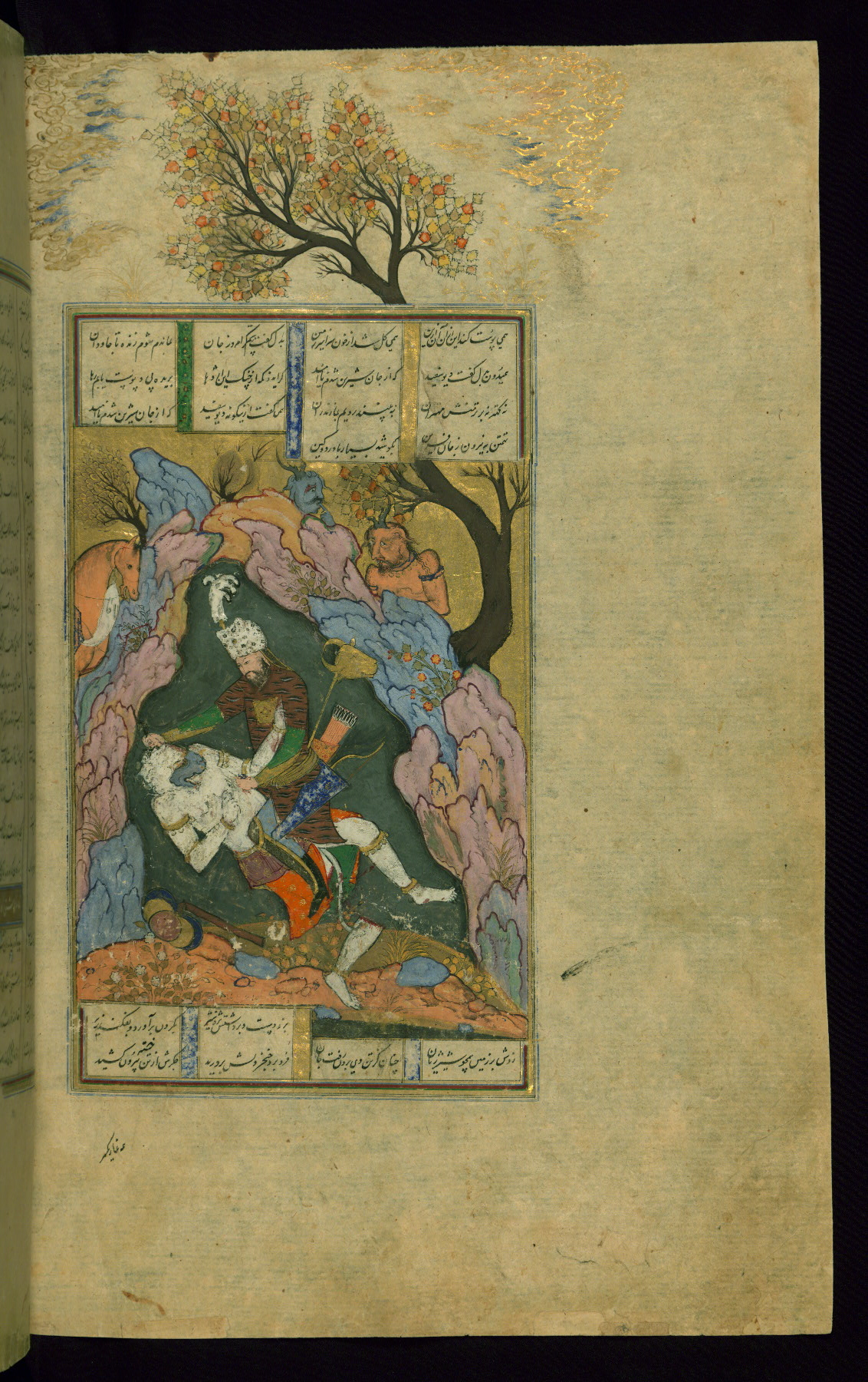 This copy of Firdawsī's Shāhnāmah (Book of kings) was written by Muḥammad Mīrak ibn Mīr Muḥammad al-Ḥusaynī al-Ustādī, most probably in Herat (present-day Afghanistan). It was completed in 1028 AH / 1618-9 CE. There are two Arabic colophons, one at the end of the preface (fol. 7a) and the other at the end of part 1 (fol. 334a). The preface is by Abū Manṣūr Muḥammad ibn ʿAbd al-Razzāq, who composed it in 346 AH / 957-8 CE. Although incomplete at the end, the manuscript contains eighty-three illustrations. Some are by a later hand and attributed to Safavid artists Rizā ʿAbbāsī and Shaykh ʿAbbāsī in the eleventh century AH / seventeenth CE (fols. 55b, 62b, 391b, 476b, and 479b). The lacquer binding is not contemporary with the manuscript and dates to the thirteenth century AH / nineteenth CE.
