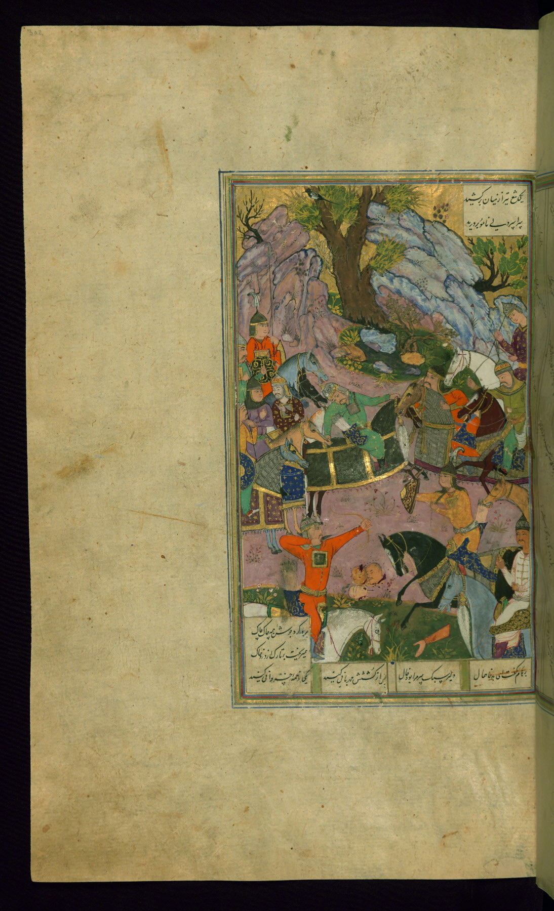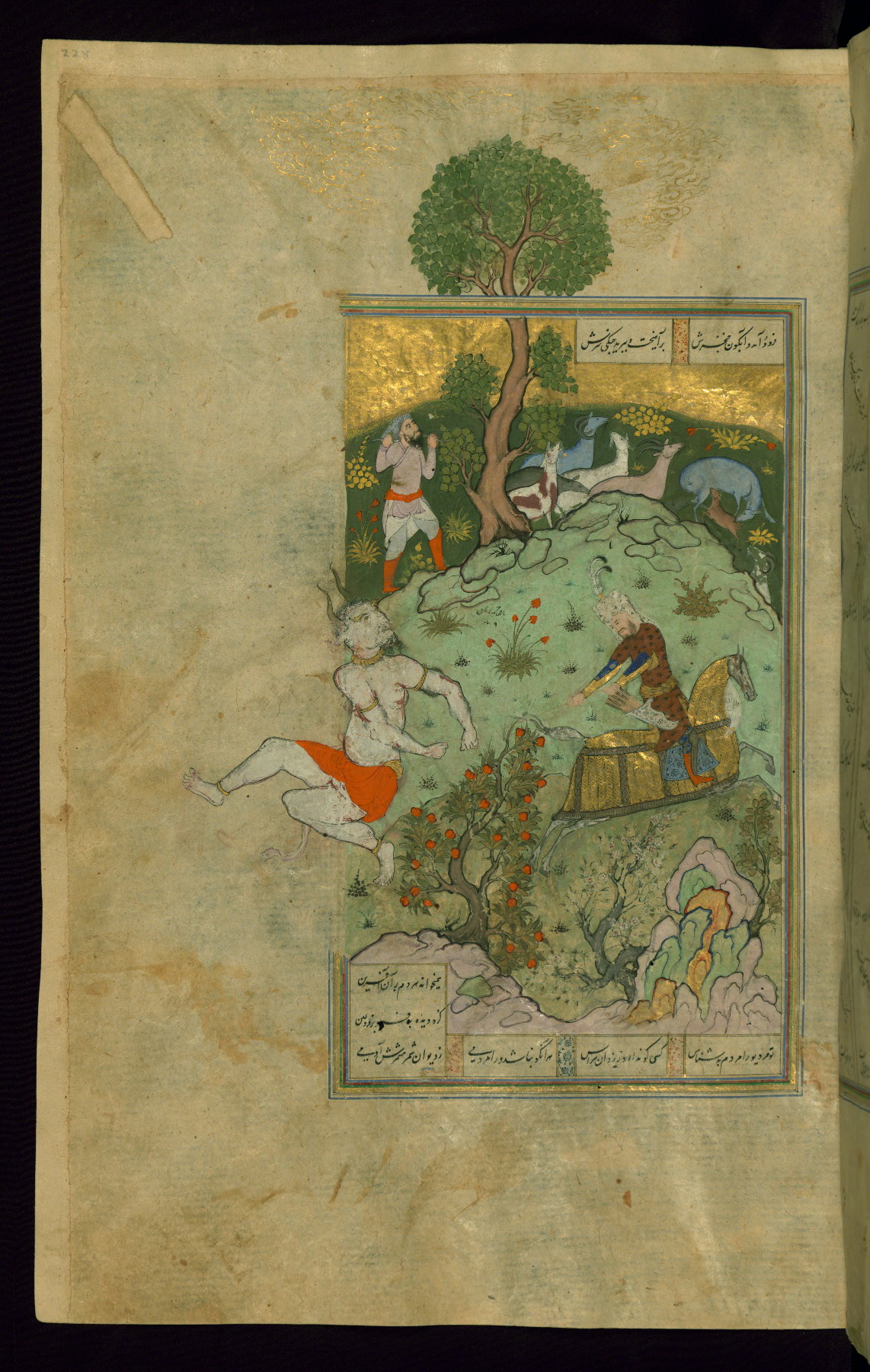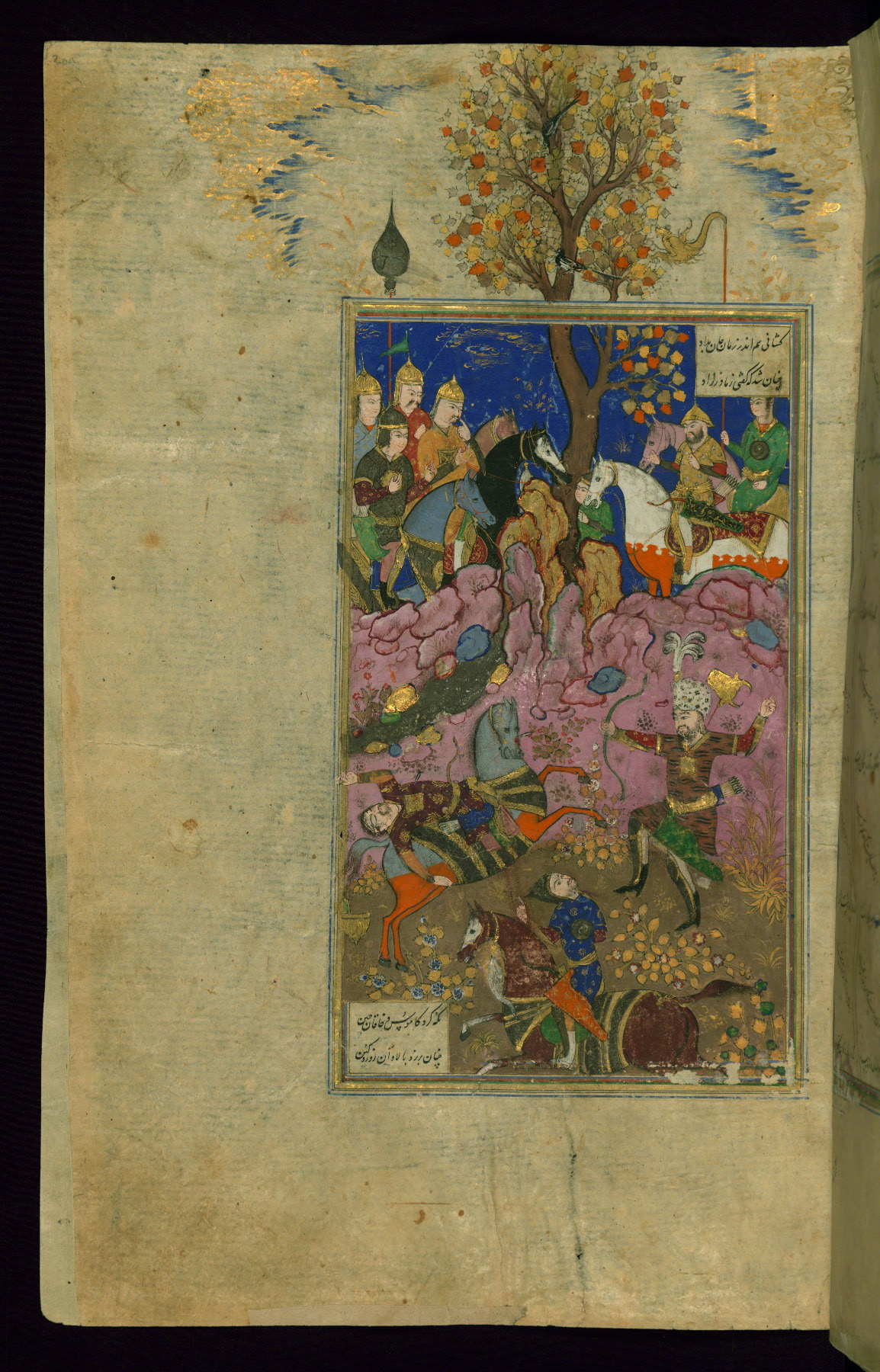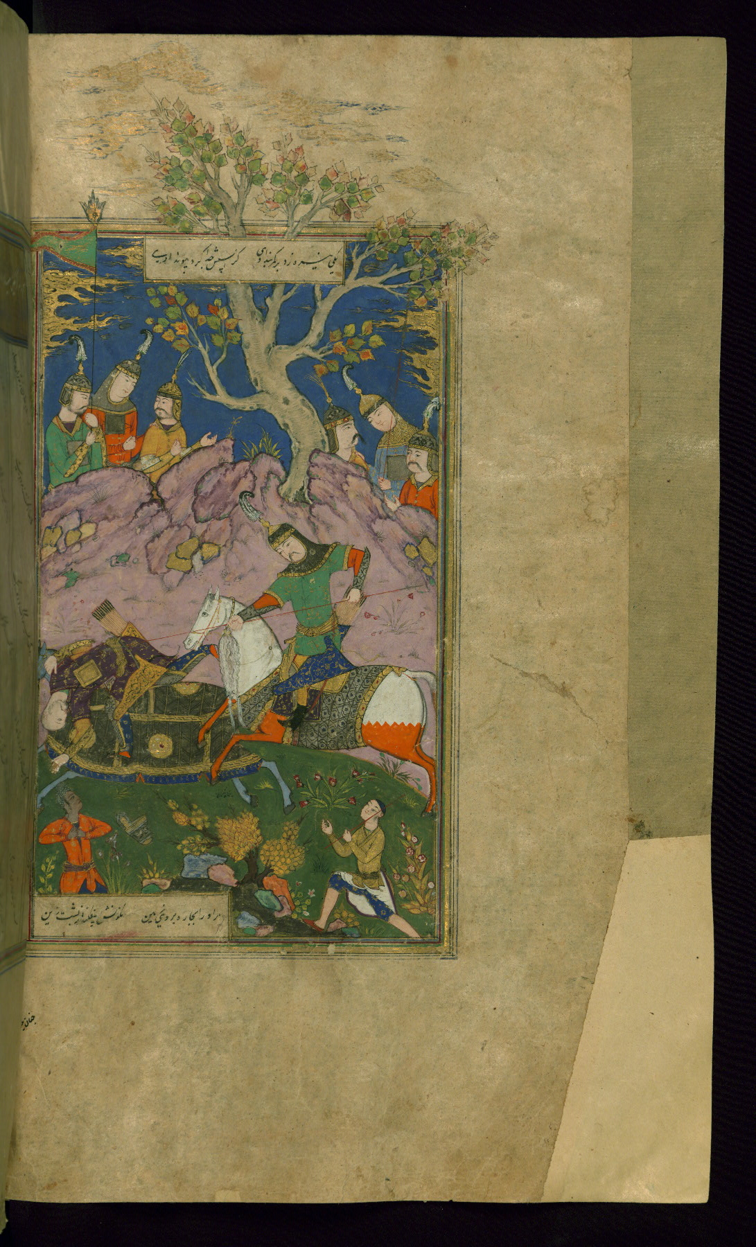 This copy of Firdawsī's Shāhnāmah (Book of kings) was written by Muḥammad Mīrak ibn Mīr Muḥammad al-Ḥusaynī al-Ustādī, most probably in Herat (present-day Afghanistan). It was completed in 1028 AH / 1618-9 CE. There are two Arabic colophons, one at the end of the preface (fol. 7a) and the other at the end of part 1 (fol. 334a). The preface is by Abū Manṣūr Muḥammad ibn ʿAbd al-Razzāq, who composed it in 346 AH / 957-8 CE. Although incomplete at the end, the manuscript contains eighty-three illustrations. Some are by a later hand and attributed to Safavid artists Rizā ʿAbbāsī and Shaykh ʿAbbāsī in the eleventh century AH / seventeenth CE (fols. 55b, 62b, 391b, 476b, and 479b). The lacquer binding is not contemporary with the manuscript and dates to the thirteenth century AH / nineteenth CE.