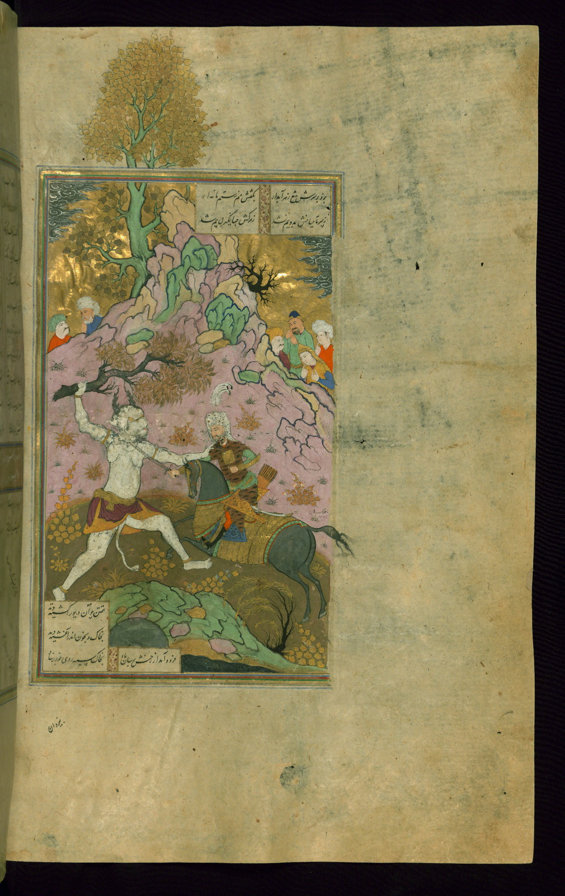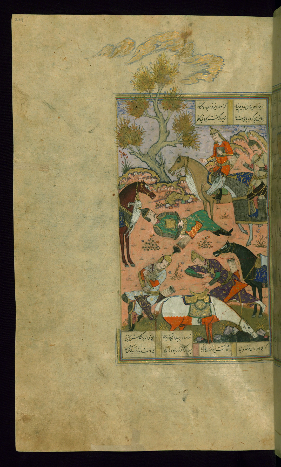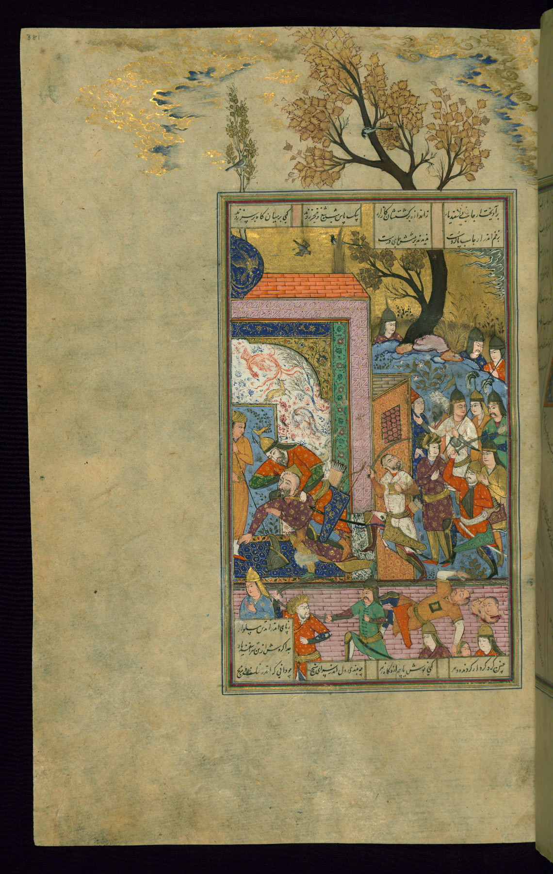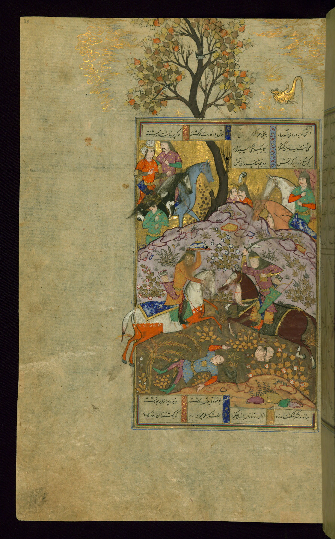 This copy of Firdawsī's Shāhnāmah (Book of kings) was written by Muḥammad Mīrak ibn Mīr Muḥammad al-Ḥusaynī al-Ustādī, most probably in Herat (present-day Afghanistan). It was completed in 1028 AH / 1618-9 CE. There are two Arabic colophons, one at the end of the preface (fol. 7a) and the other at the end of part 1 (fol. 334a). The preface is by Abū Manṣūr Muḥammad ibn ʿAbd al-Razzāq, who composed it in 346 AH / 957-8 CE. Although incomplete at the end, the manuscript contains eighty-three illustrations. Some are by a later hand and attributed to Safavid artists Rizā ʿAbbāsī and Shaykh ʿAbbāsī in the eleventh century AH / seventeenth CE (fols. 55b, 62b, 391b, 476b, and 479b). The lacquer binding is not contemporary with the manuscript and dates to the thirteenth century AH / nineteenth CE.