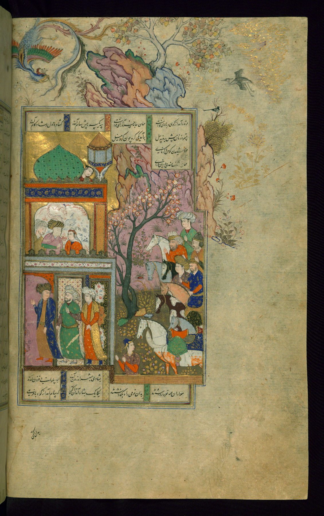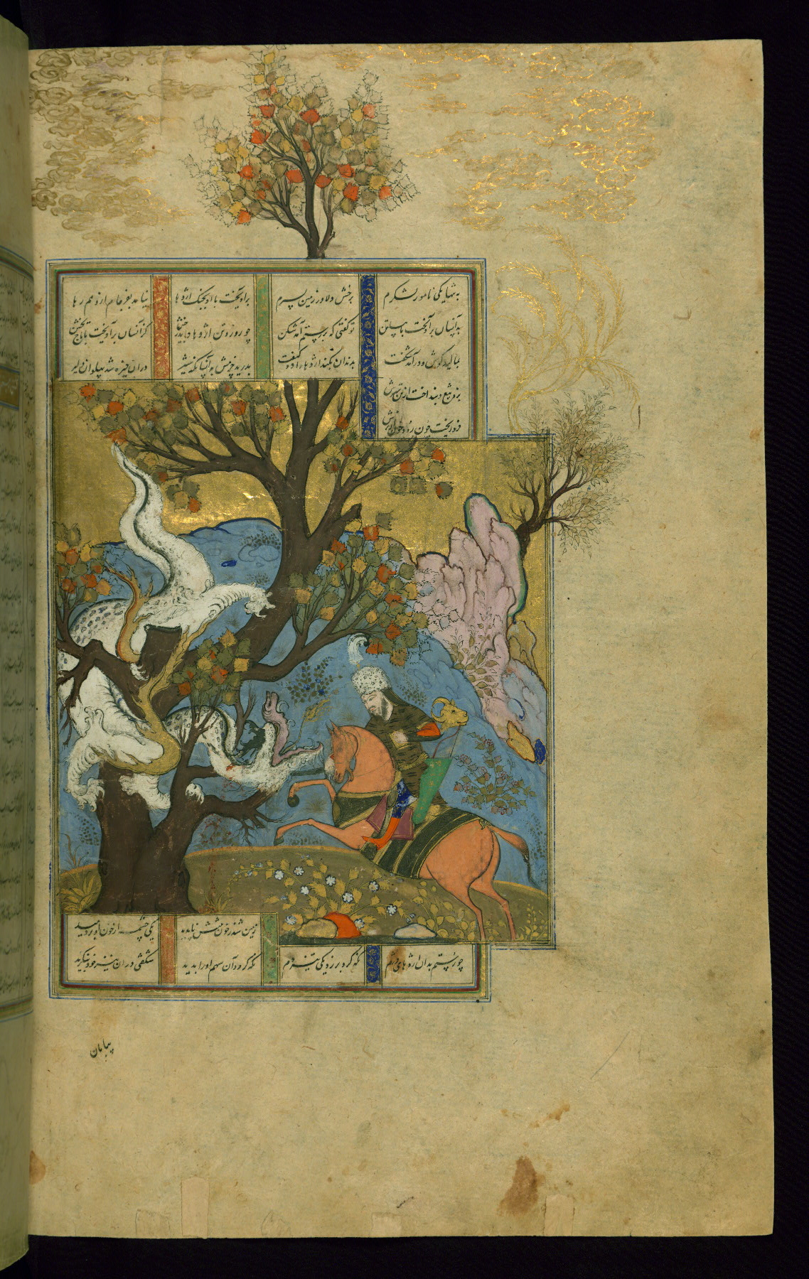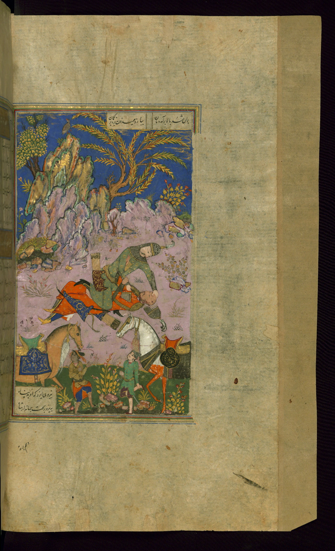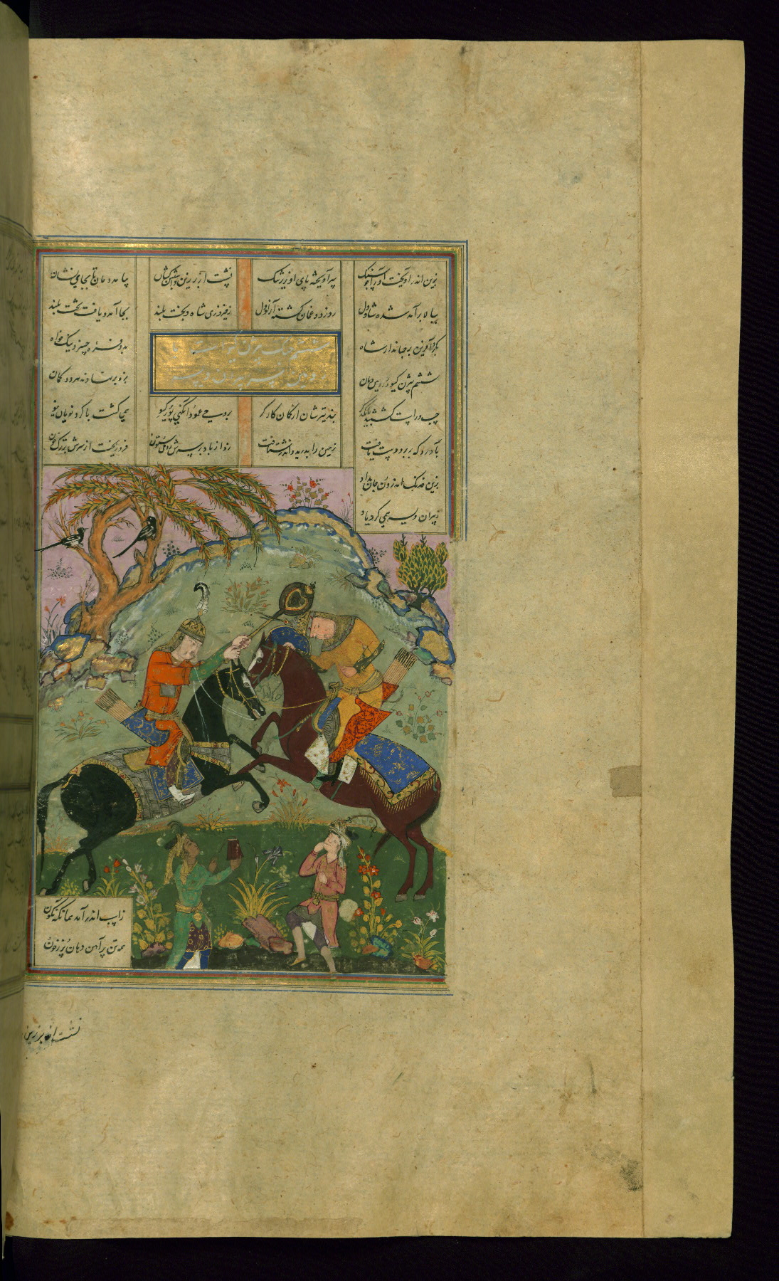 - Label: There is a later inscription on this illustration bearing the name of the painter Rizā with the date 1070 AH / 1659-60 CE.