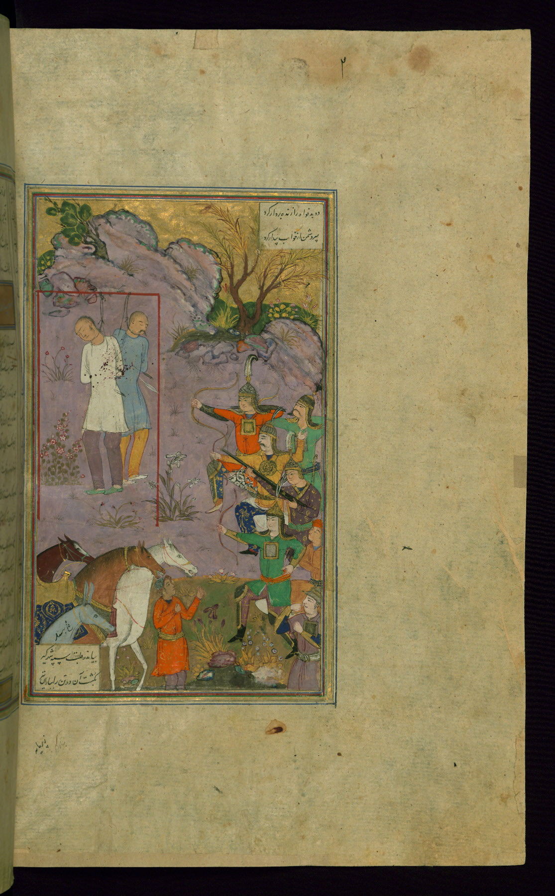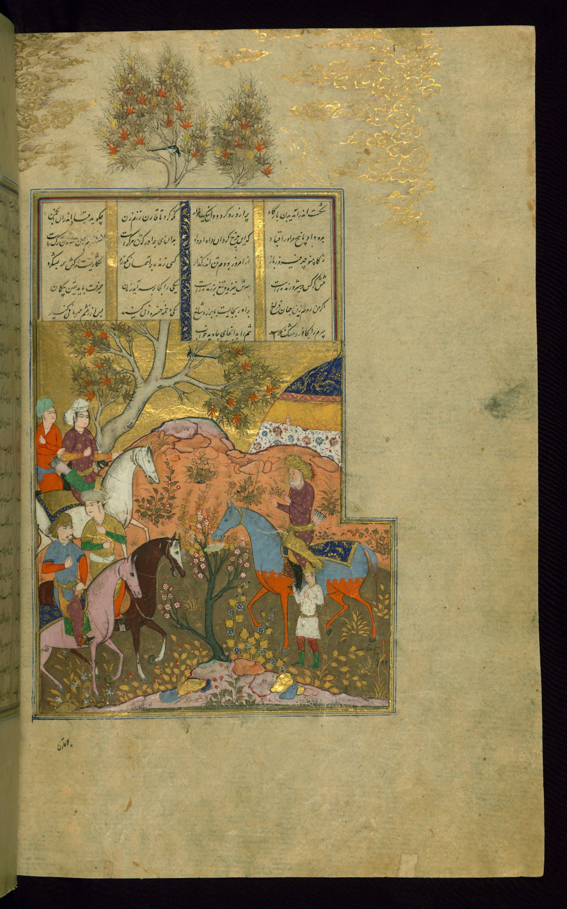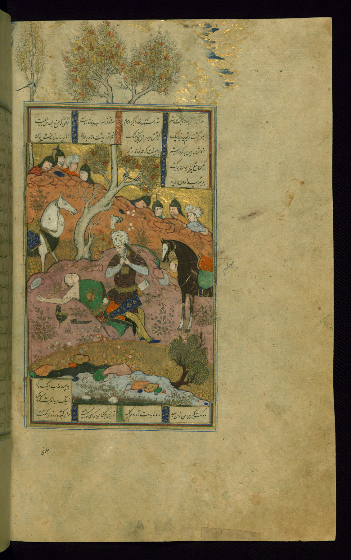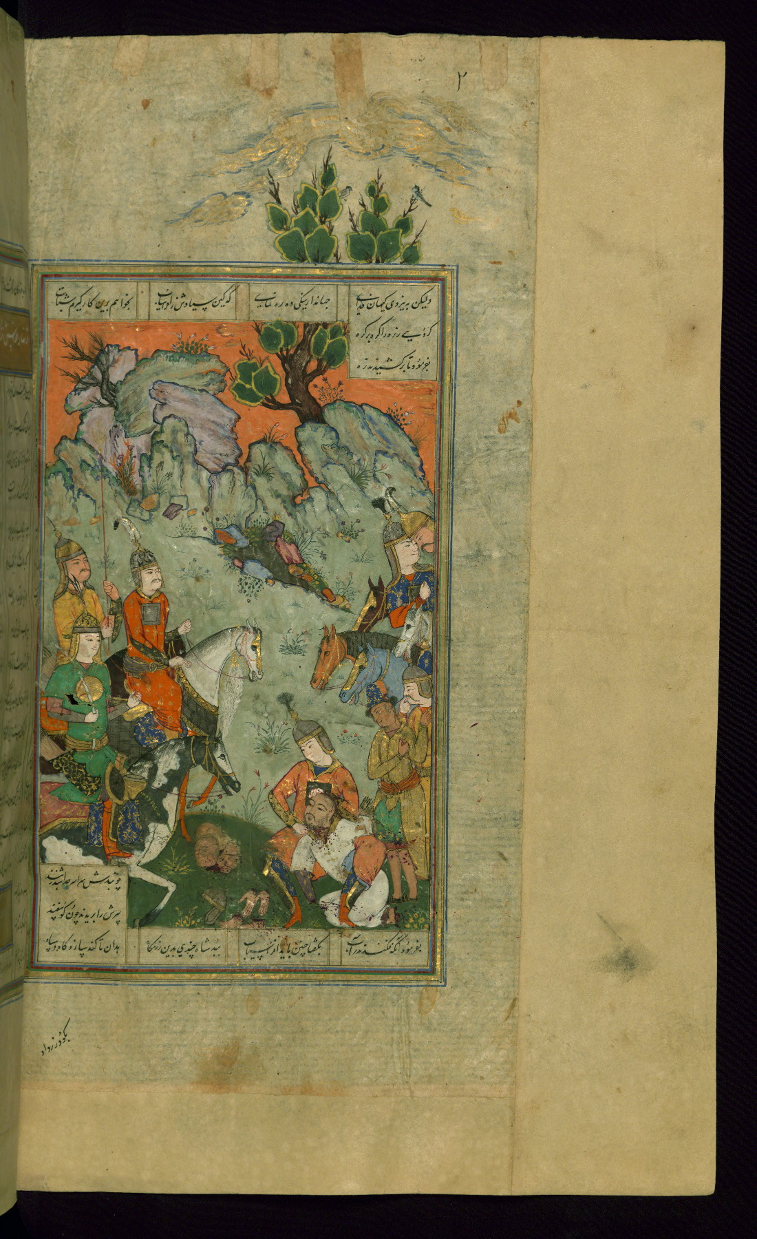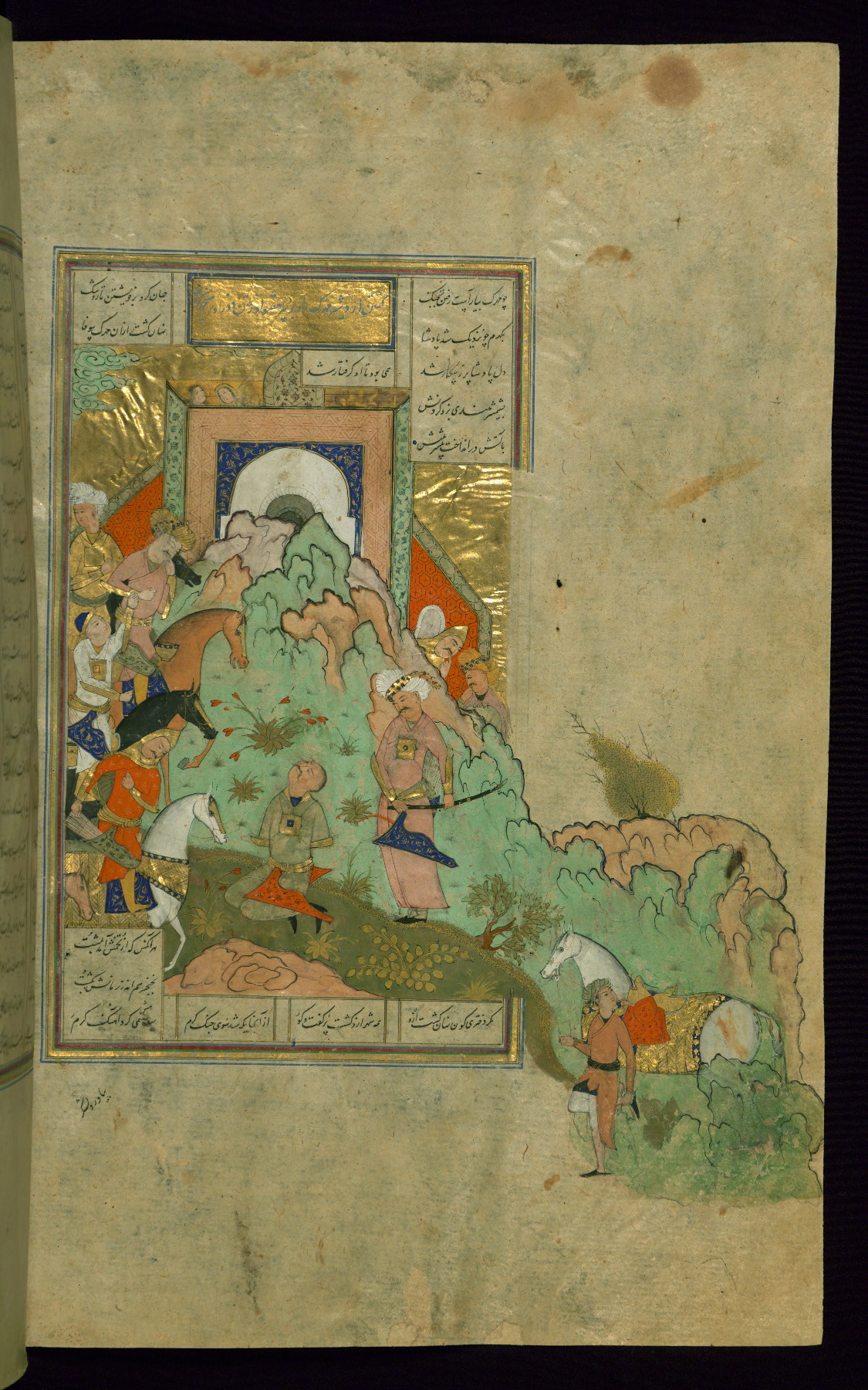 - Label: There is a later inscription on this illustration bearing the name of the painter Rizā with the date 1070 AH / 1659-60 CE.