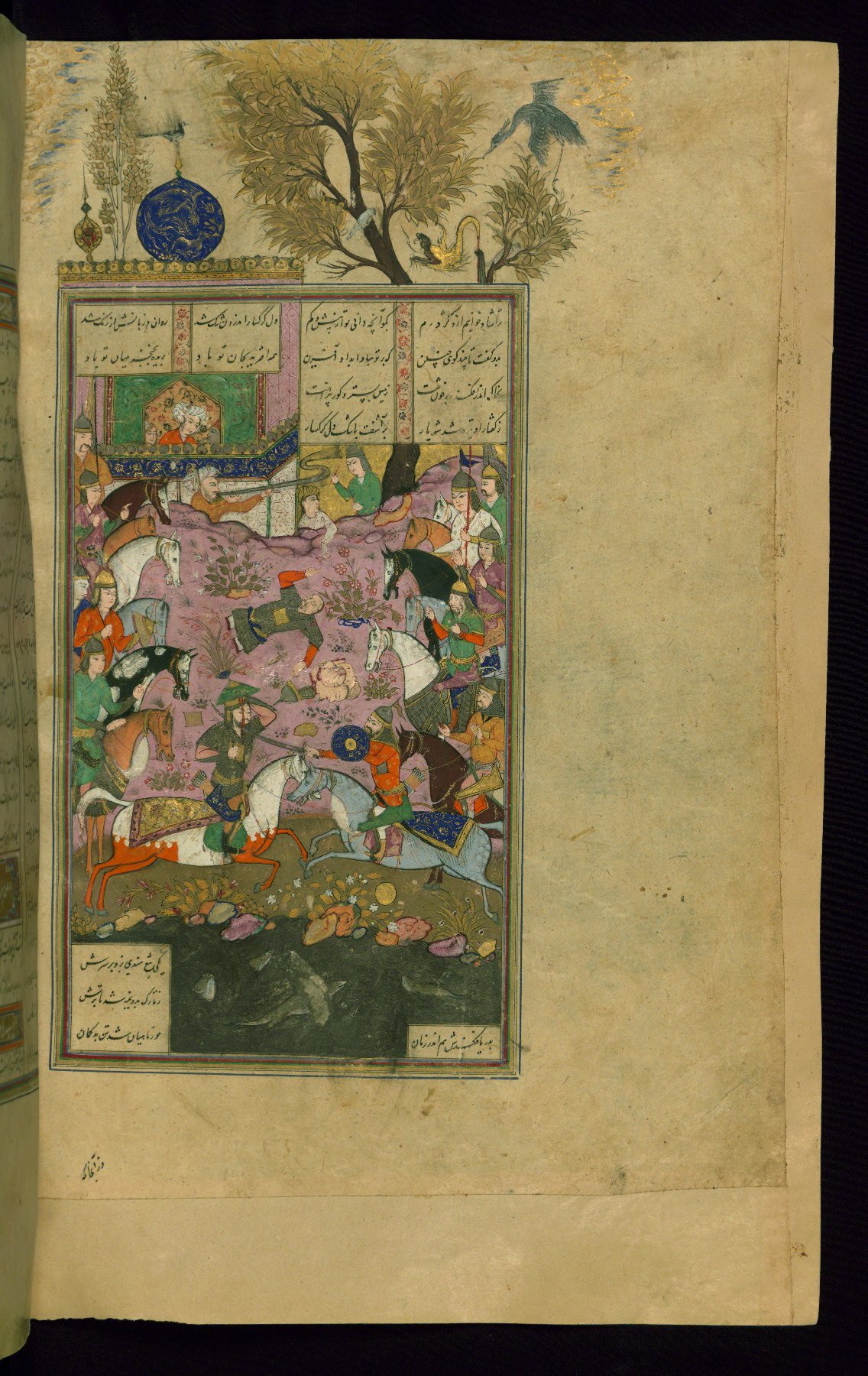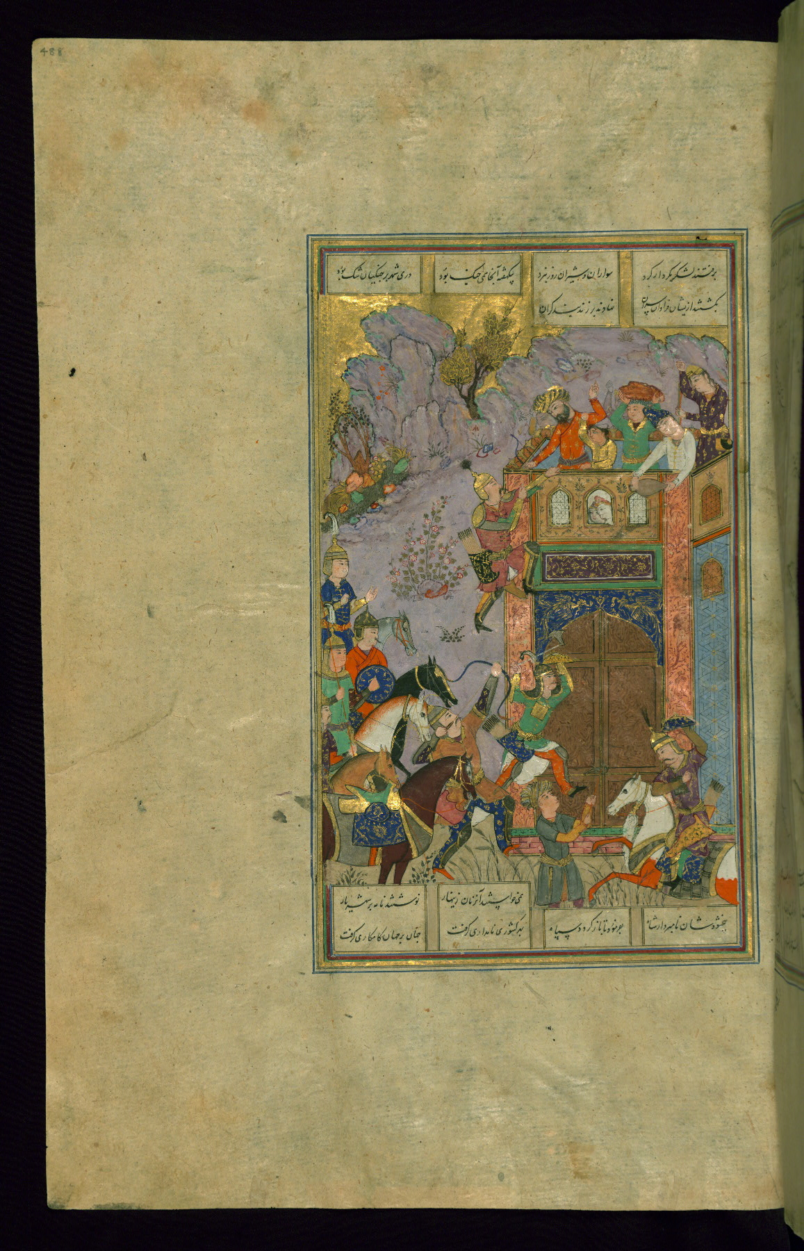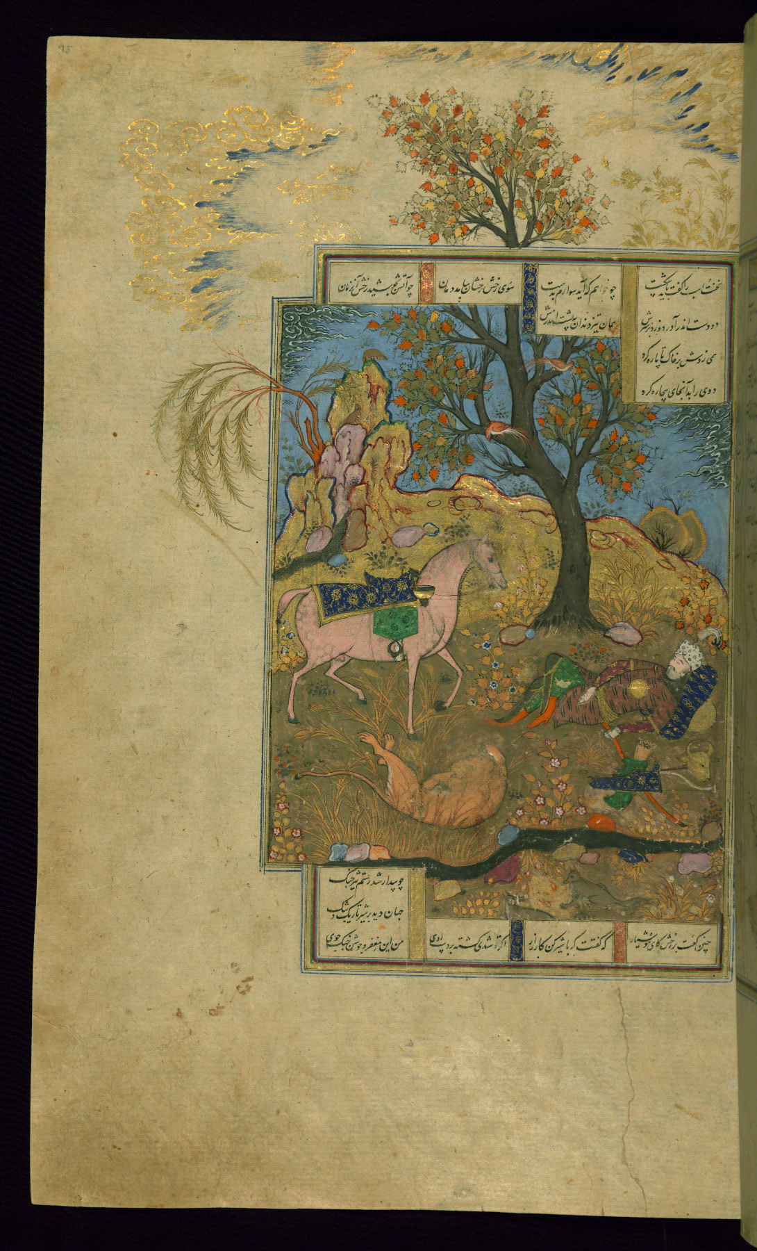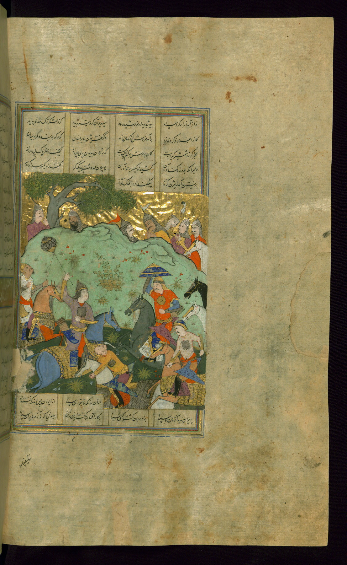 - Decoration note: Eighty-three illustrations, some spuriously attributed to Riz̤ā ʿAbbāsī and Shaykh ʿAbbāsī (fols. 55b, 62b, 391b, 476b, and 479b); Double-page illuminated frontispiece opening the main text of the Shāhnāmah (fols. 8b-9a); illuminated headpiece for the beginning of part 2 (fol. 335b); illuminated headpiece (fol. 106b)