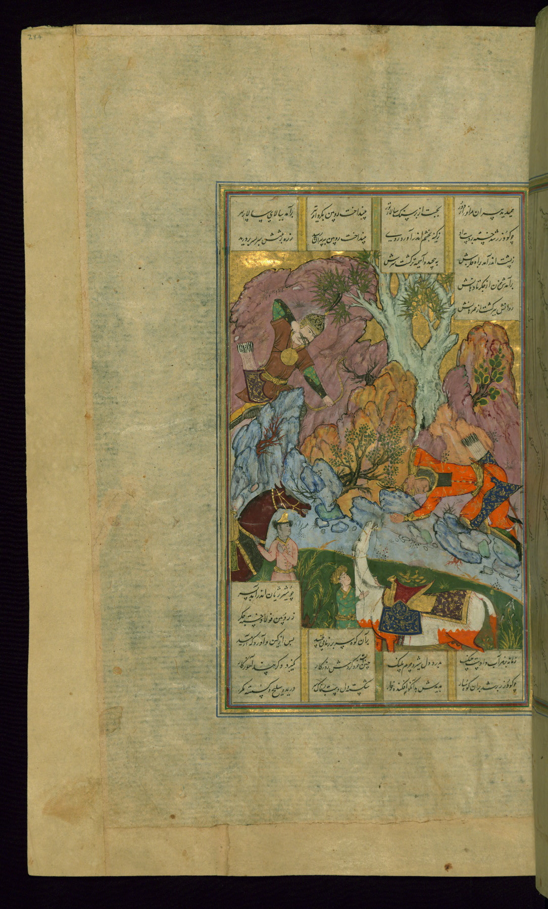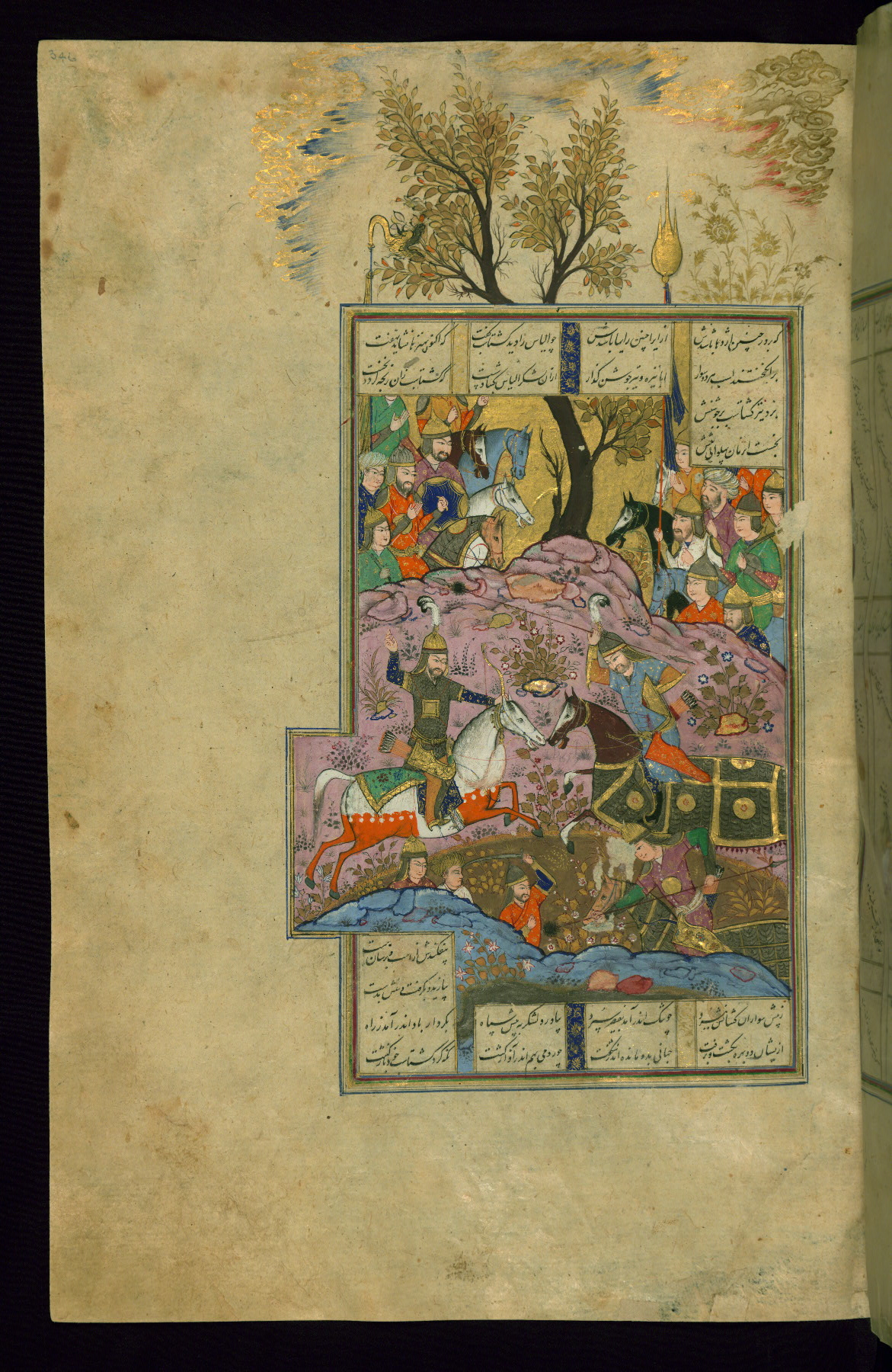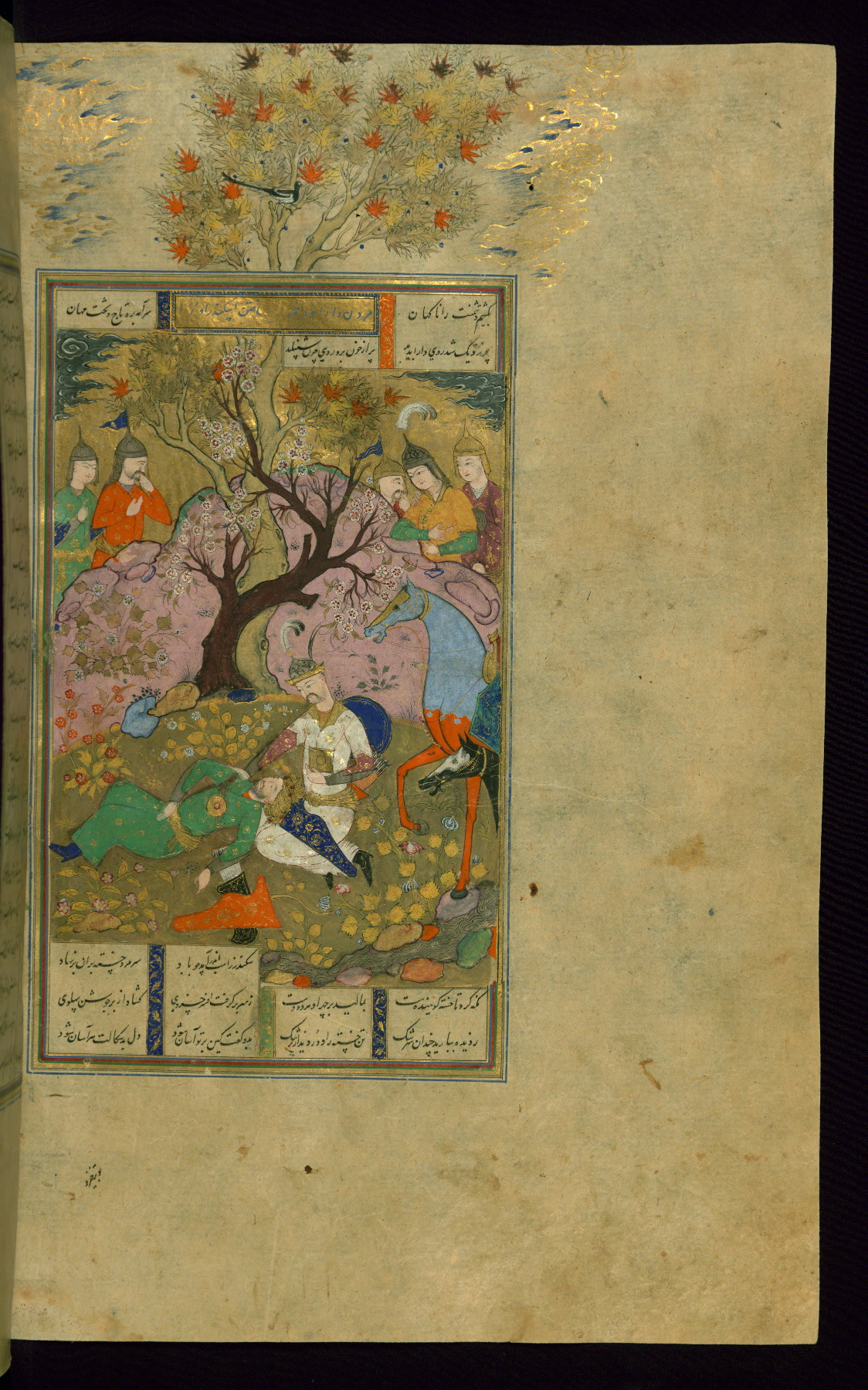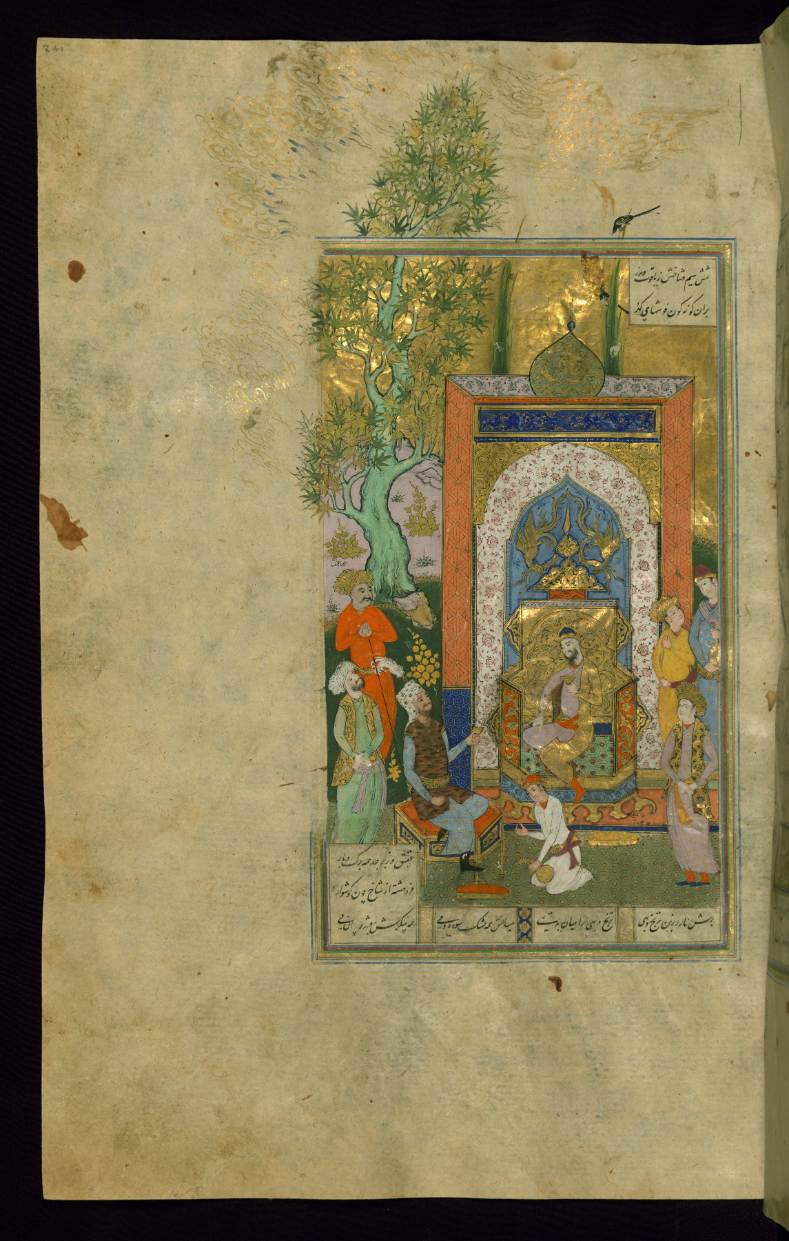 - Decoration note: Eighty-three illustrations, some spuriously attributed to Riz̤ā ʿAbbāsī and Shaykh ʿAbbāsī (fols. 55b, 62b, 391b, 476b, and 479b); Double-page illuminated frontispiece opening the main text of the Shāhnāmah (fols. 8b-9a); illuminated headpiece for the beginning of part 2 (fol. 335b); illuminated headpiece (fol. 106b)