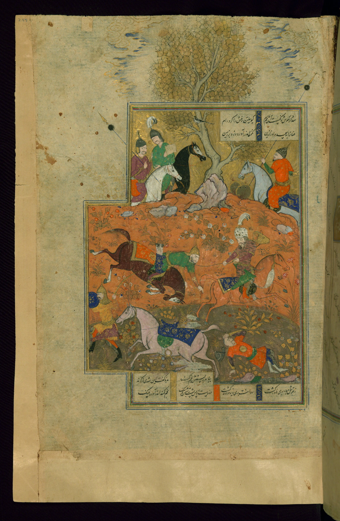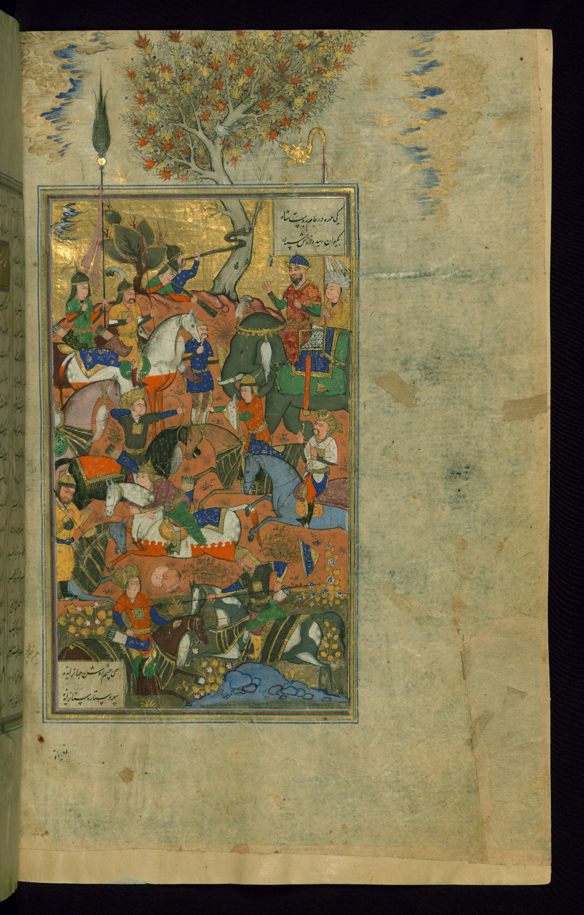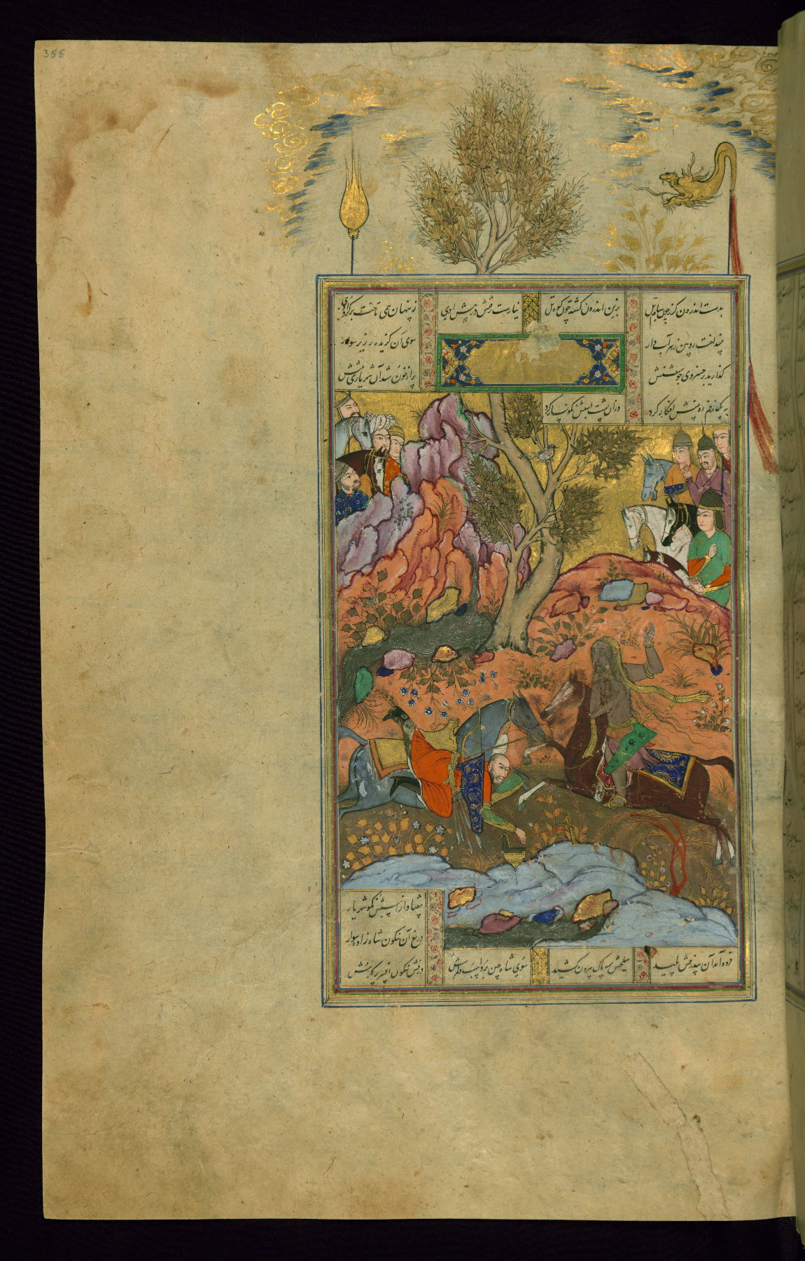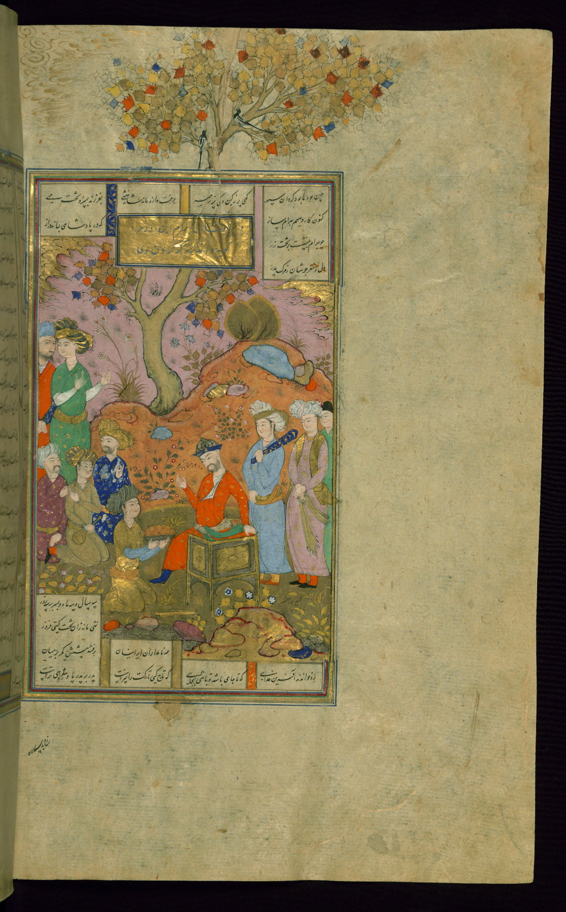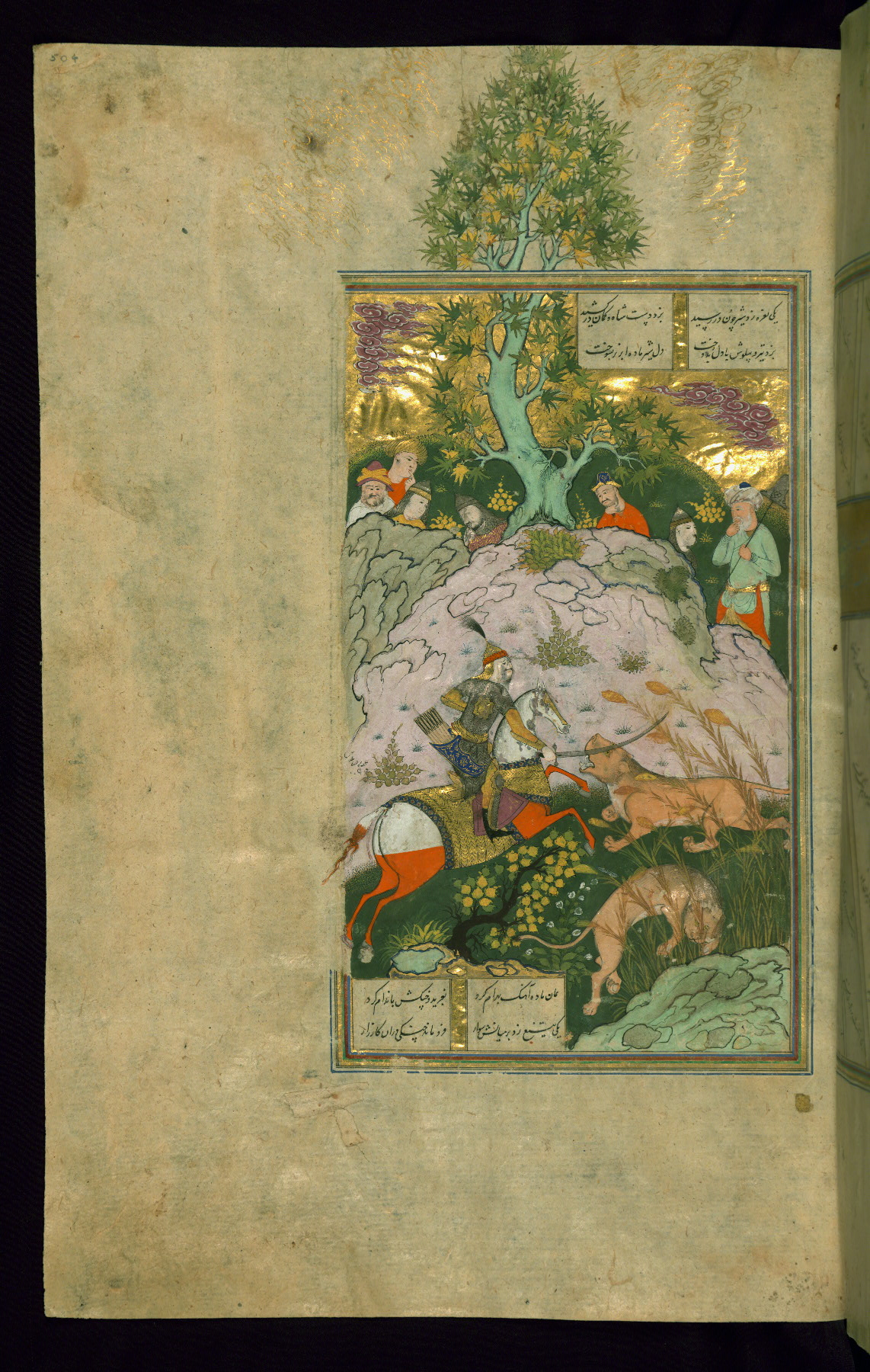 - Decoration note: Eighty-three illustrations, some spuriously attributed to Riz̤ā ʿAbbāsī and Shaykh ʿAbbāsī (fols. 55b, 62b, 391b, 476b, and 479b); Double-page illuminated frontispiece opening the main text of the Shāhnāmah (fols. 8b-9a); illuminated headpiece for the beginning of part 2 (fol. 335b); illuminated headpiece (fol. 106b)