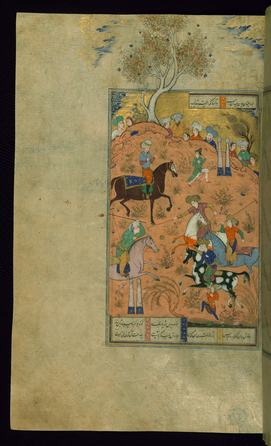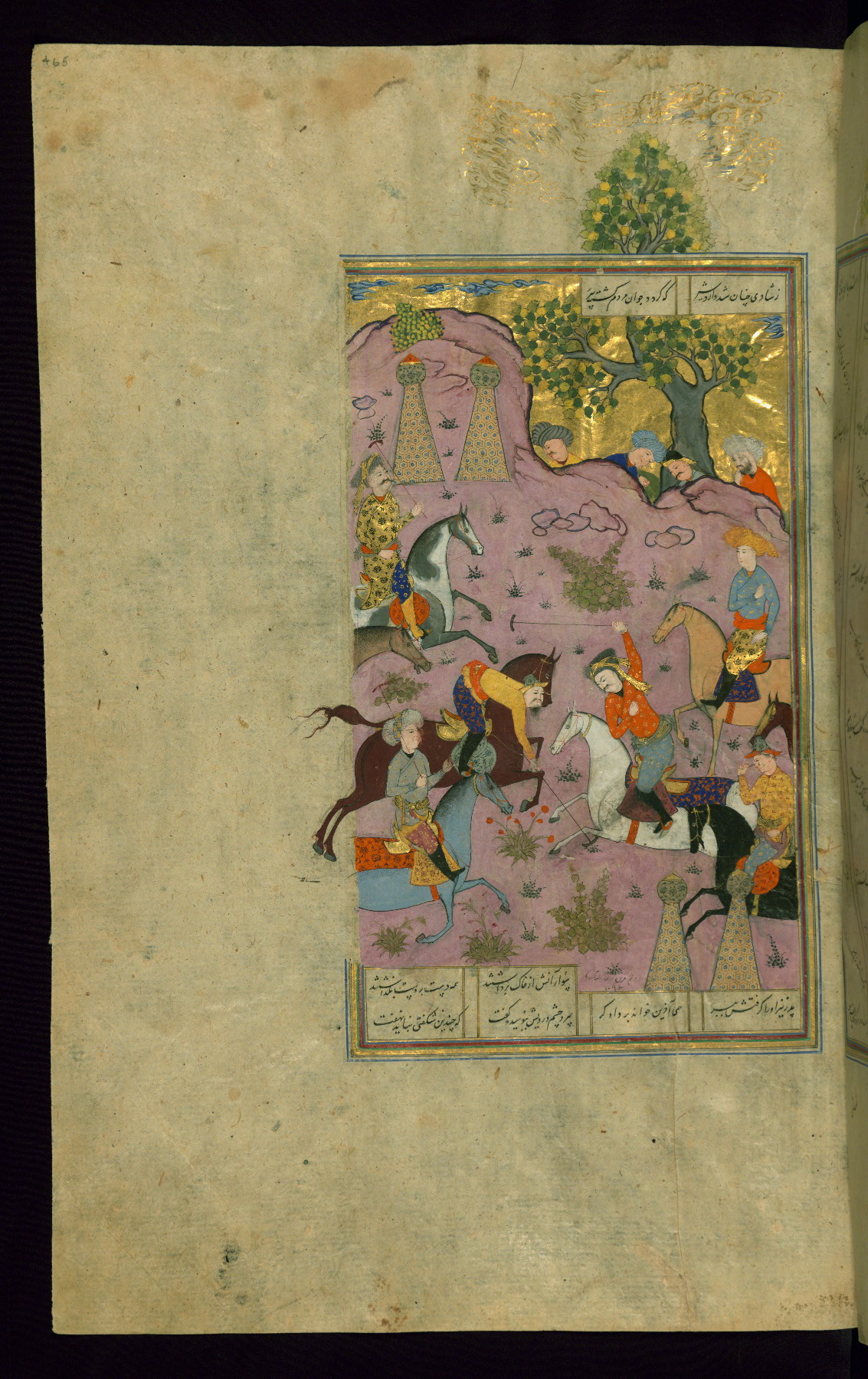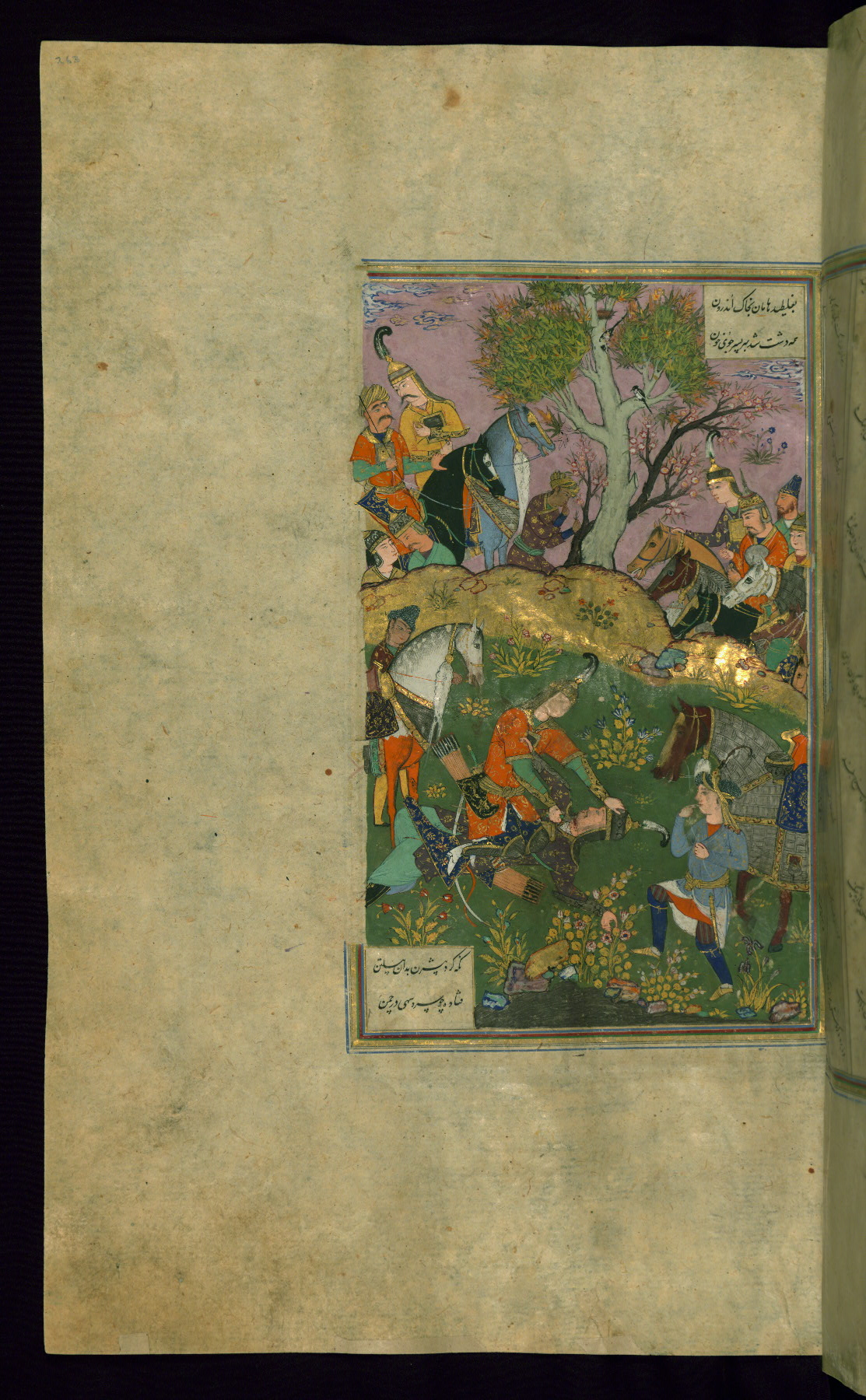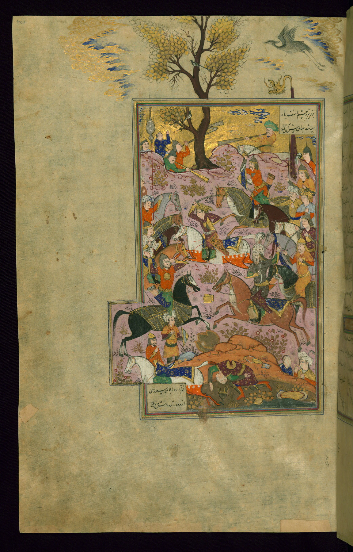 - Decoration note: Eighty-three illustrations, some spuriously attributed to Riz̤ā ʿAbbāsī and Shaykh ʿAbbāsī (fols. 55b, 62b, 391b, 476b, and 479b); Double-page illuminated frontispiece opening the main text of the Shāhnāmah (fols. 8b-9a); illuminated headpiece for the beginning of part 2 (fol. 335b); illuminated headpiece (fol. 106b)