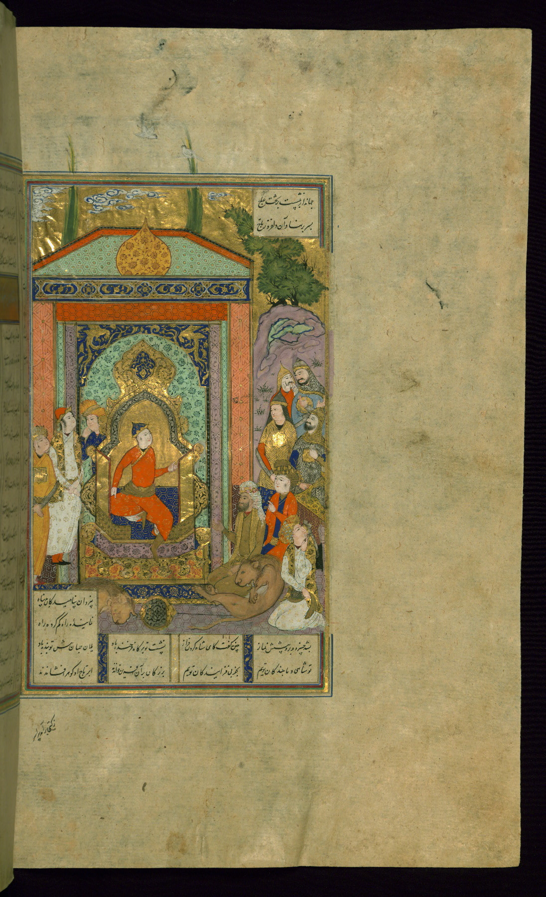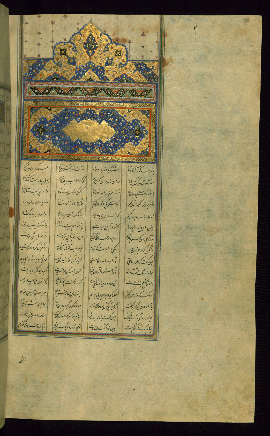 - Label: This incipit page with illuminated headpiece introduces part 2 of the Shāhnāmah, beginning with the story of King Luhrāsp.