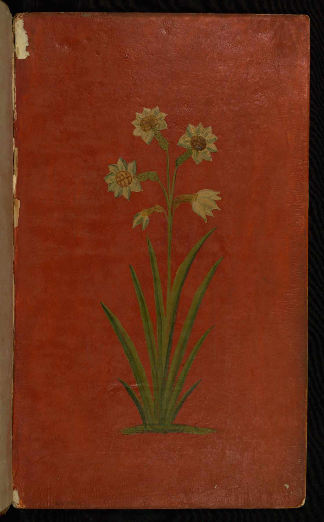 Dates to the thirteenth century AH / nineteenth CE; lacquer boards (no flap); floral design in the central ovals and pendants; doublures decorated with a plant with yellow flowers (perhaps daffodils)