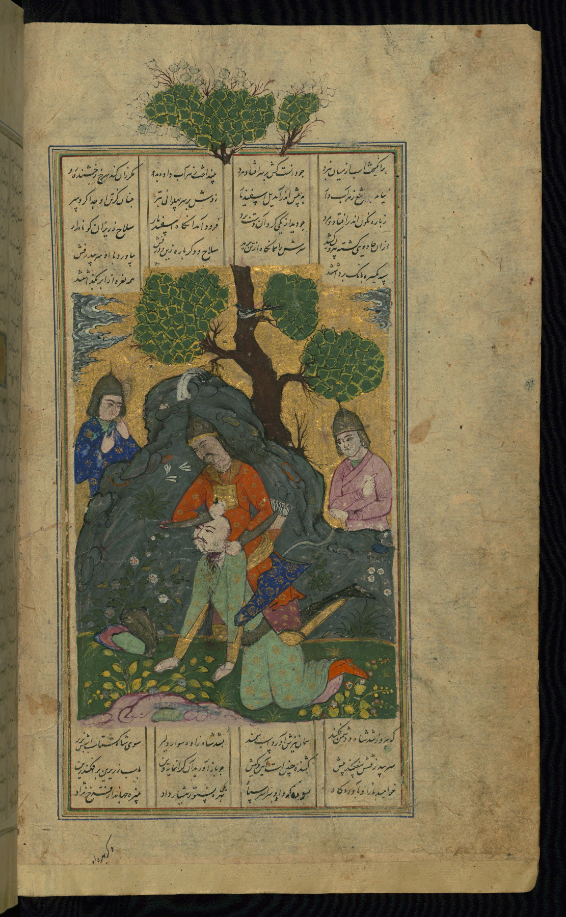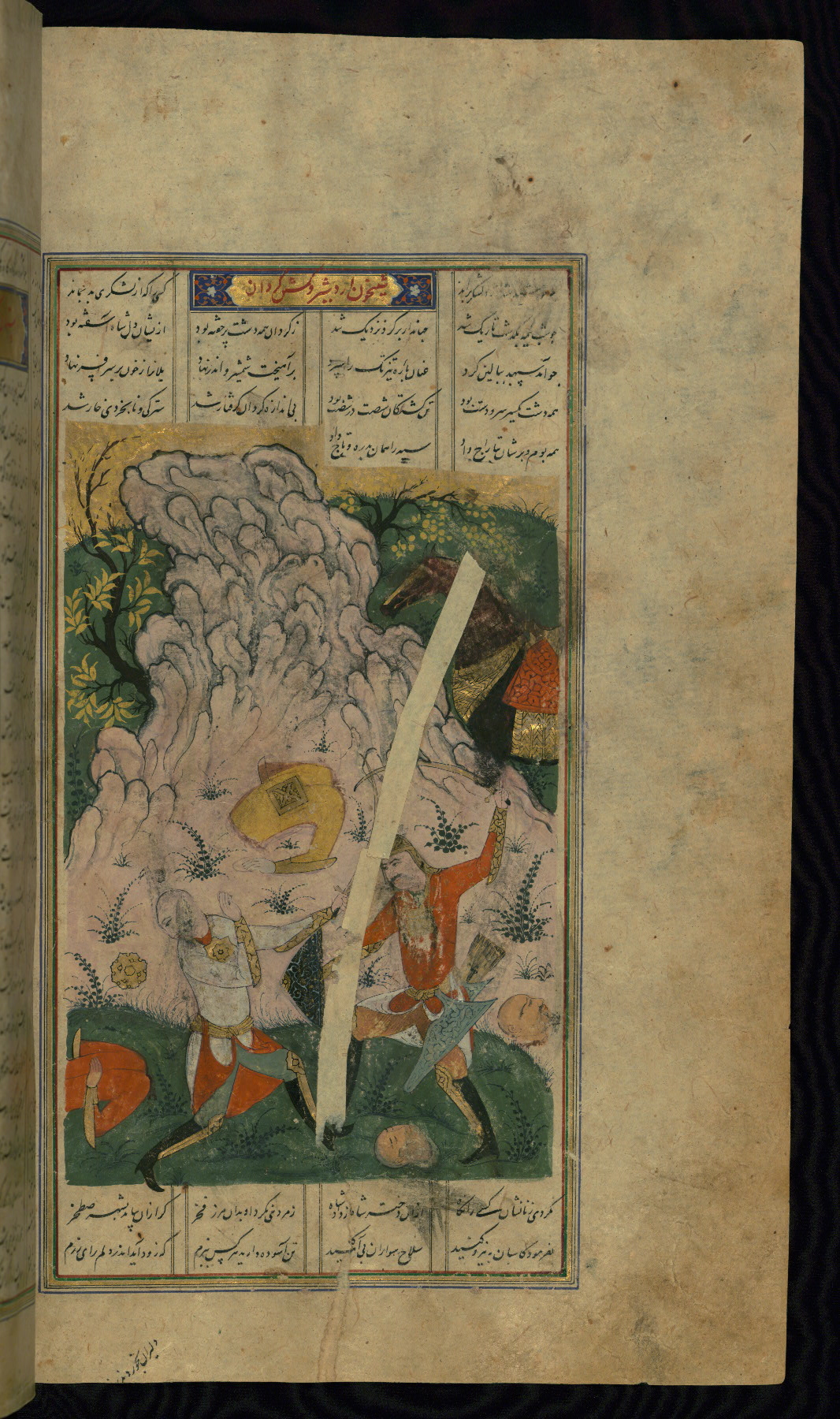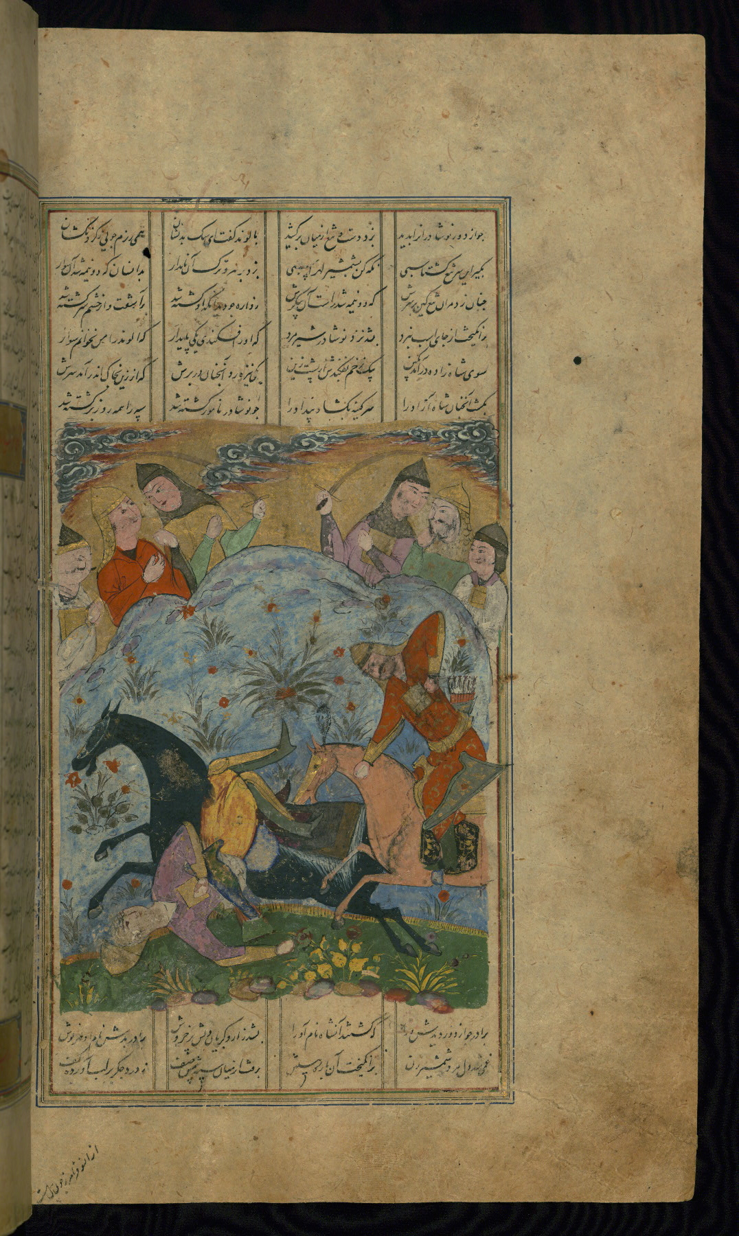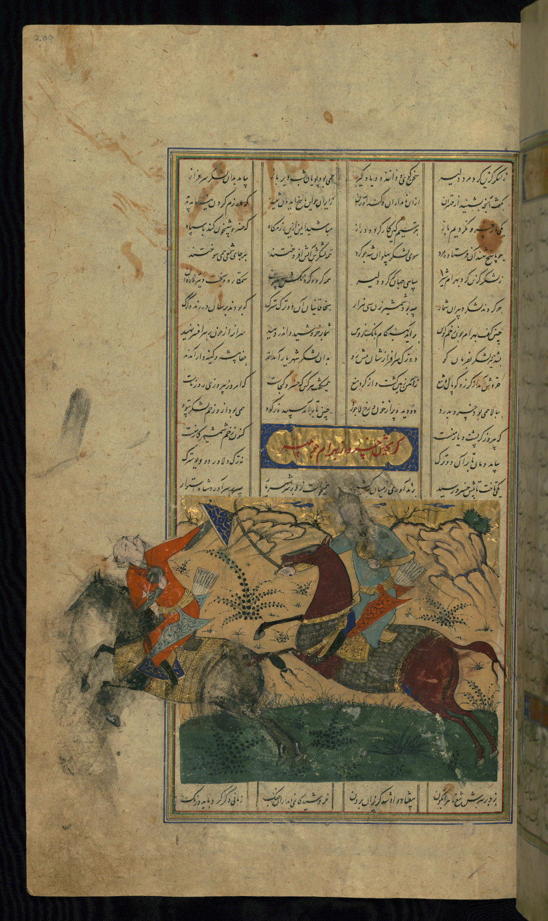 This is an illuminated and illustrated incomplete copy of the Shāhnāmah (Book of kings) by Abū al-Qāsim Firdawsī (d. 411 or 416 AH / 1020-5 CE), dating between the eleventh century AH / seventeenth CE and the thirteenth century AH / nineteenth CE. The text, written in black nastaʿlīq script with chapter/section headings in red on a gold ground, is illustrated with seventeen paintings. Two of the illustrations (fols. 2b and 269a) are in a clearly recognizable Qajar style and certainly date to the thirteenth century AH / nineteenth CE. The others may be late Safavid, repainted in the thirteenth century AH / nineteenth CE.
