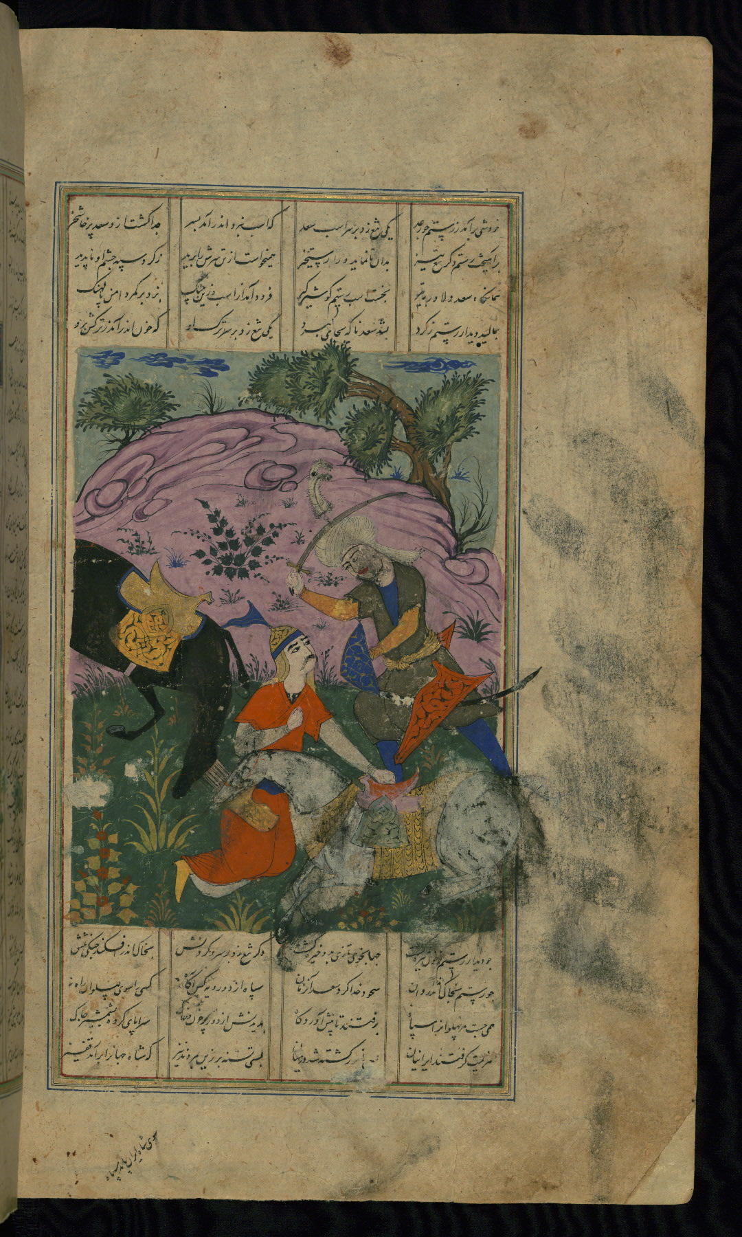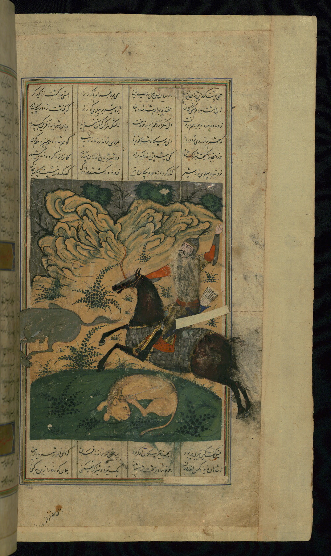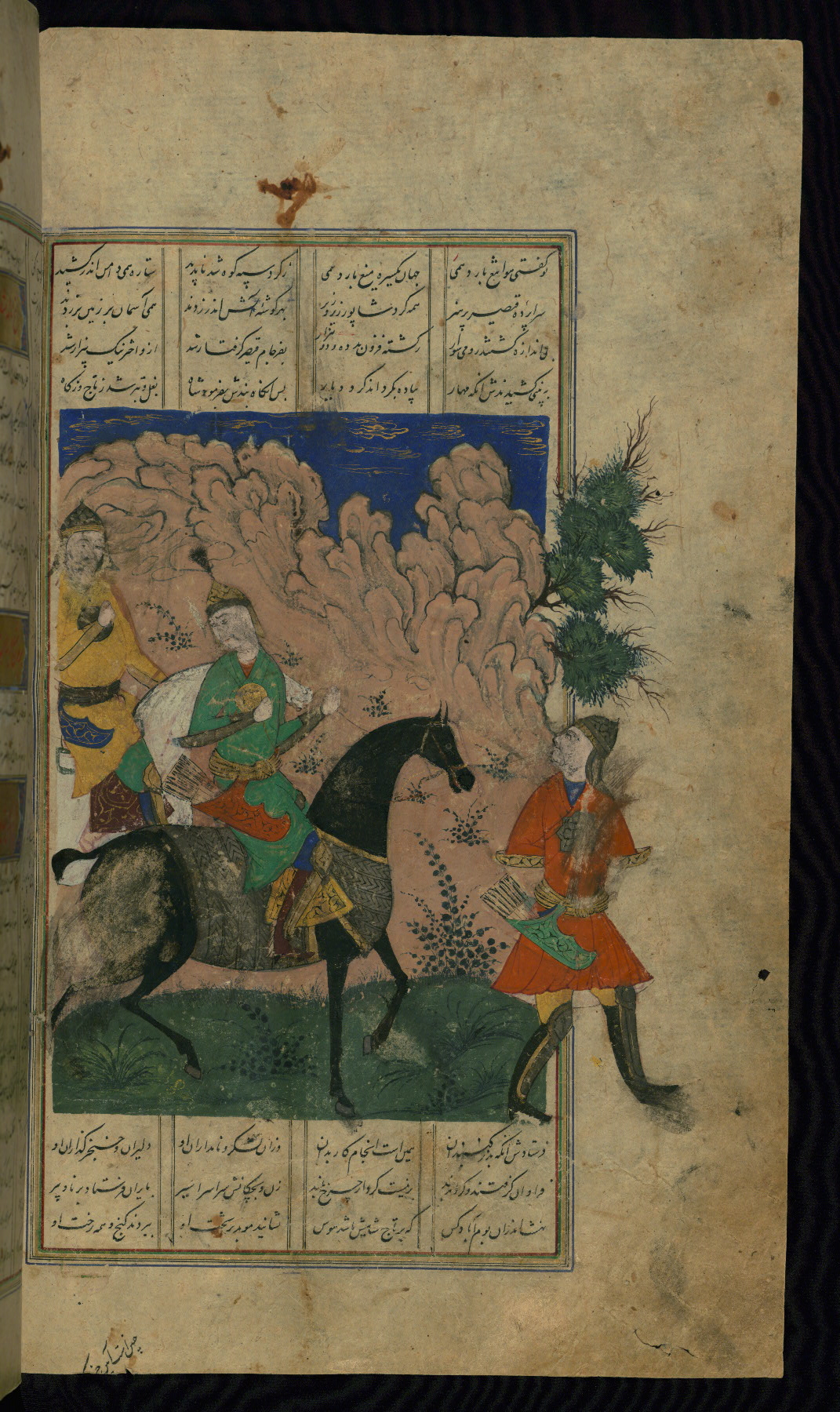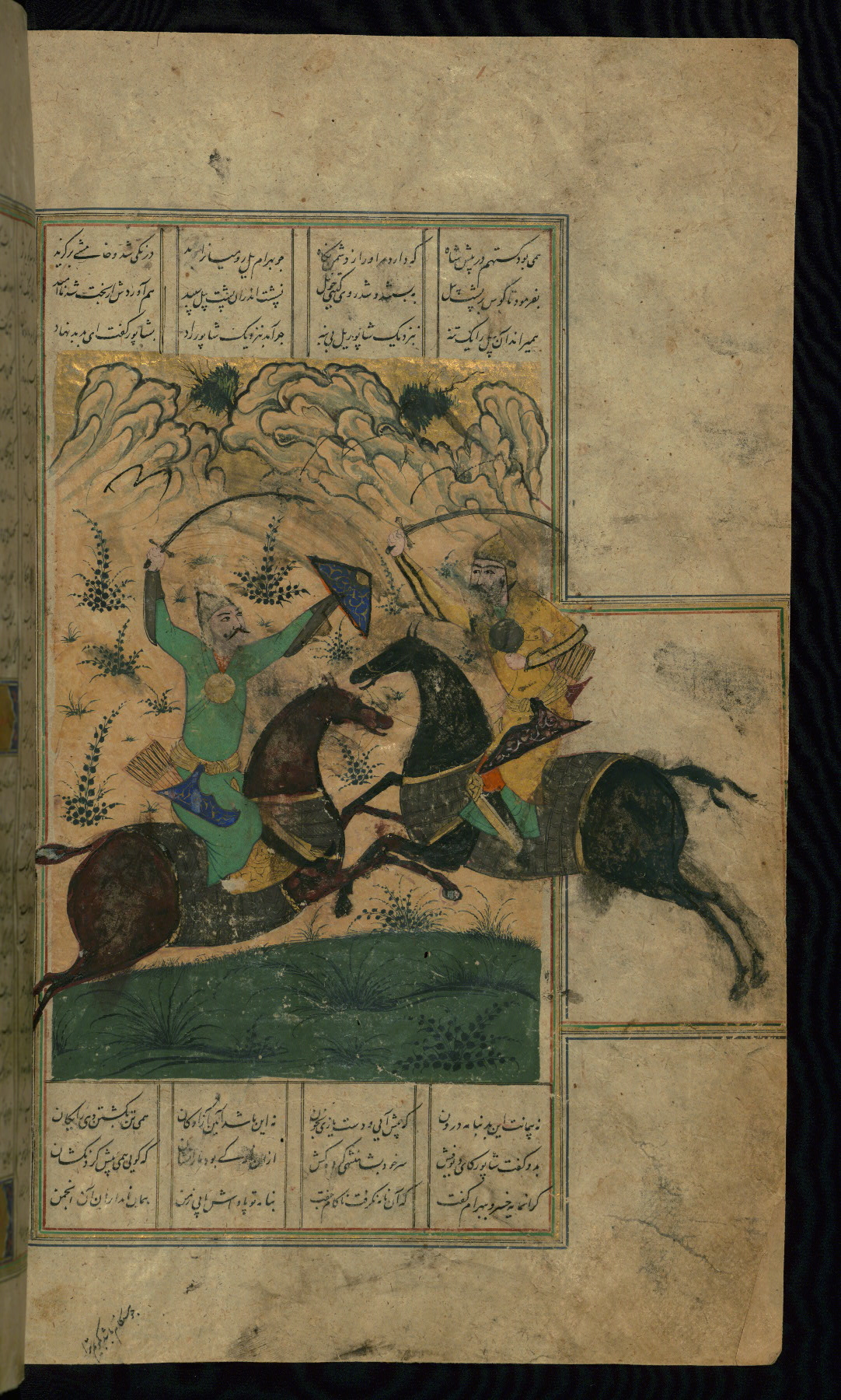 This is an illuminated and illustrated incomplete copy of the Shāhnāmah (Book of kings) by Abū al-Qāsim Firdawsī (d. 411 or 416 AH / 1020-5 CE), dating between the eleventh century AH / seventeenth CE and the thirteenth century AH / nineteenth CE. The text, written in black nastaʿlīq script with chapter/section headings in red on a gold ground, is illustrated with seventeen paintings. Two of the illustrations (fols. 2b and 269a) are in a clearly recognizable Qajar style and certainly date to the thirteenth century AH / nineteenth CE. The others may be late Safavid, repainted in the thirteenth century AH / nineteenth CE.