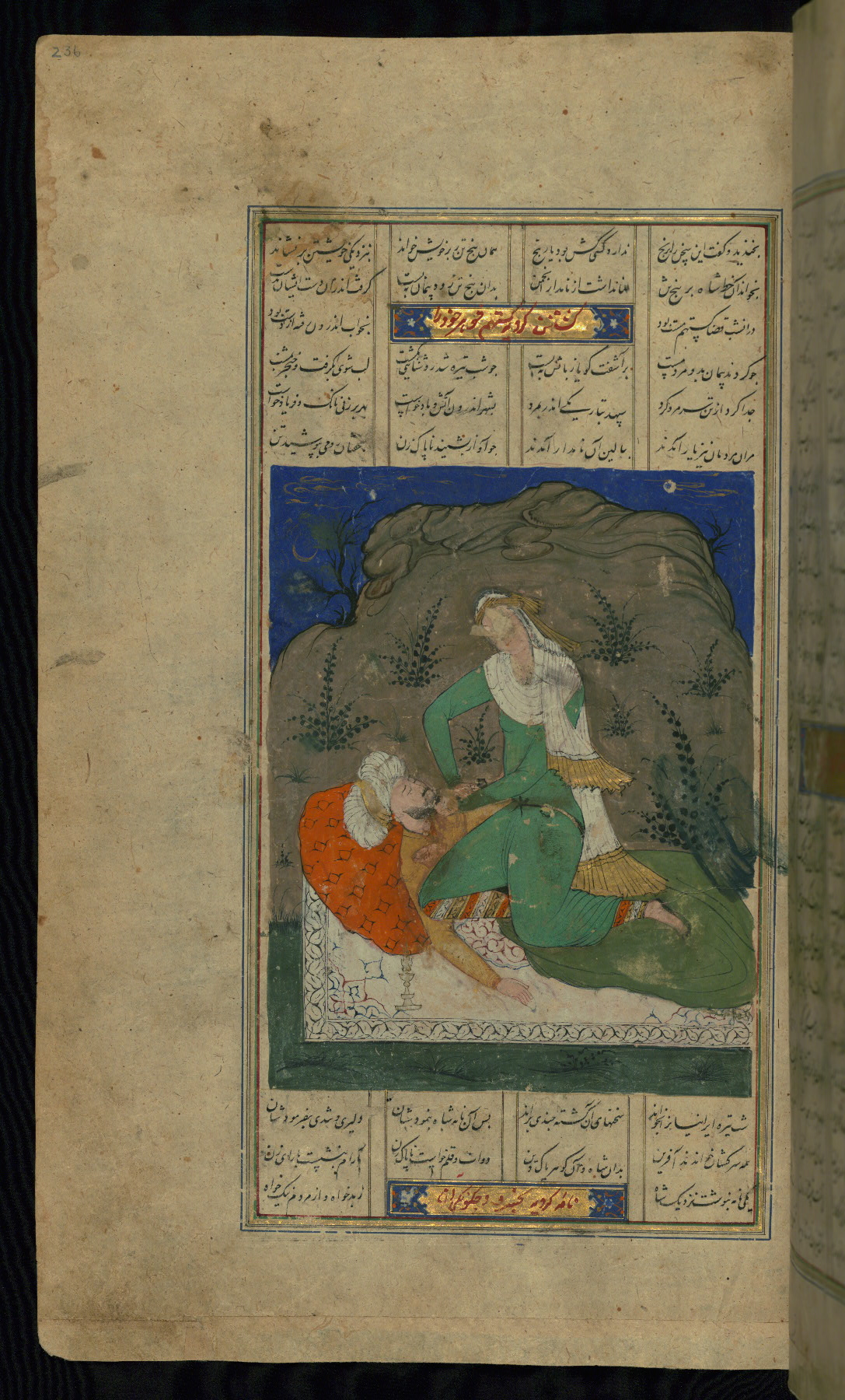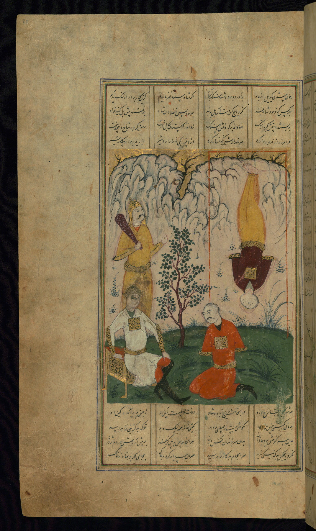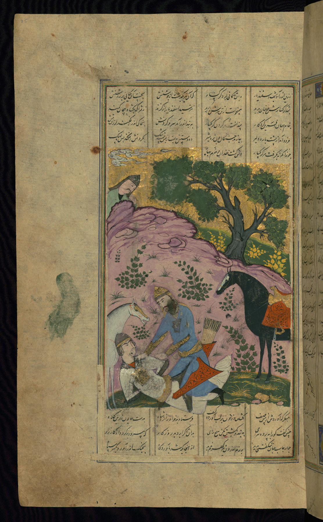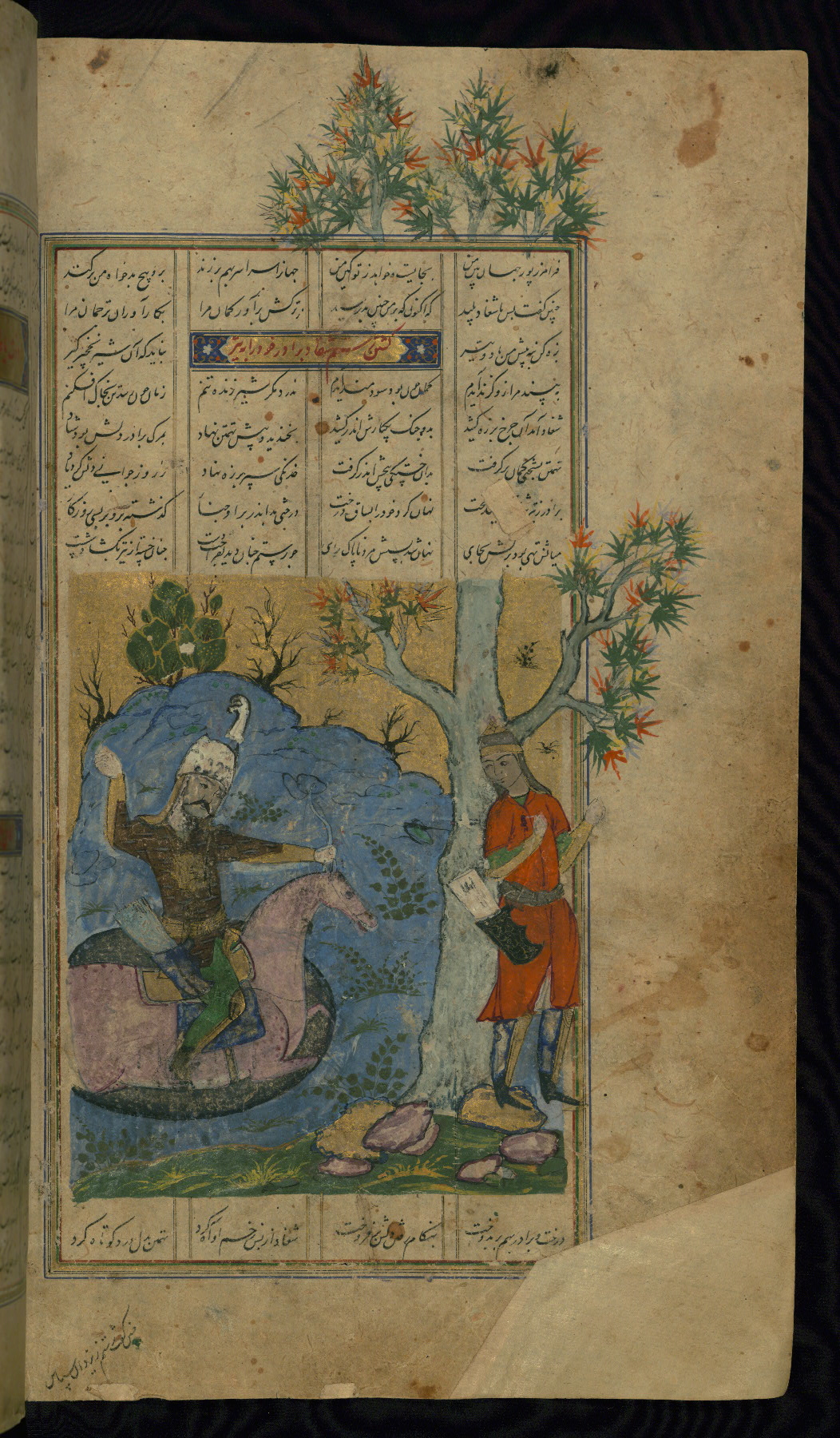 This is an illuminated and illustrated incomplete copy of the Shāhnāmah (Book of kings) by Abū al-Qāsim Firdawsī (d. 411 or 416 AH / 1020-5 CE), dating between the eleventh century AH / seventeenth CE and the thirteenth century AH / nineteenth CE. The text, written in black nastaʿlīq script with chapter/section headings in red on a gold ground, is illustrated with seventeen paintings. Two of the illustrations (fols. 2b and 269a) are in a clearly recognizable Qajar style and certainly date to the thirteenth century AH / nineteenth CE. The others may be late Safavid, repainted in the thirteenth century AH / nineteenth CE.