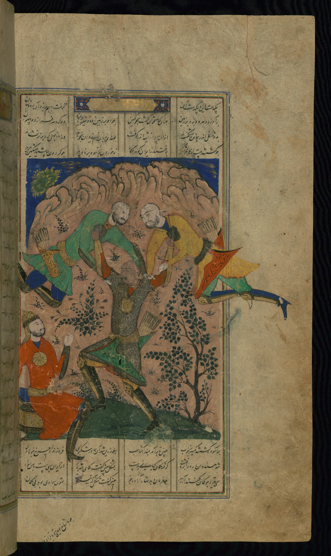 - Title: Bahrām Gūr wrestles with two Indian champions in the presence of Shangul, king of India
