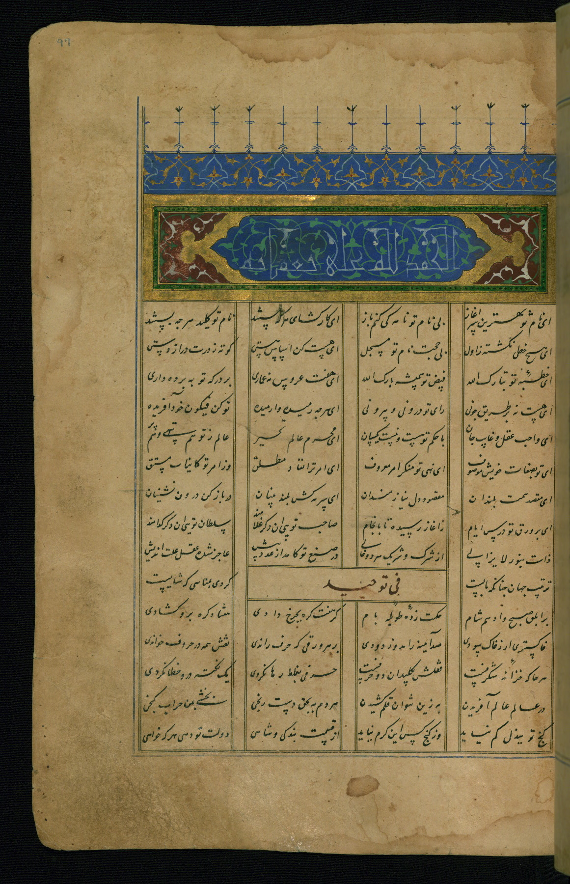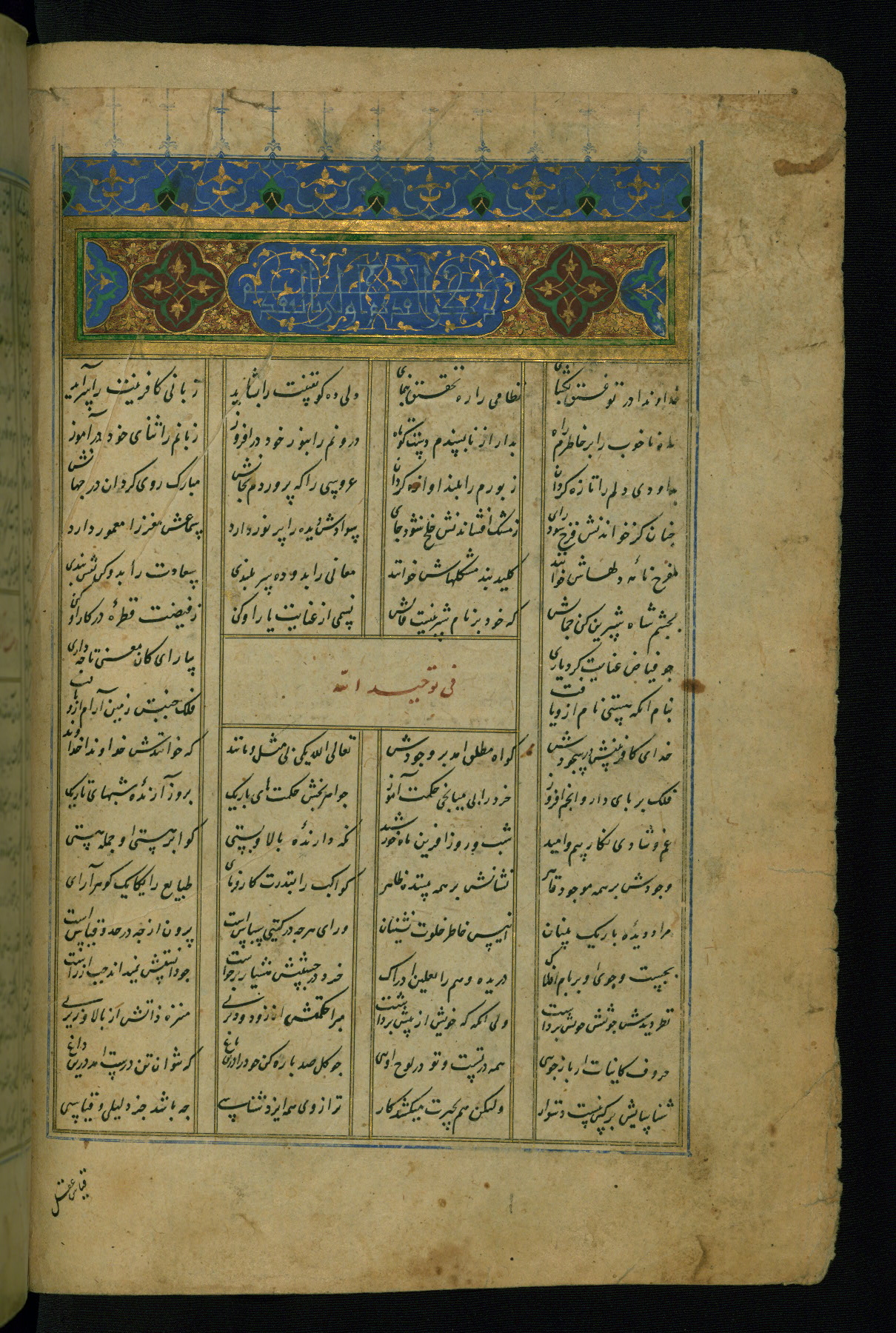 - Label: This illuminated incipit page introduces the third poem of the Khamsah, Laylá va Majnūn, and has a headpiece in foliated New Abbasid (broken cursive) style inscribed: al-ḥamd li-Llāh ʿalá niʿmātih.