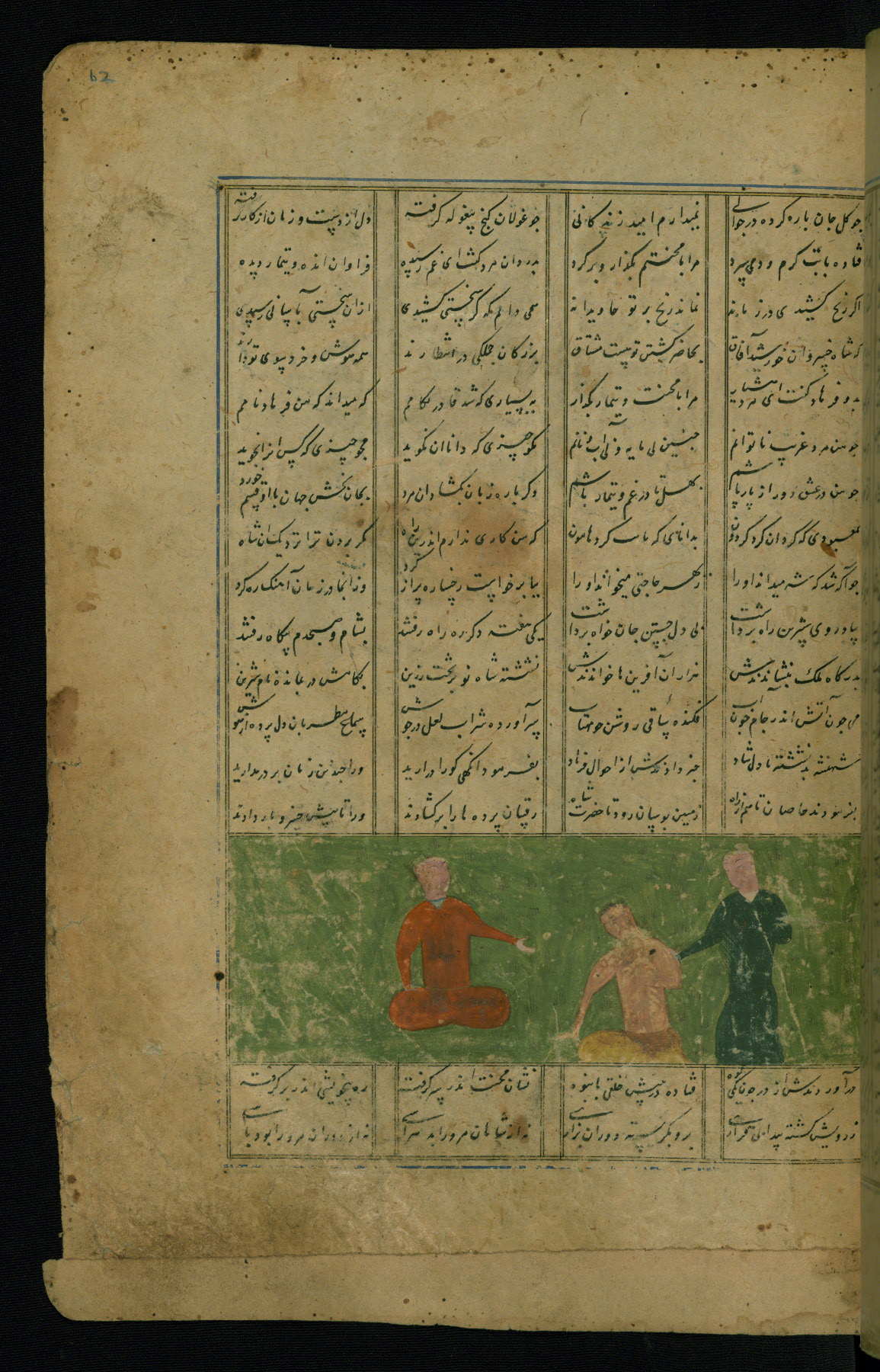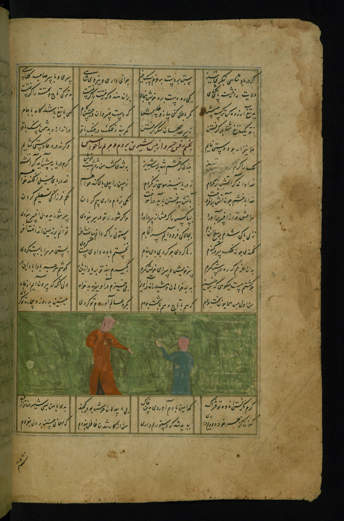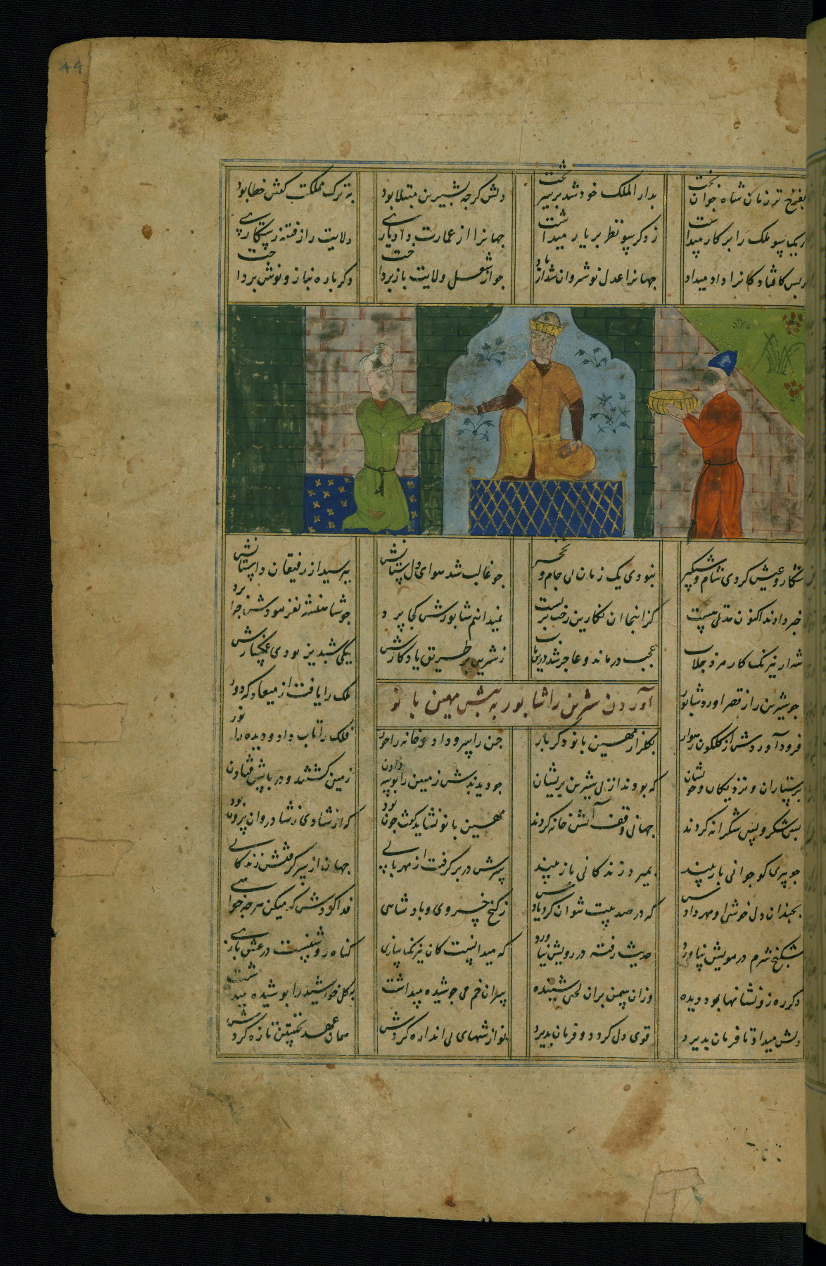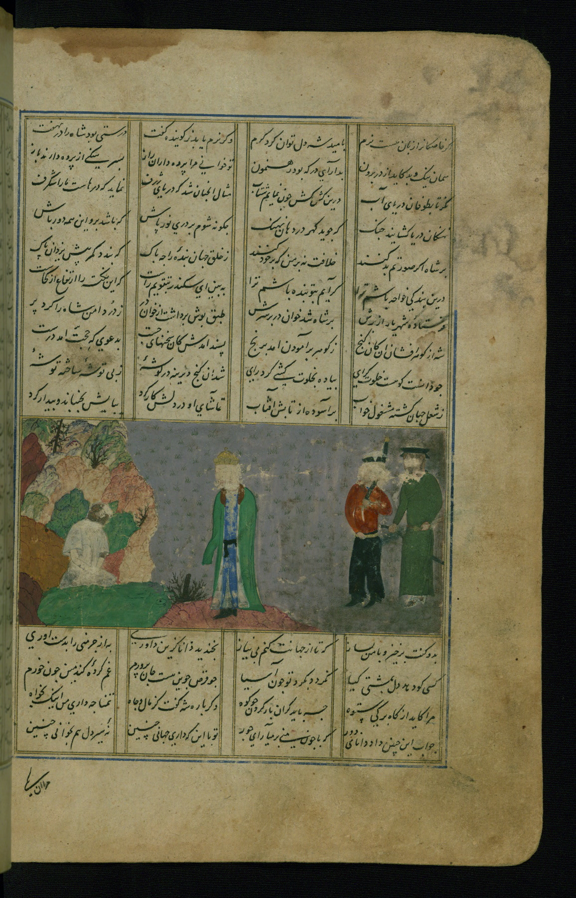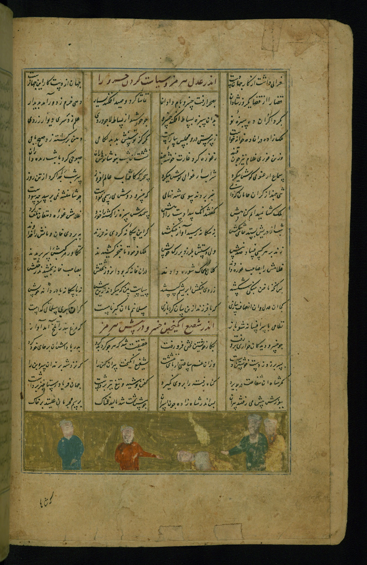 - Title: Khusraw prostrates before his father, Hurmuz, and begs for pardon