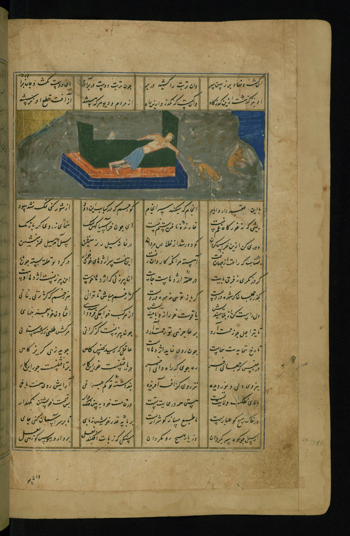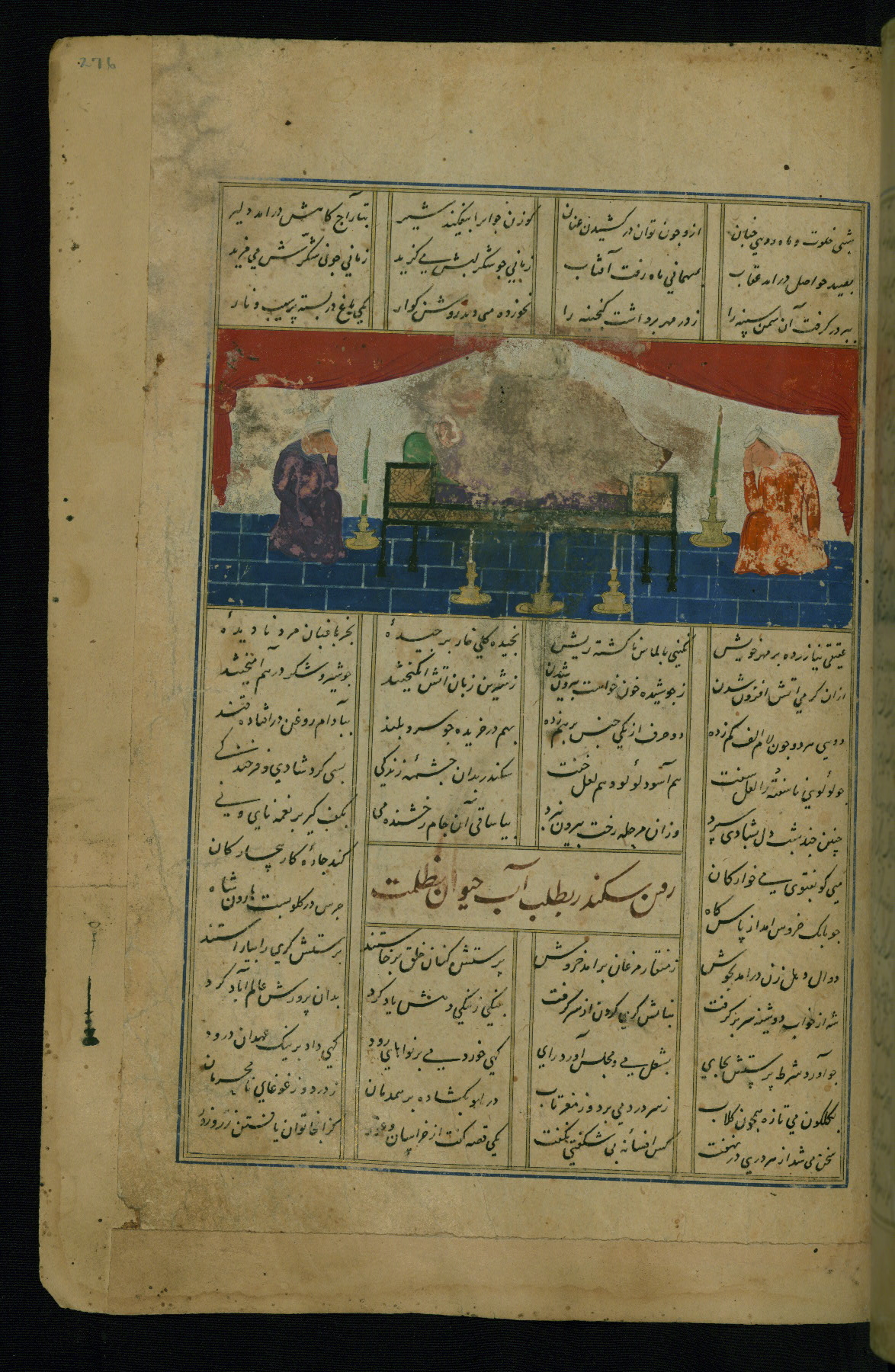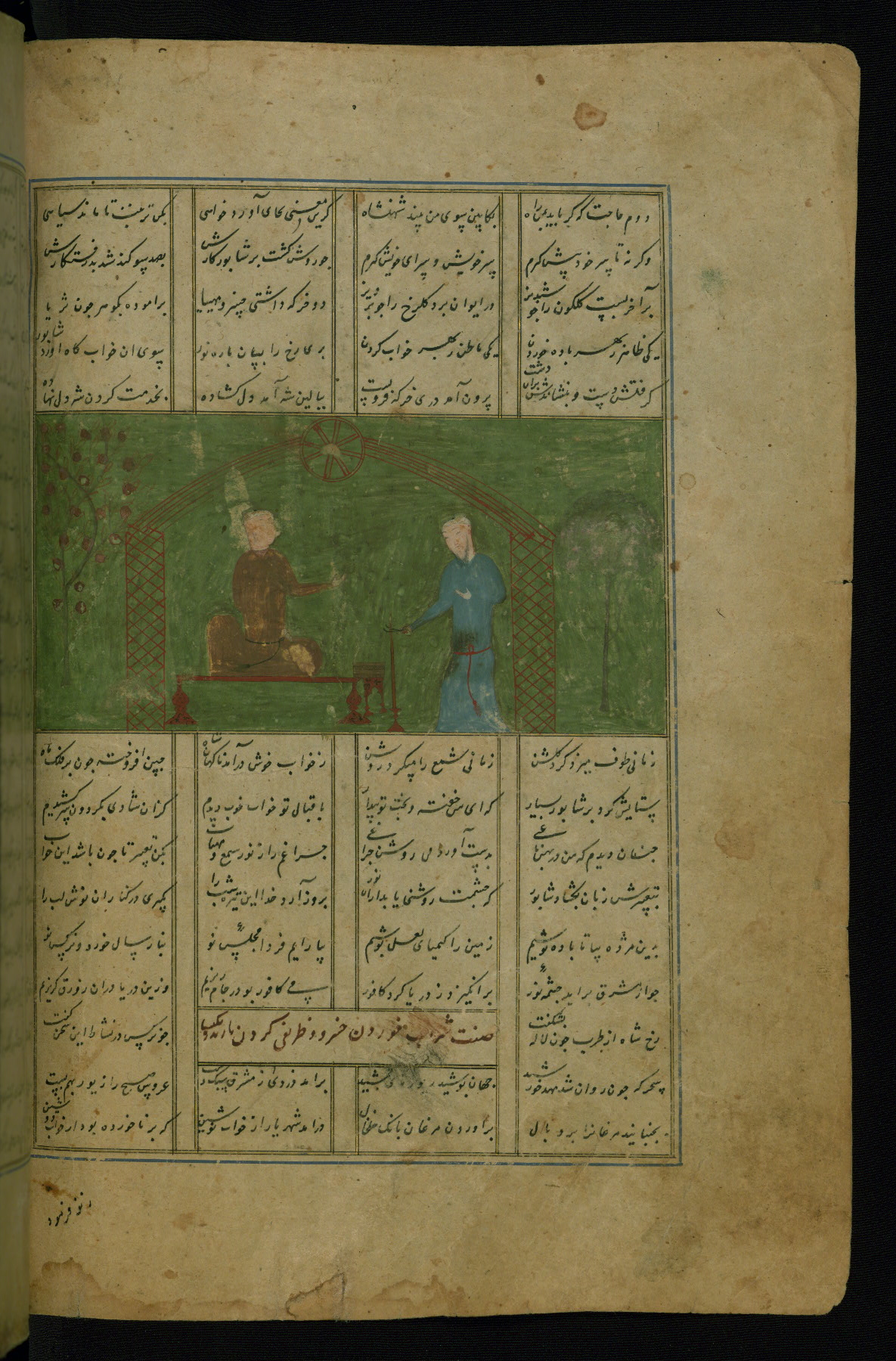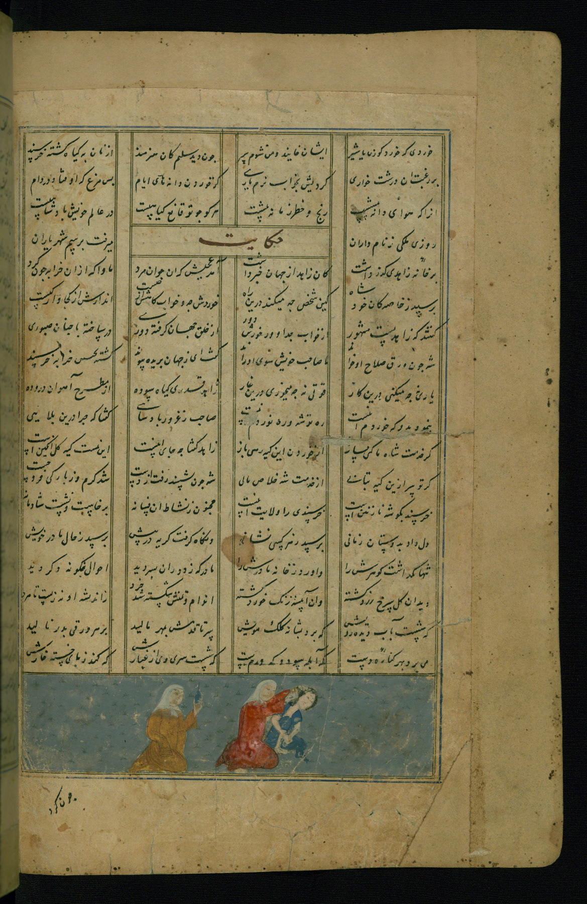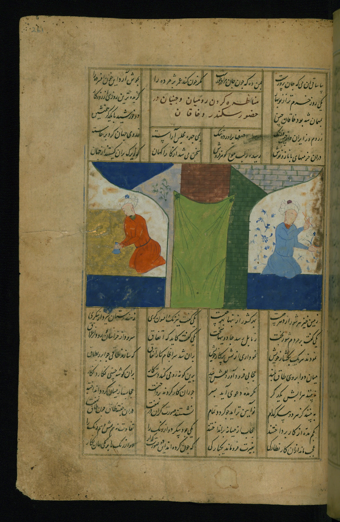 - Decoration note: Sixty illustrations; illuminated headings for each book (fols. 26b, 97a, 146b, and 202b [beginning of Makhzan al-asrār now missing]); framing lines in gold, blue, and black