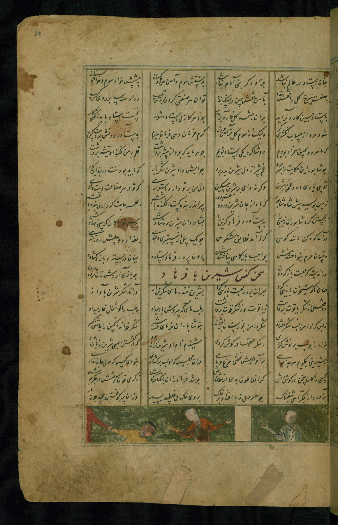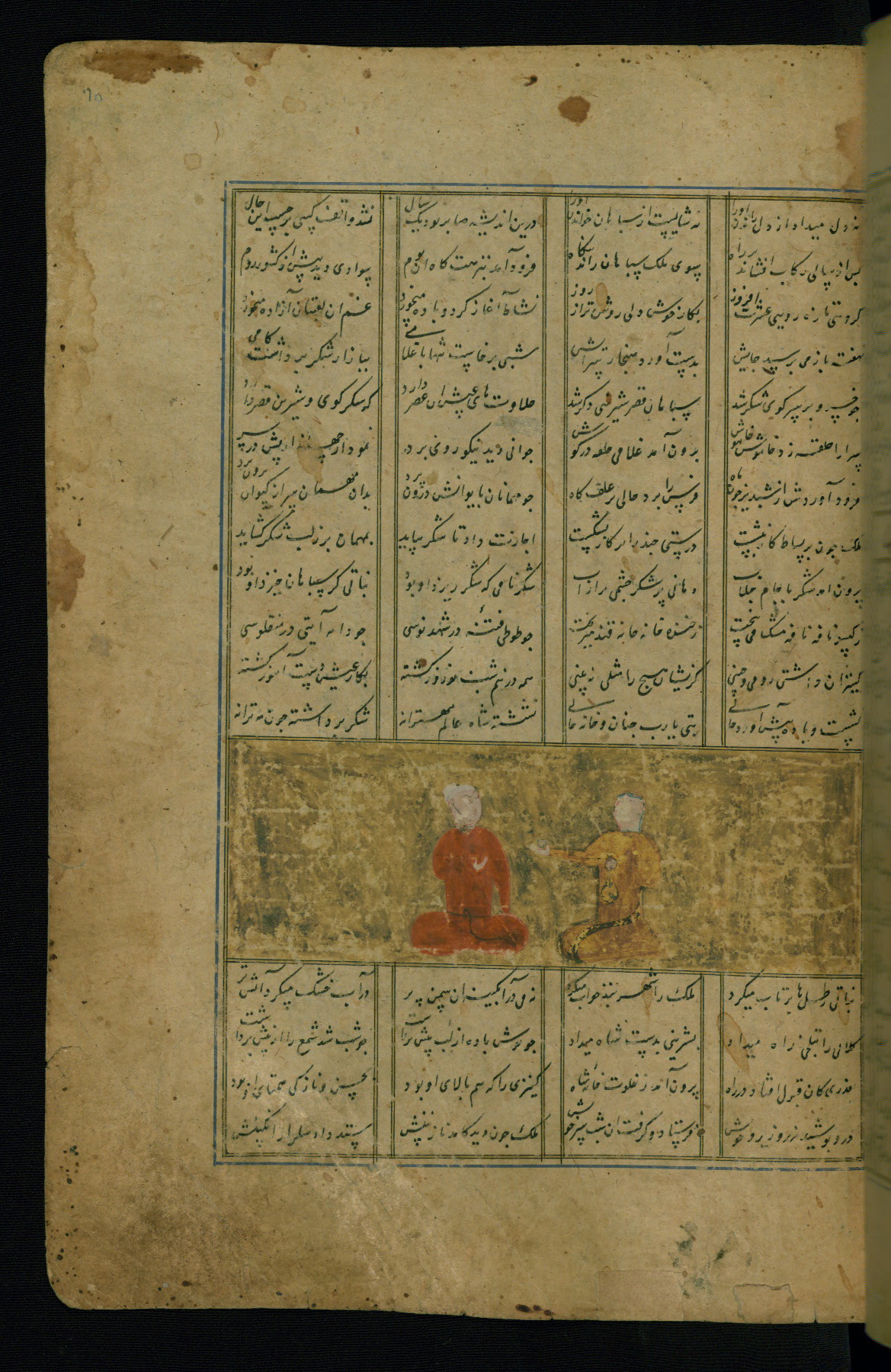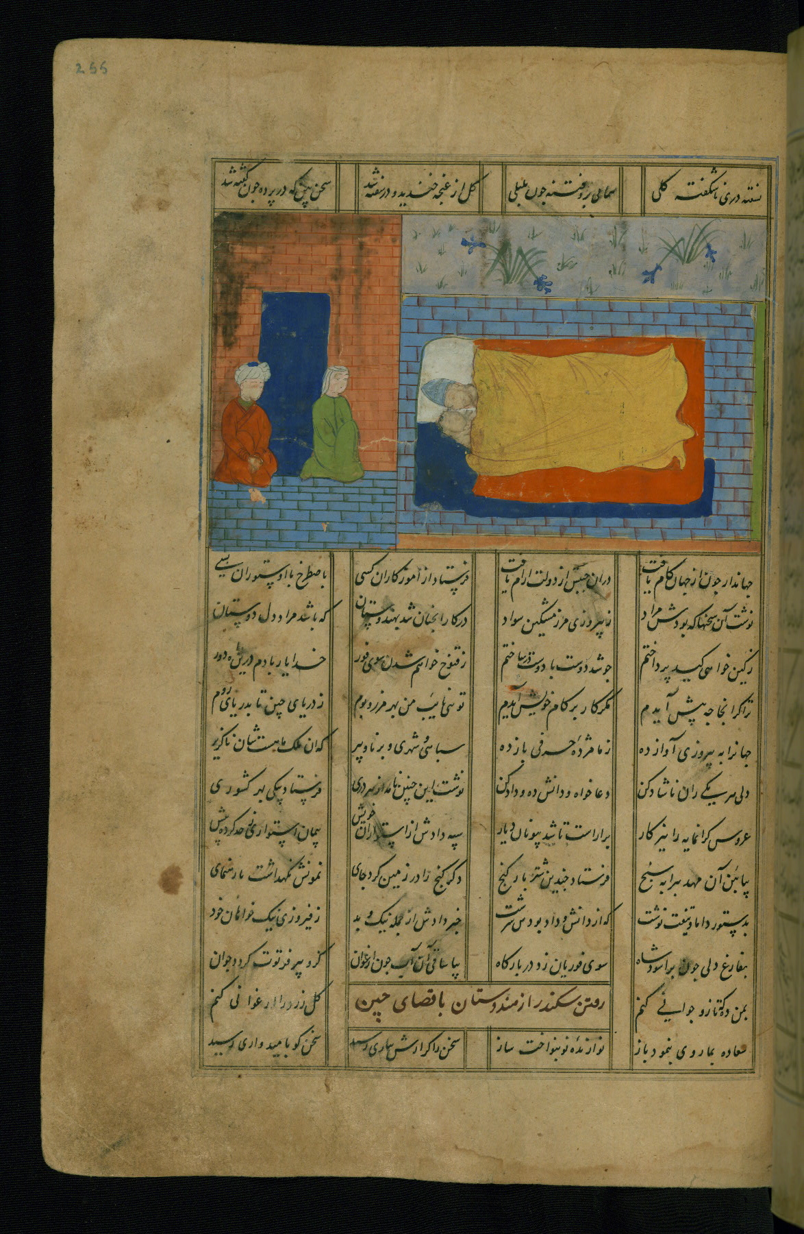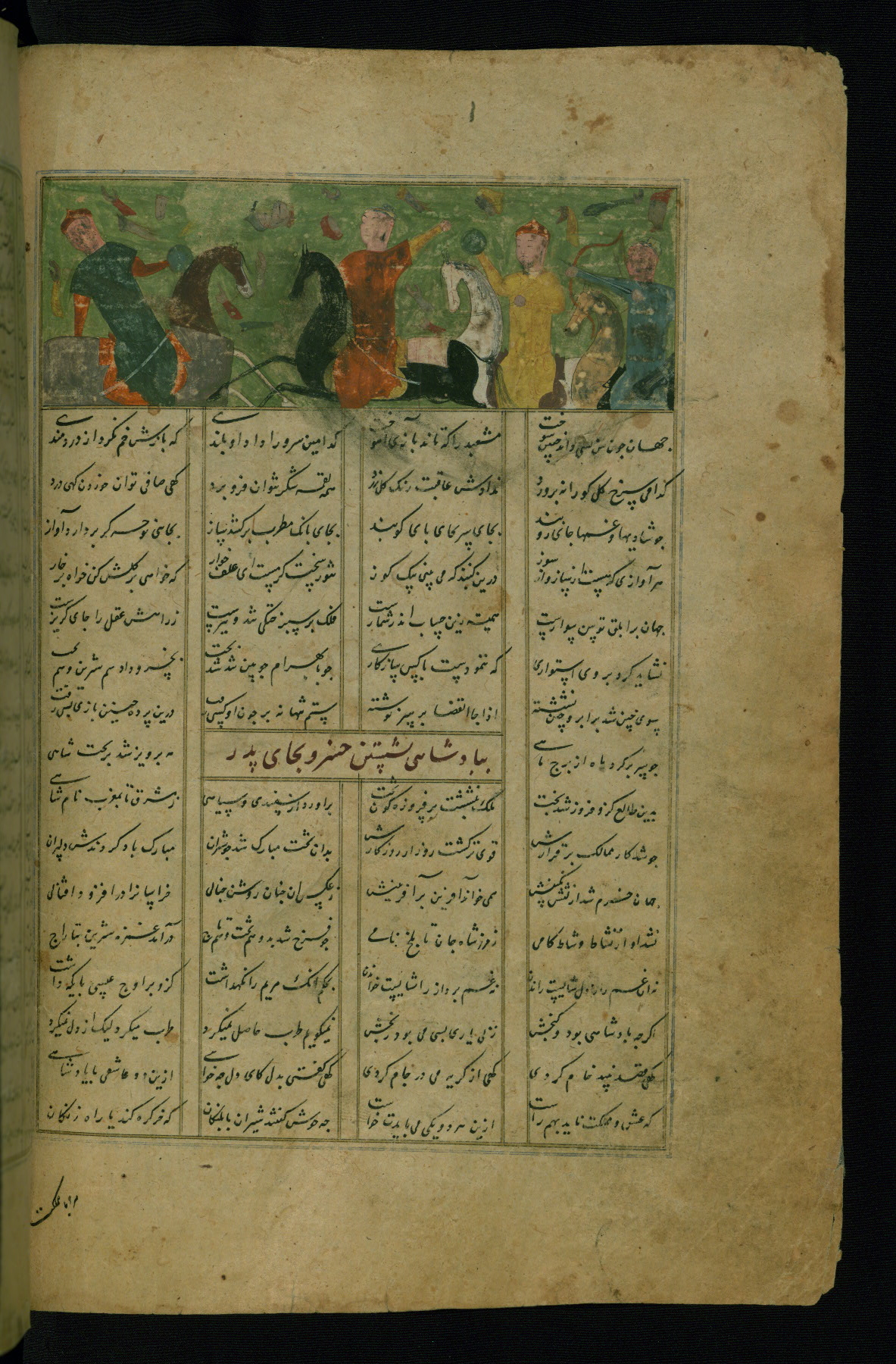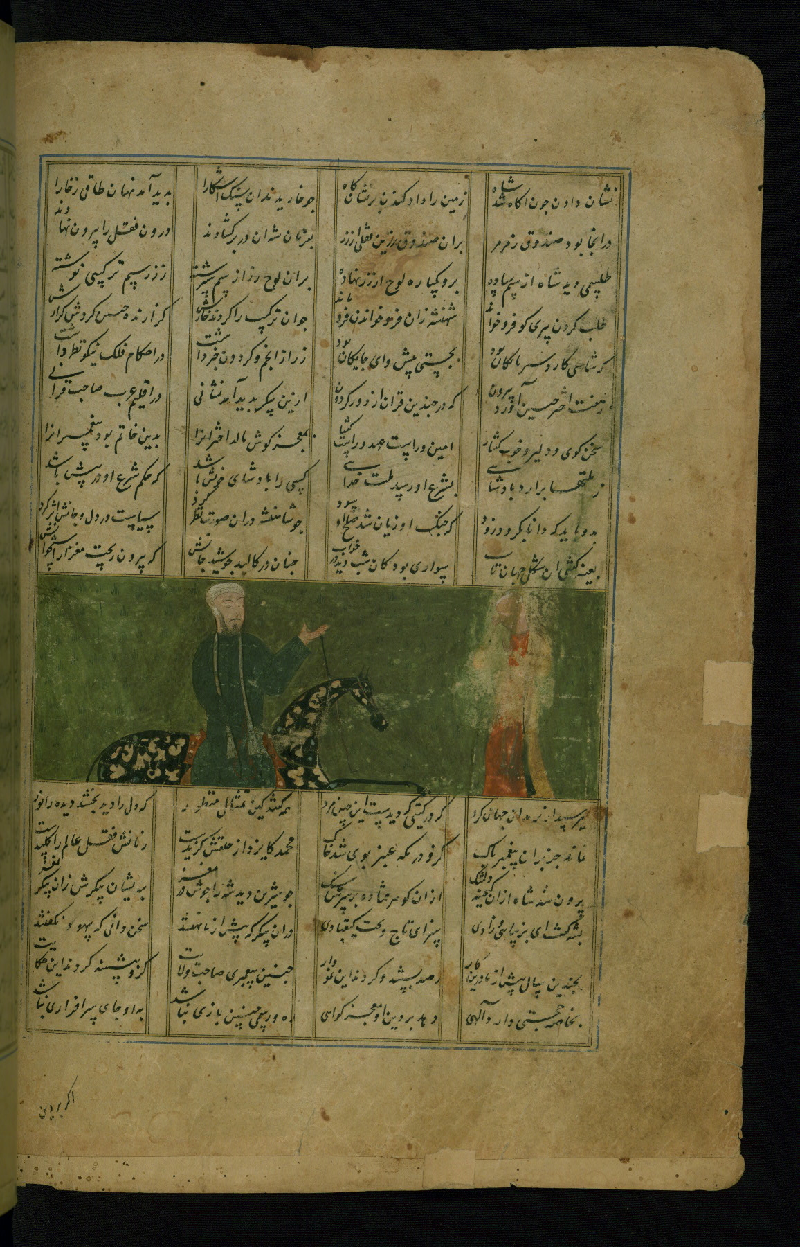 - Decoration note: Sixty illustrations; illuminated headings for each book (fols. 26b, 97a, 146b, and 202b [beginning of Makhzan al-asrār now missing]); framing lines in gold, blue, and black
