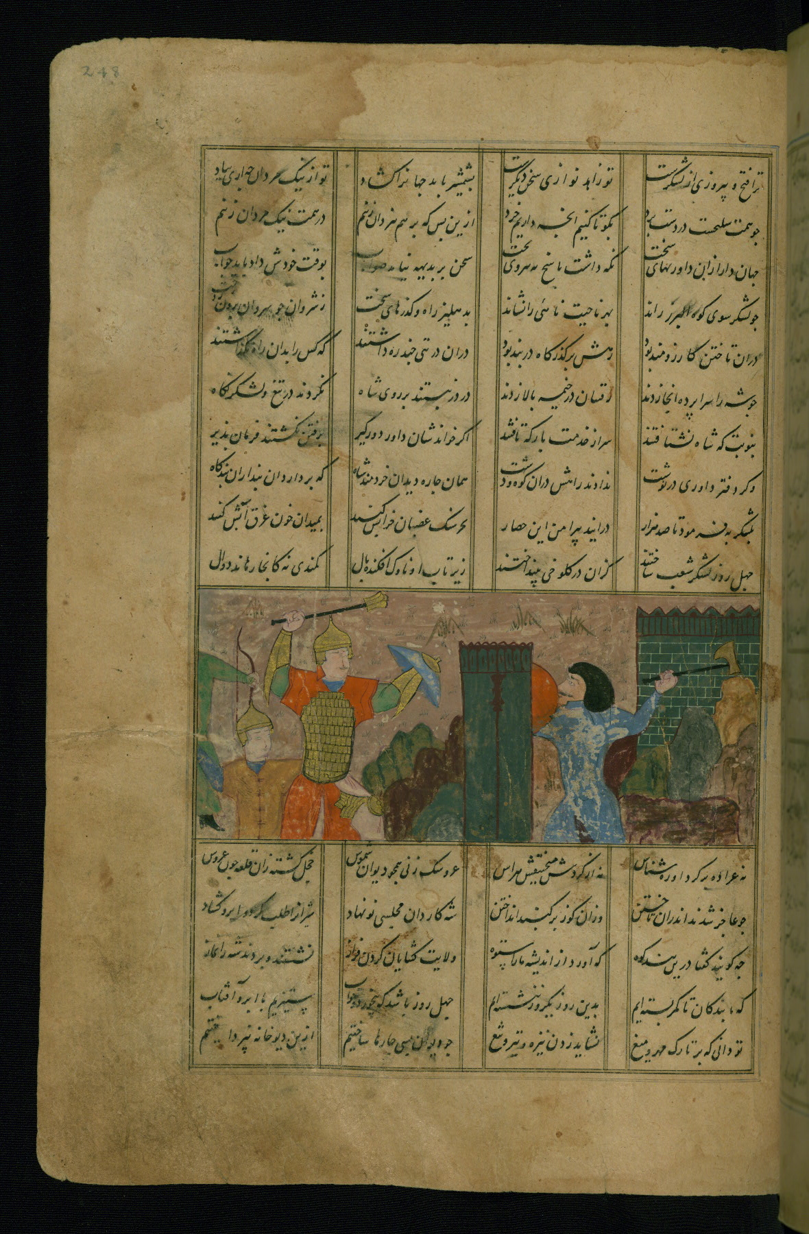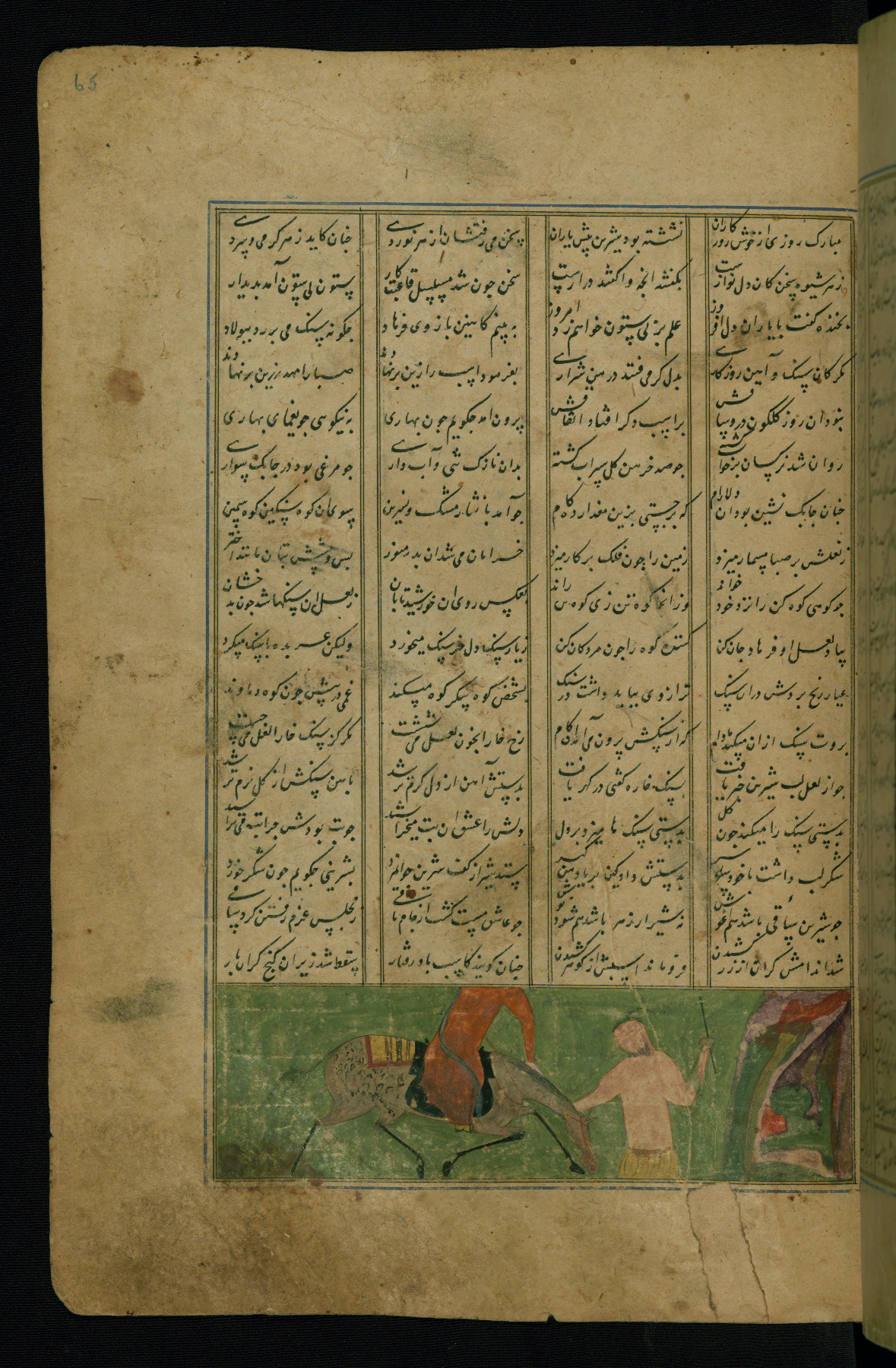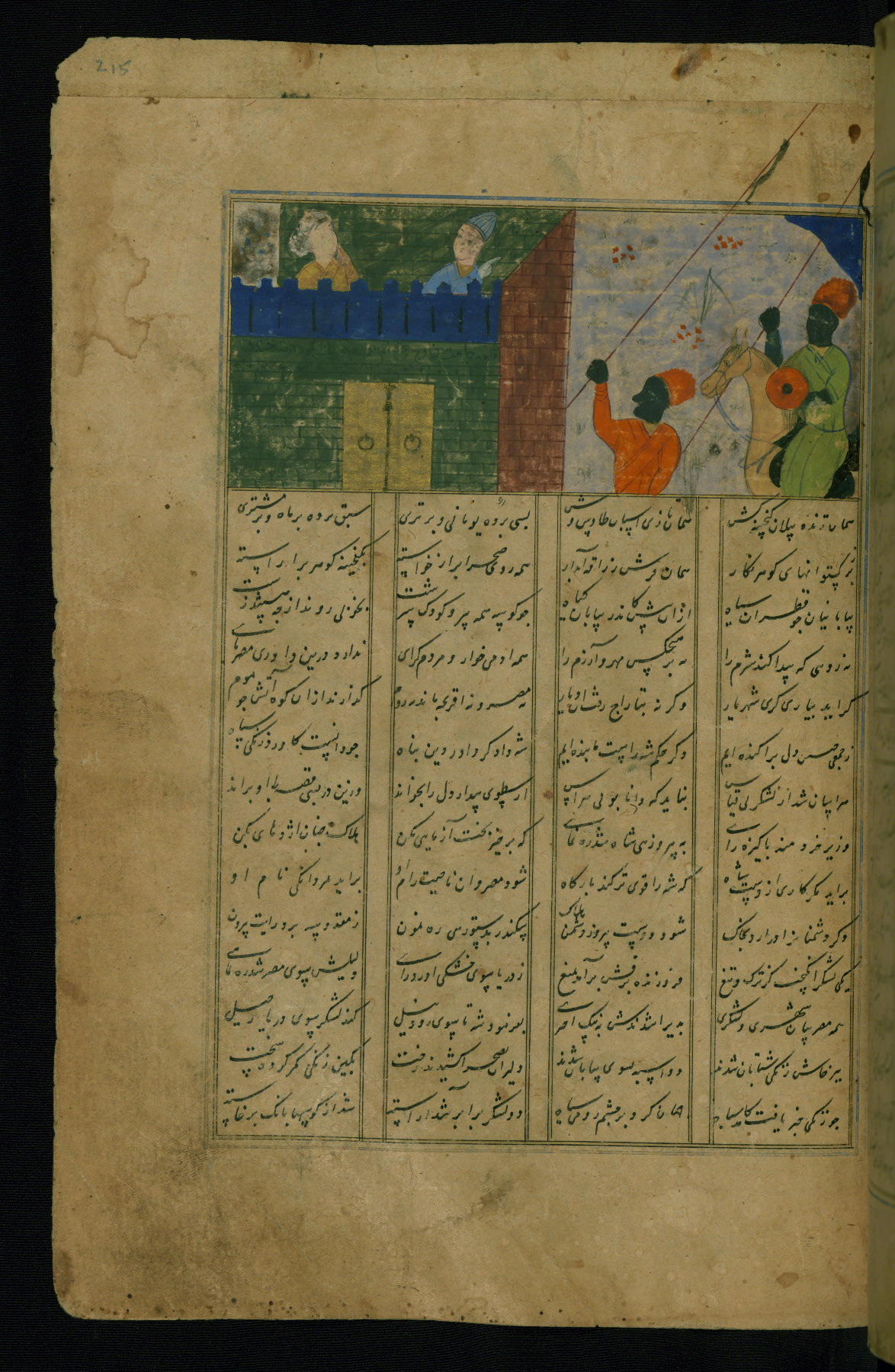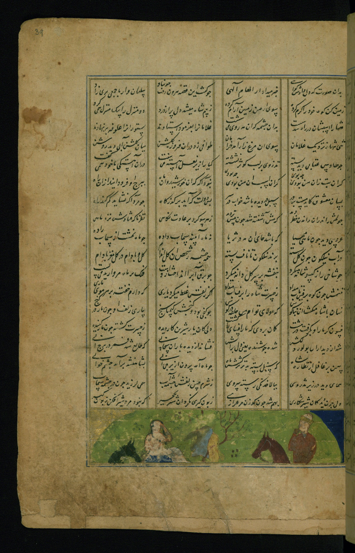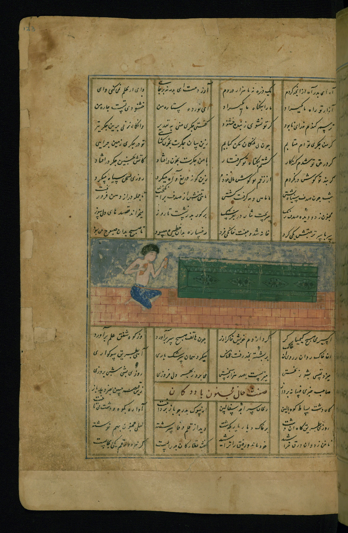 - Decoration note: Sixty illustrations; illuminated headings for each book (fols. 26b, 97a, 146b, and 202b [beginning of Makhzan al-asrār now missing]); framing lines in gold, blue, and black
